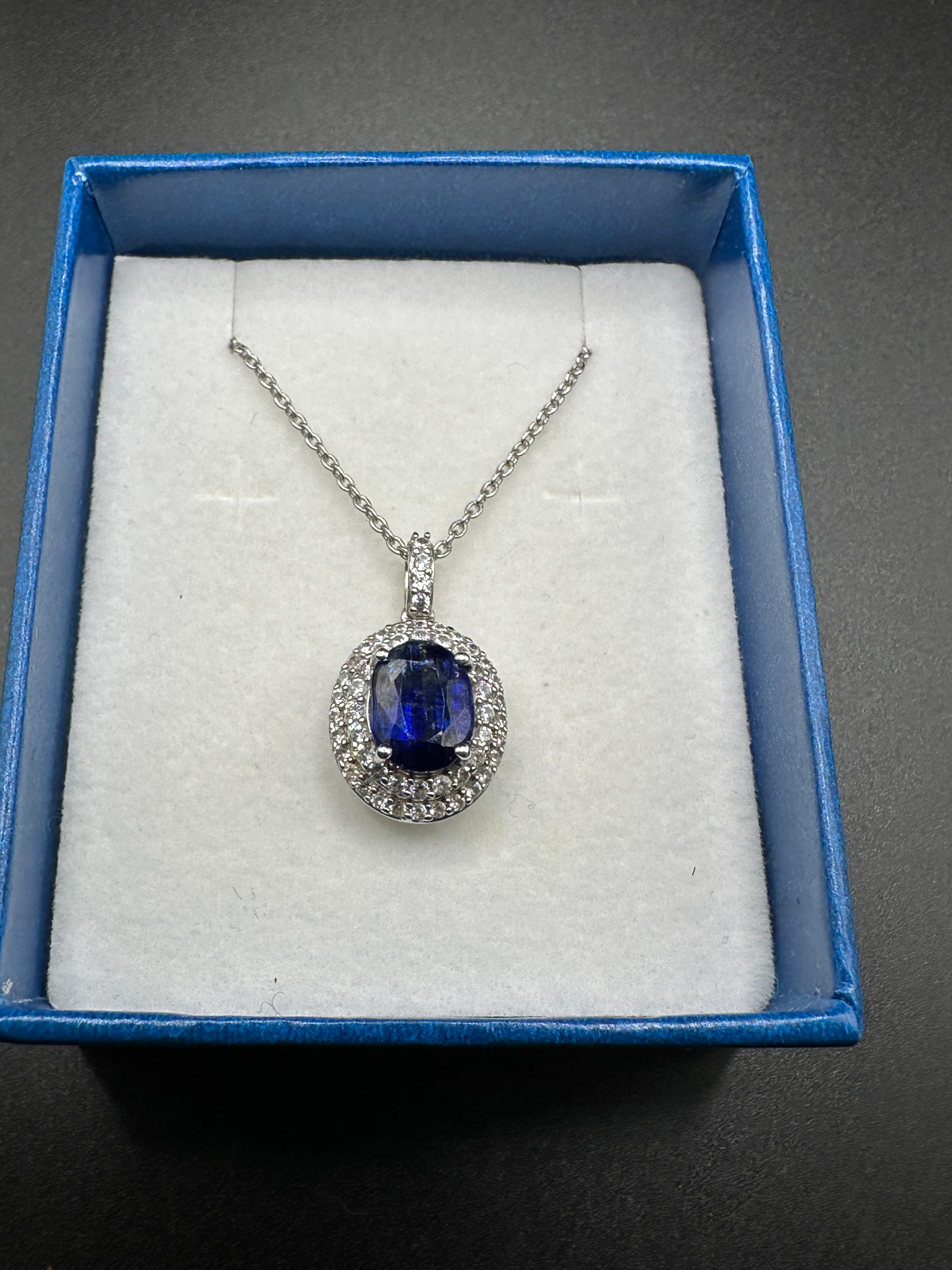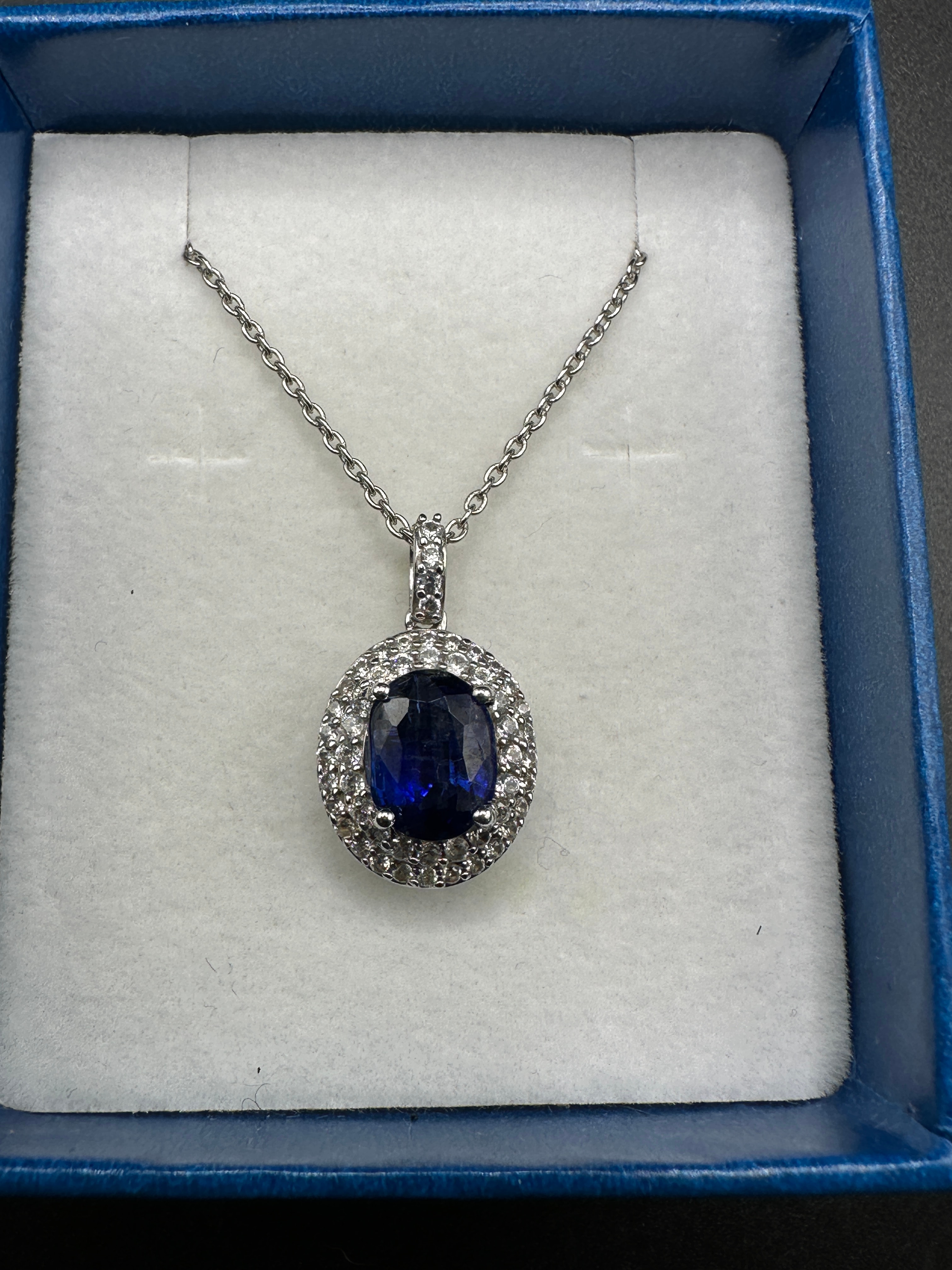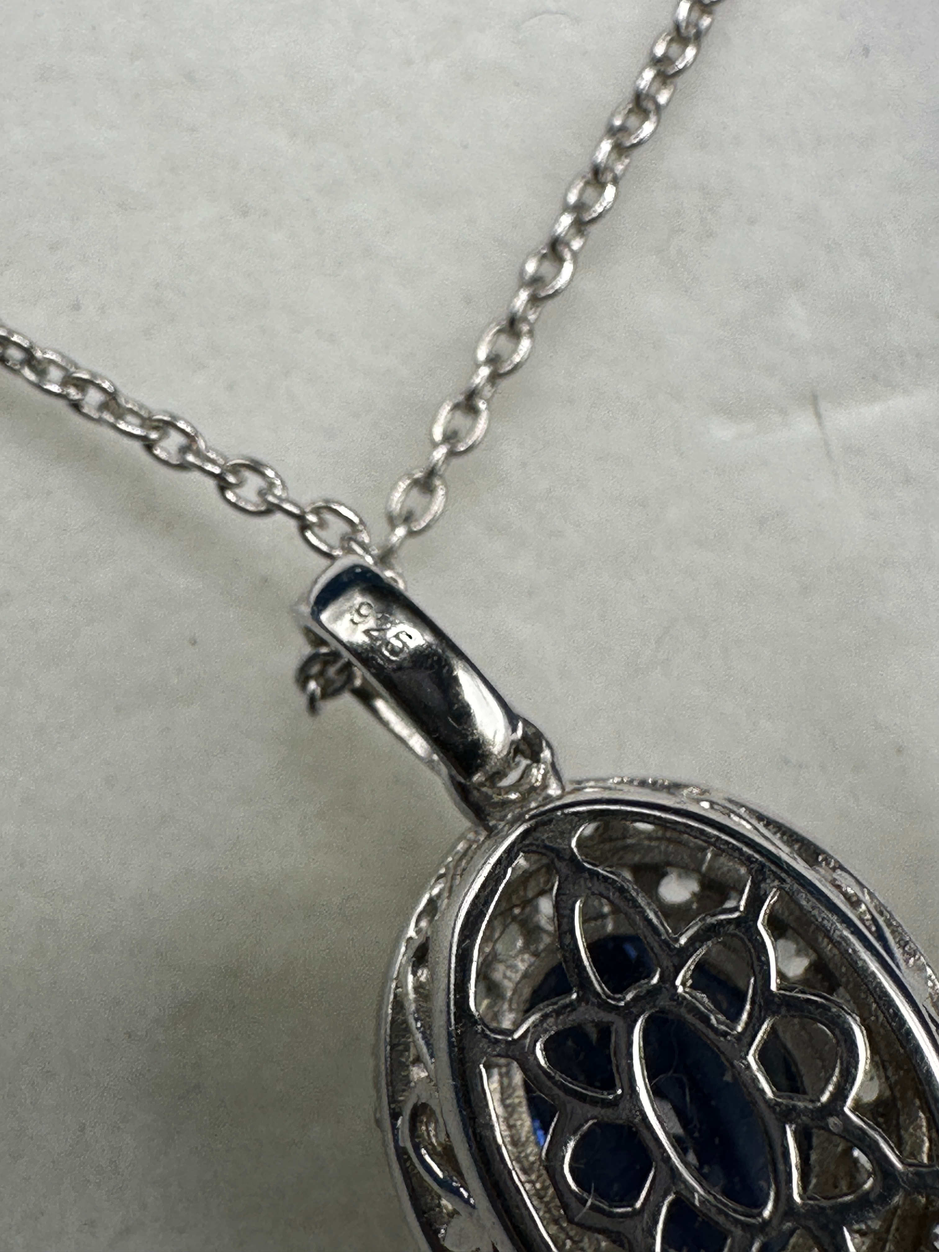 A contemporary Sterling Silver Sapphire and Diamond Halo Pendant Necklace. The pendant is crafted from sterling silver, with a “925” stamp visible on the bail. It is set with a central oval-cut, deep blue sapphire, encircled by a halo of small, round-cut diamonds, which also adorn the bail. The pendant’s reverse displays an open-work filigree backing.