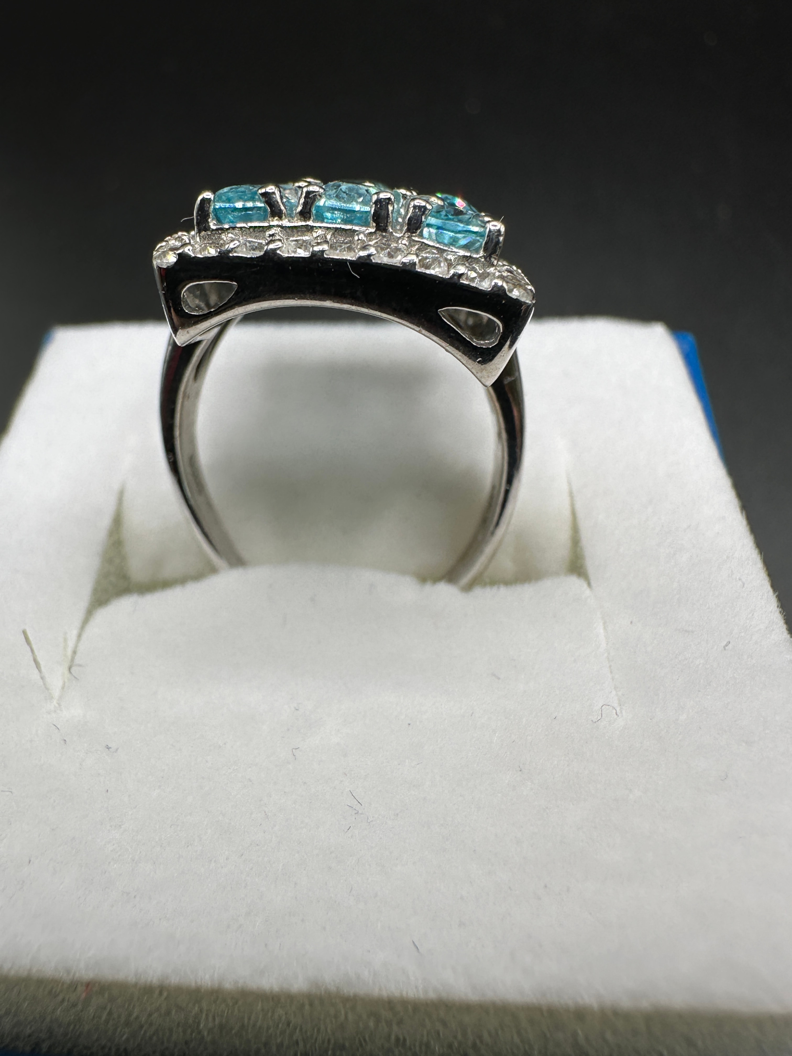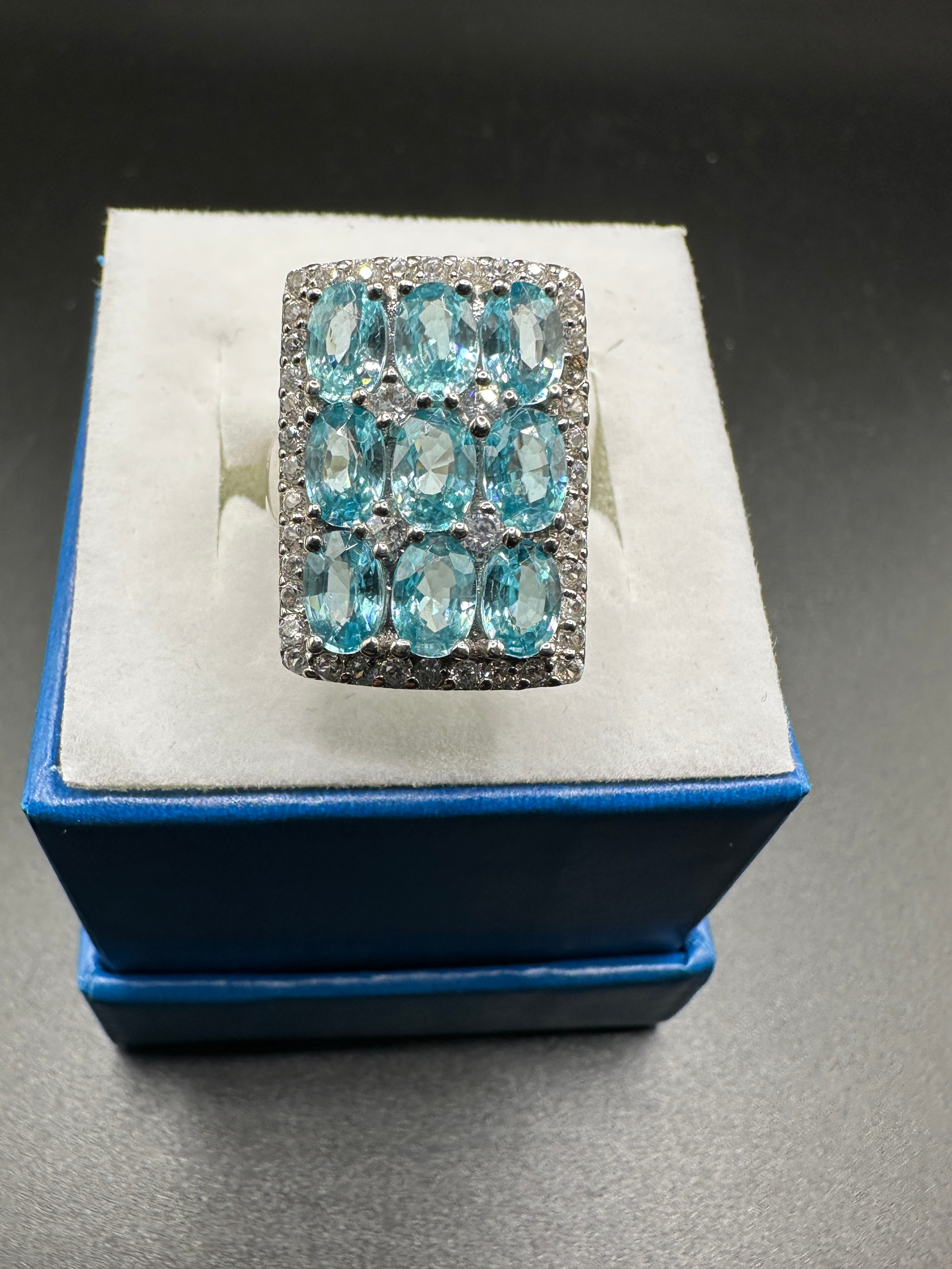A contemporary-style cocktail ring crafted from S925 sterling silver. The prominent rectangular setting features nine oval-cut, translucent, light blue gemstones arranged in a 3×3 grid, identified through web intelligence as Cambodian Blue Zircon. These main stones are accented and surrounded by numerous small, round, colorless stones, identified as White Zircon, set into the silver-toned metal.