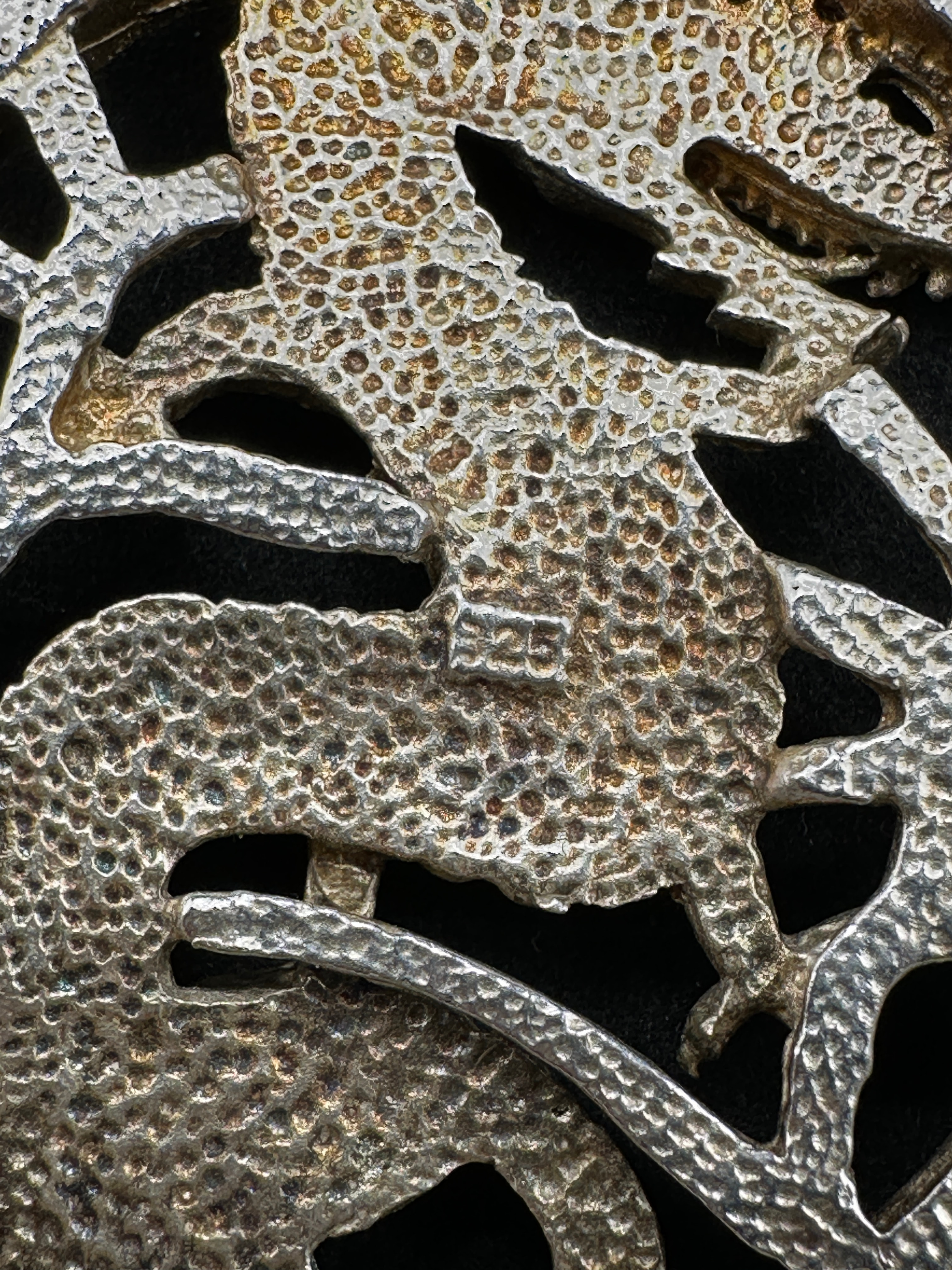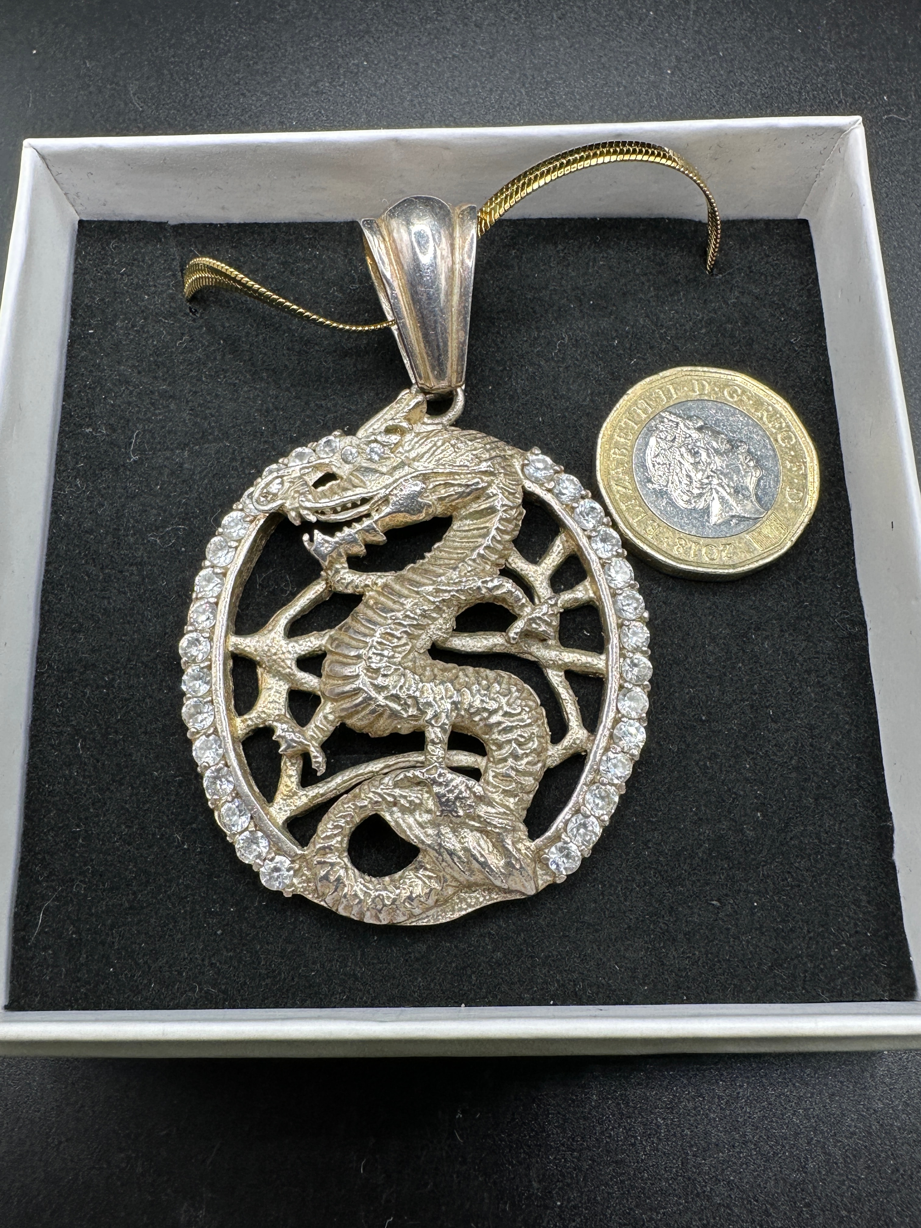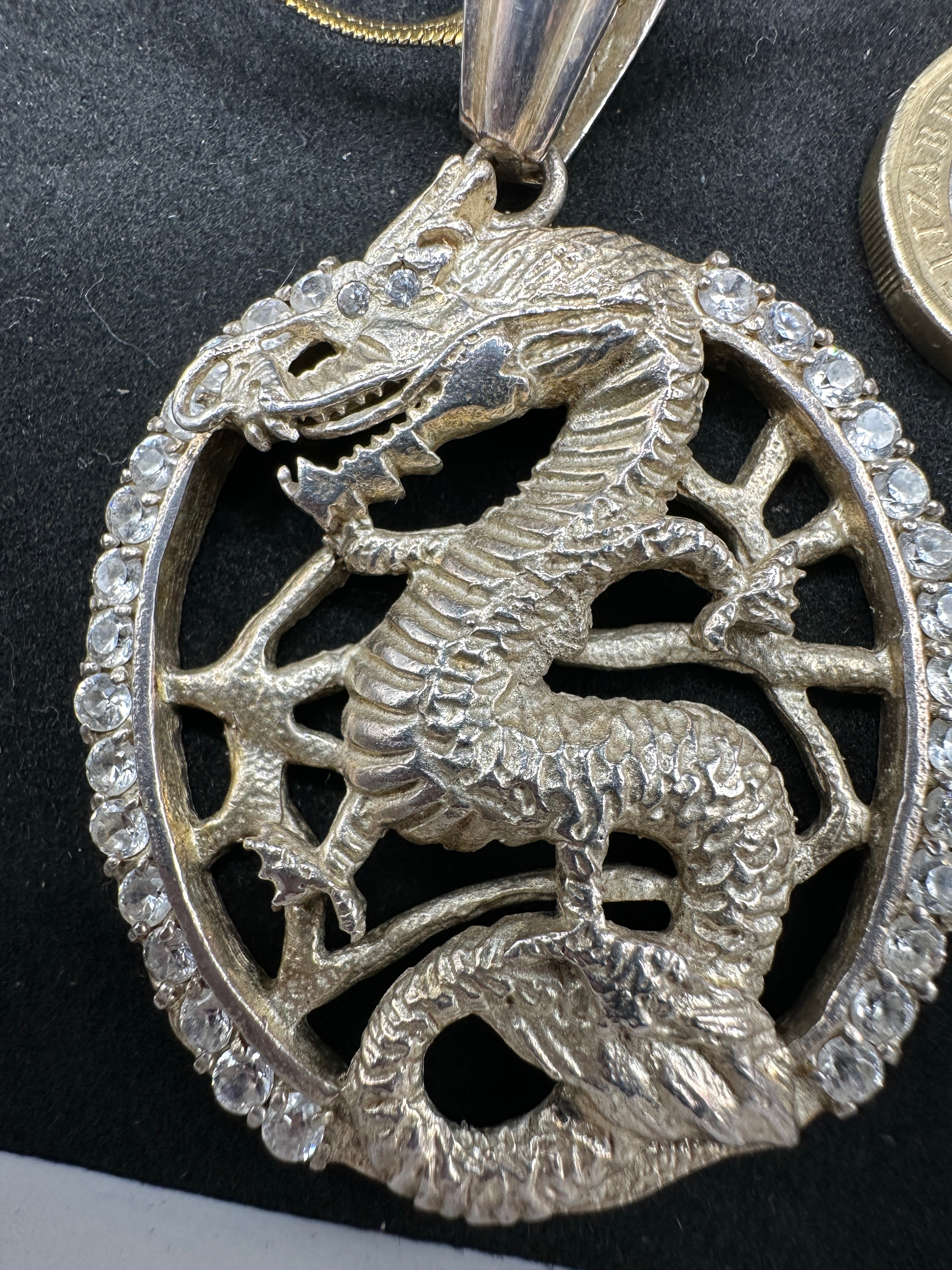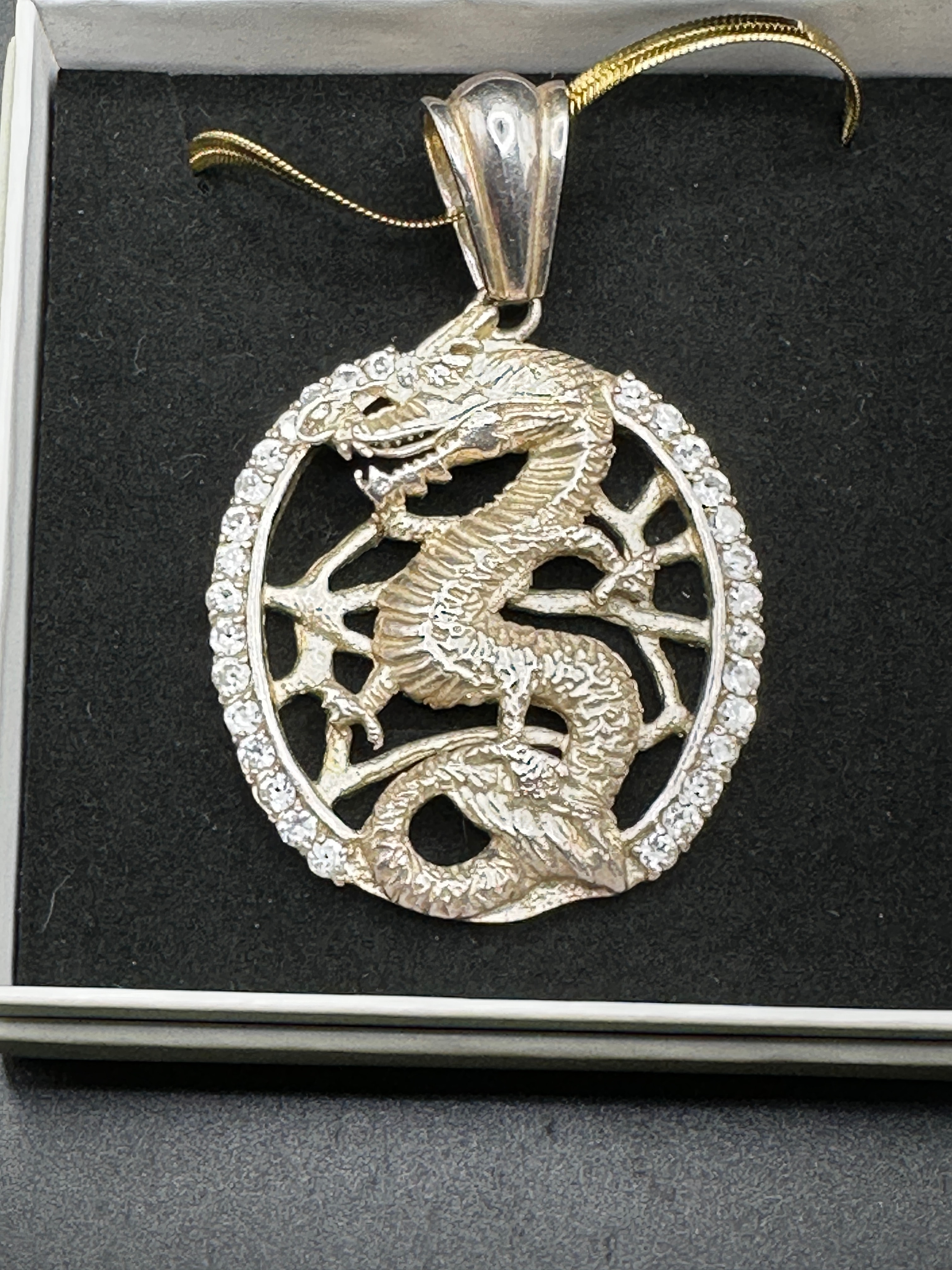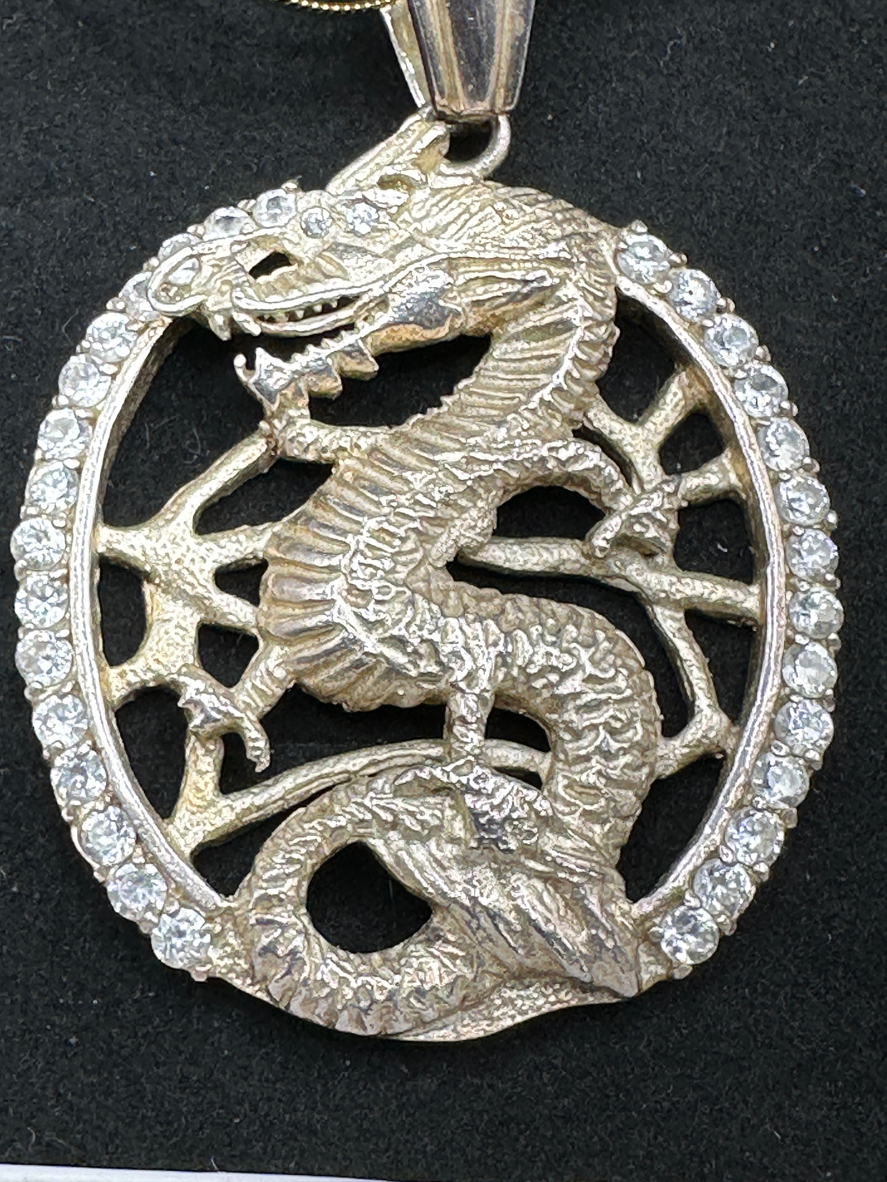 A circular, openwork pendant crafted from sterling silver, featuring a coiled dragon motif within its central frame. The outer edge of the circular frame is set with numerous small, round-cut, clear cubic zirconia stones. A prominent, polished bail is attached at the top. The reverse of the pendant displays a “925” hallmark.