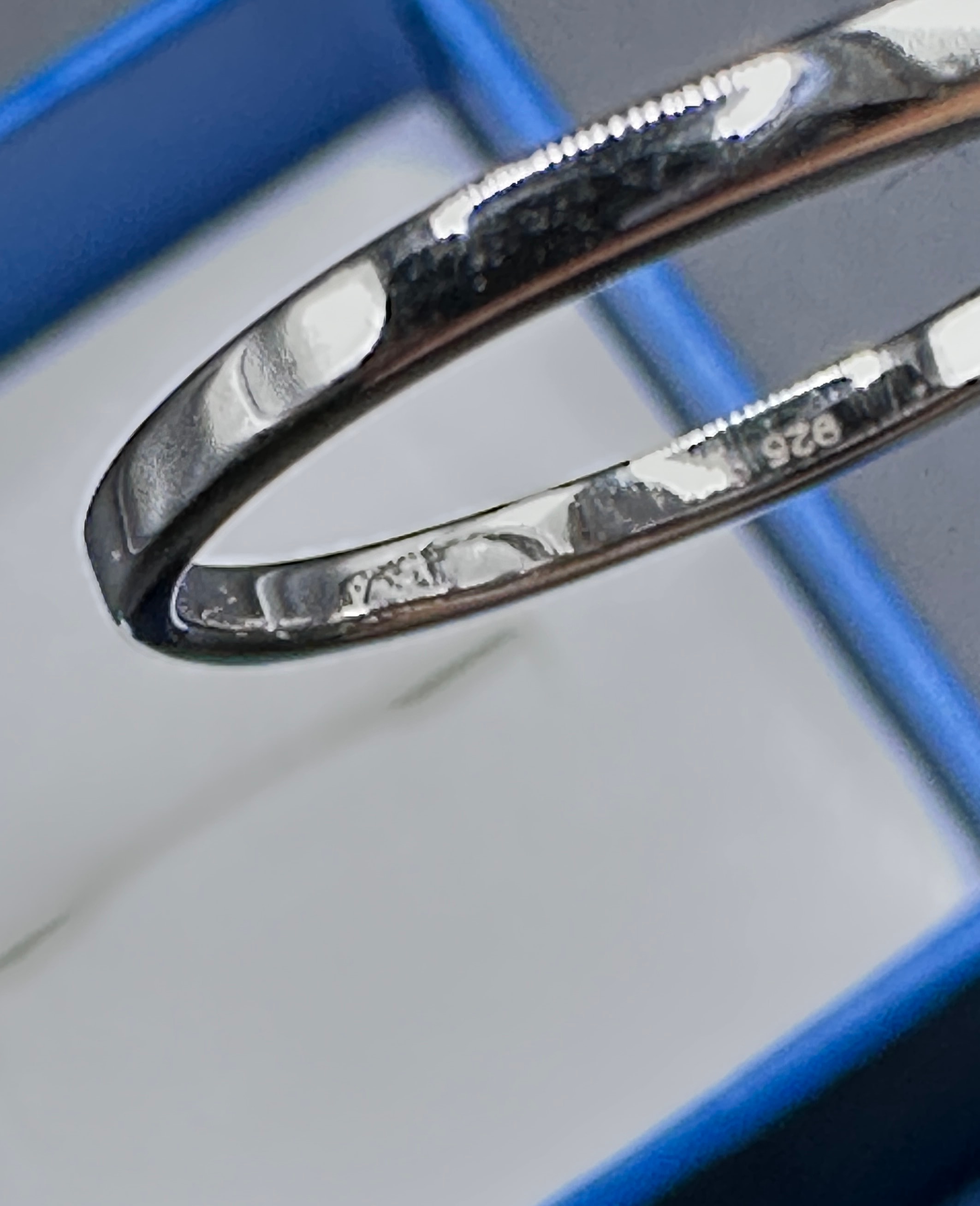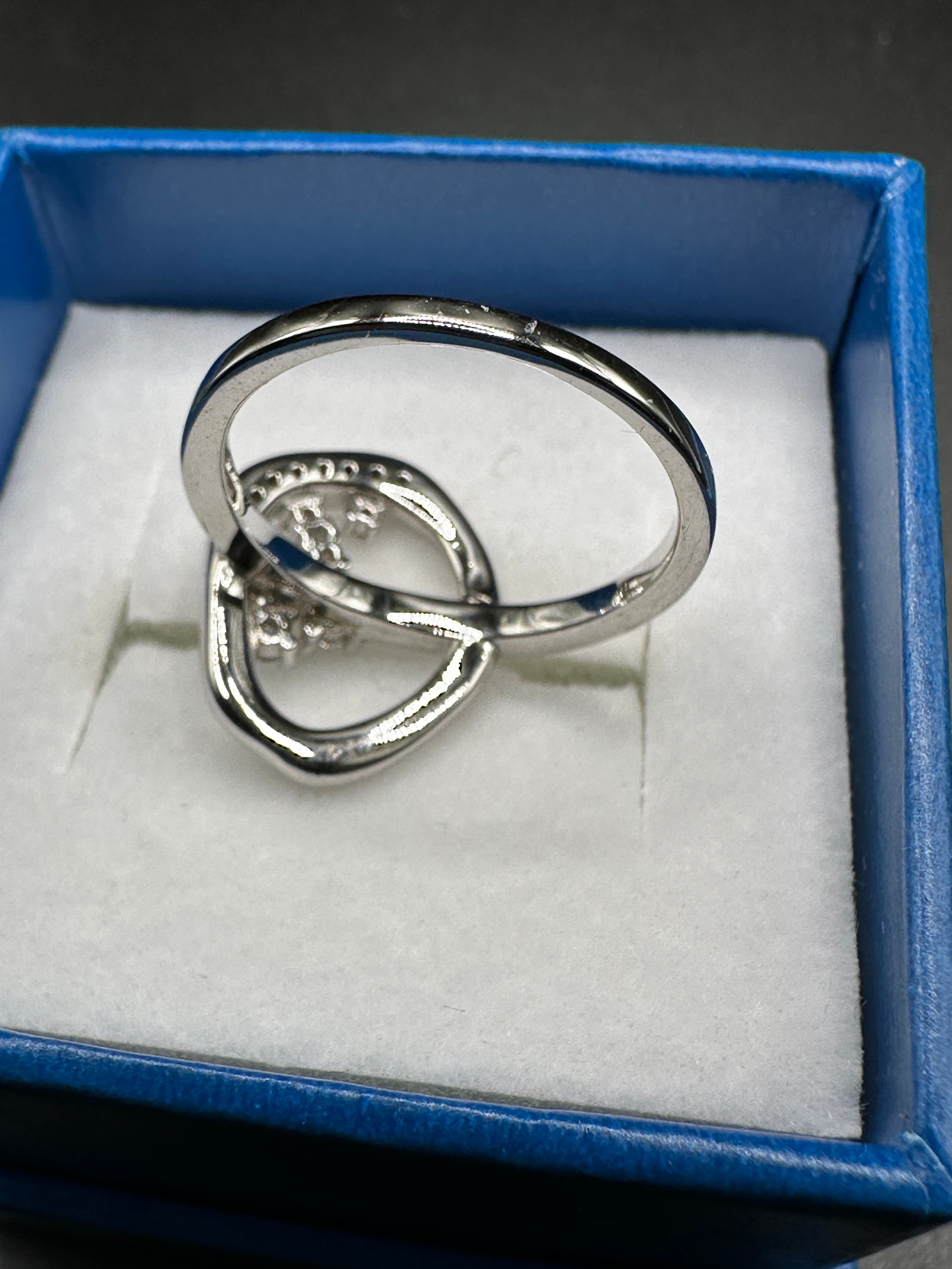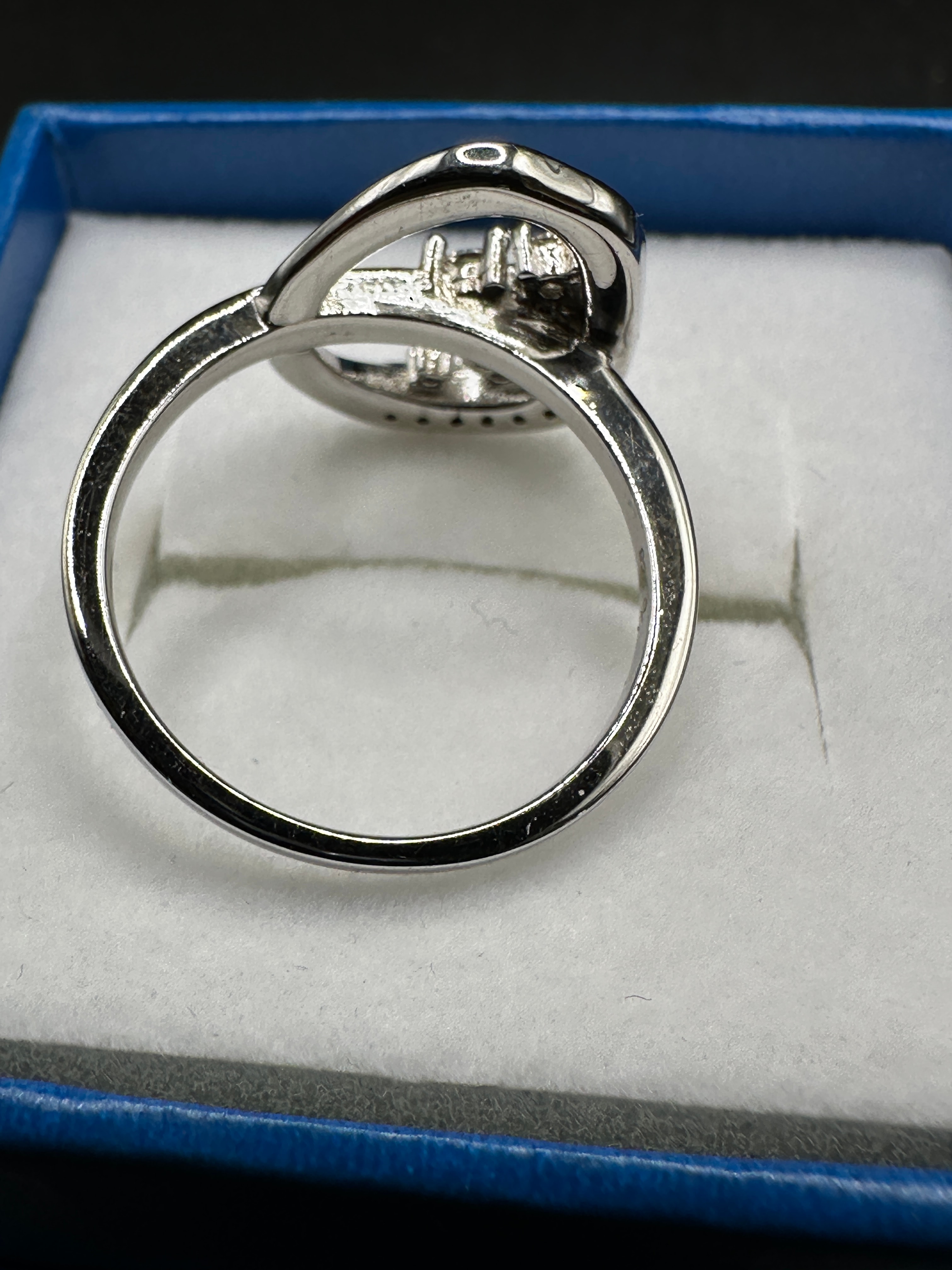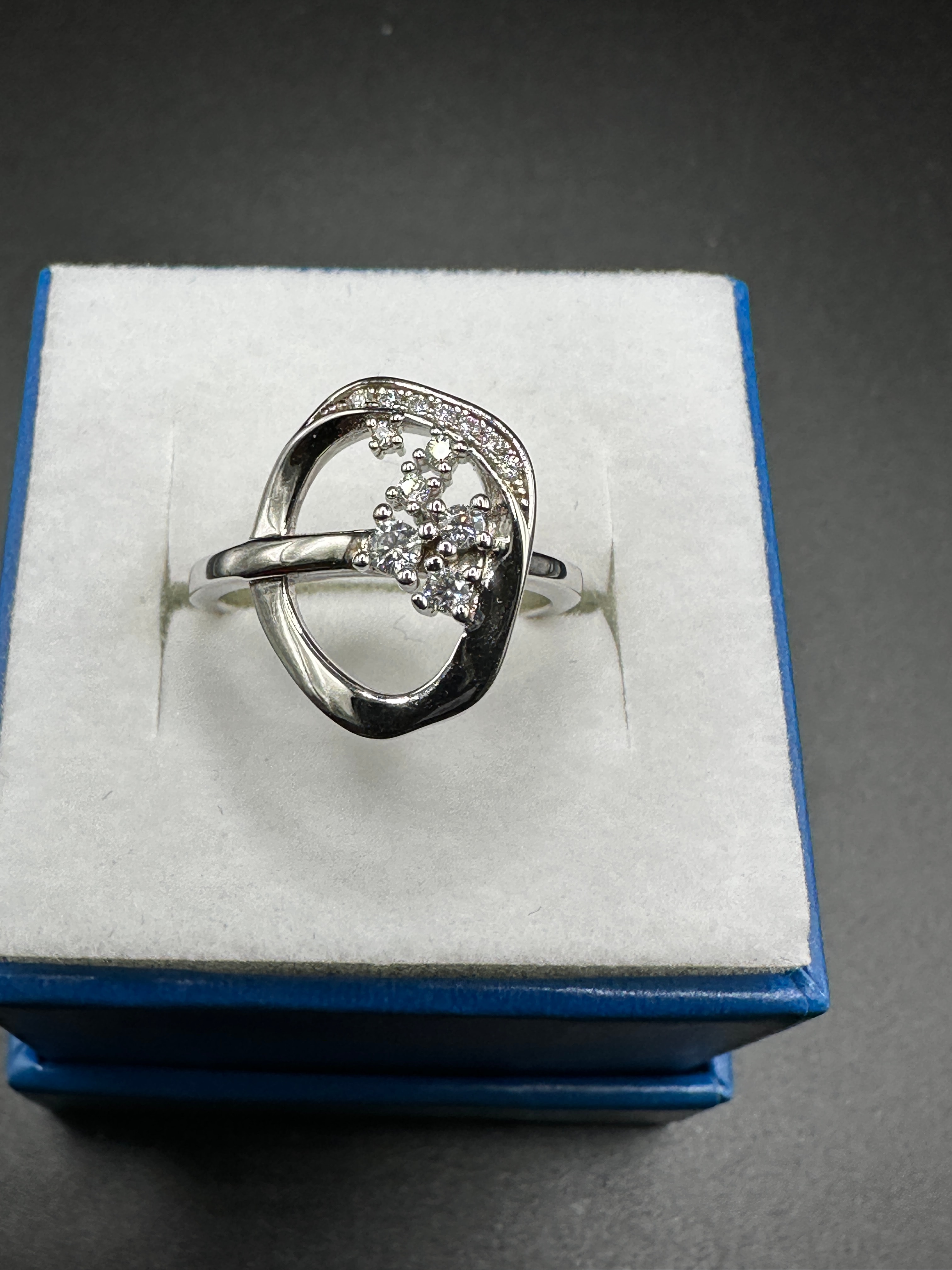 A modern-style finger ring, crafted from sterling silver as indicated by a “925” hallmark and an accompanying, illegible maker’s mark on the interior of the band. The design features an abstract, openwork head composed of intertwined polished silver elements, one of which is adorned with a cluster of numerous small, round brilliant-cut colorless stones.