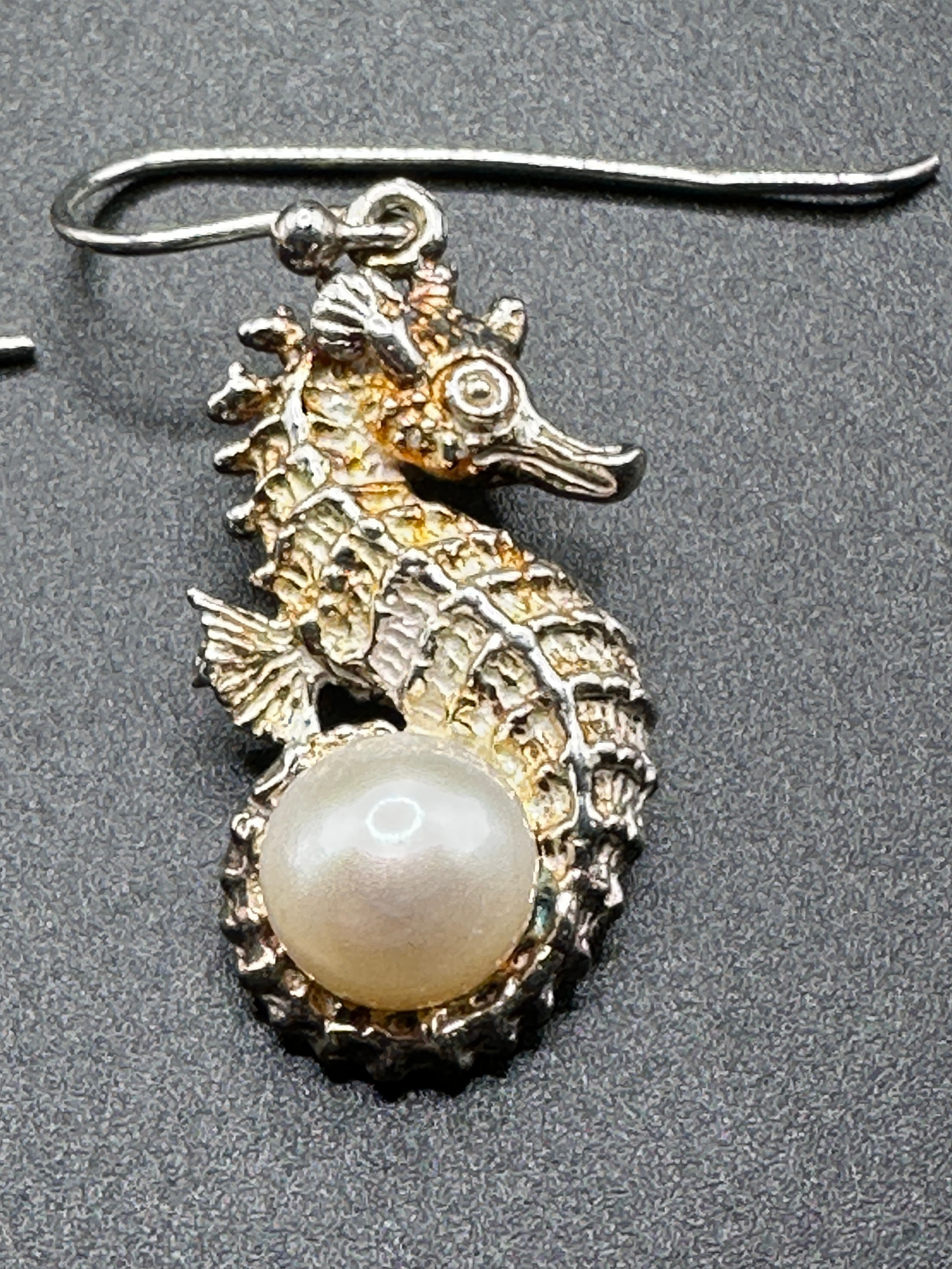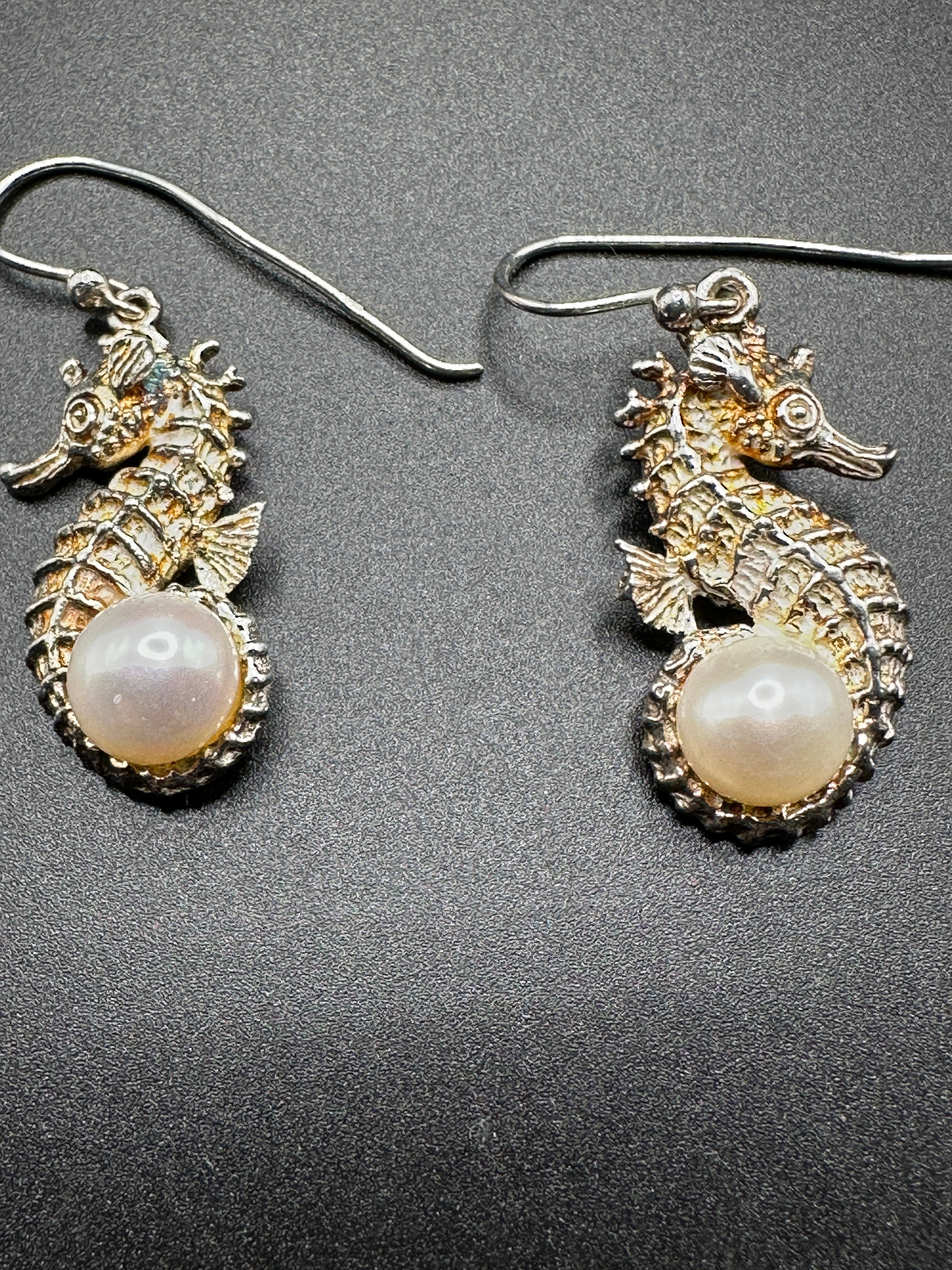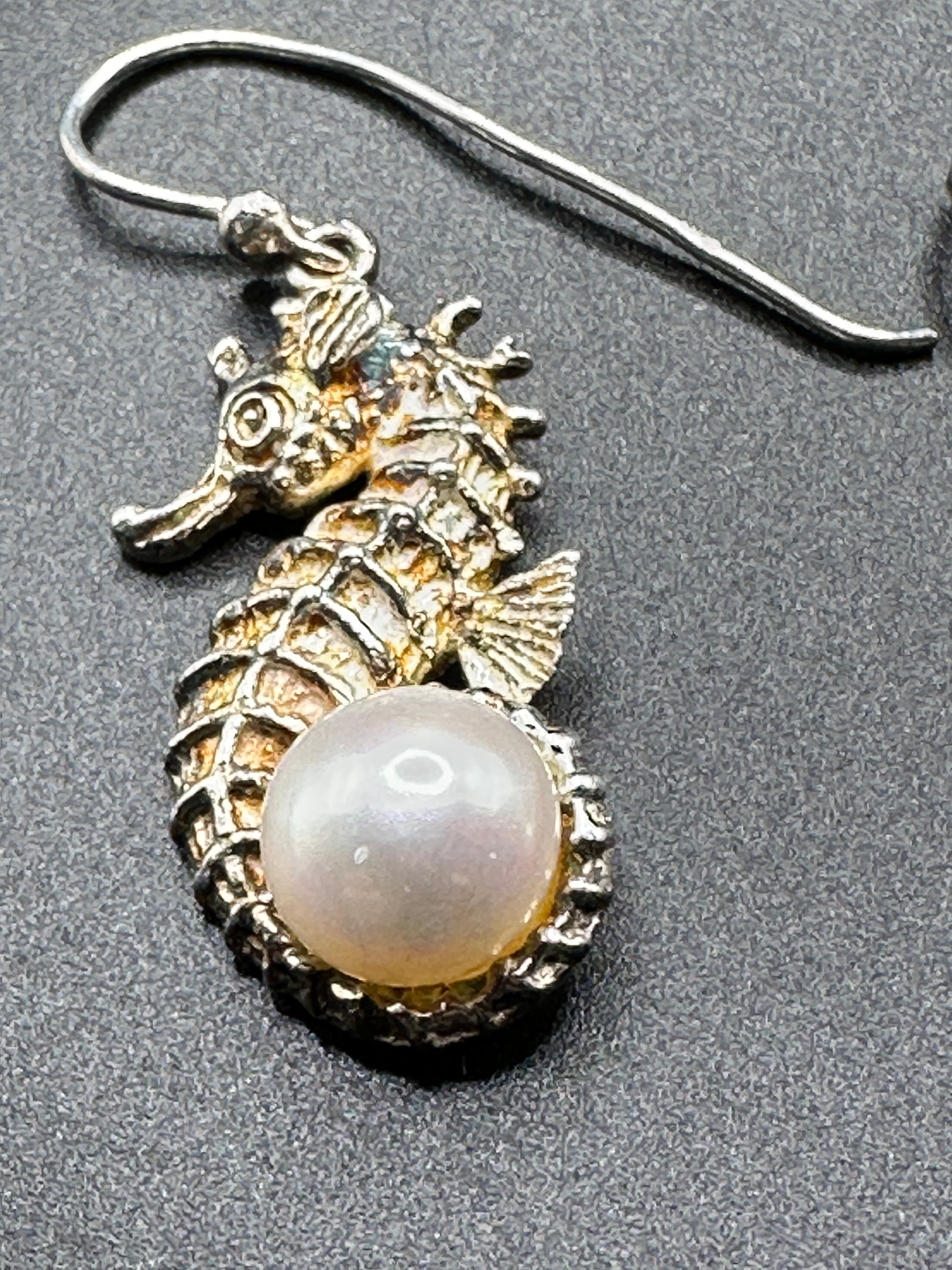 A pair of sterling silver Hawaiian seahorse earrings. Each earring features a figural seahorse design crafted from sterling silver with distinct gold-tone accents and patination. Each seahorse securely holds a single, spherical, lustrous pearl-like bead. The earrings are suspended from simple sterling silver wire hooks.