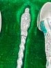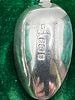 A cased set of seven Victorian sterling silver apostle spoons. Each spoon features a plain bowl and a decorative handle, primarily twisted or fluted, terminating in various finials including a figural element and decorative crests. The set is presented in an oblong, hinged dark case with a vibrant green velvet or satin lining. Hallmarks visible on the reverse of one spoon’s bowl include a maker’s mark ‘L&S’, a crown, and a lion passant, confirming sterling silver.