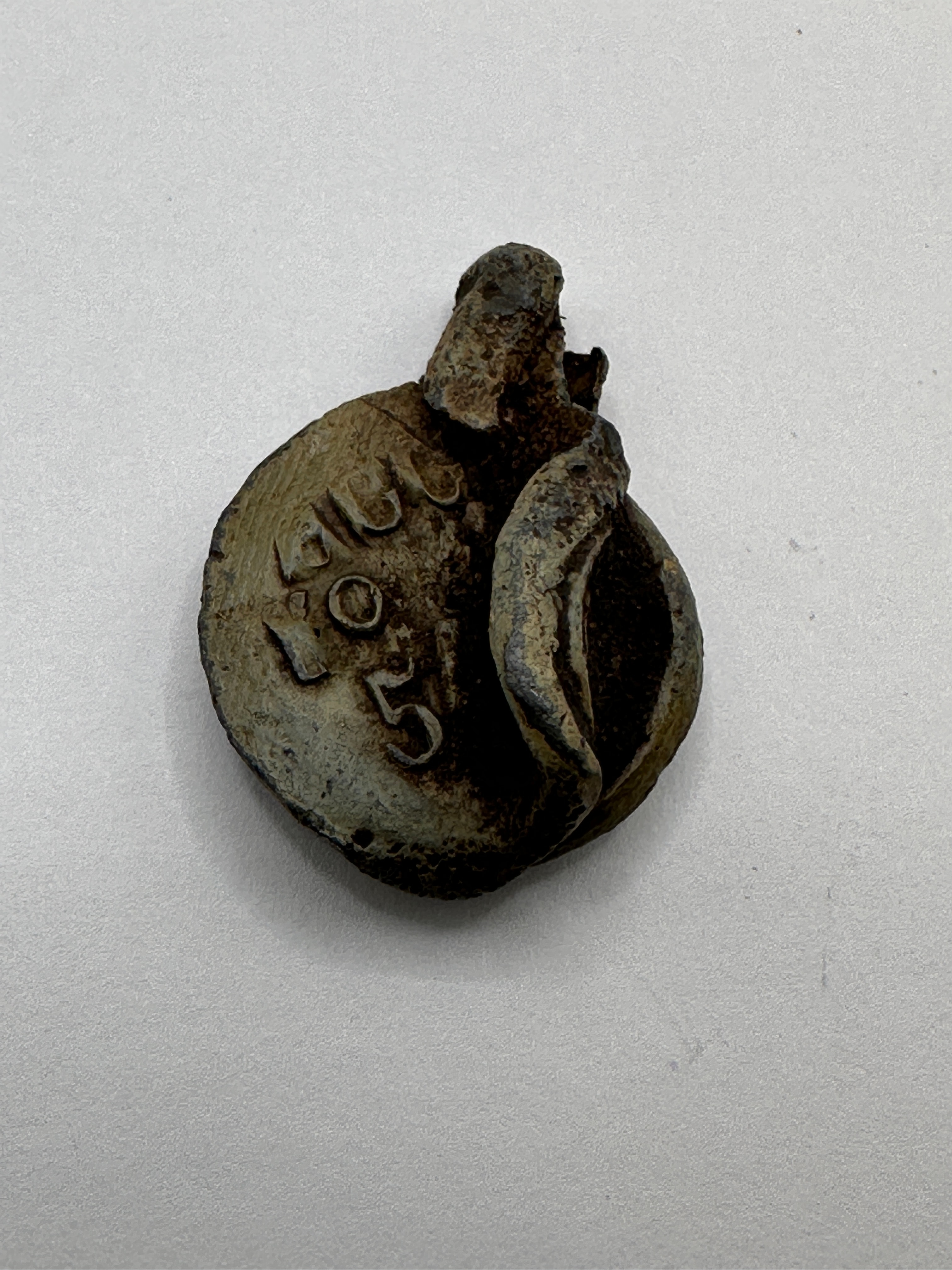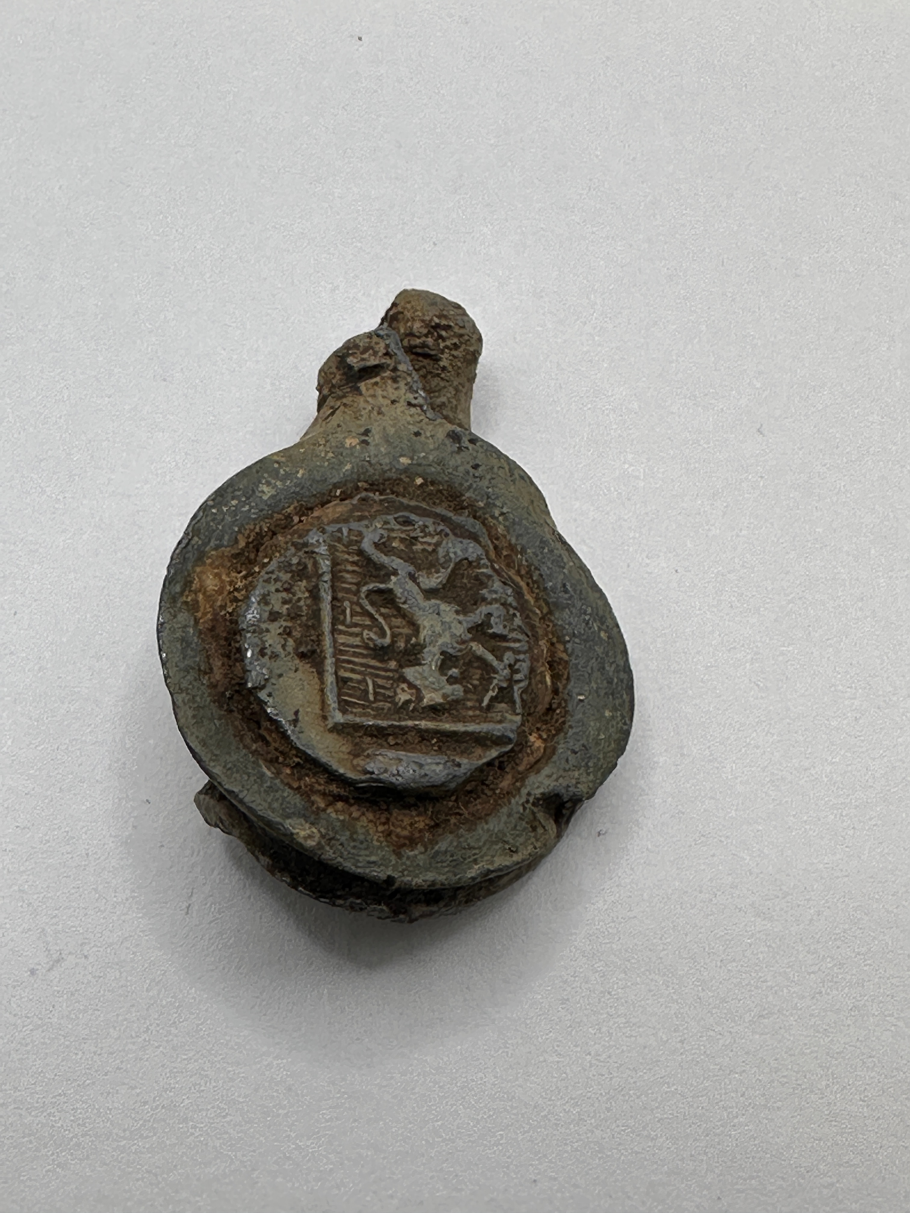 A George III lead or lead alloy cloth seal, dated 1805. Circular in form with a distorted, folded element at the top, consistent with its function as a bale or cloth seal. One side features a central rectangular shield bearing a rampant lion motif, likely heraldic, within a circular border. The opposing side clearly displays the raised numerals “1805” with a partially legible inscription above, appearing to be “ALLE” or “ALLO”.