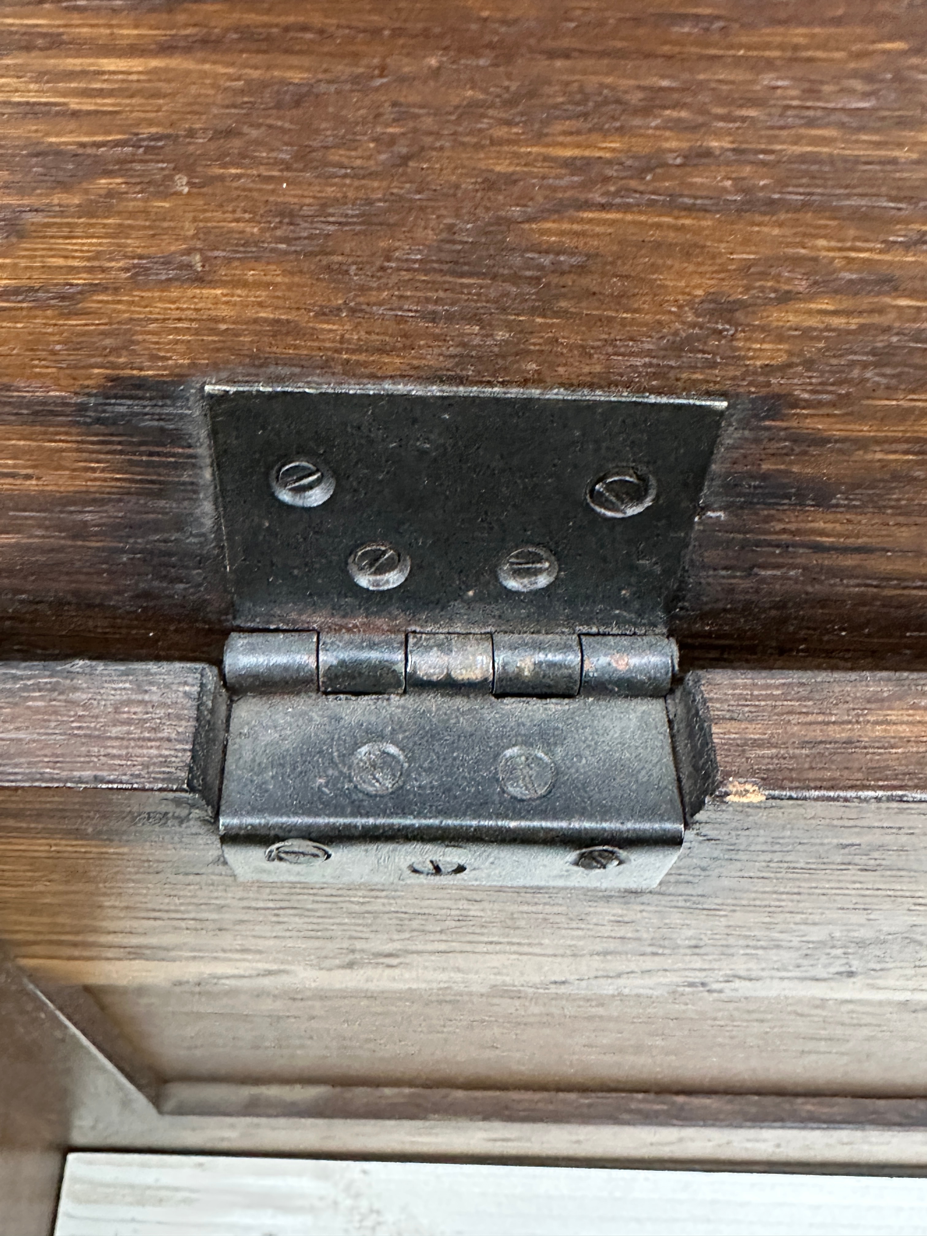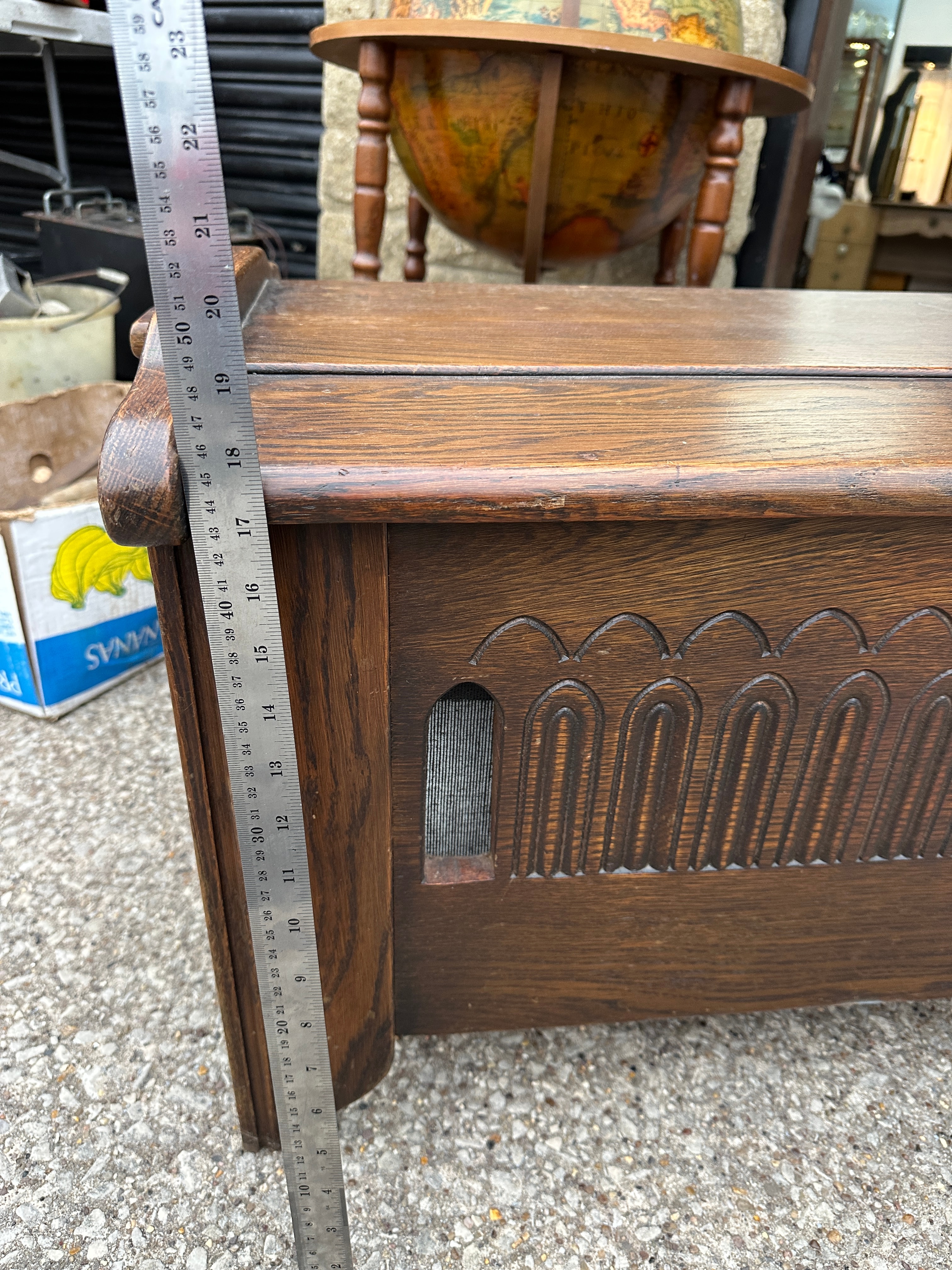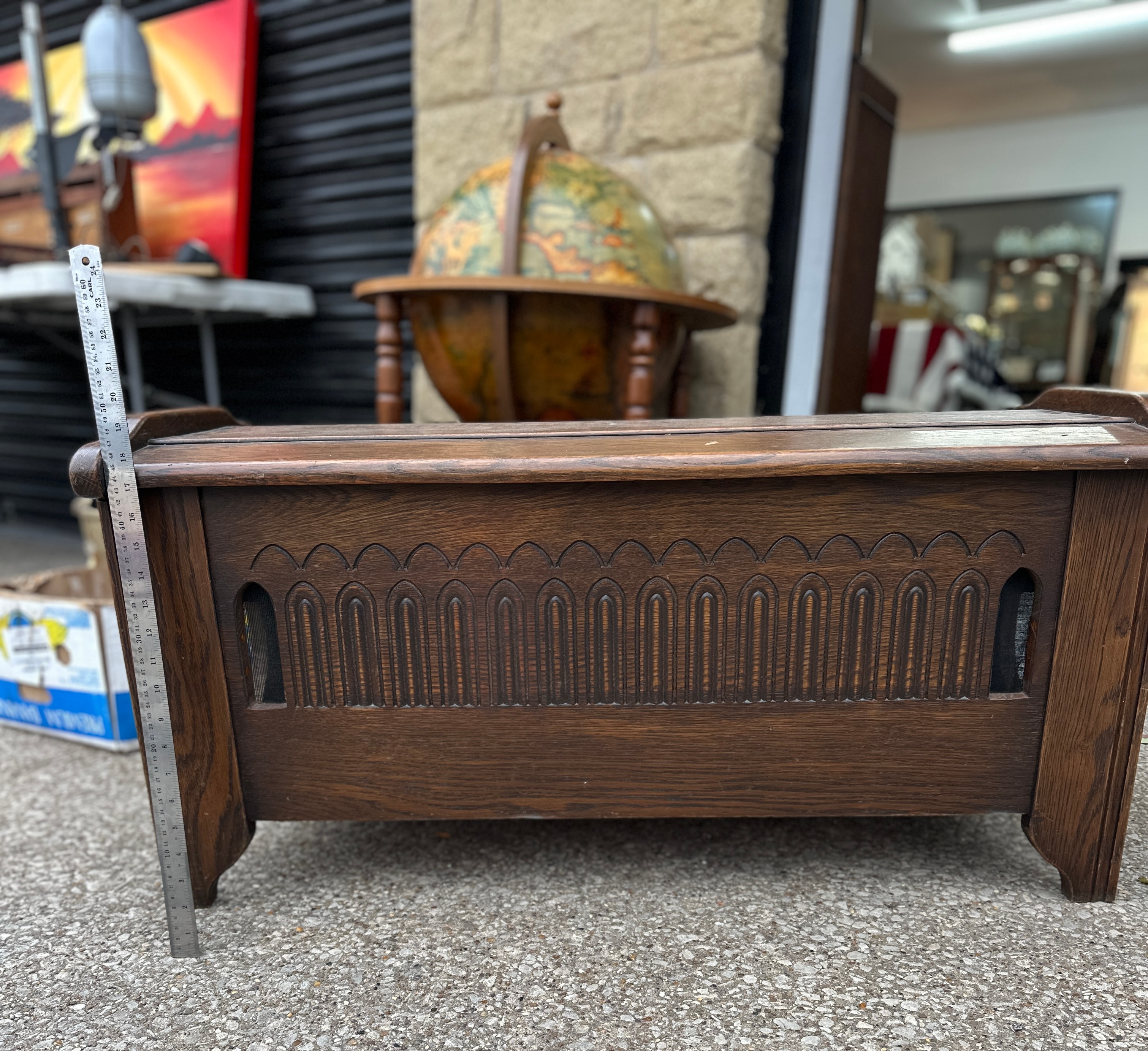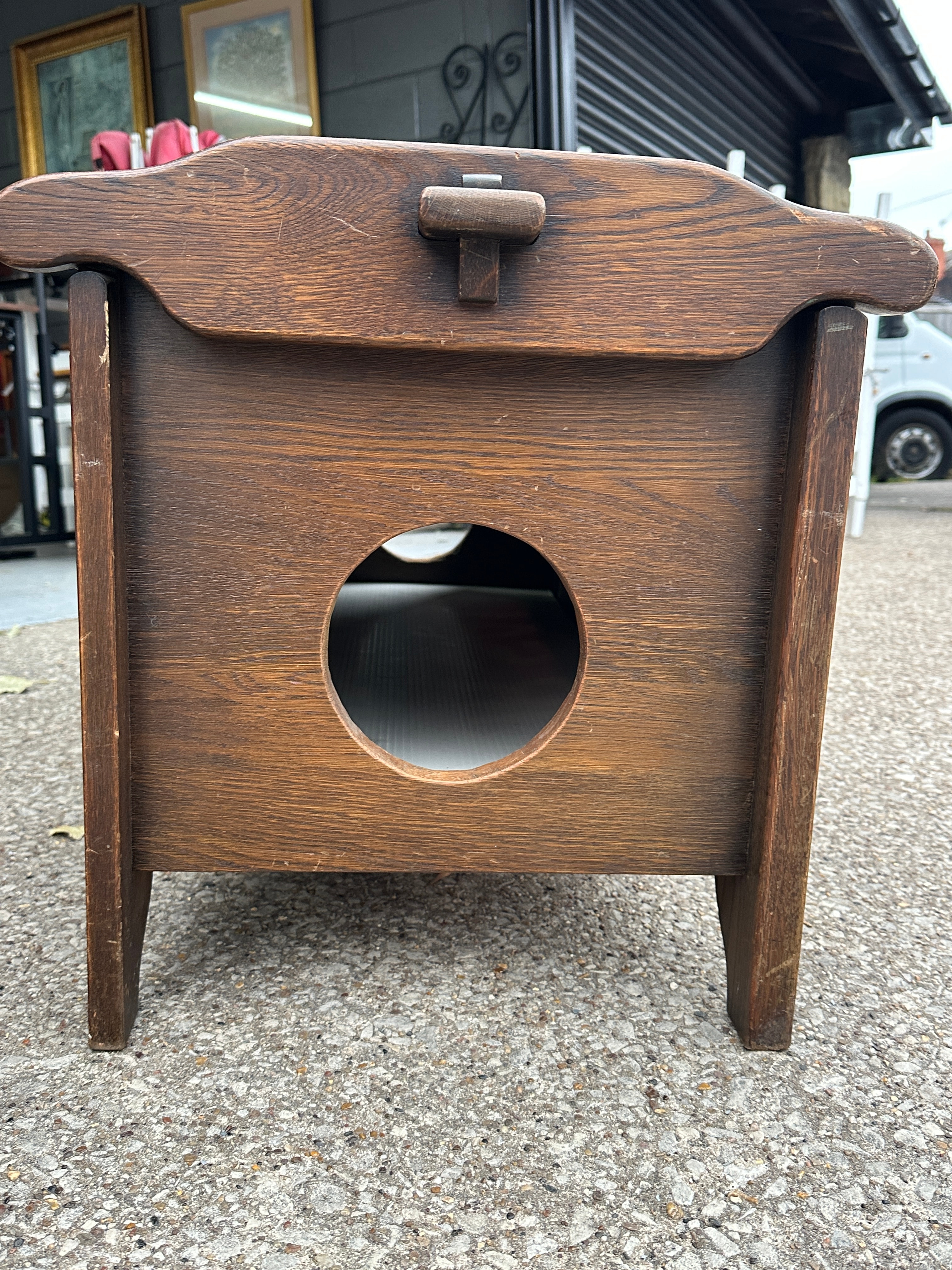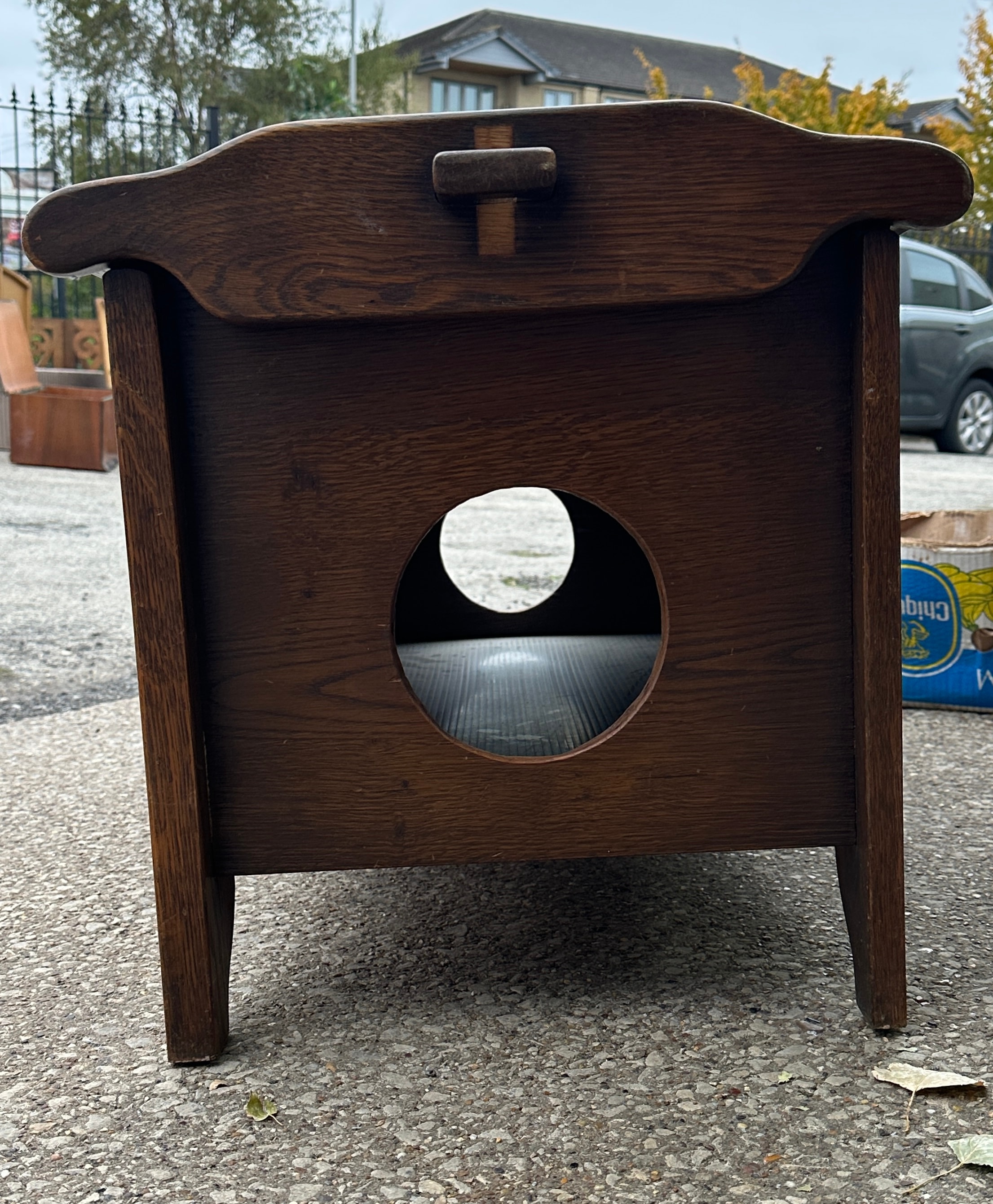 A vintage storage chest, likely functioning as a fireside box or utility chest, exhibiting design elements consistent with the Gothic Revival period. Constructed from dark-stained solid oak, it features a hinged lid with a distinctive wooden handle/latch. The front panel is adorned with deeply carved, repeating arched motifs, flanked by recessed rectangular sections with vertical slatted details. Each side panel includes a prominent circular cutout. The interior reveals a contrasting light-colored lining or base. No identifying text or markings are visible.