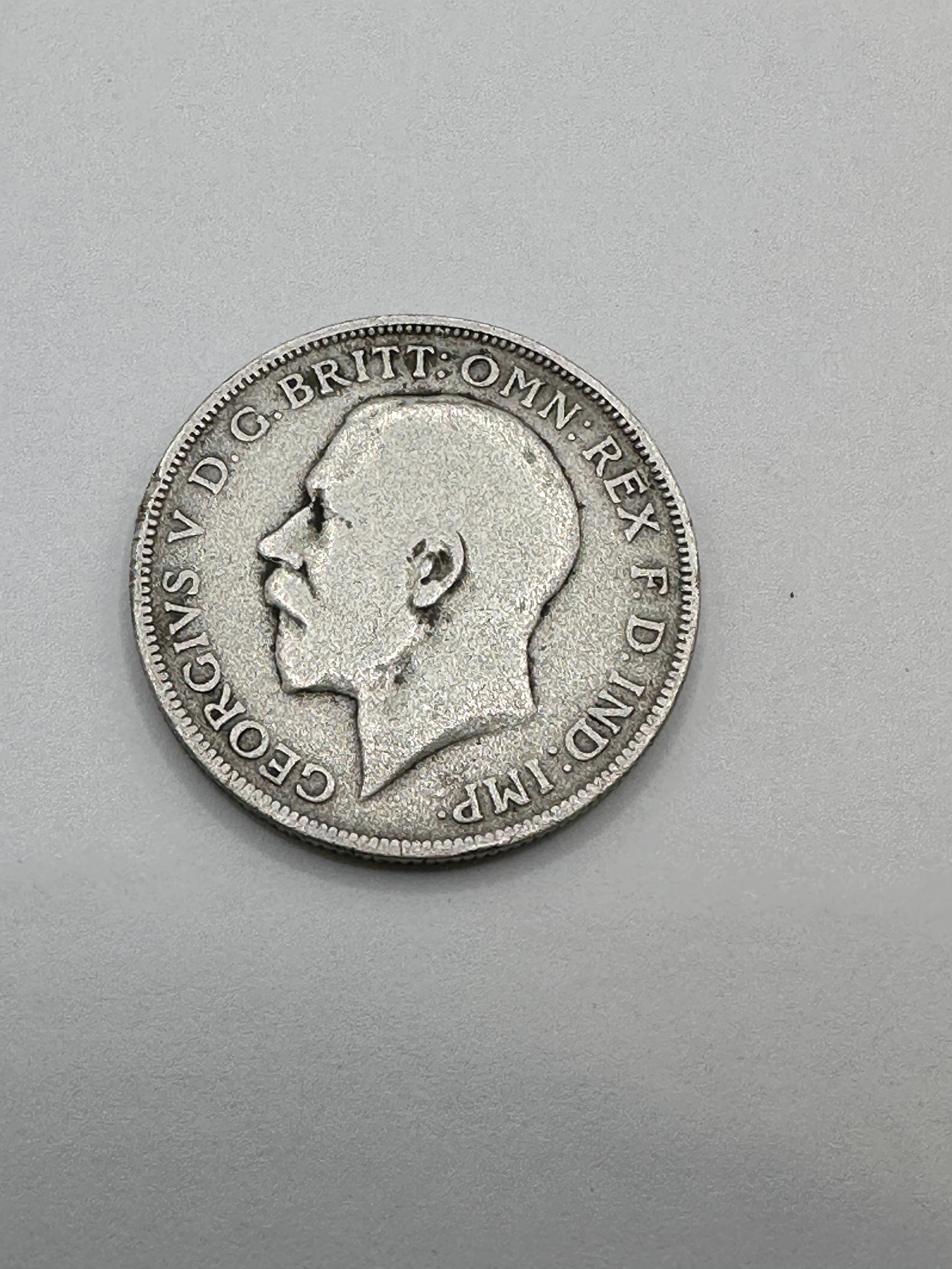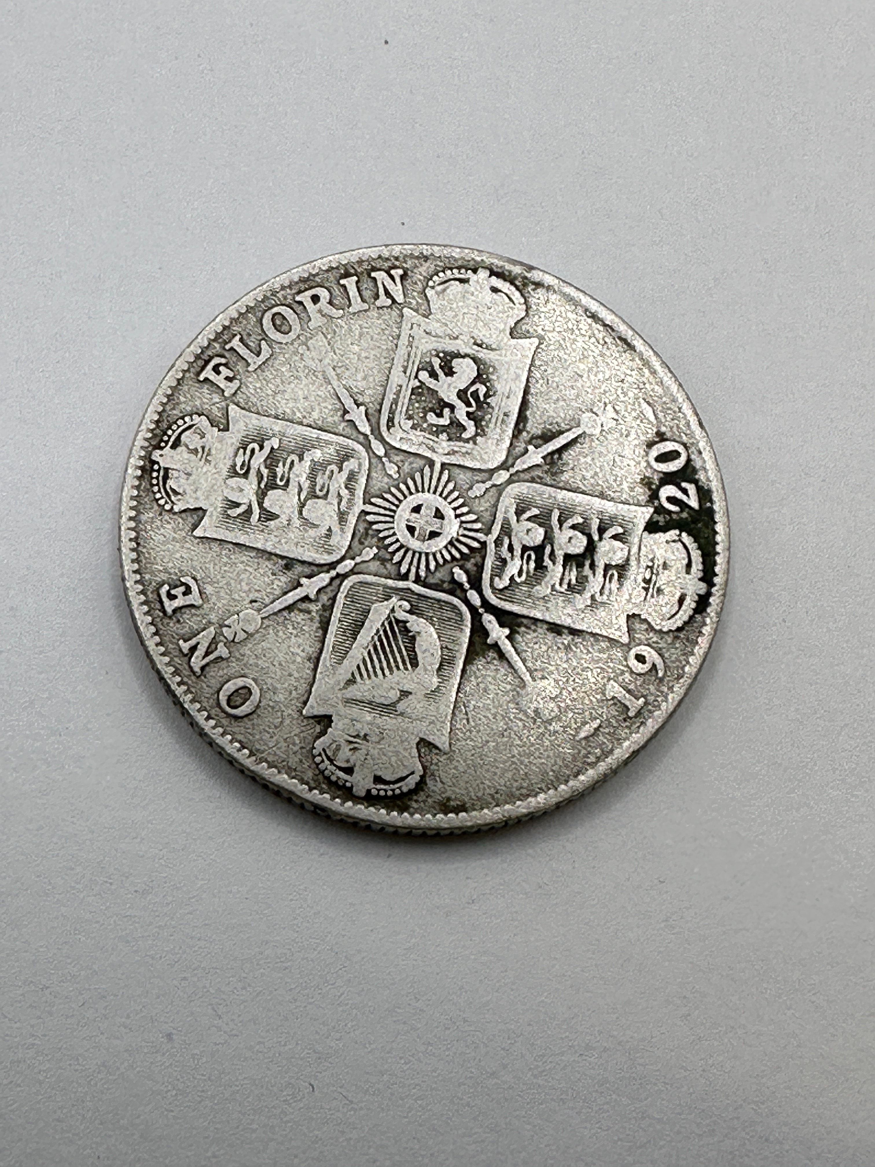 A United Kingdom 1920 King George V Silver Florin Coin (KM#817). This circular silver-colored metal coin features on its obverse a left-facing profile bust of King George V, inscribed “GEORGIVS V D. G. BRITT: OMN: REX F. D. IND: IMP.” The reverse displays a cruciform arrangement of four crowned heraldic shields, including one with a harp, another with a lion rampant, and another with three lions passant guardant, radiating from a central sun-like design. The denomination “ONE FLORIN” and the date “1920” encircle the design.