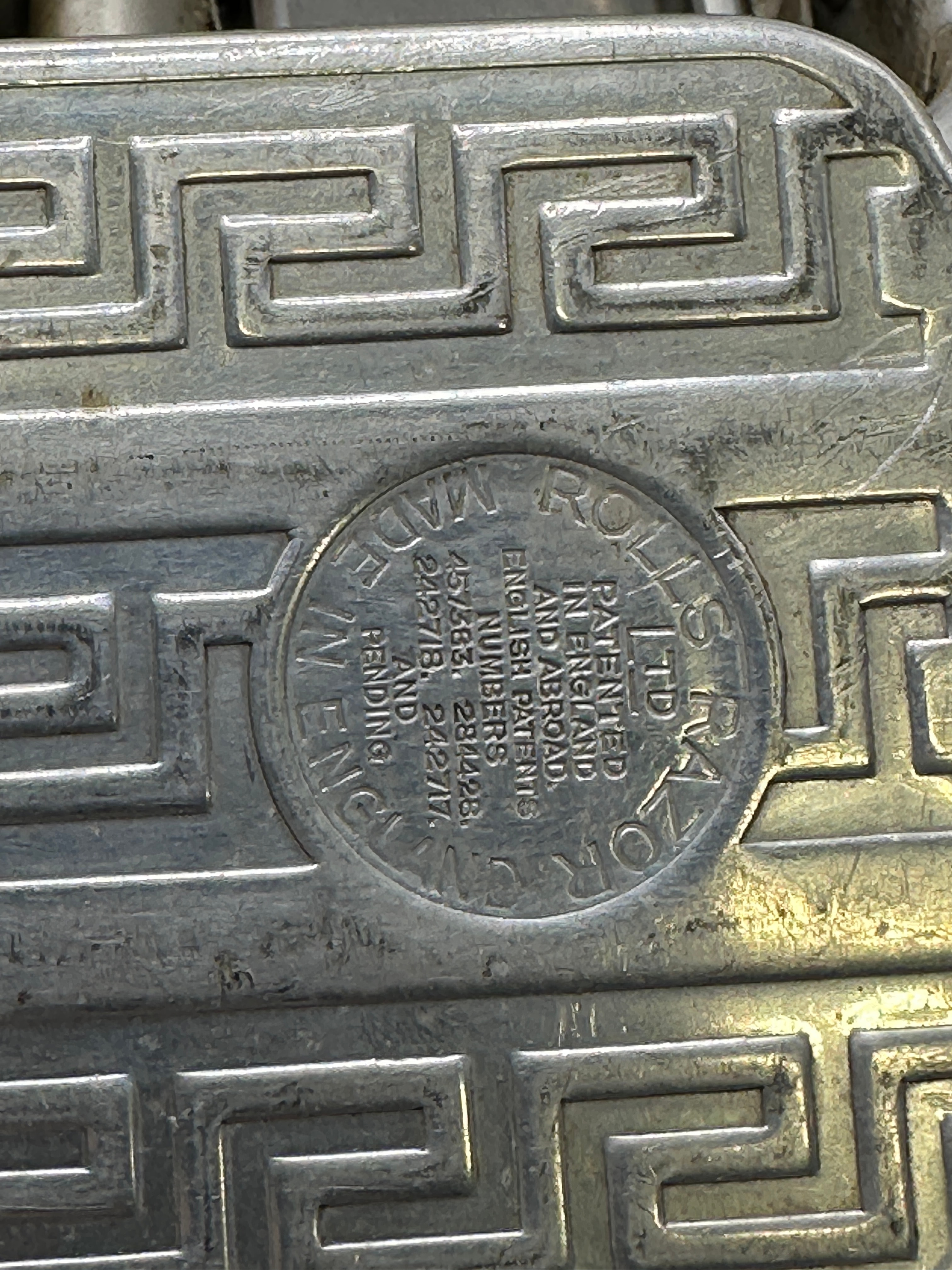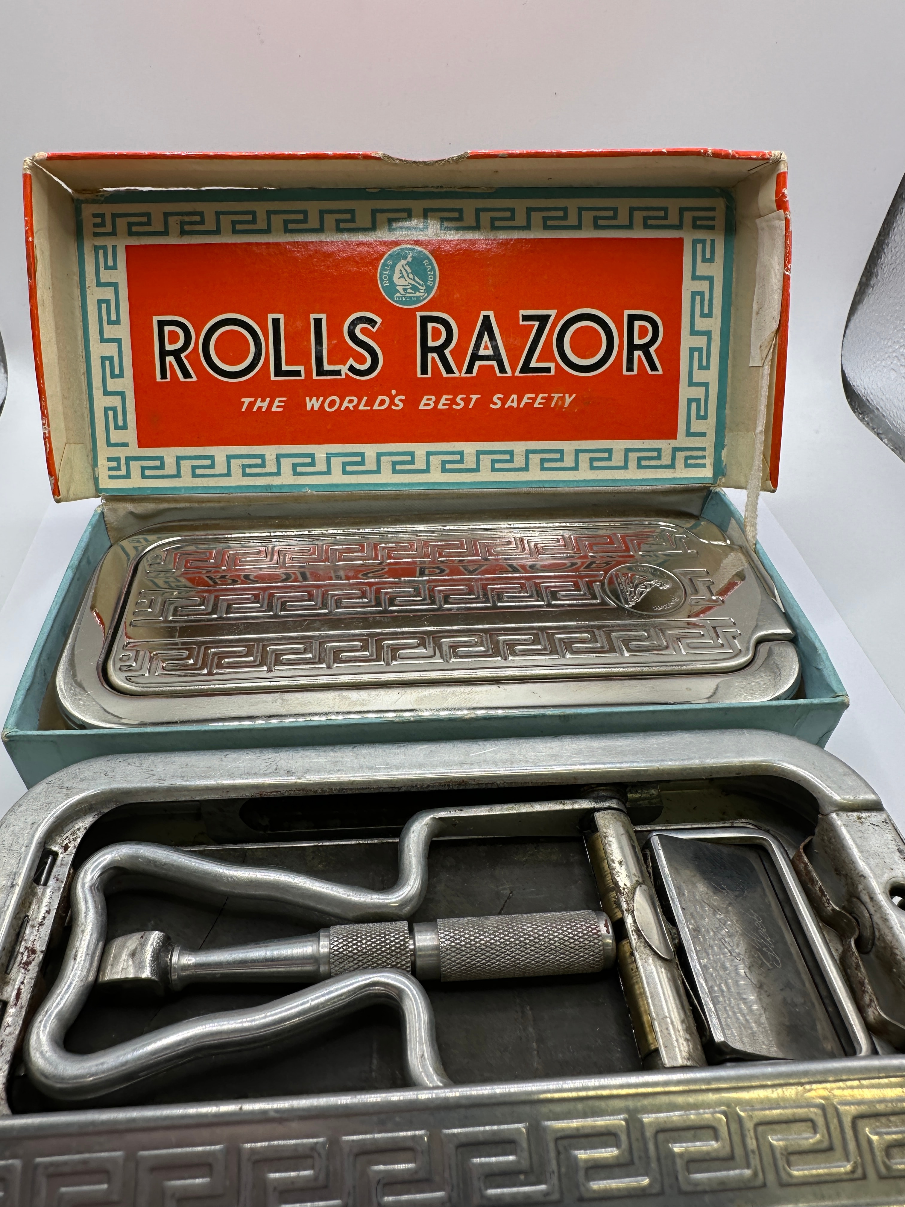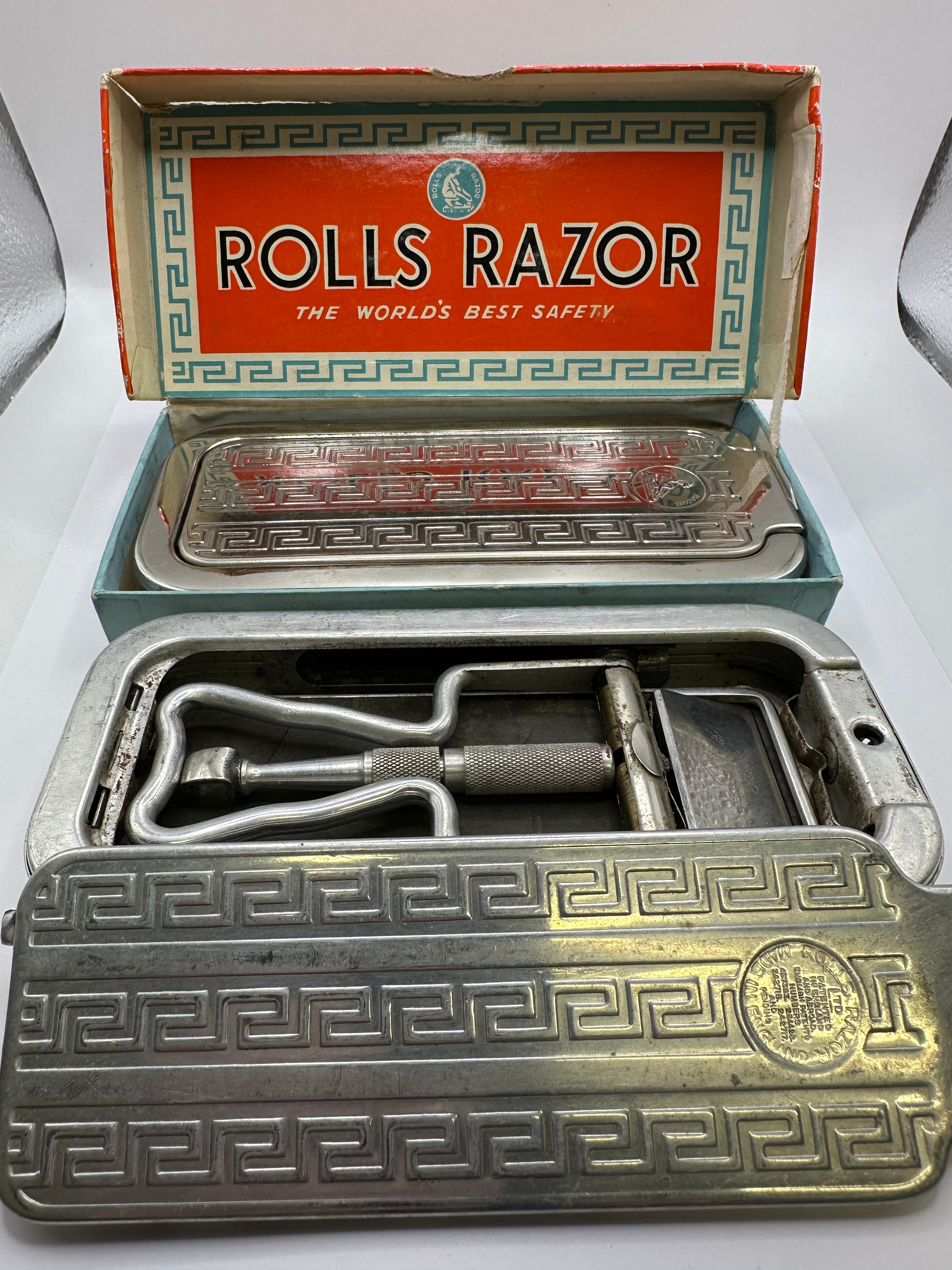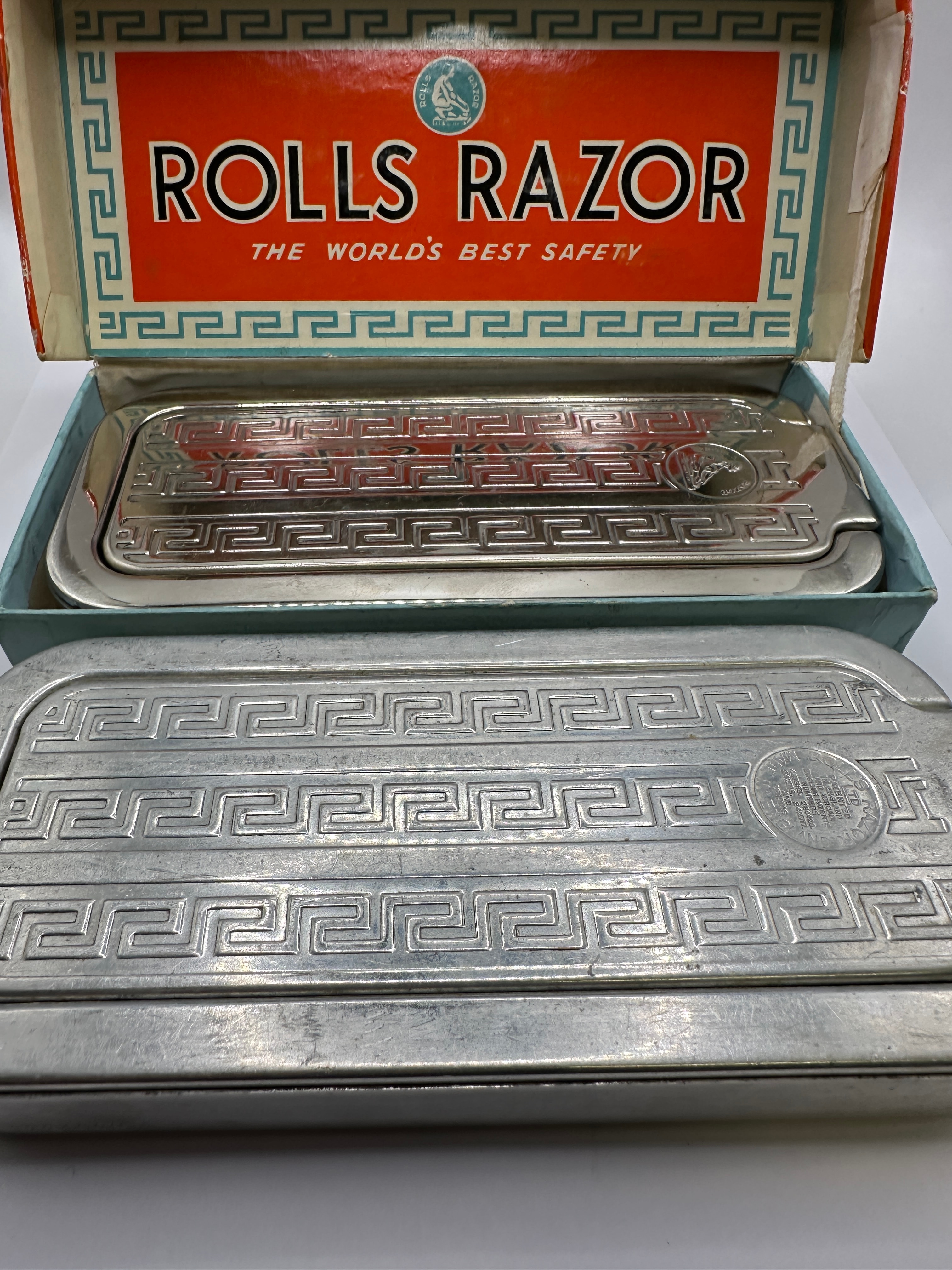 This lot comprises 2 items: a vintage Rolls Razor Imperial No 2 shaving set and its original cardboard box. The shaving set, made in England circa 1950s, features a rectangular metal case with internal razor components, including a handle with a knurled grip. The case and components are crafted from metal, likely chrome-plated steel. Both the metal case lid and the outer cardboard packaging display a prominent Greek key pattern. The cardboard box is marked “ROLLS RAZOR” with the tagline “THE WORLD’S BEST SAFETY” and a stylized horse logo. The metal case lid bears a circular emblem reading “ROLLS RAZOR LTD,” “MADE IN ENGLAND,” and details regarding “PATENTED IN ENGLAND AND ABROAD ENGLISH PATENTS NUMBERS 15,363, 281,428, 292,718, 292,777, AND PENDING.”