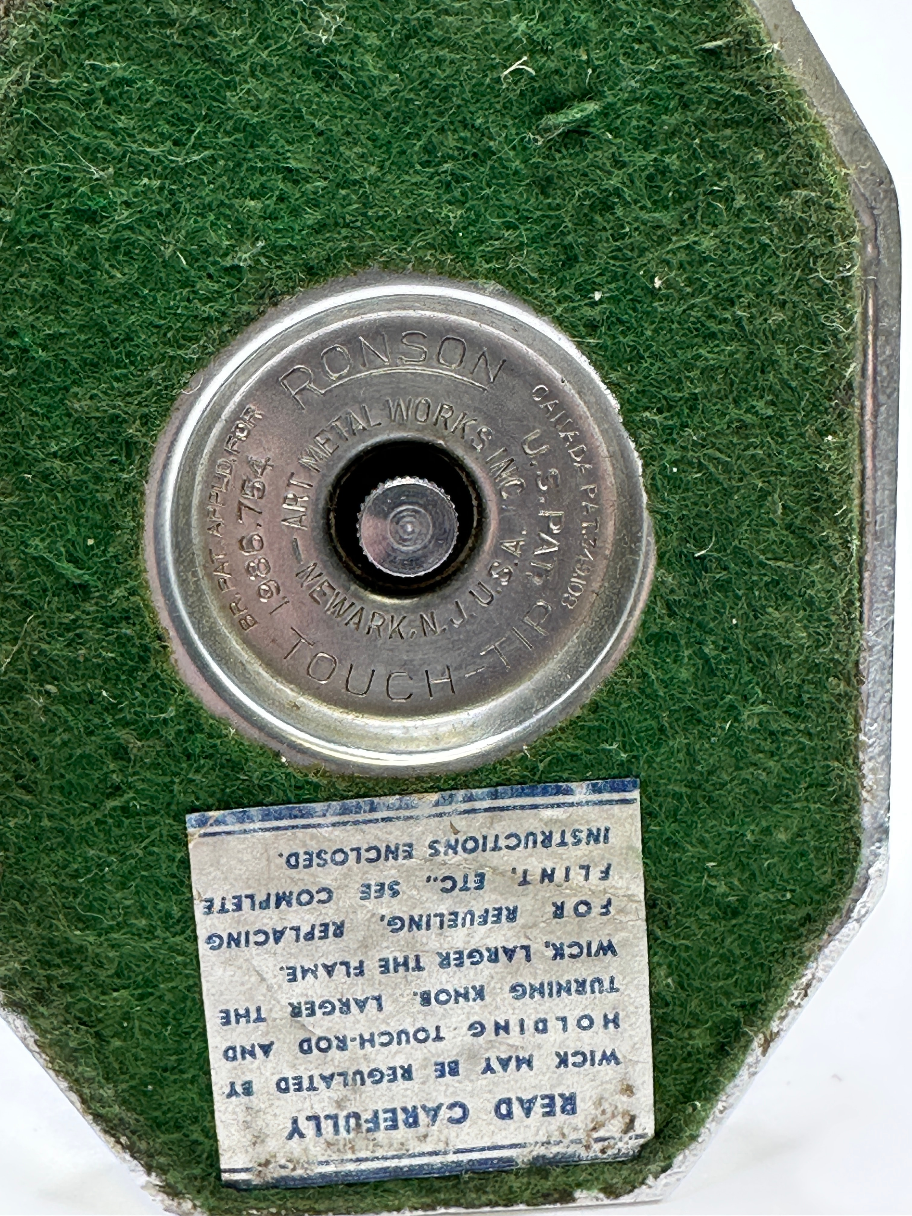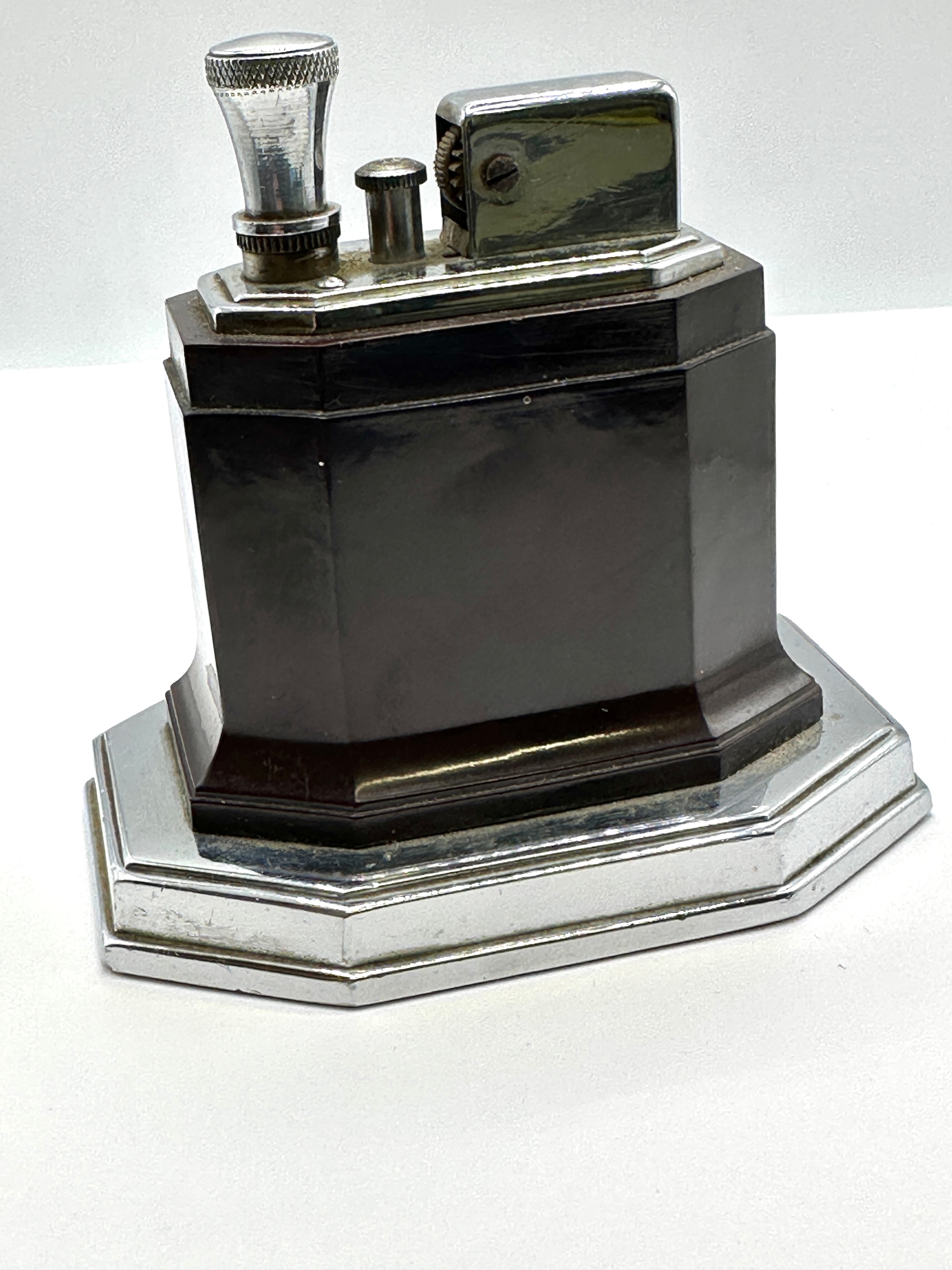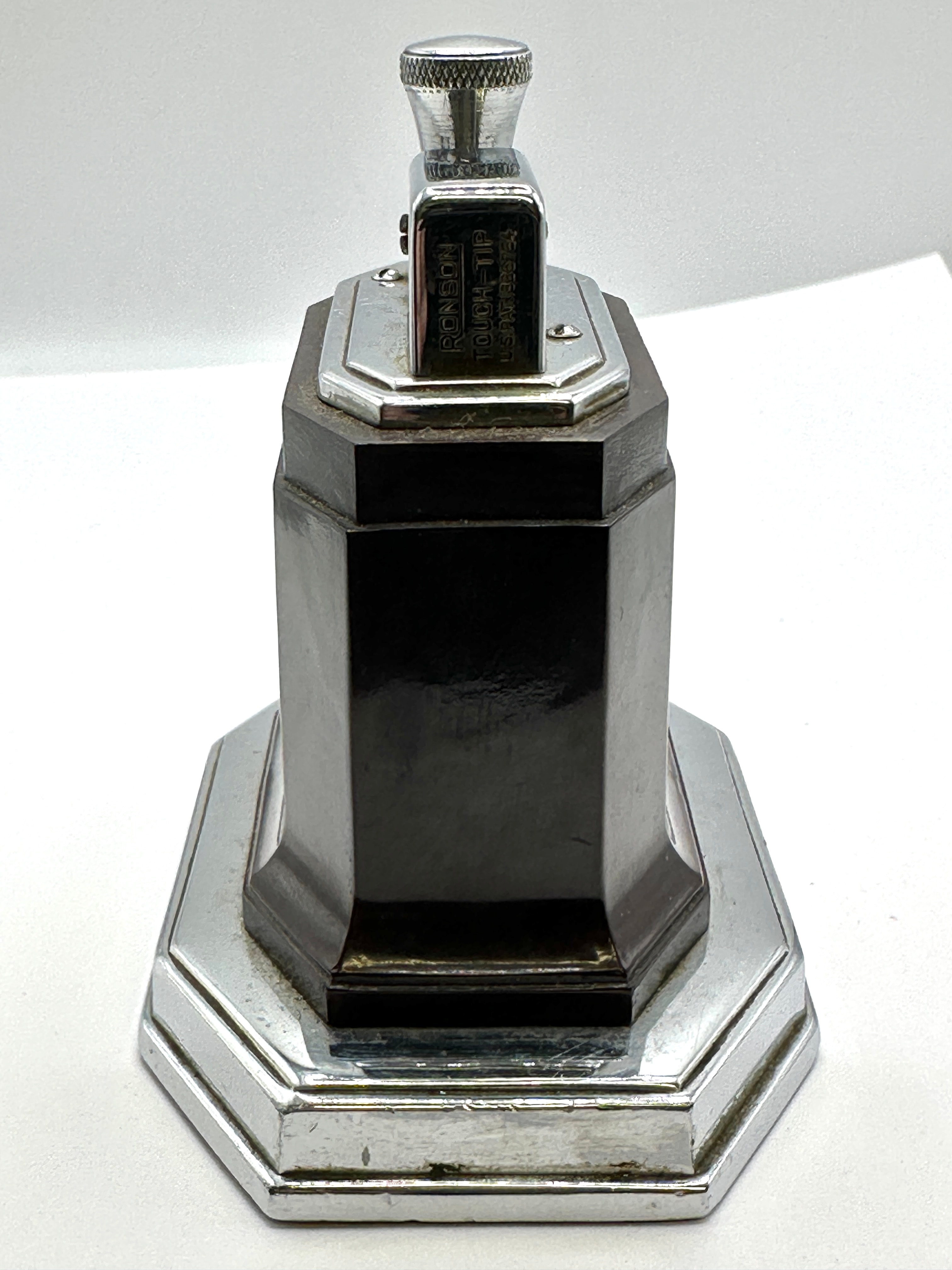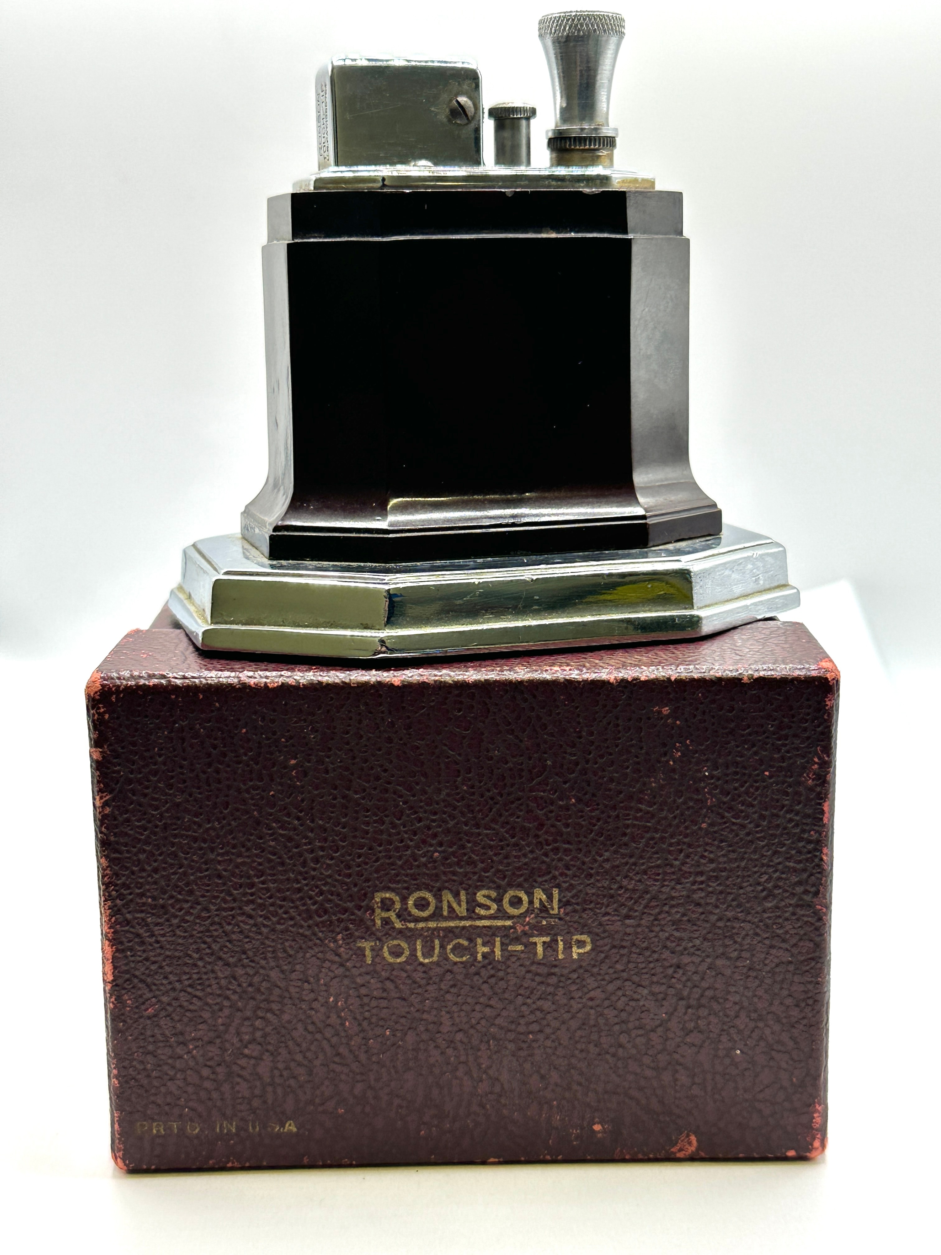 A Ronson Art Deco Touch-Tip Octette Table Lighter, featuring a chrome-plated octagonal stepped base and top, with a dark brown octagonal body, likely Bakelite or resin. The underside is marked “RONSON”, “TOUCH-TIP”, “ART METAL WORKS INC.”, “NEWARK, N. J. U.S.A.”, “PAT’D. APPL’D FOR”, and patent numbers “PAT. 1,866,784” (US) and “CANADA PAT. 320,808”. The lighter rests on a green felted base with a partially legible, creased paper instruction label. Accompanied by its associated red faux-leather box, marked “RONSON TOUCH-TIP MADE IN U.S.A.”.