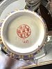 **Chinese Famille Rose Porcelain Ginger Jar:** A lidded, globular porcelain ginger jar, identified as Famille Rose, featuring vibrant polychrome enamel decoration. The body is adorned with white cartouches depicting a bird, a red flower, and foliage, set against an intricate turquoise ground with scrollwork and yellow and pink floral patterns. The lid prominently displays a “double happiness” (囍) character. The base bears a circular red mark with six characters, likely a seal or reign mark.