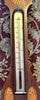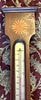 **Antique-Style Aneroid Barometer and Thermometer:** A wall-mounted aneroid barometer and mercury thermometer combination housed within a shaped wooden case, possibly mahogany. The case is detailed with carved or inlaid sunburst motifs at the top and bottom, and two sailing ships flanking the thermometer. The brass-bezelled barometer dial indicates conditions from “STORMY” to “VERY DRY” and is marked “Aneroid Barometer.” The thermometer displays a Fahrenheit scale.