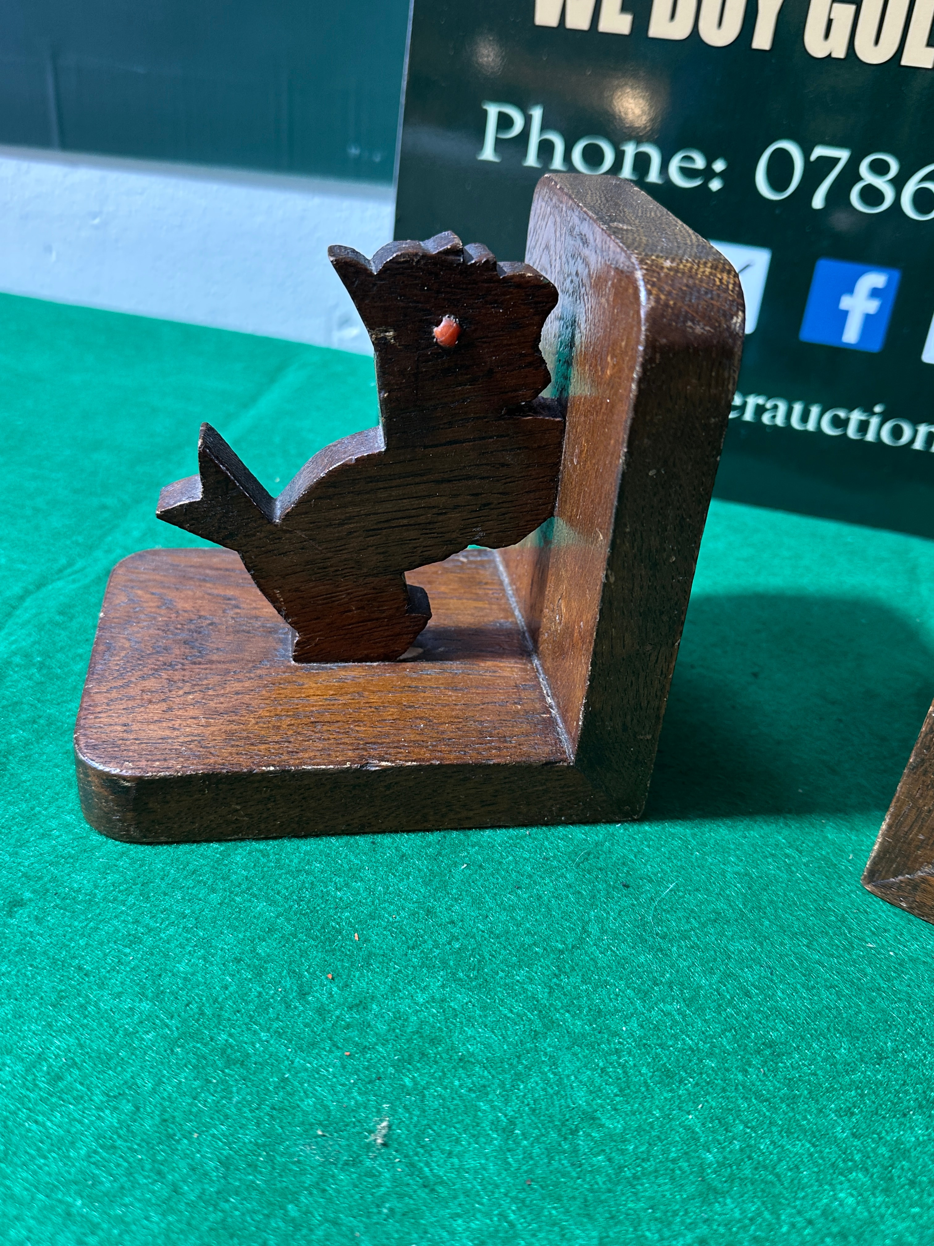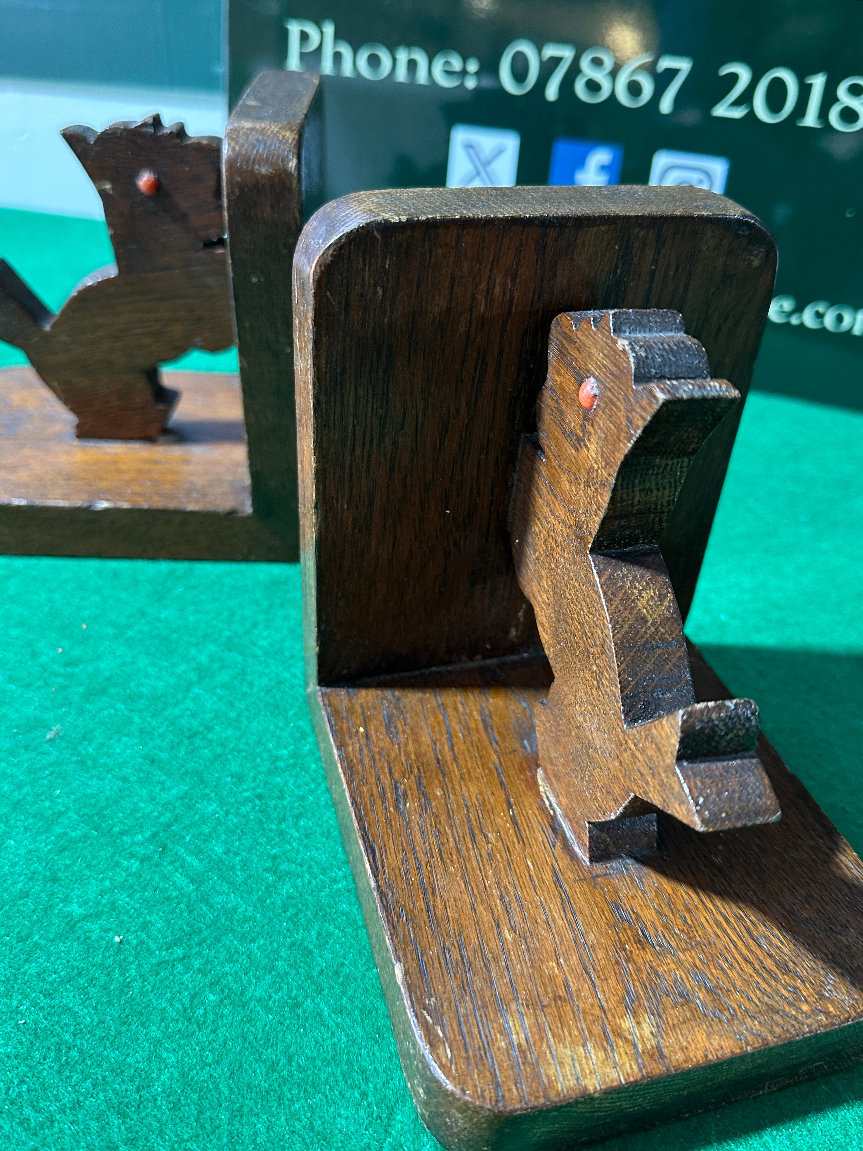 A pair of vintage wooden bookends, each comprising a dark-stained or naturally dark hardwood base with a vertical support, featuring a stylized, cutout figure of a bird or mythical creature. Each figure is adorned with a small, reddish bead or insert for an eye, and exhibits a simple, geometric design suggestive of a folk-art or mid-20th-century aesthetic.