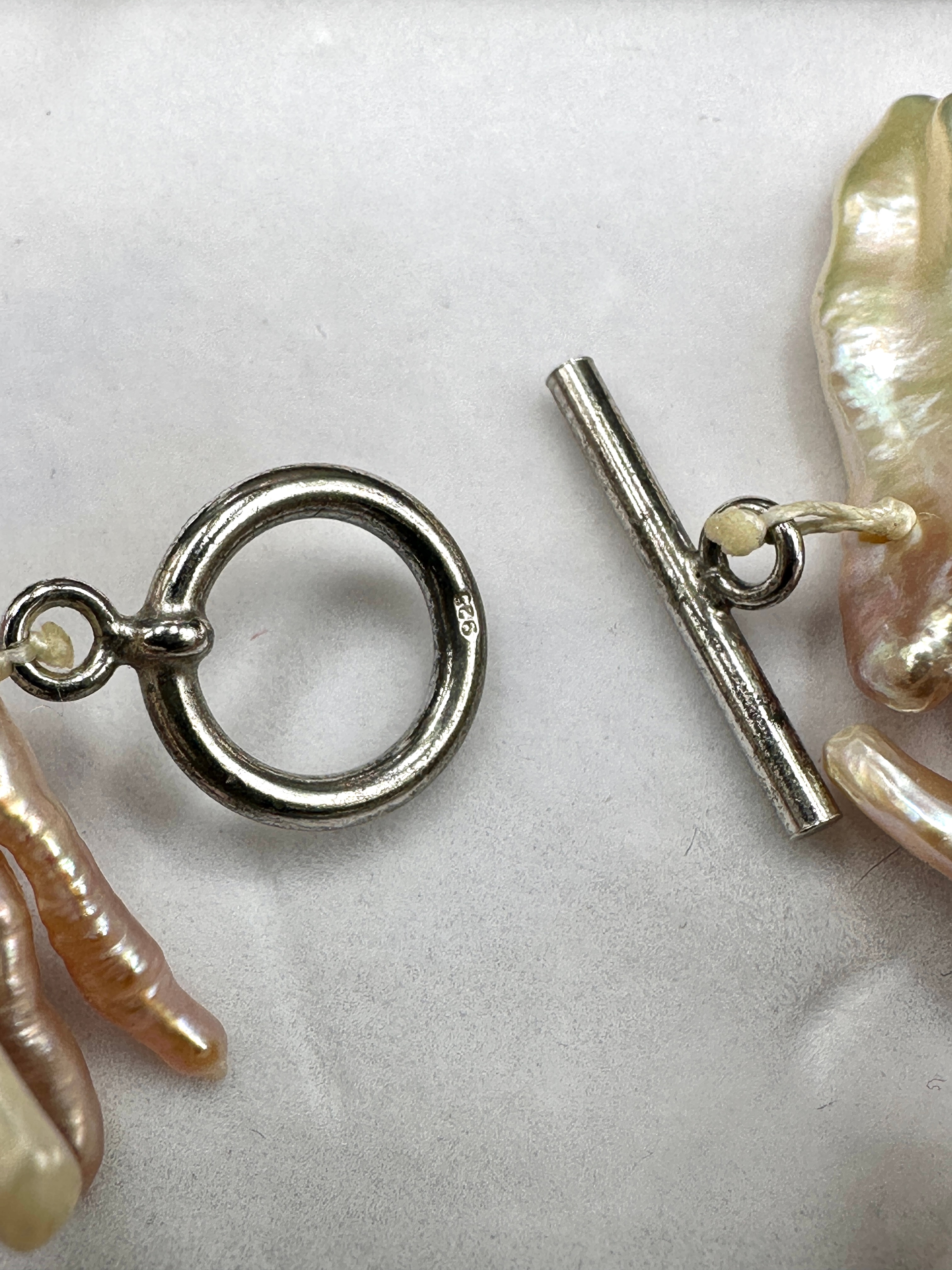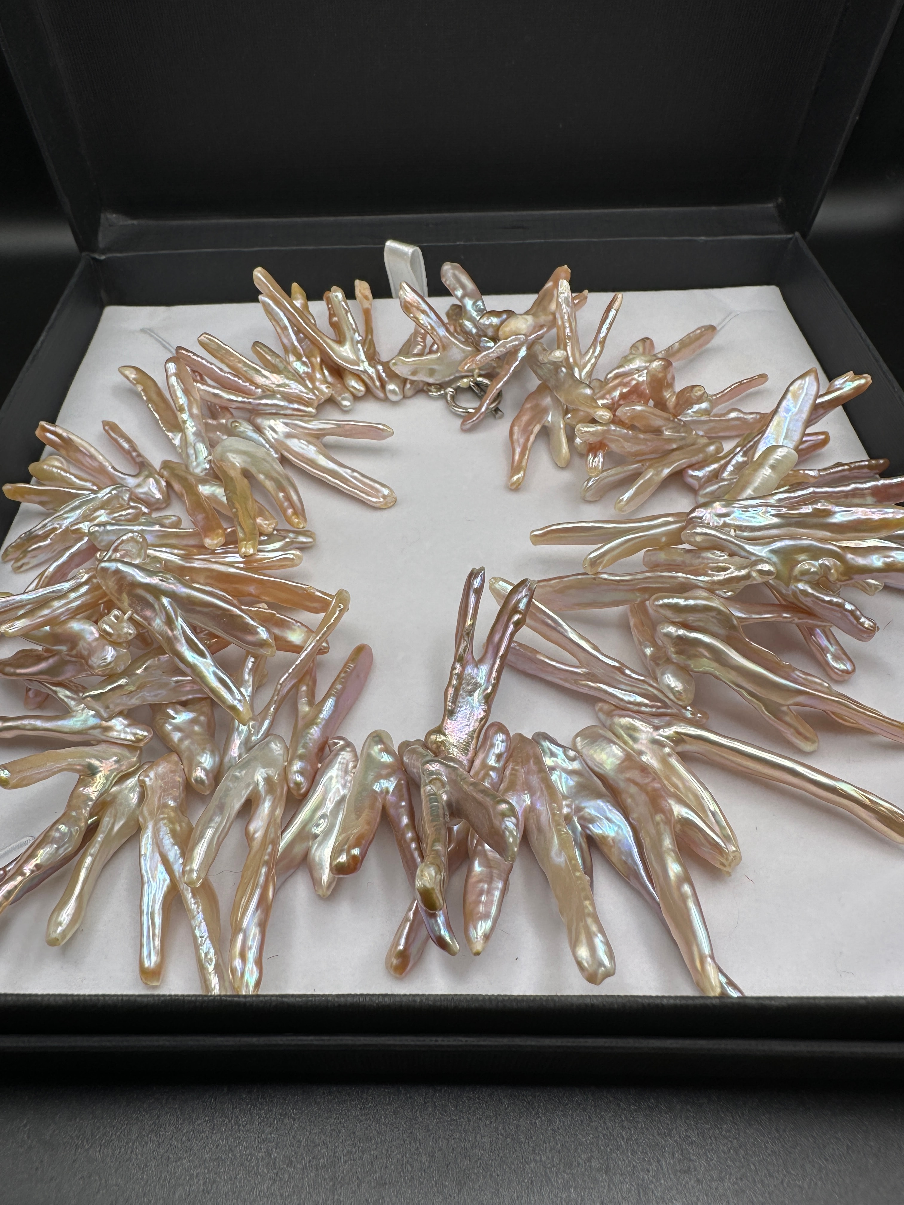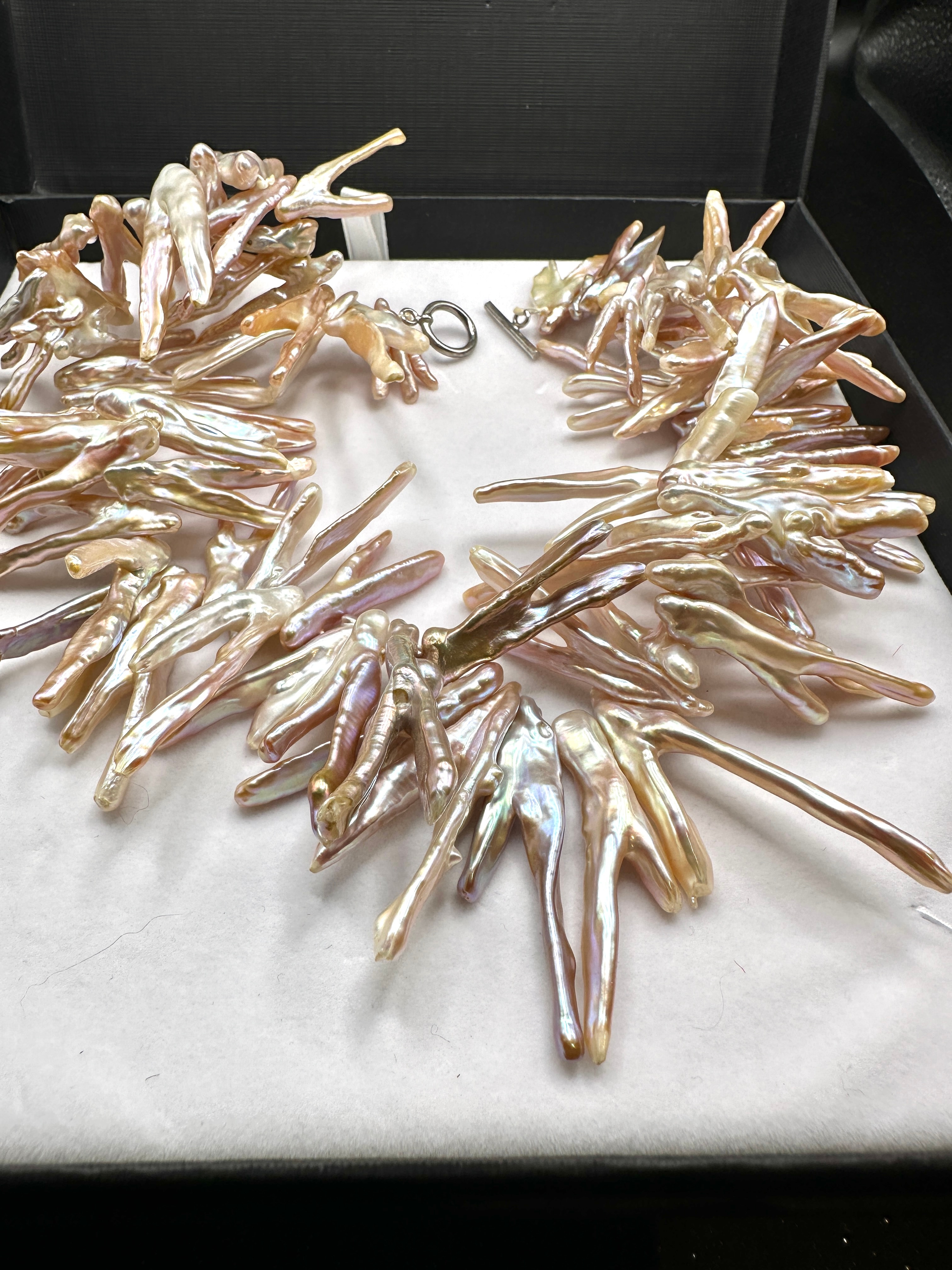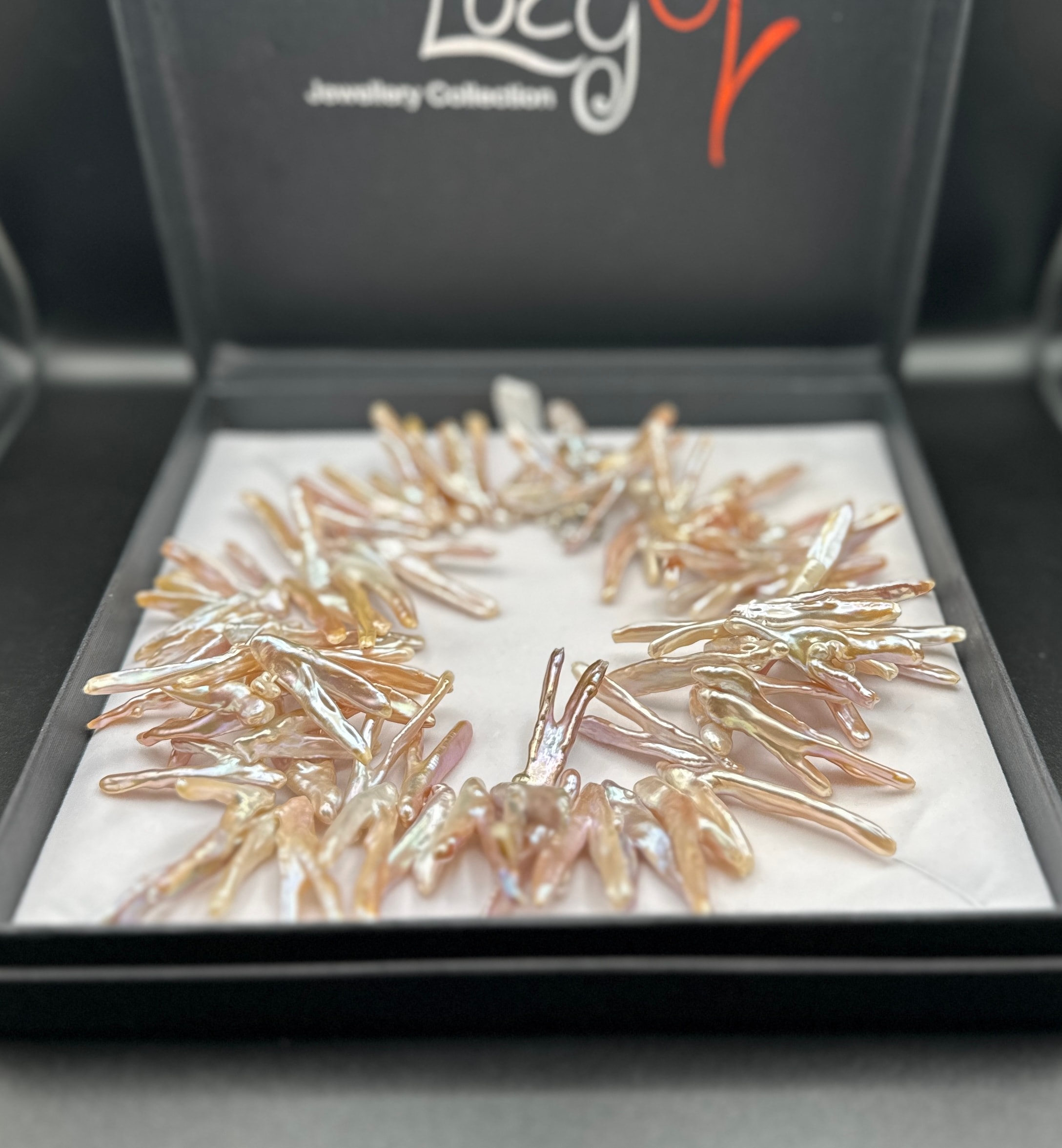 A contemporary necklace by LucyQ Jewellery Collection, crafted from numerous elongated, irregularly shaped freshwater pearls, often referred to as ‘stick’ or flame pearls. The pearls display a lustrous iridescence with dominant hues of pink, cream, and lavender. The necklace features a sterling silver toggle clasp, clearly marked ‘925’. It is presented in its original black jewelry box with a white interior, bearing the text ‘LucyQ Jewellery Collection’ on the lid.