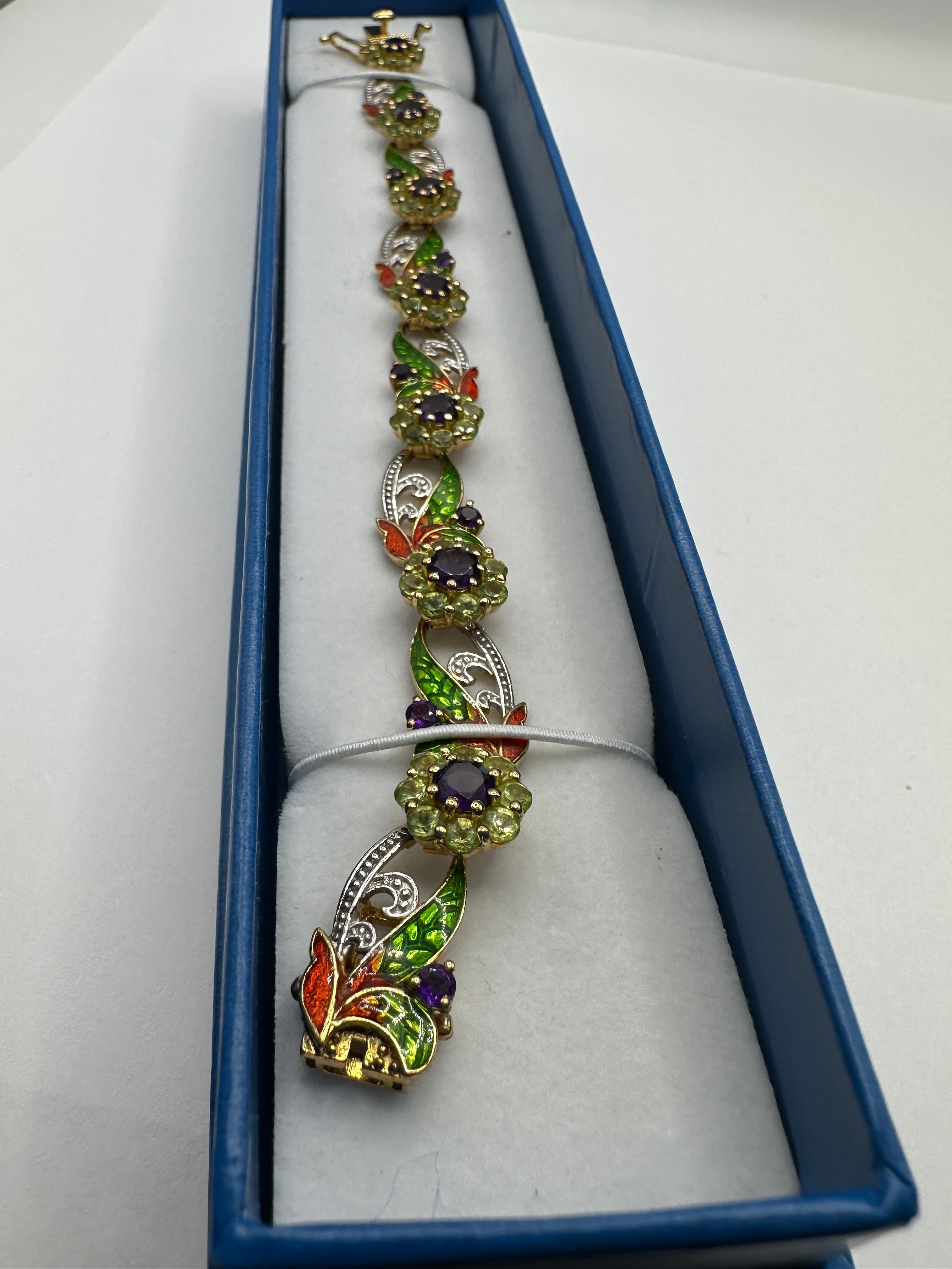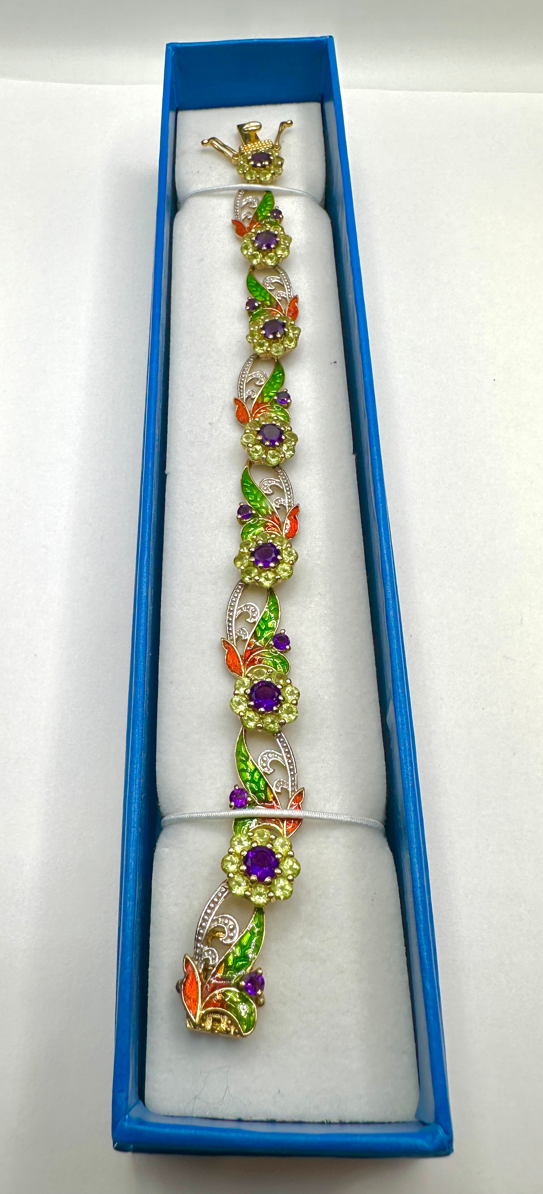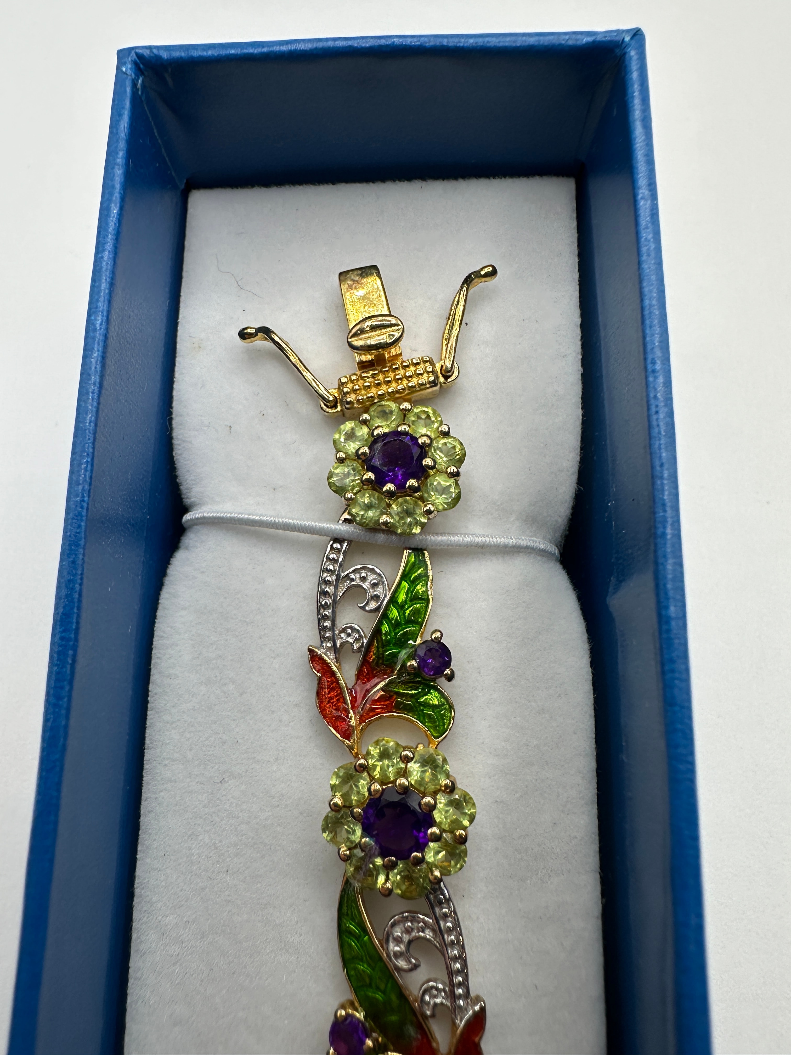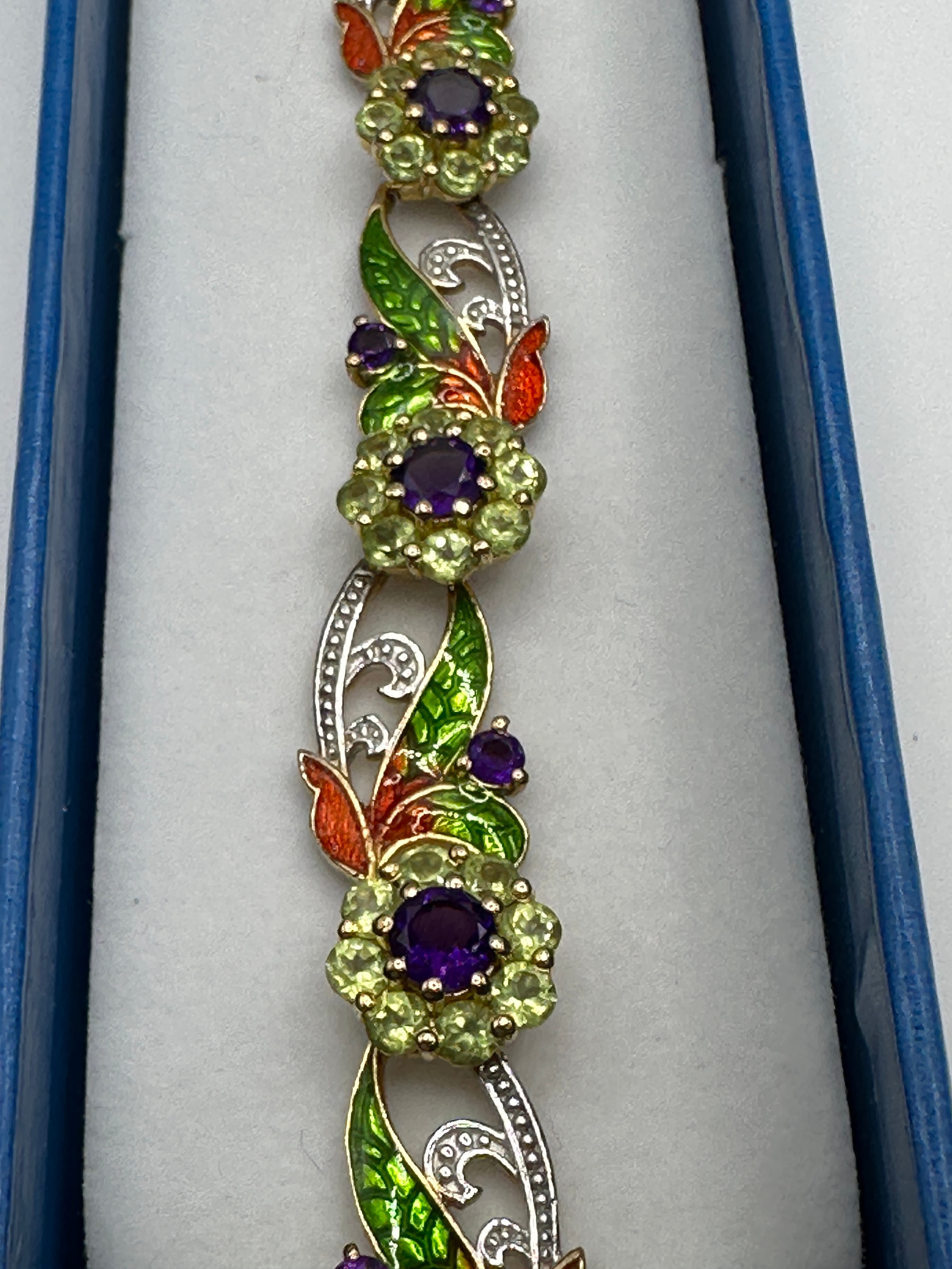 A multi-link bracelet featuring repeating ornamental links. The design incorporates circular floral-inspired elements, each centered with a round faceted purple stone encircled by smaller round faceted green stones. These are interspersed with elongated, stylized openwork links depicting scrollwork and leaves. The leaf-like elements are crafted from silver-toned metal with fine textured details and vibrant enamel in shades of green and orange/red, accented by small purple stones. The bracelet combines yellow and silver-toned metals and is secured by a gold-toned box clasp with safety arms. It is presented in a blue rectangular jewelry box with a white foam insert.