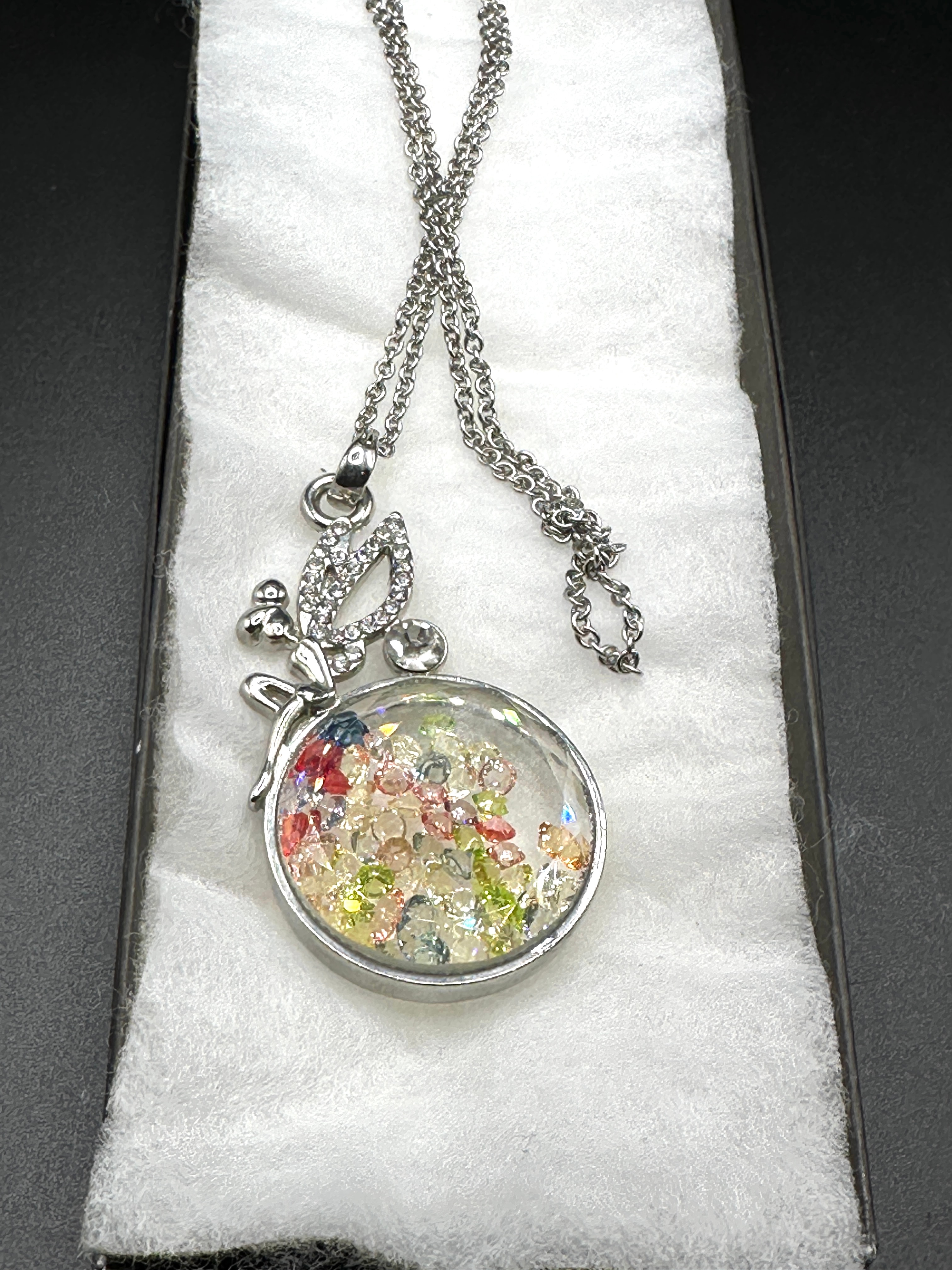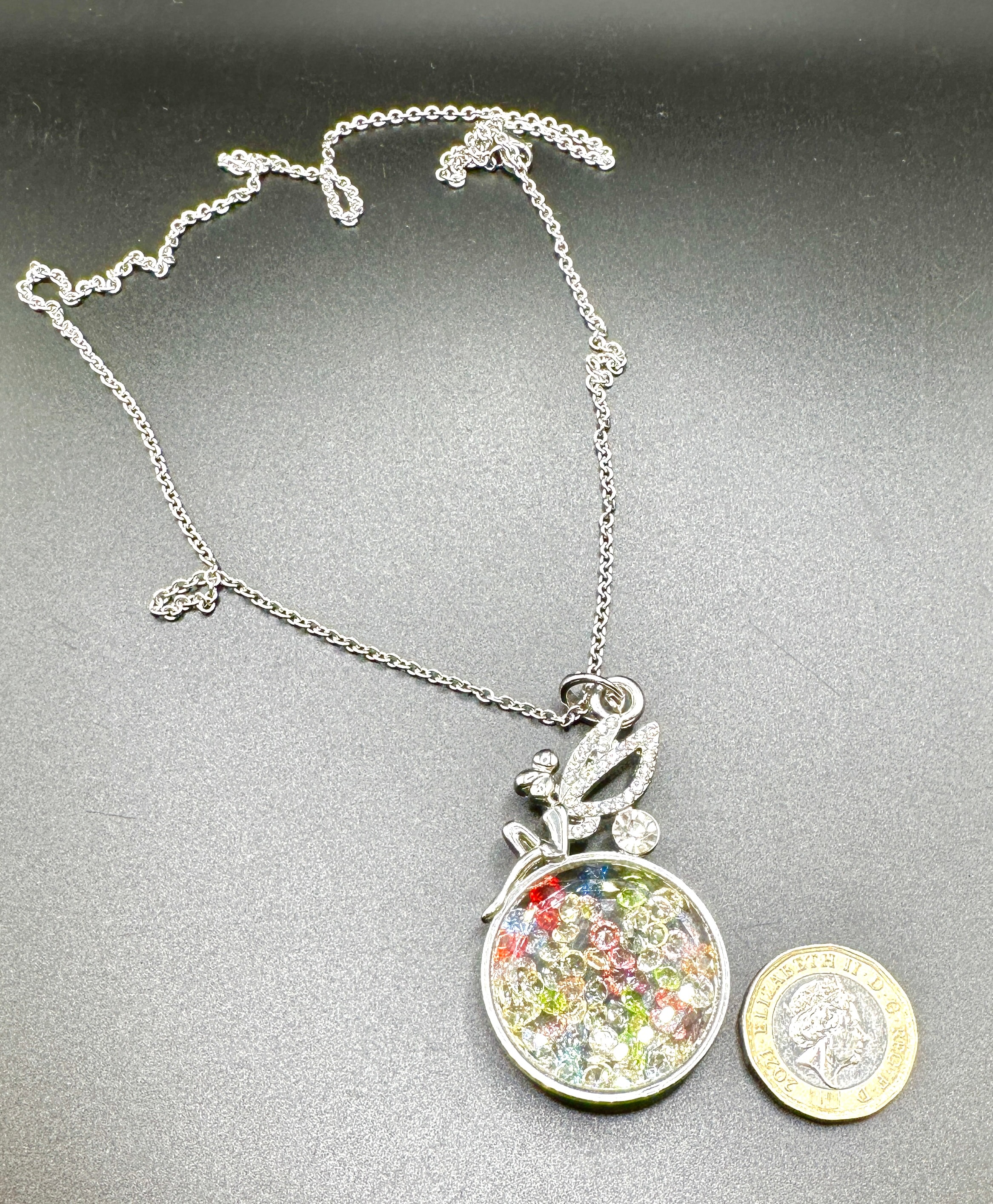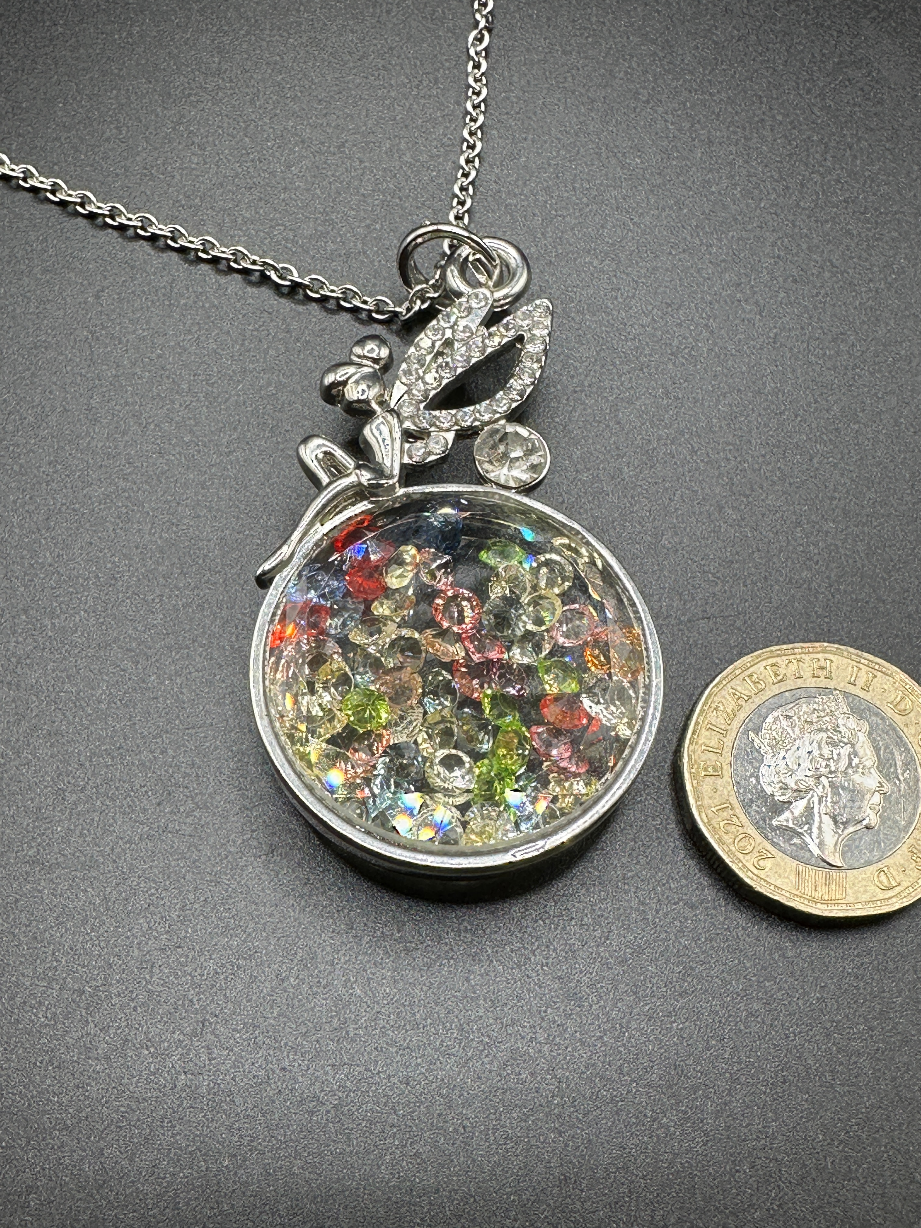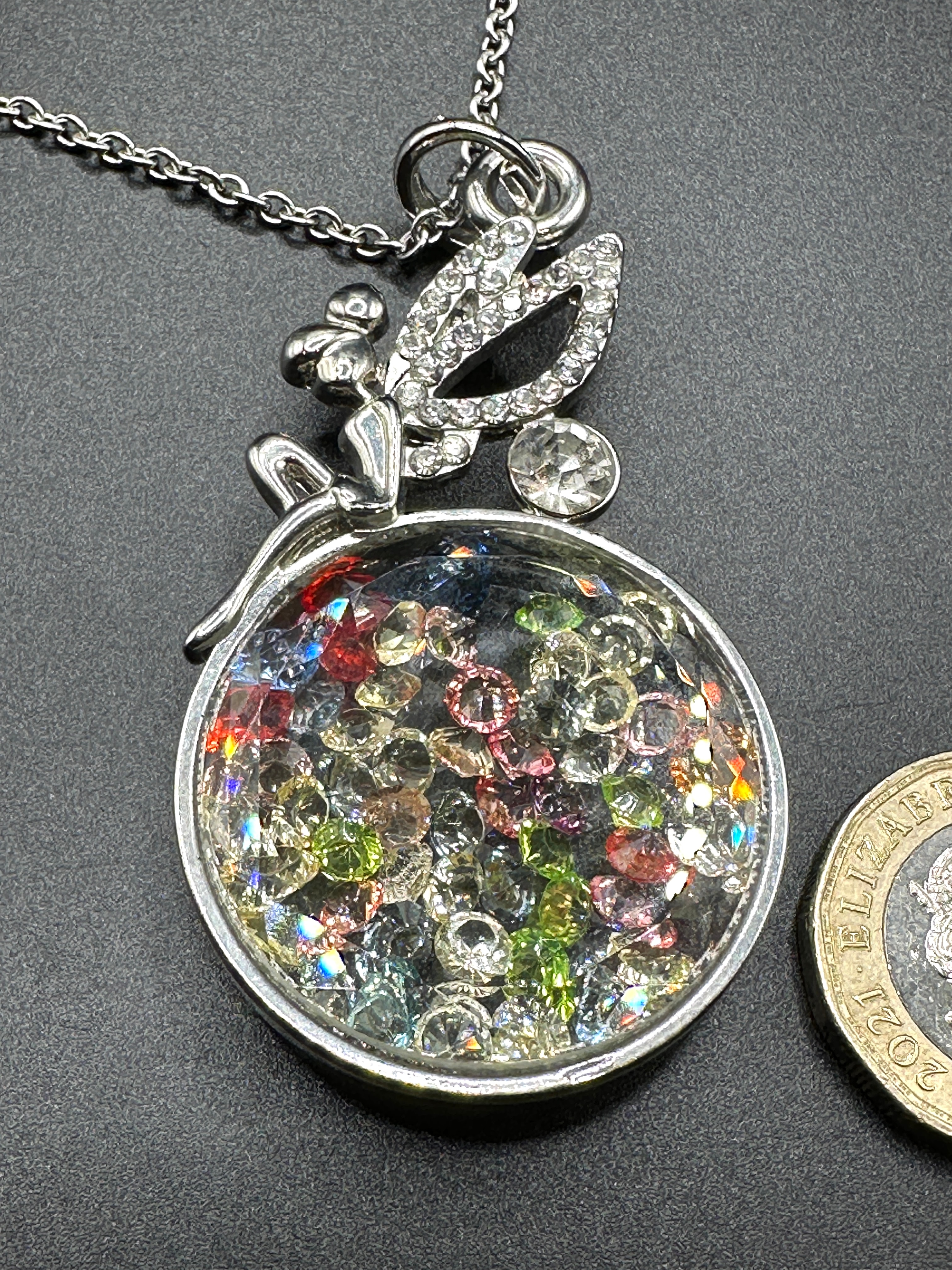 A contemporary silver-tone metal necklace featuring a pendant designed in a shaker locket style. The pendant comprises a stylized figural element, resembling a fairy or angel with outstretched wings, adorned with clear faceted stones. This element is perched atop a circular locket which contains numerous small, loose, multi-colored faceted stones, likely crystals or simulated gemstones, encased behind a clear panel. The necklace is suspended from a fine link chain. The item is of contemporary origin, as indicated by the presence of a 2021 British £1 coin for scale.