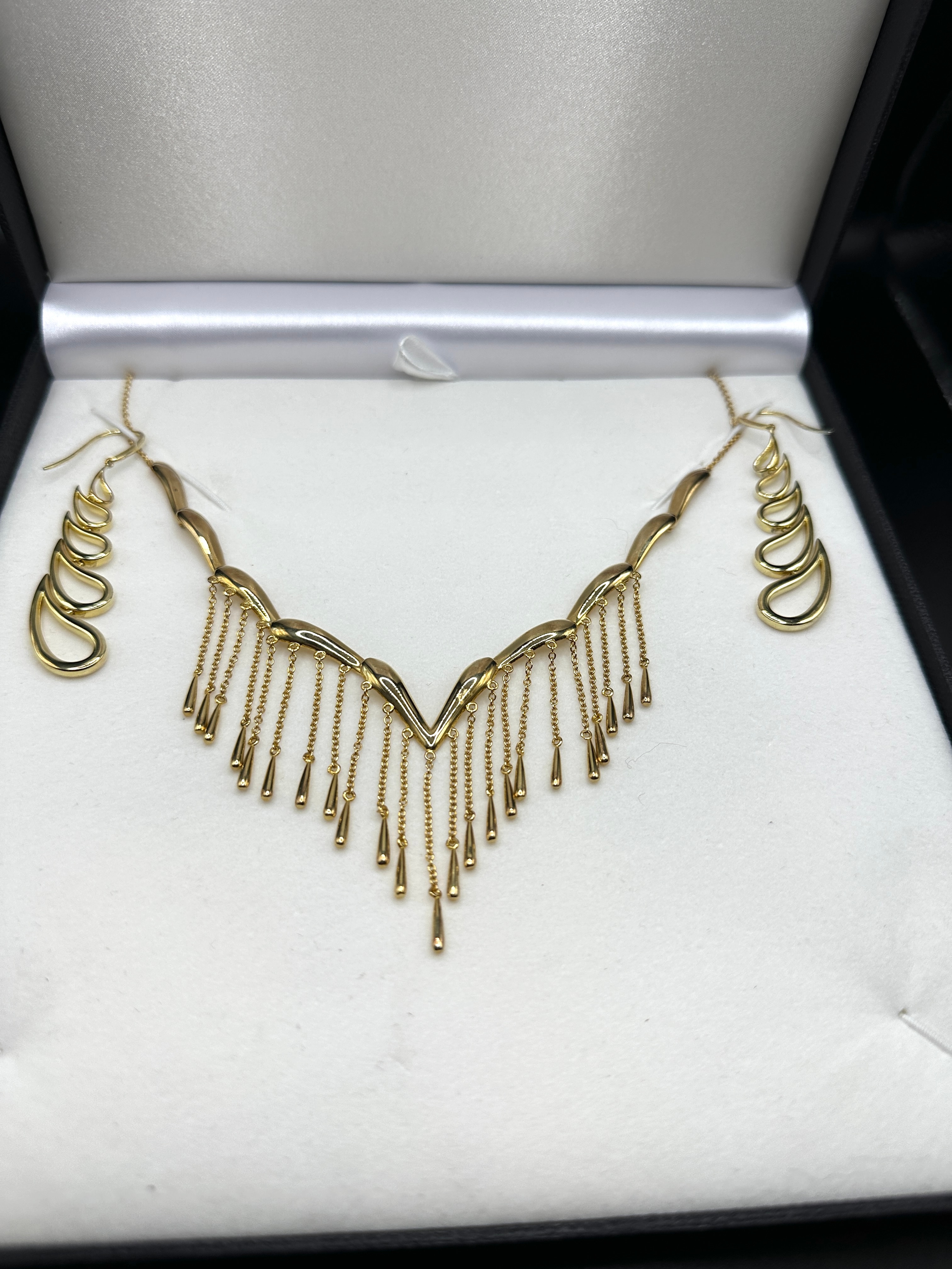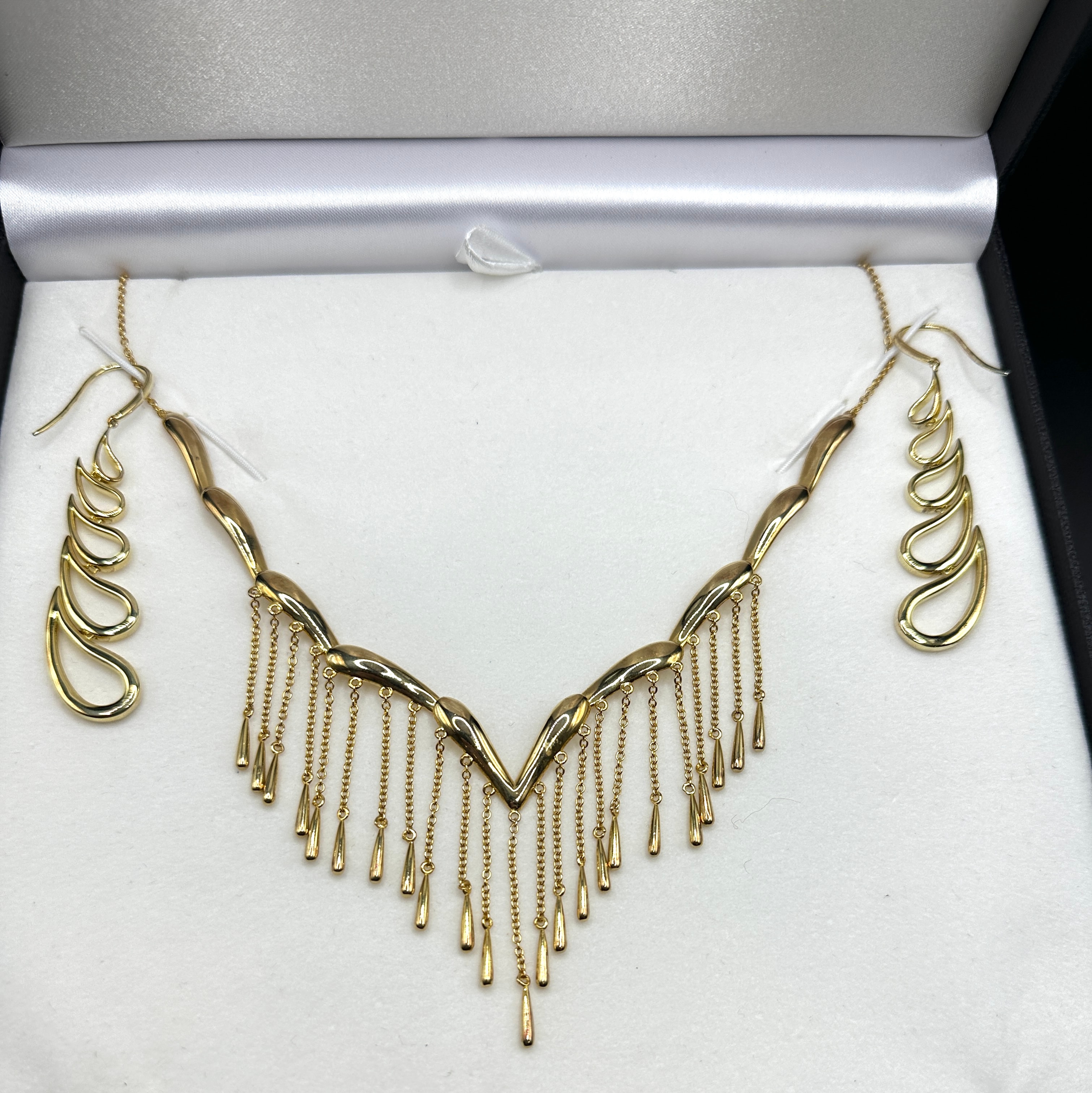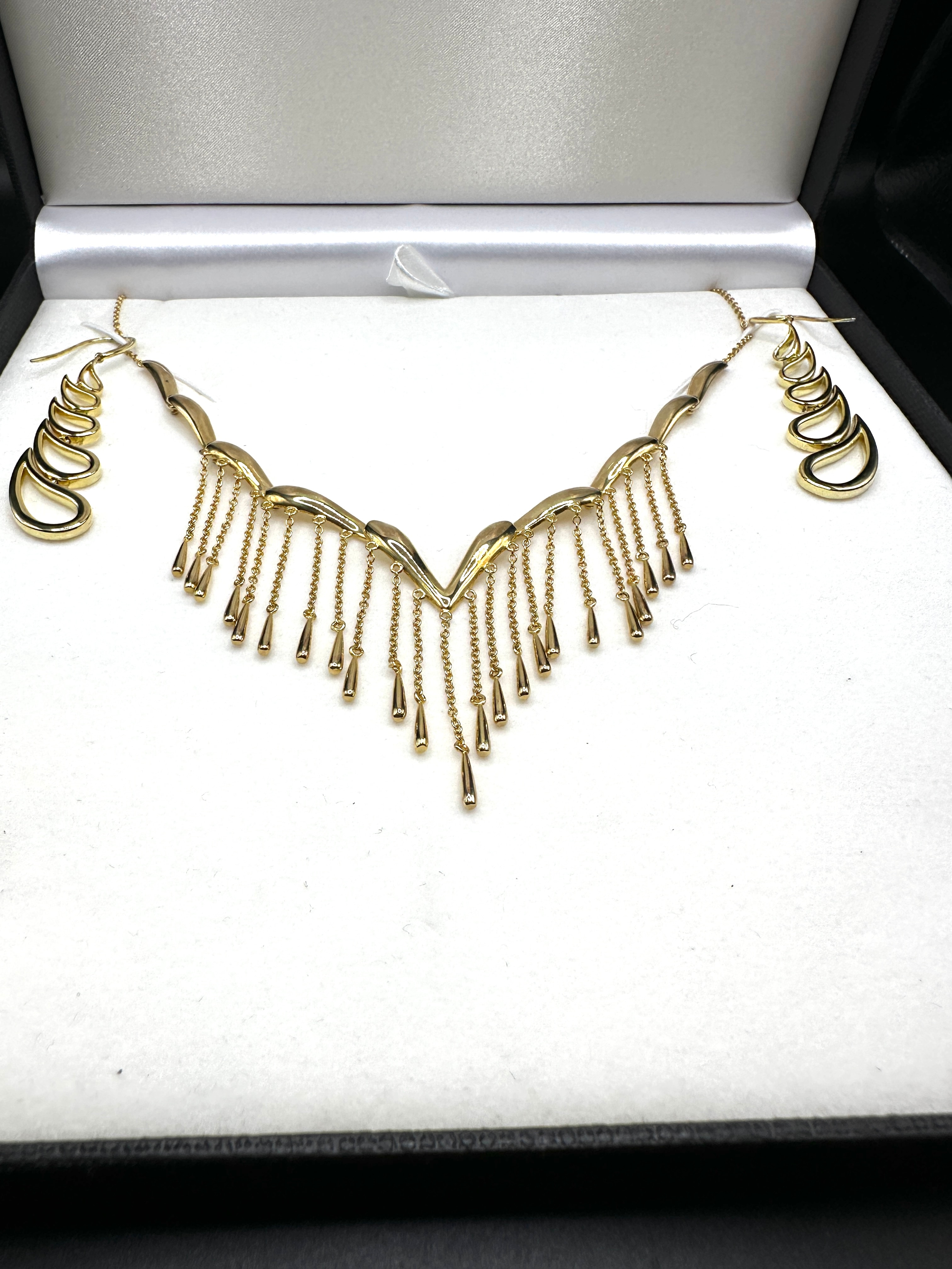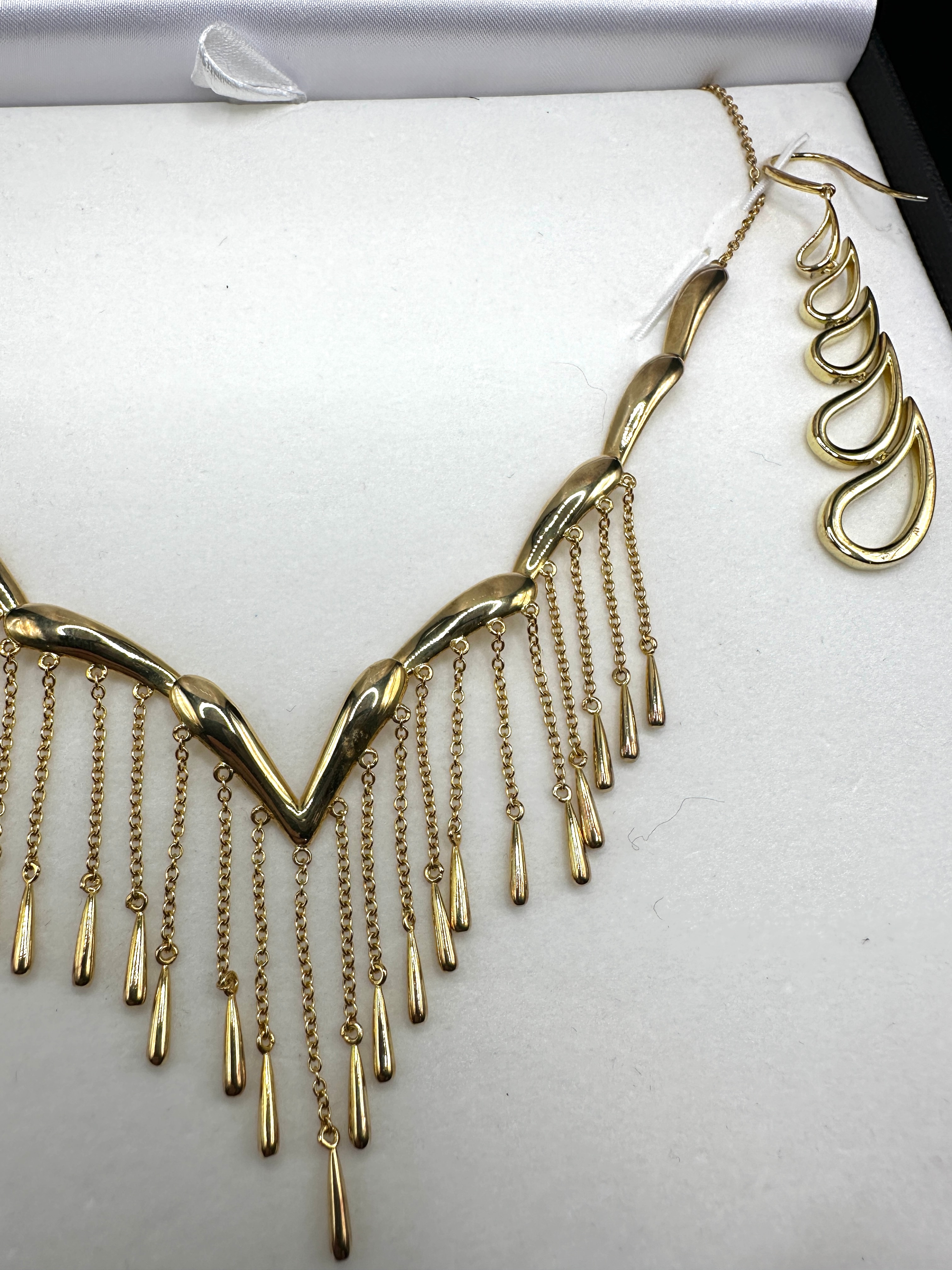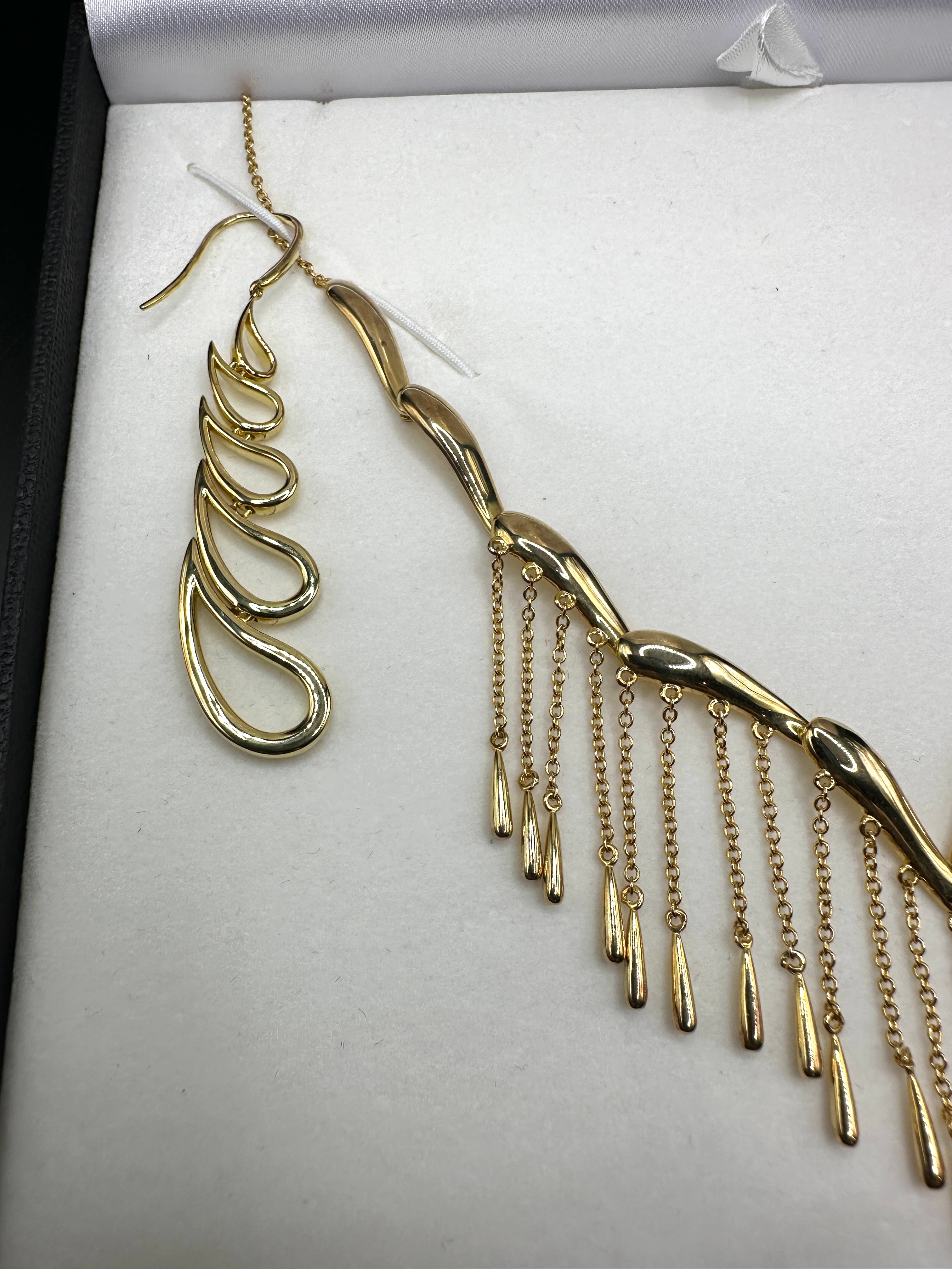 A Swarovski ‘Flame’ necklace and earring set, comprising a gold-toned jewelry set. The necklace features a prominent V-shaped bib design with numerous delicate chains suspending small teardrop-shaped pendants, creating a fringed effect. The matching earrings are hook-style, each displaying a curvilinear, sculptural ribbon or wave motif. The overall style is modern or contemporary. No specific text, hallmarks, or manufacturer’s markings are discernible on the items.