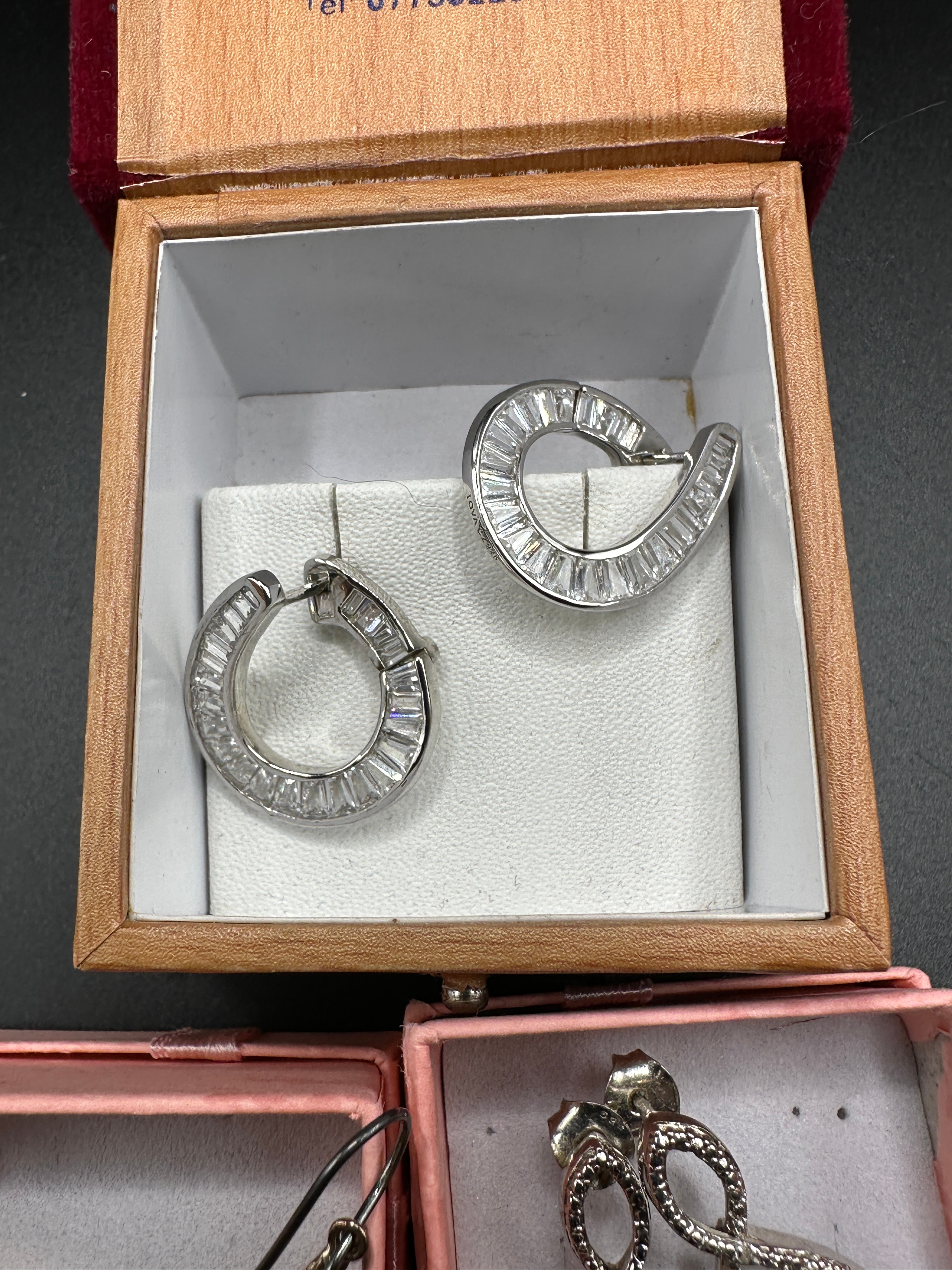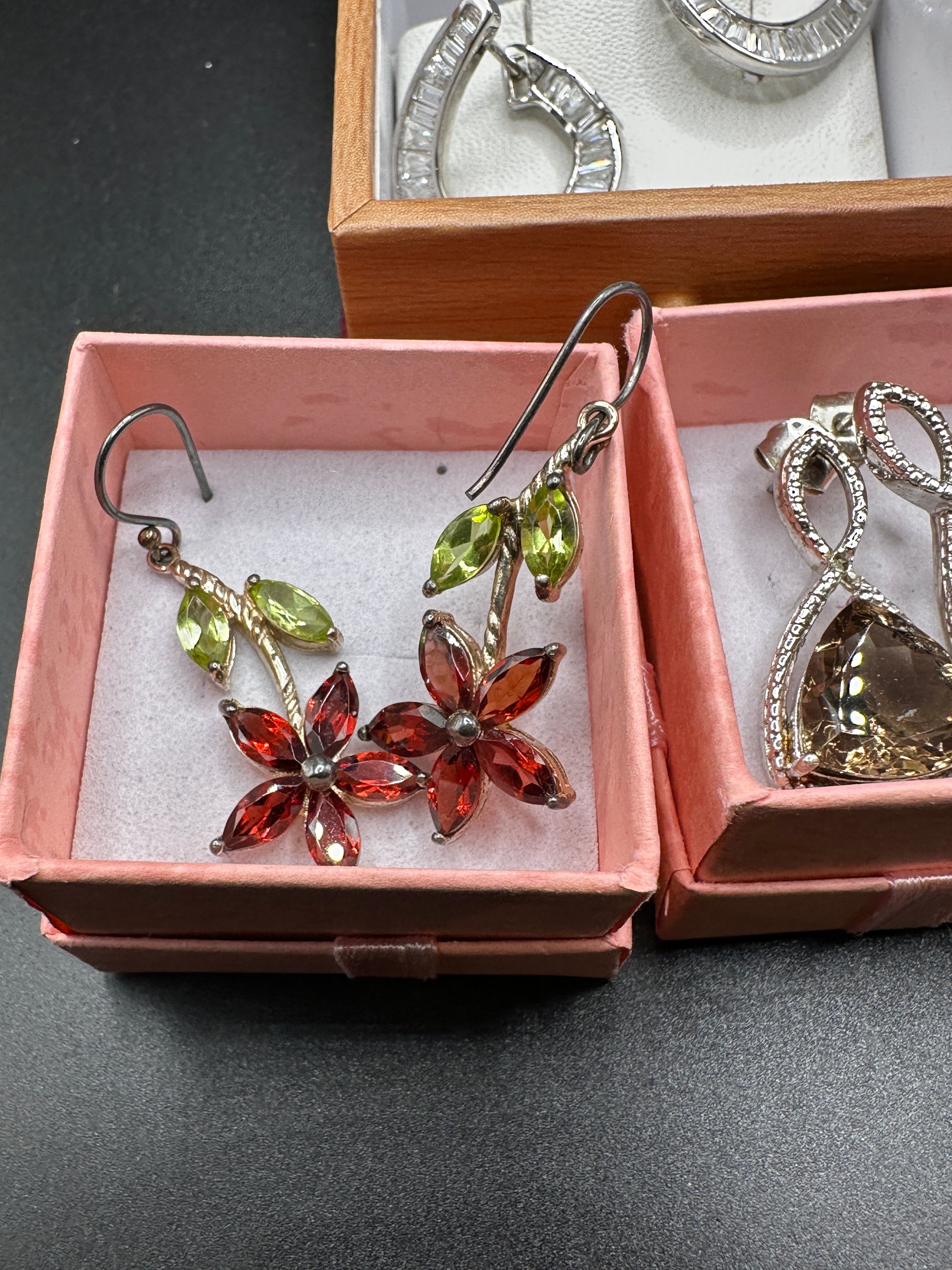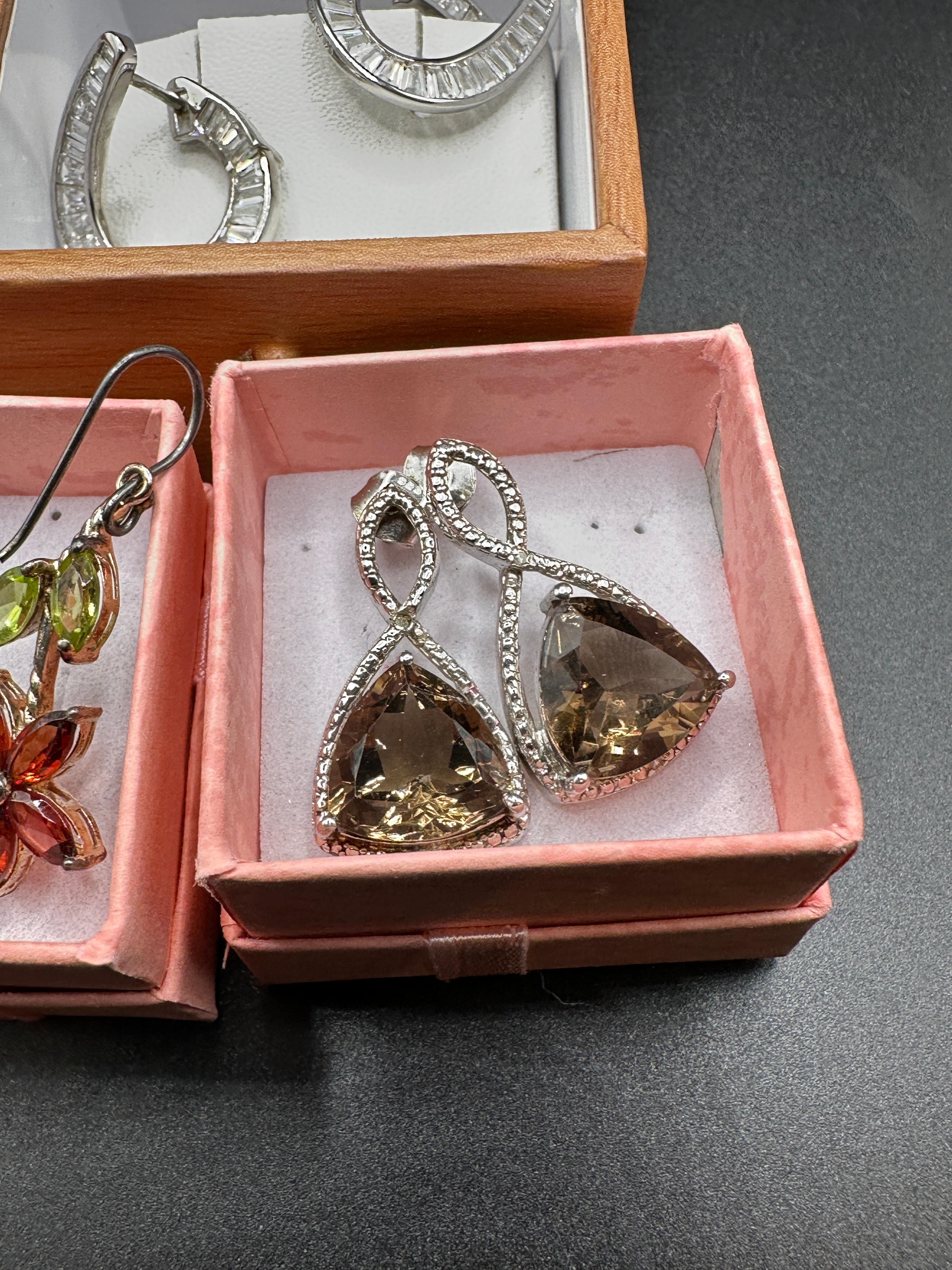 A group of three pairs of contemporary earrings. The first pair features C-hoop style earrings crafted from silver-toned metal, channel-set with numerous baguette-cut clear stones, presented in a hinged wooden box. The second pair consists of silver-toned metal dangle earrings designed as a botanical motif, with two faceted reddish-orange stones forming flowers and two faceted chartreuse-green stones as leaves, attached to hook-style ear wires. The third pair are silver-toned metal drop earrings, showcasing a twisted form encrusted with small clear accent stones, suspending a large, faceted triangular smoky-brown stone, secured with post and butterfly back fasteners. The two lower pairs are presented in pink cardboard boxes.