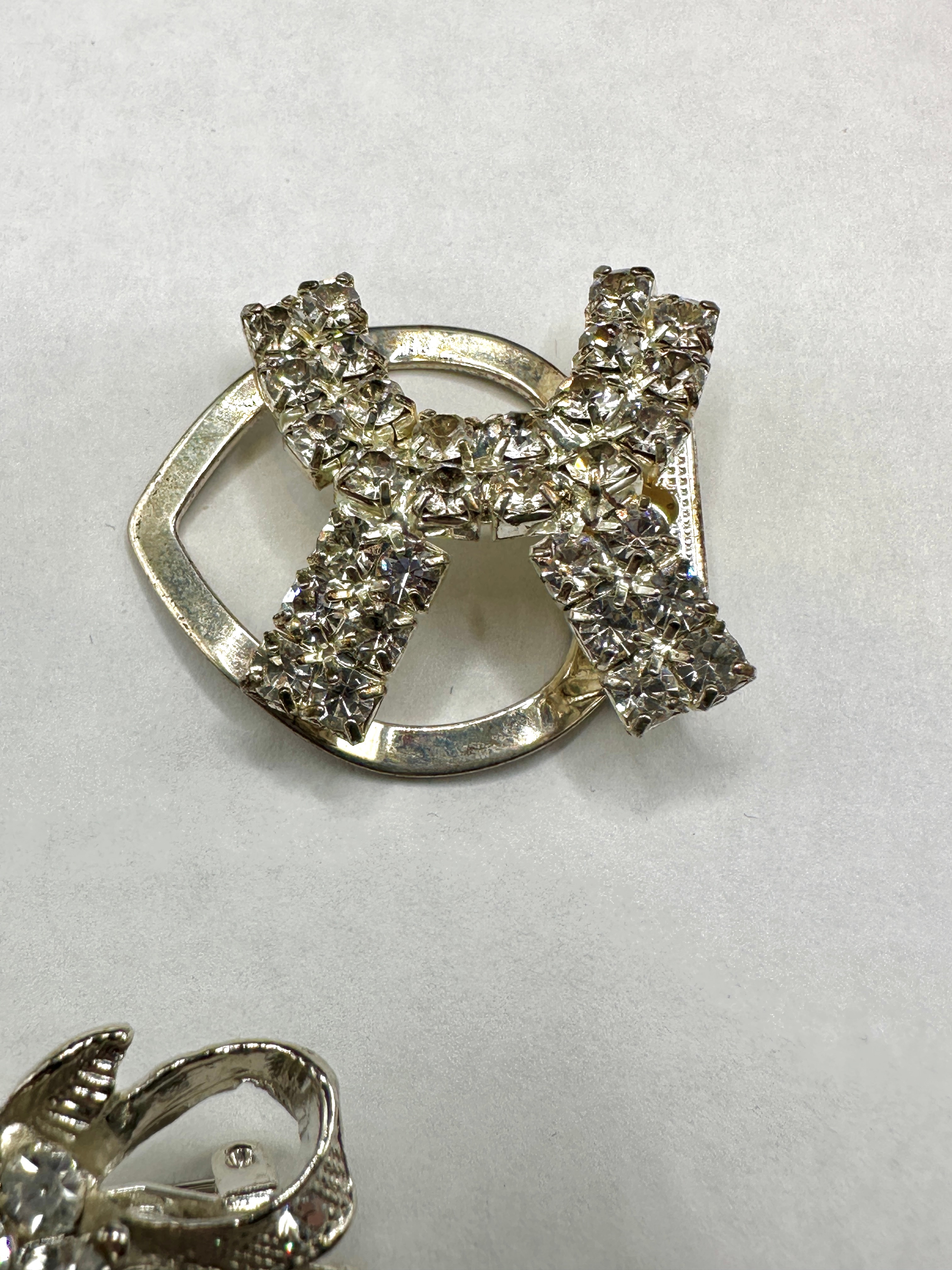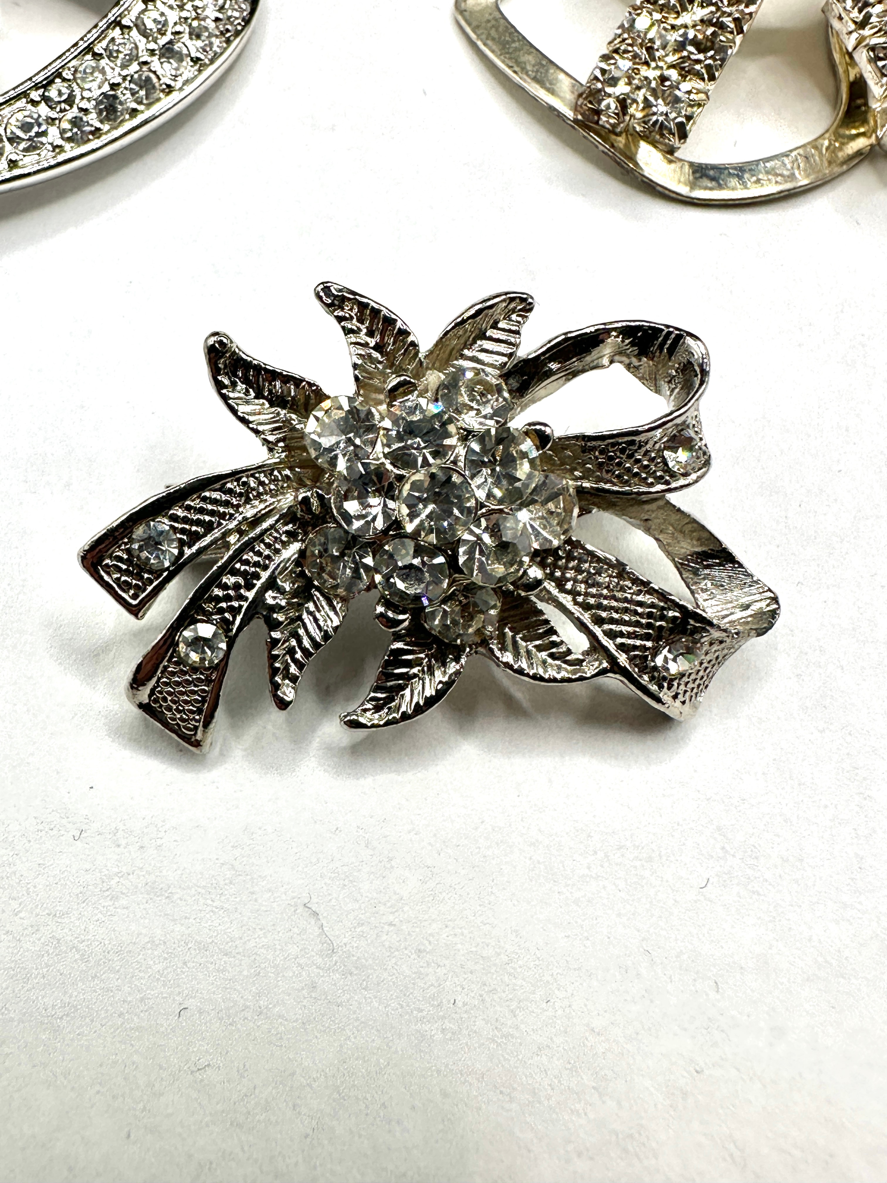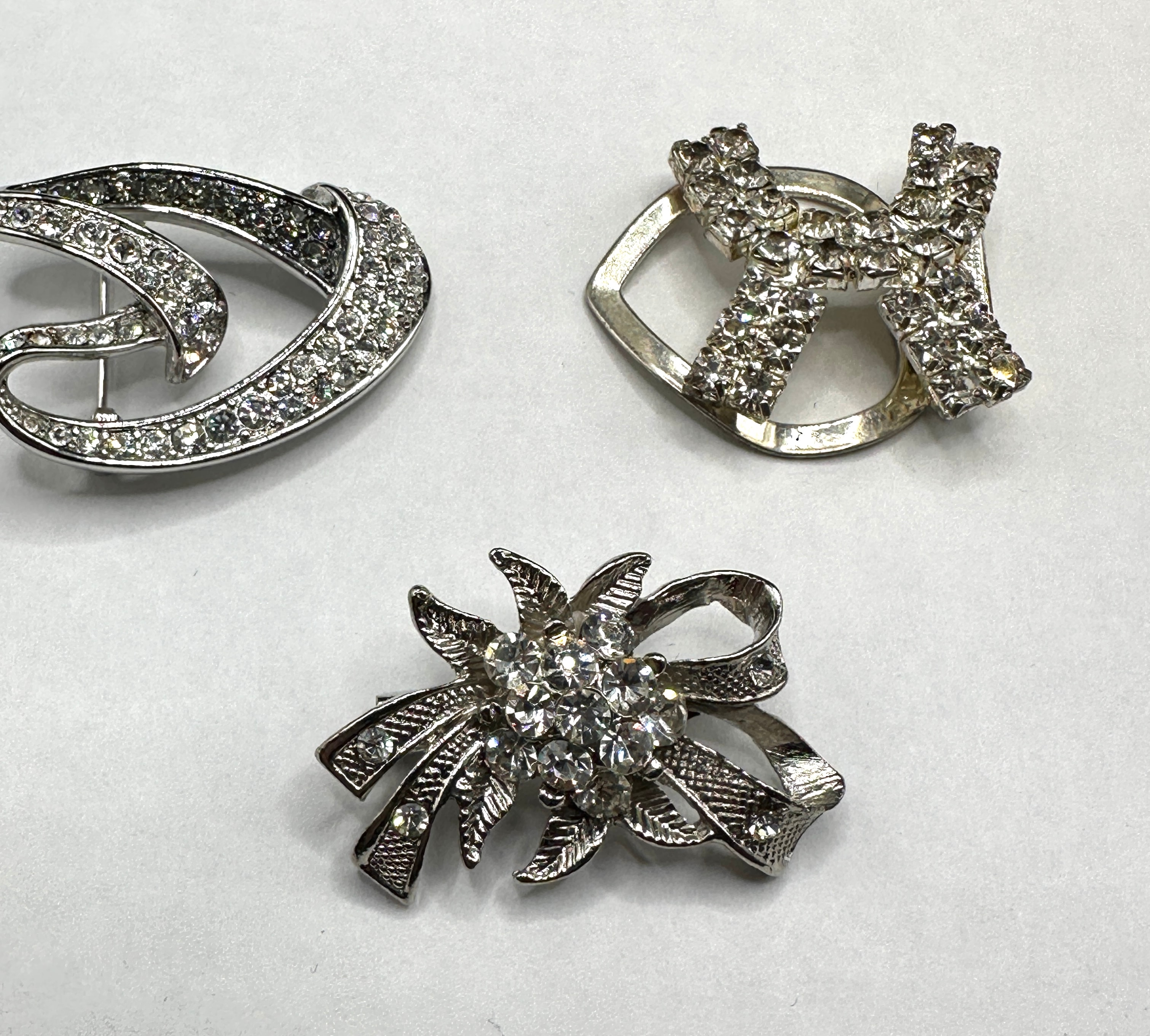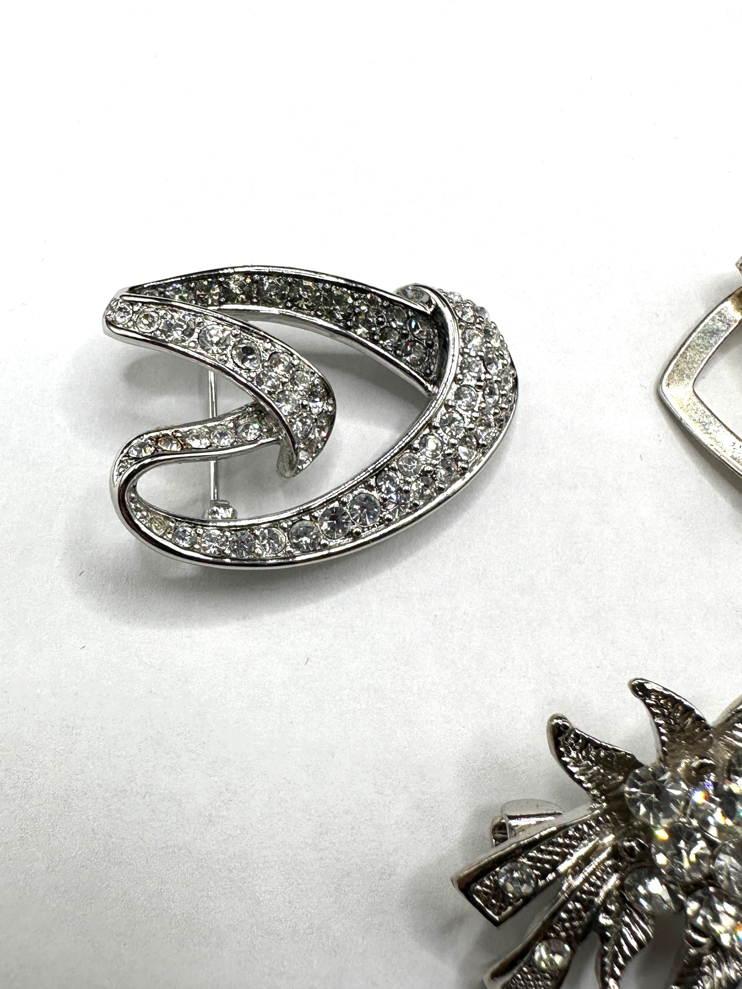 This lot comprises three silver-tone costume jewelry brooches, each adorned with clear, colorless rhinestones. The first brooch features an abstract, elongated swirling design entirely encrusted with stones. The second displays a stylized ‘X’ or cross motif, also stone-set, integrated within an open, heart-shaped or shield-like frame, which could also function as a scarf clip. The third piece presents a floral or starburst design with textured, ribbon-like elements, featuring a central cluster of rhinestones and additional stones adorning the radiating components.