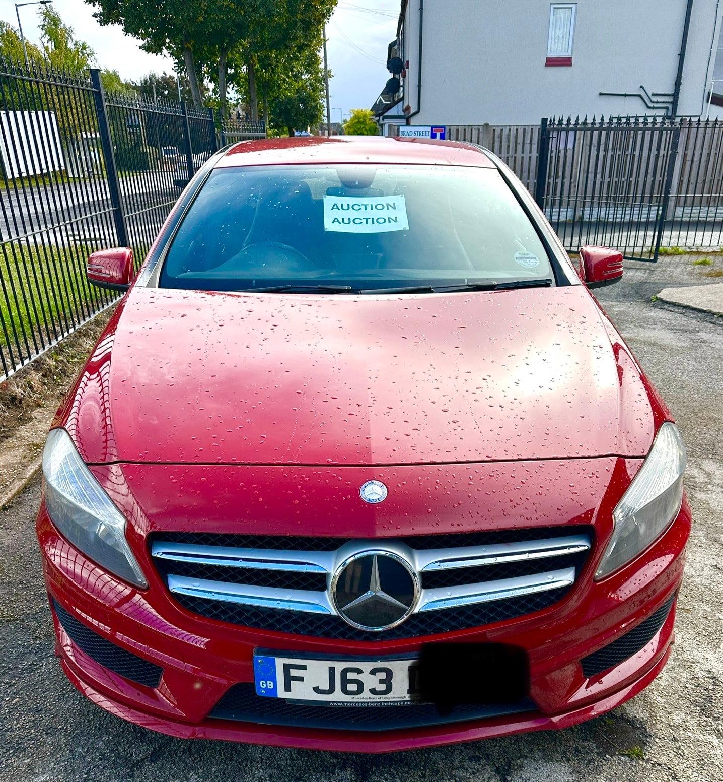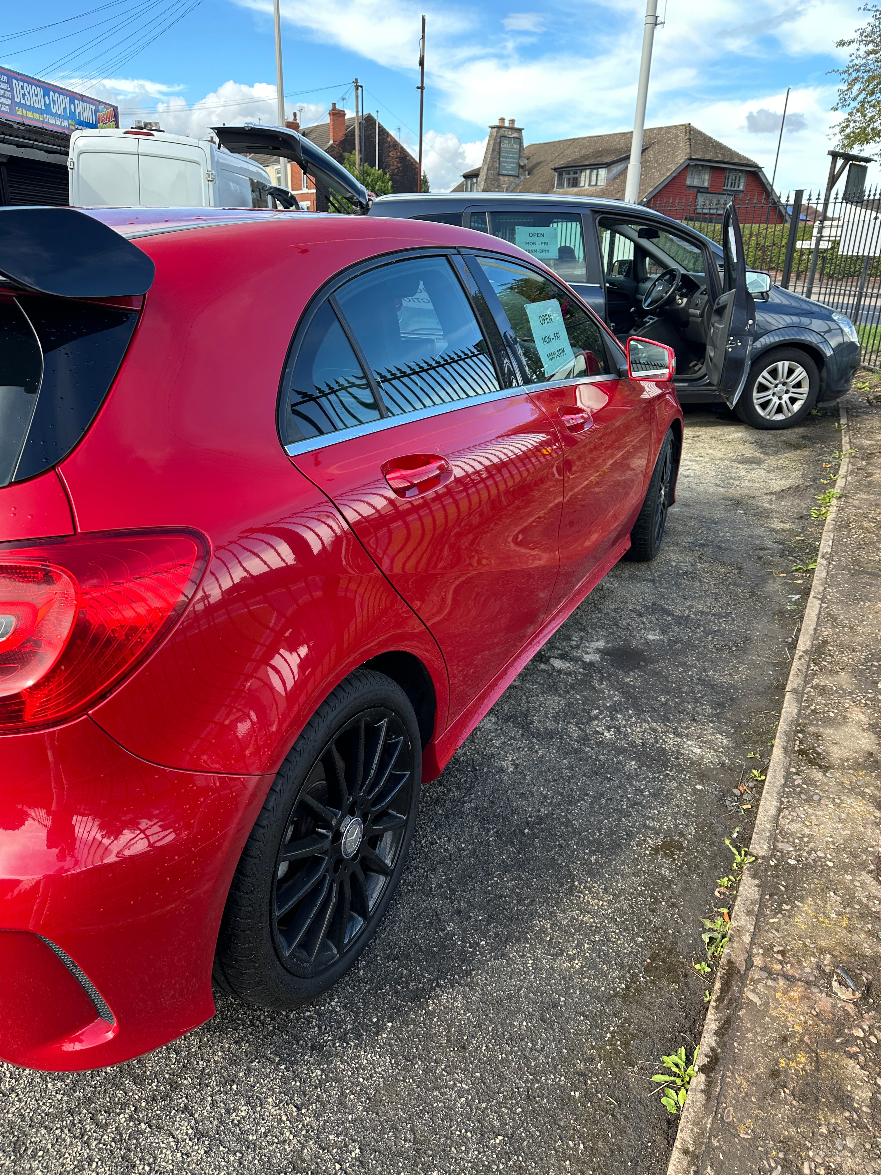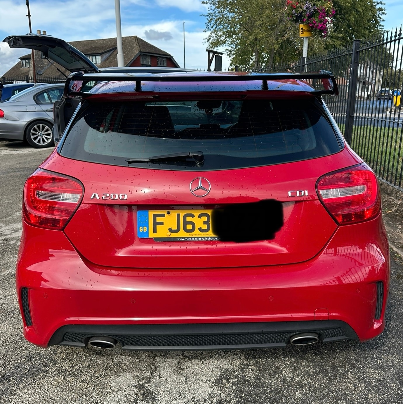 A Mercedes-Benz A-Class A 200 CDI AMG Line 5dr hatchback, identified by rear badging and consistent with market examples of AMG Line vehicles. The vehicle features a metallic red exterior finish, complemented by black multi-spoke alloy wheels, a rear spoiler, and twin exhaust outlets. The interior is appointed with black perforated leather seating accented with red contrast stitching, a multifunction steering wheel, a central infotainment screen, and carbon-fiber look trim on the dashboard. “AMG” branding is visible on the floor mats, and “Mercedes-Benz” on the door sills. The UK registration plate “FJ63” indicates a manufacturing period between late 2013 and early 2014. The odometer displays a reading of 114,532 miles.
