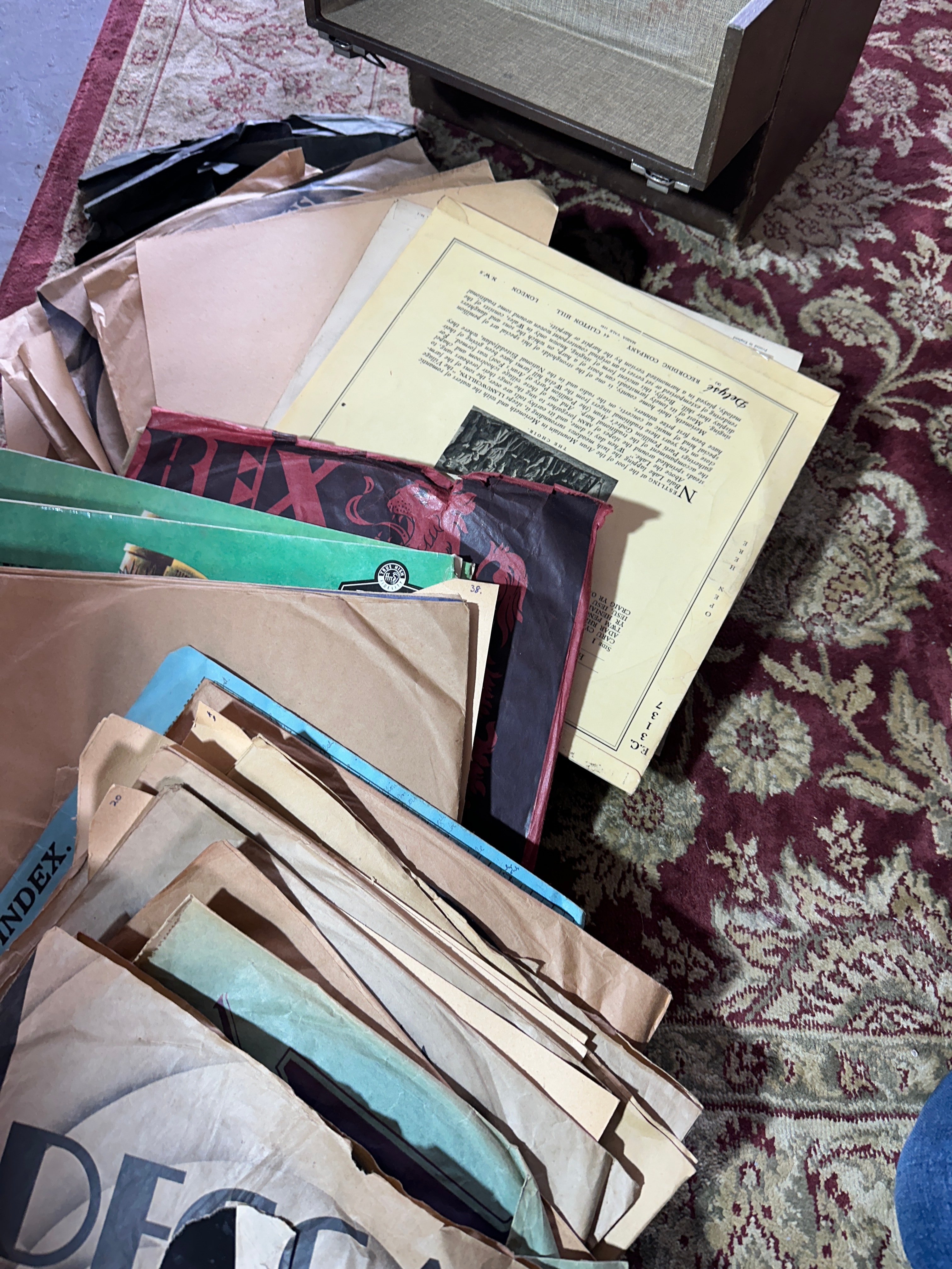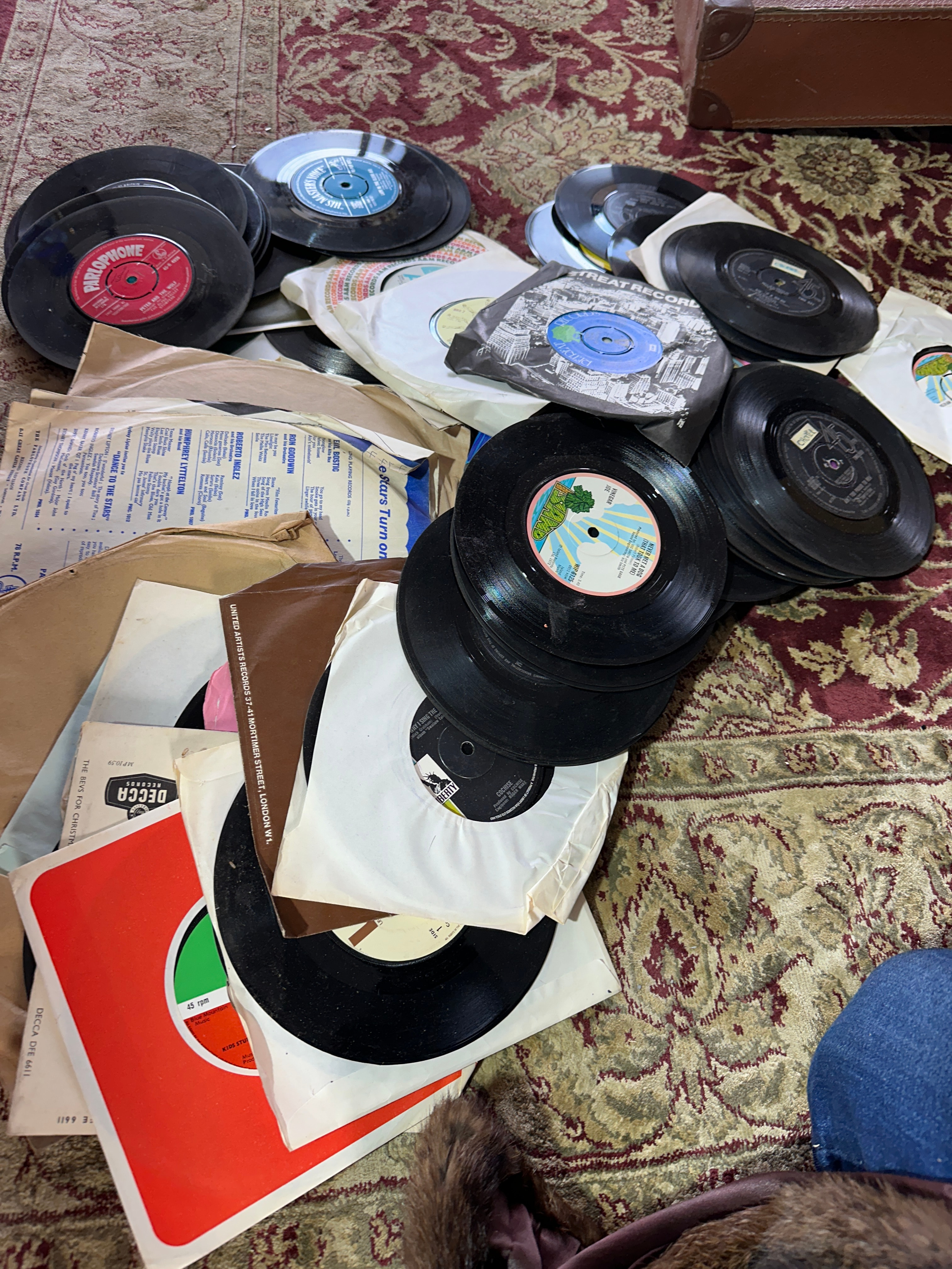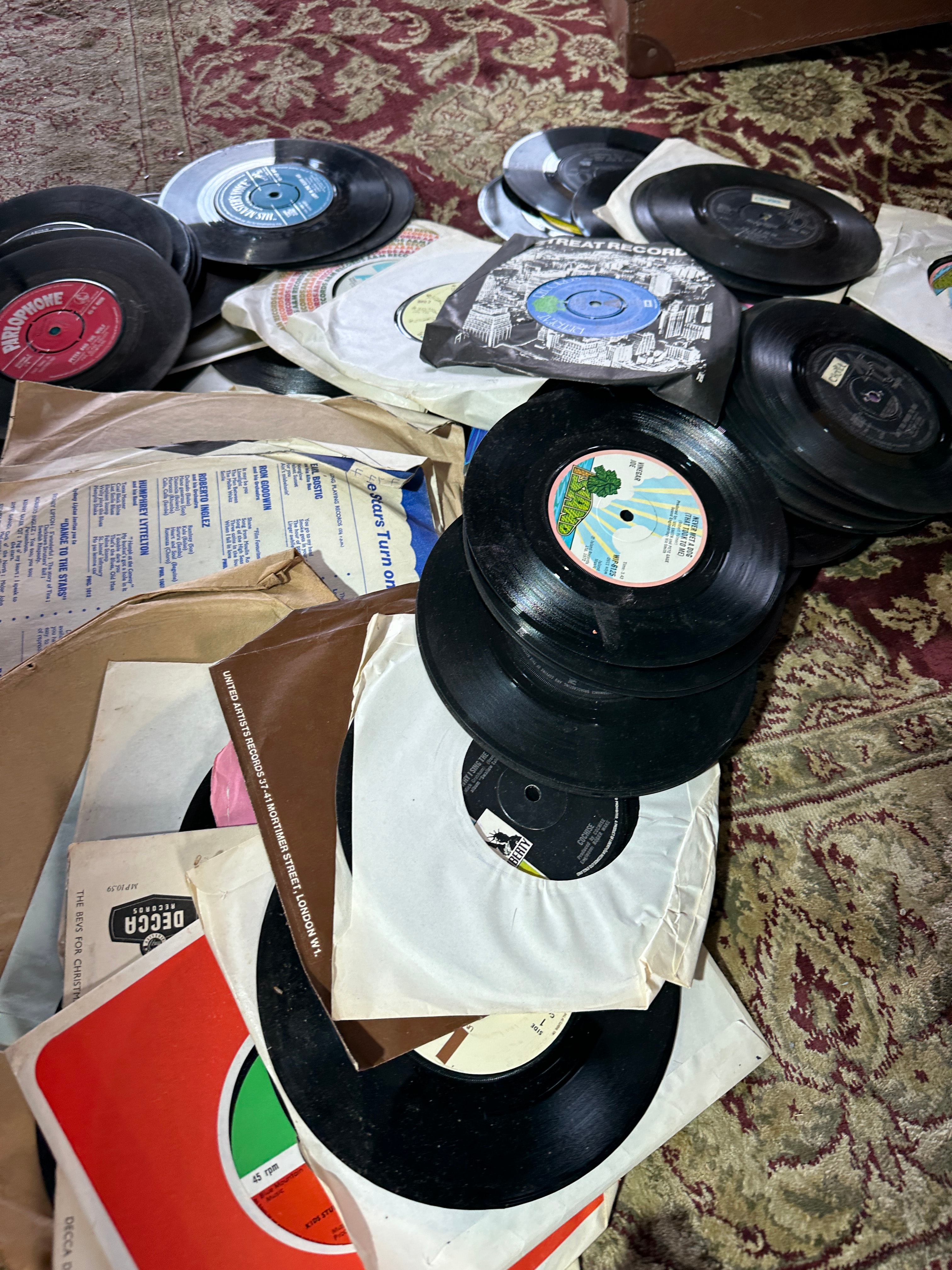 A substantial collection of phonograph records, comprising predominantly 7-inch 45 rpm singles, alongside likely some larger format records (10-inch or 12-inch LPs/78s). The records are made of black vinyl or shellac and are housed in a mix of original paper and cardboard sleeves. Visible labels include DECCA, Columbia, HMV (His Master’s Voice)/Grammophone, RCA Victor, and SUPREME RECORDS. Some sleeves display text such as “THE ROVERS” and “UNITED ARTISTS RECORDS LTD., MORTIMER STREET, LONDON, W.1.” The lot also includes three record storage solutions: two vintage-style portable cases, one brown leatherette/fiberboard with metal clasps and handle, and the other similar but darker and appearing reinforced with black tape; and one open cardboard box filled with records.