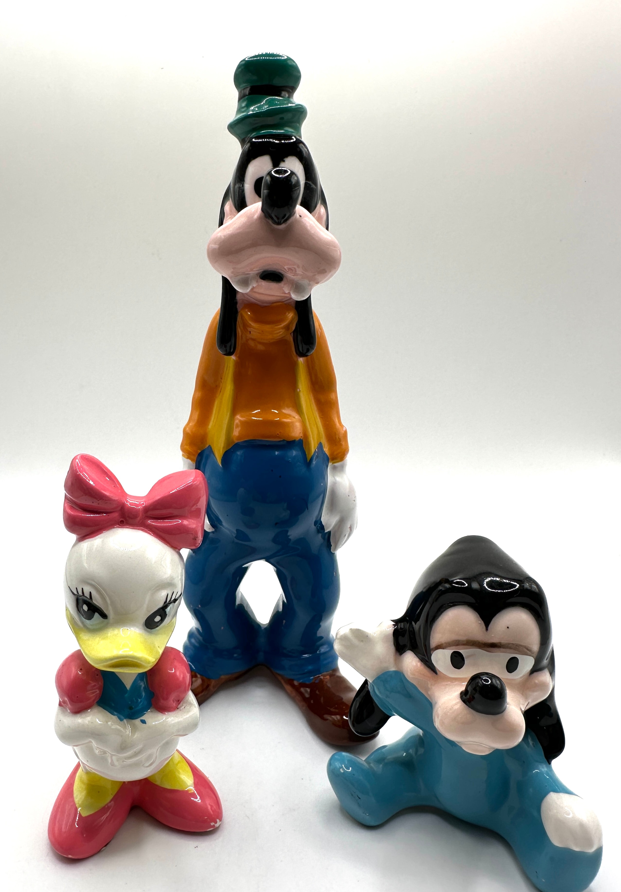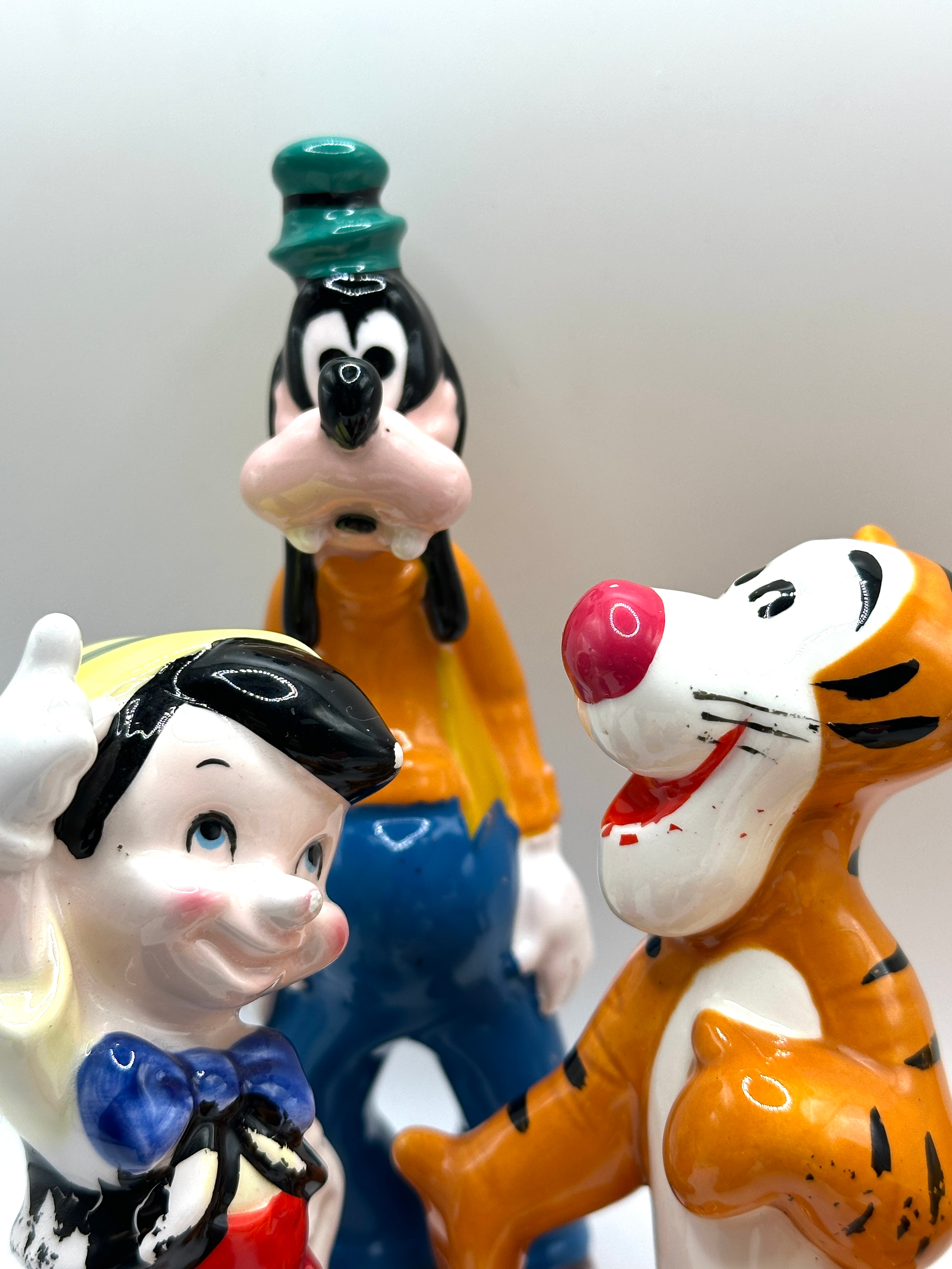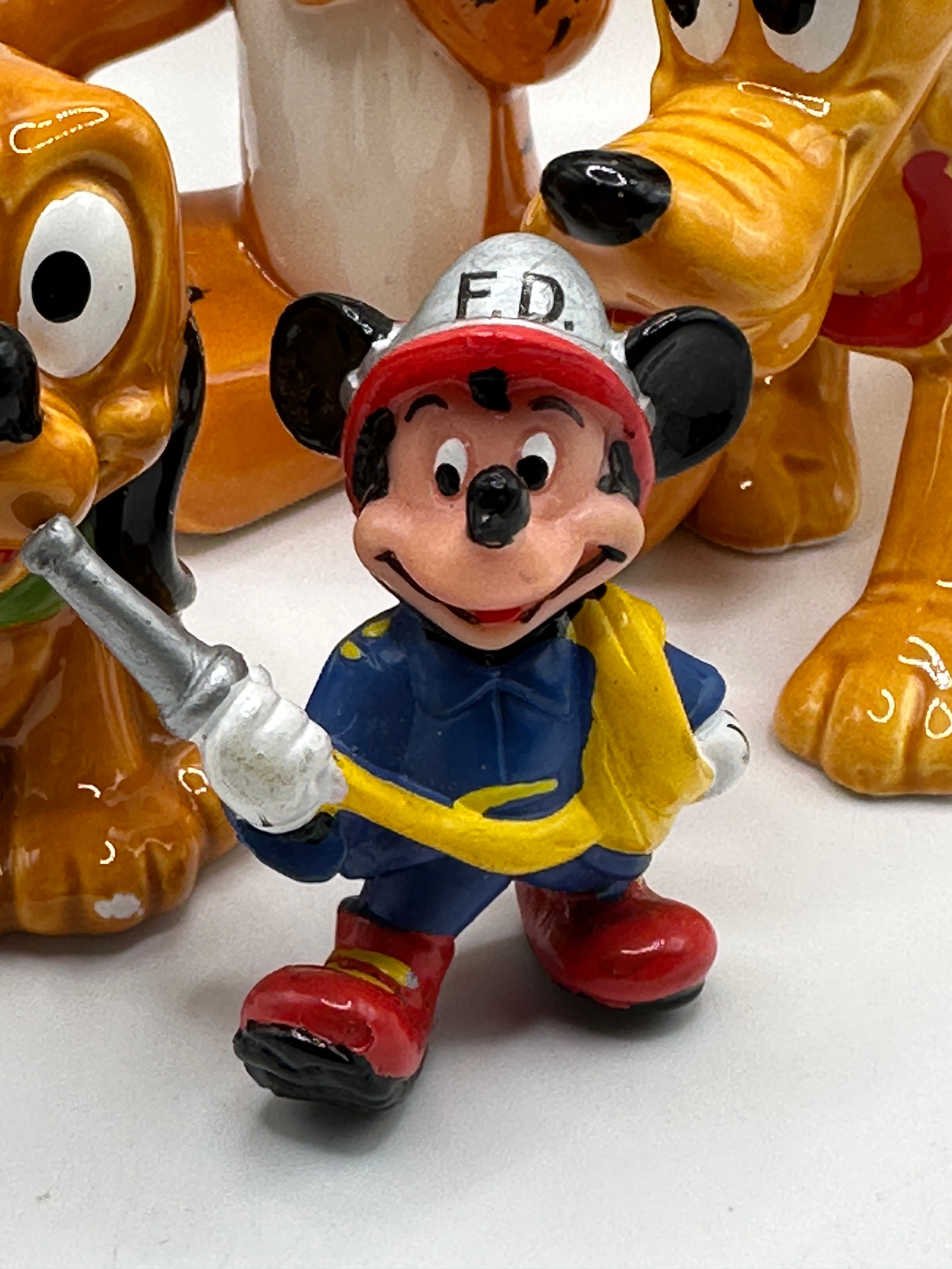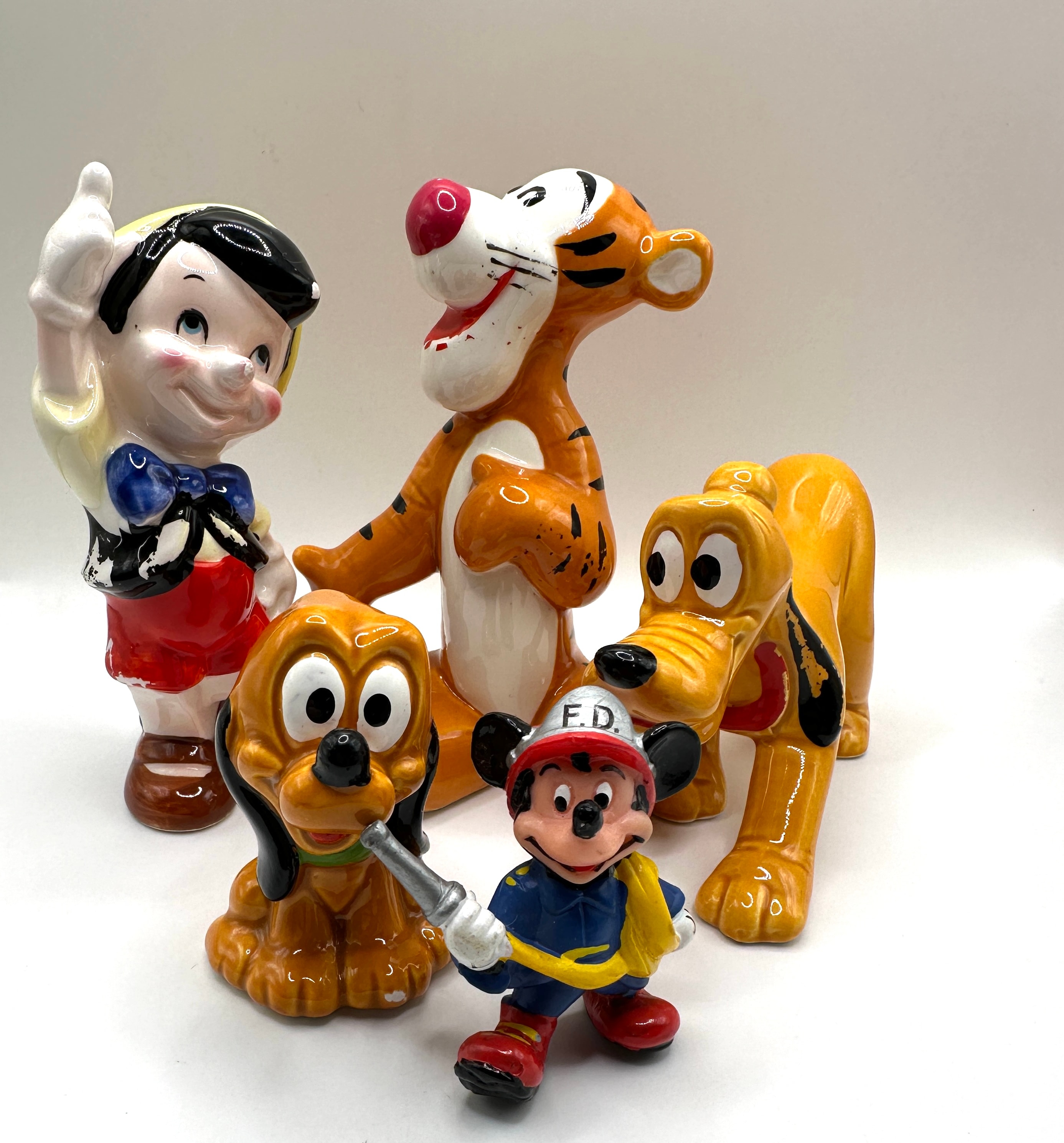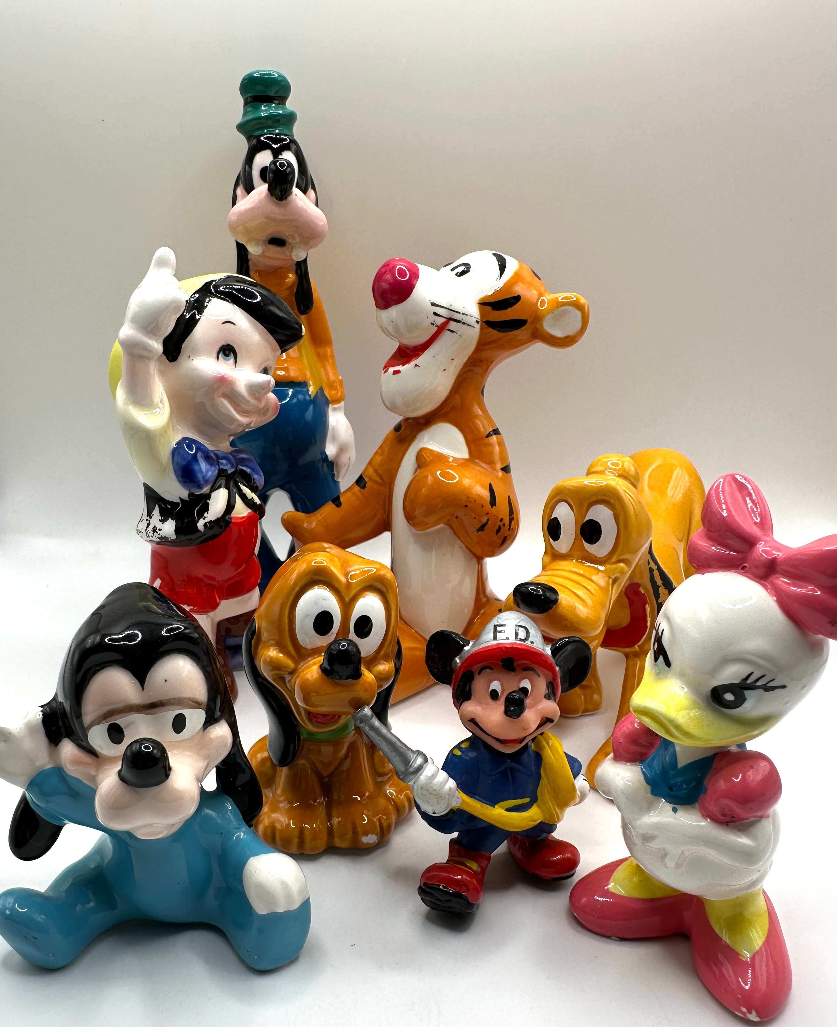 A collection of eight Walt Disney Productions Japan porcelain figurines. The group comprises various popular Disney characters: a tall Goofy, Daisy Duck, Pinocchio, Tigger, two distinct Pluto figures (one sitting, one standing), a small baby dog-like character, and Mickey Mouse dressed as a firefighter. The Mickey Mouse figurine’s helmet is prominently marked “F.D.” in raised silver lettering. The figures exhibit a vibrant, glossy finish.