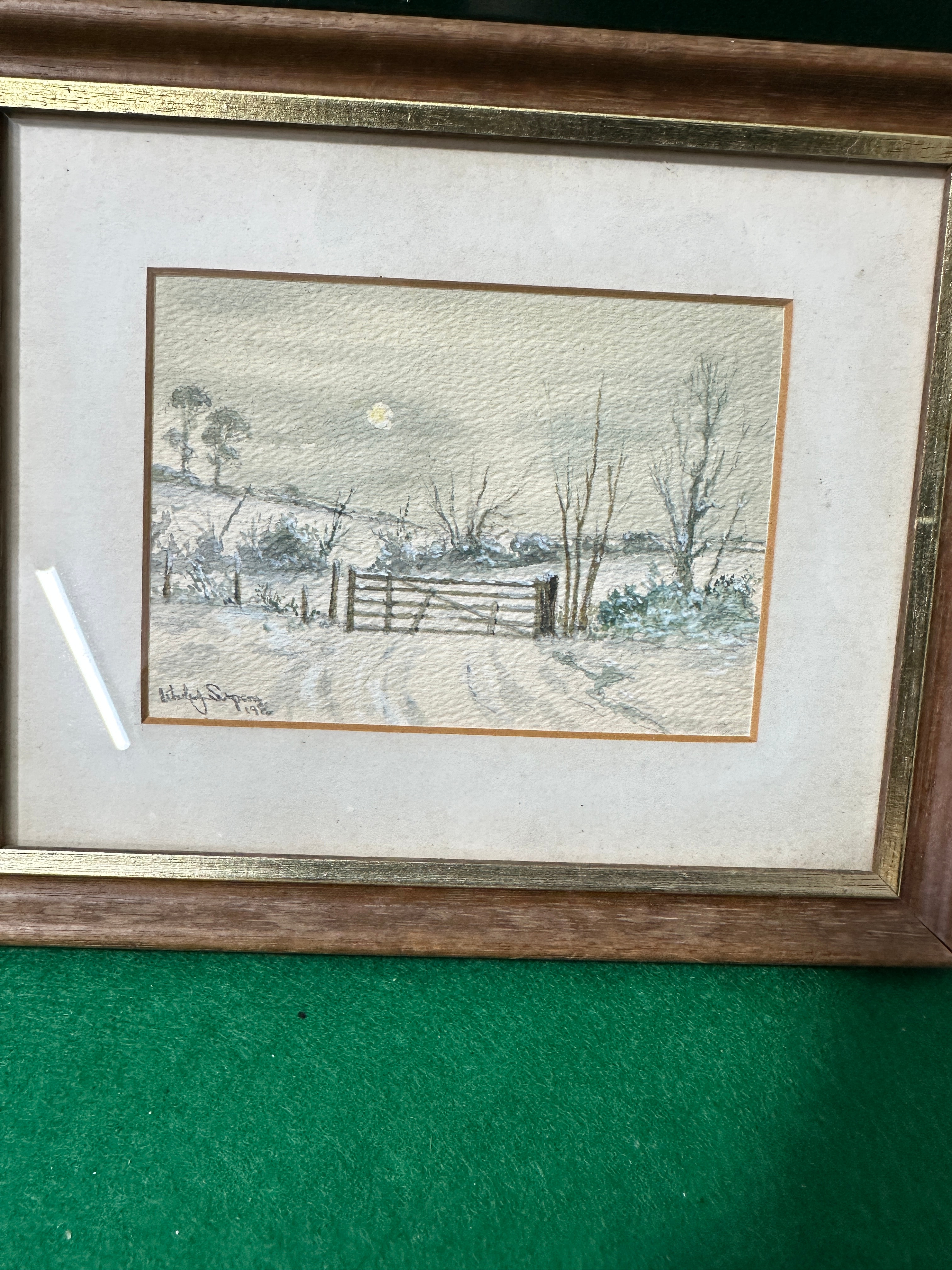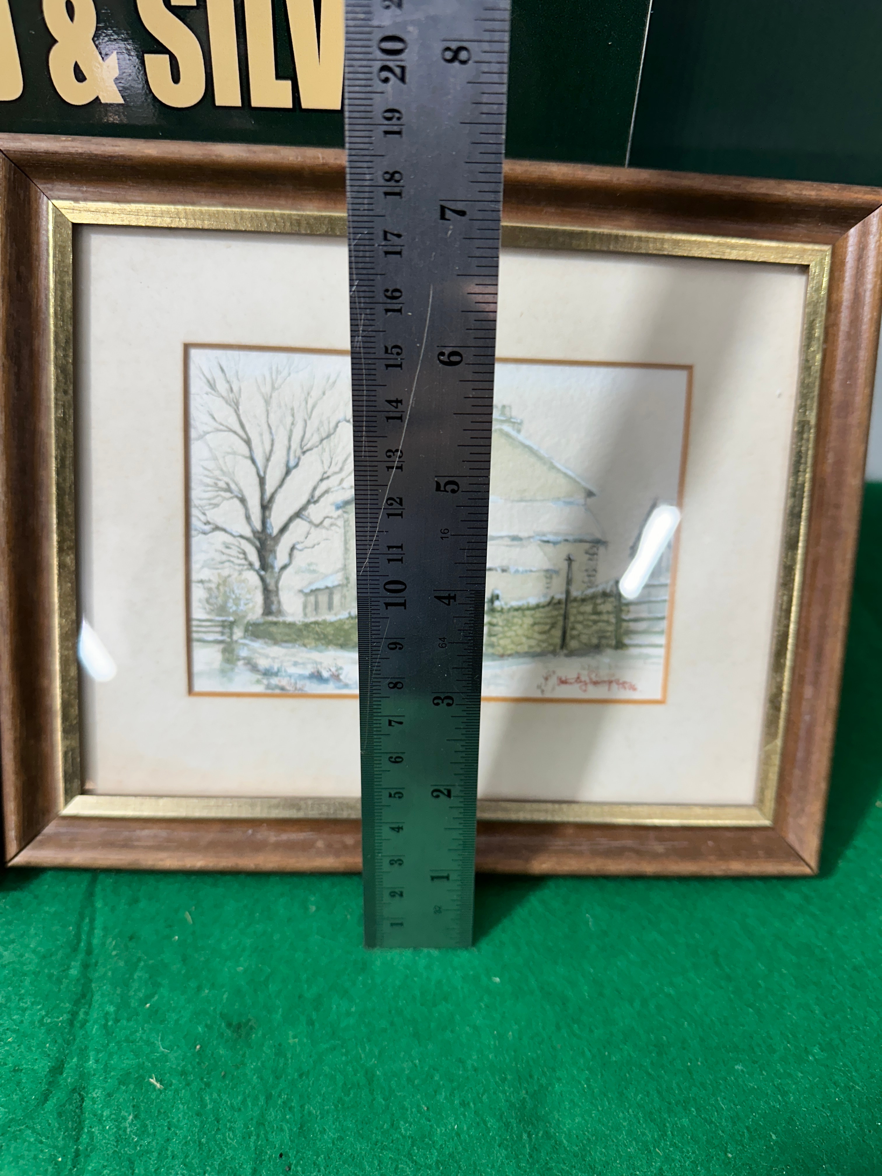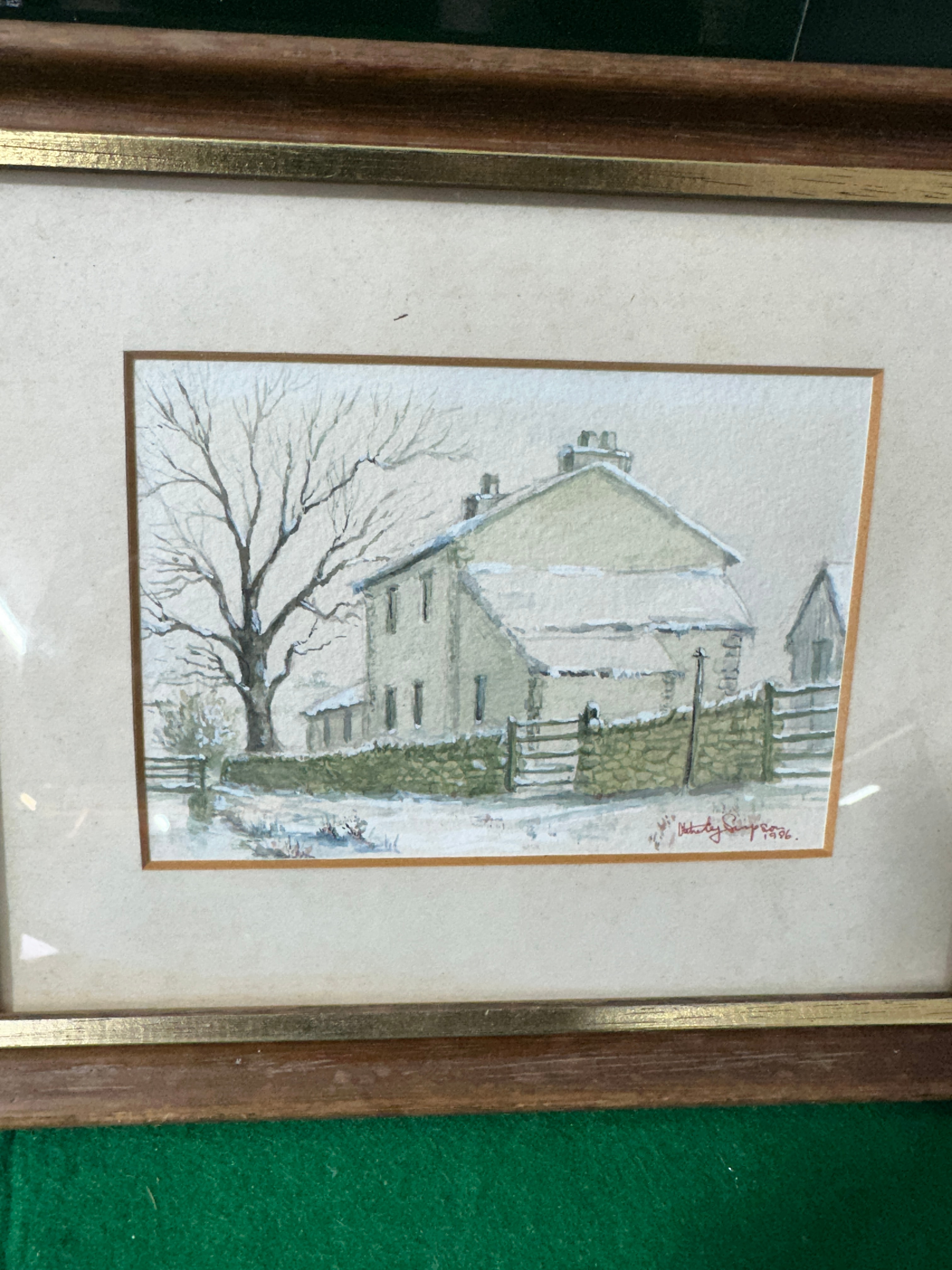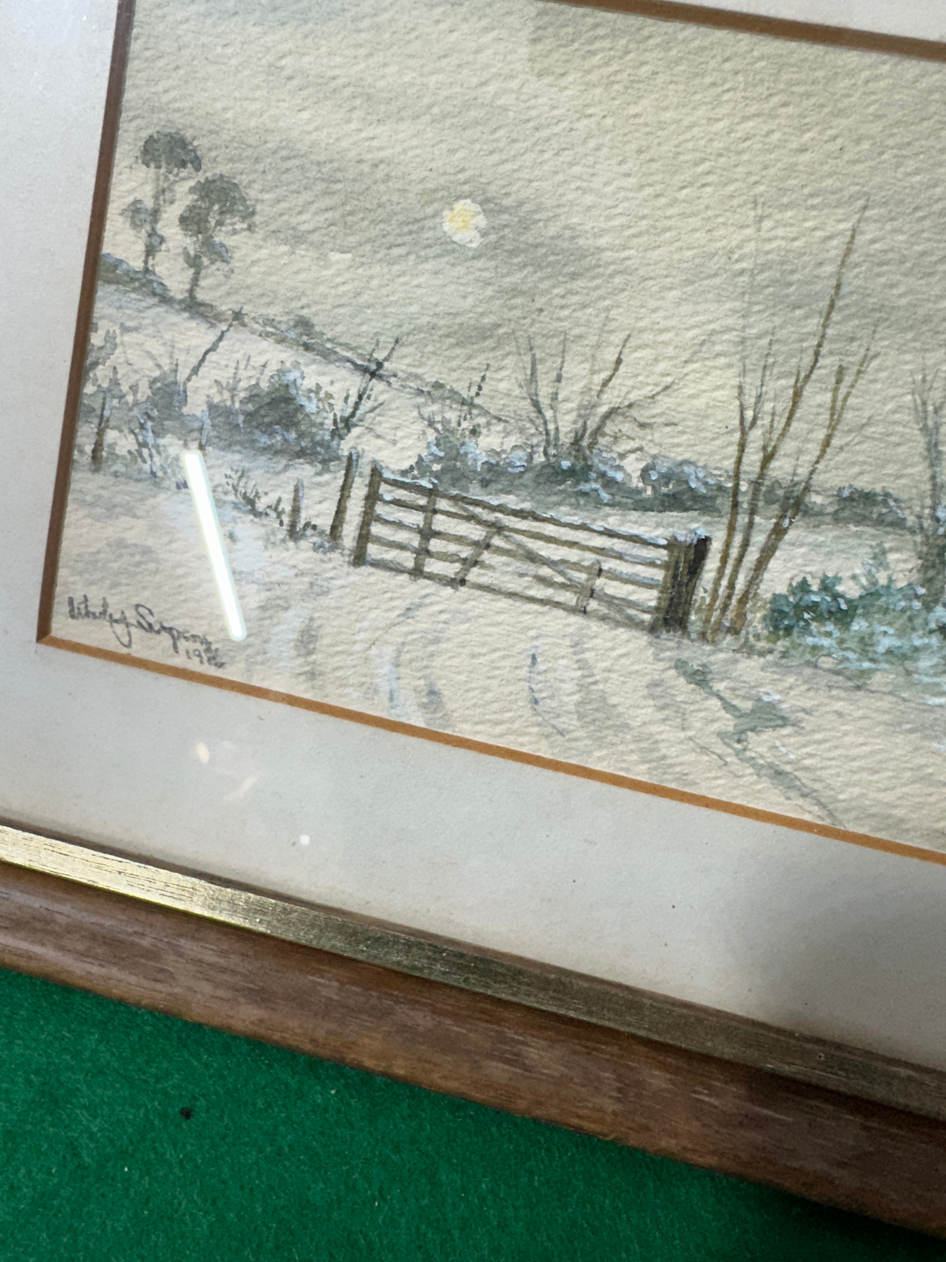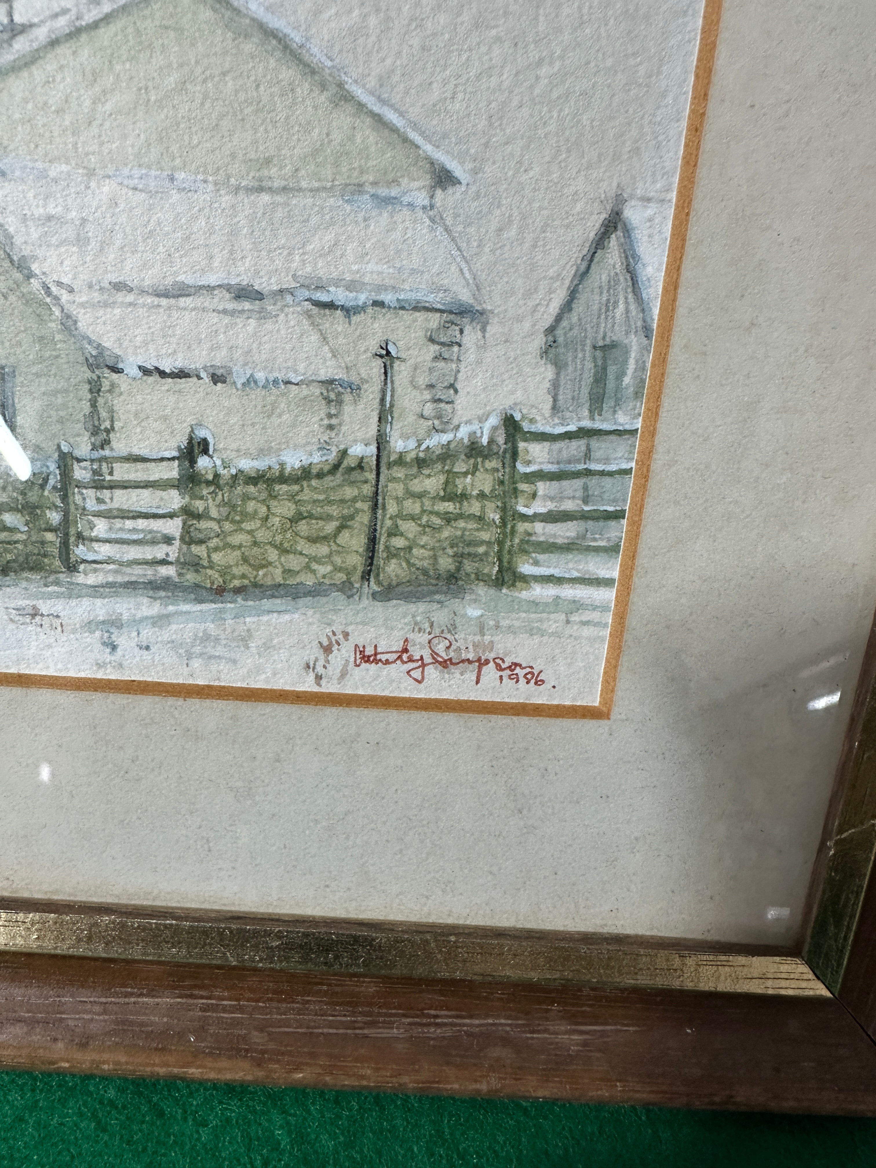 This lot comprises a pair of watercolour paintings by W. H. Simpson, each depicting a winter landscape scene. Rendered on paper, each artwork is matted in a cream tone and set under glass within a dark wood frame featuring a gold-tone inner fillet. The left painting illustrates a snow-covered field with bare trees and a wooden fence under a moonlit sky, signed ‘W. H. Simpson’ and dated ‘1976’ in red script. The right painting features a snow-covered building with a prominent bare tree and a stone wall, also signed ‘W. H. Simpson’ and dated ‘1986’ in red script.