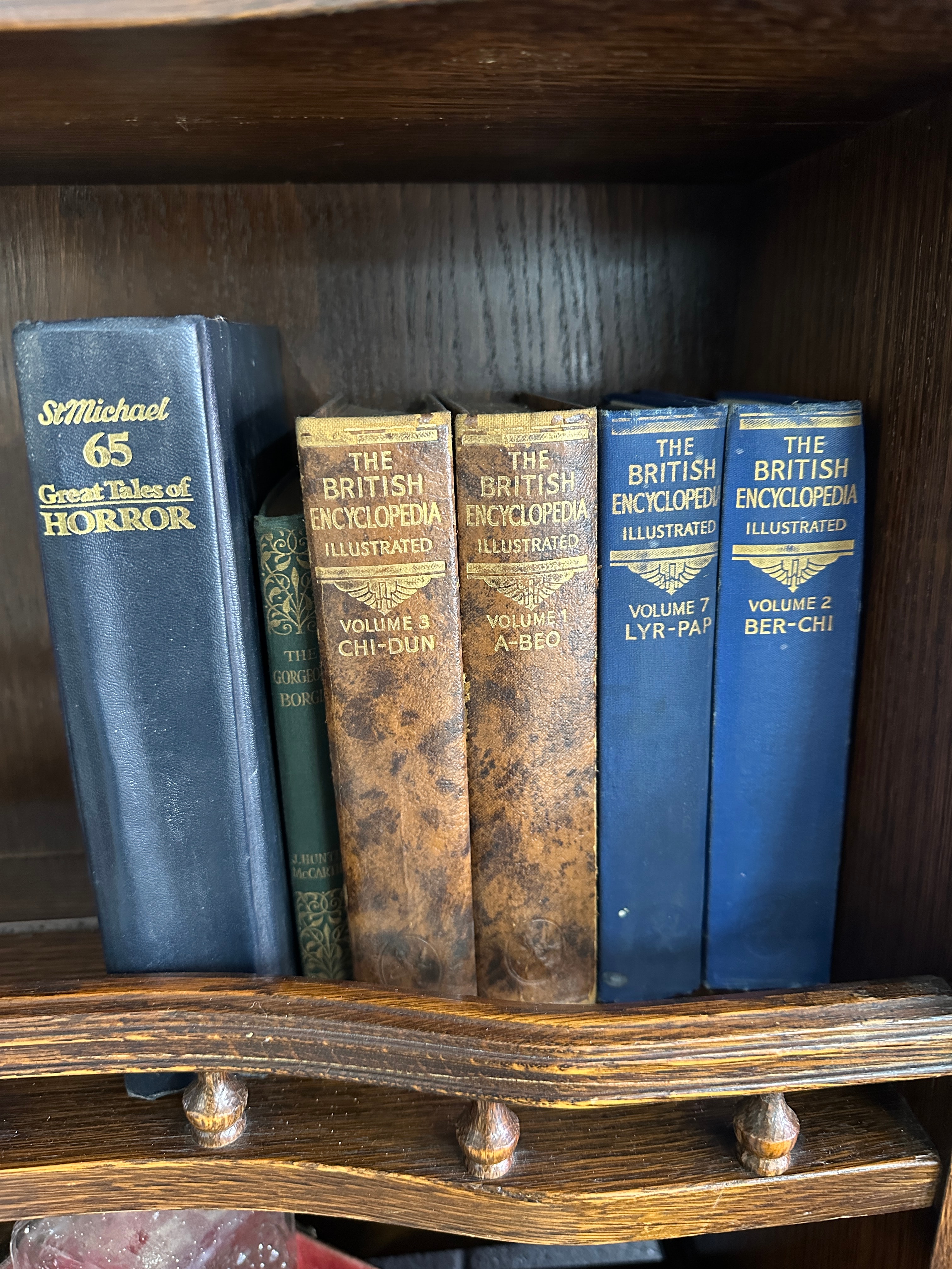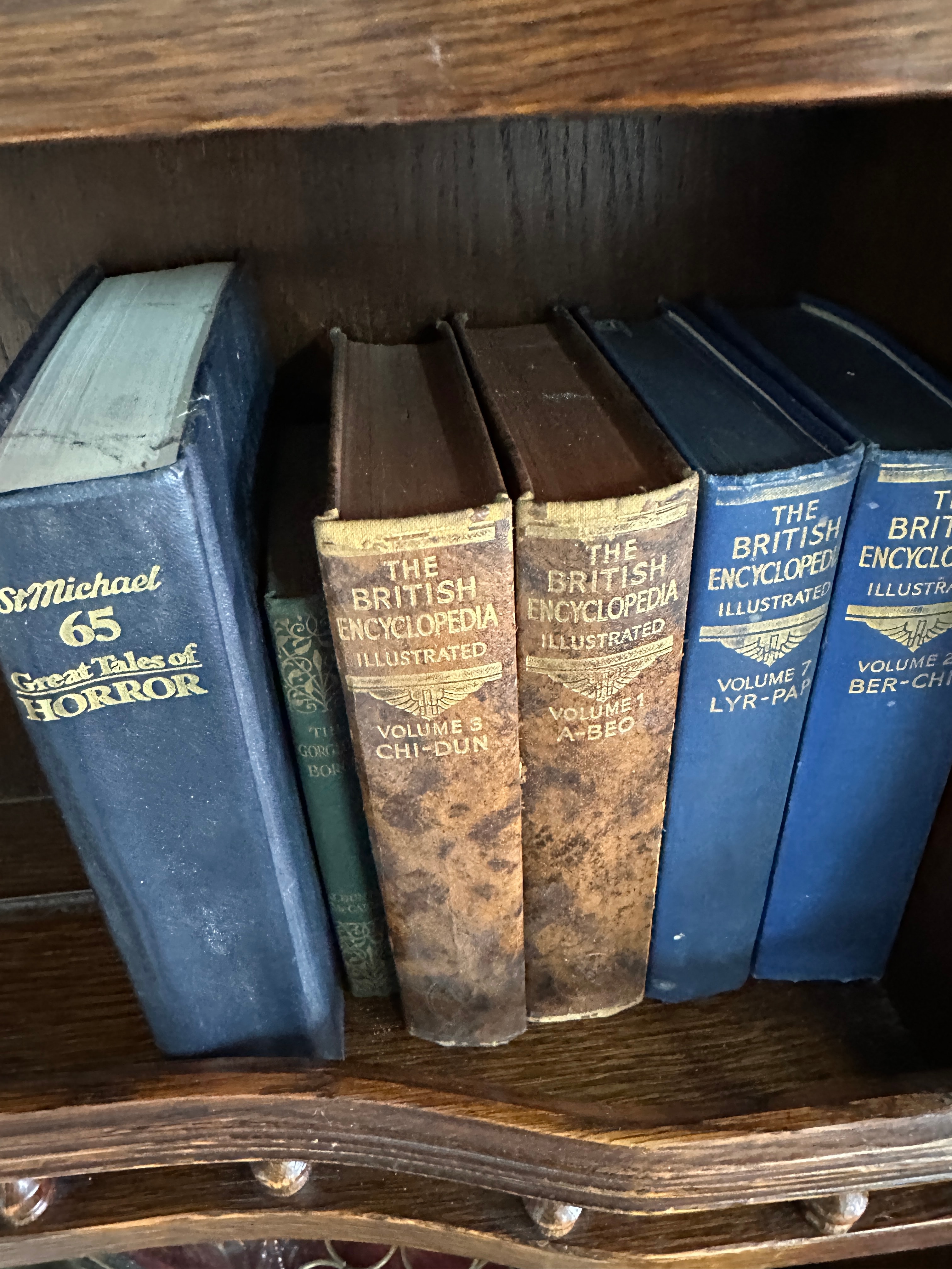 A collection of six books, likely from the mid-20th century or earlier, arranged on a wooden shelf. The leftmost volume is a large, dark blue cloth-bound book titled “St Michael 65 Great Tales of HORROR.” To its right, a slim, dark green book is partially visible with text “THE GORGON BOR…”. The central two volumes are uniformly bound in a worn, mottled brown material, possibly leather or imitation, titled “THE BRITISH ENCYCLOPAEDIA ILLUSTRATED” with “VOLUME 3 CHI-DUN” and “VOLUME 1 A-BEO” respectively. The two rightmost volumes are also “THE BRITISH ENCYCLOPAEDIA ILLUSTRATED” but are uniformly bound in dark blue cloth, labeled “VOLUME 7 LYR-PAP” and “VOLUME 2 BER-CHI.” Web intelligence reports suggest a market for similar period encyclopaedia sets, such as “The Children’s Encyclopedia” by Arthur Mee.