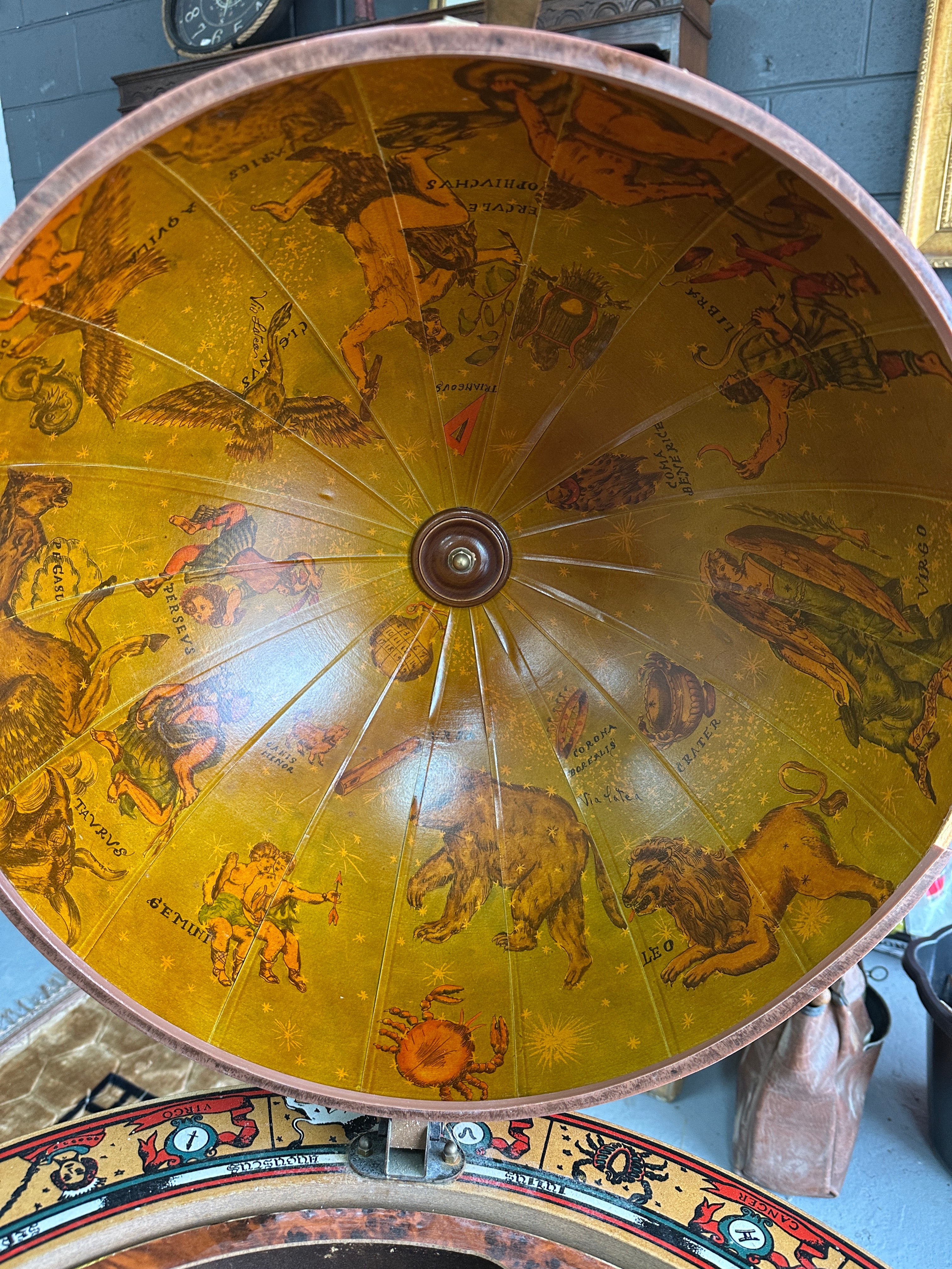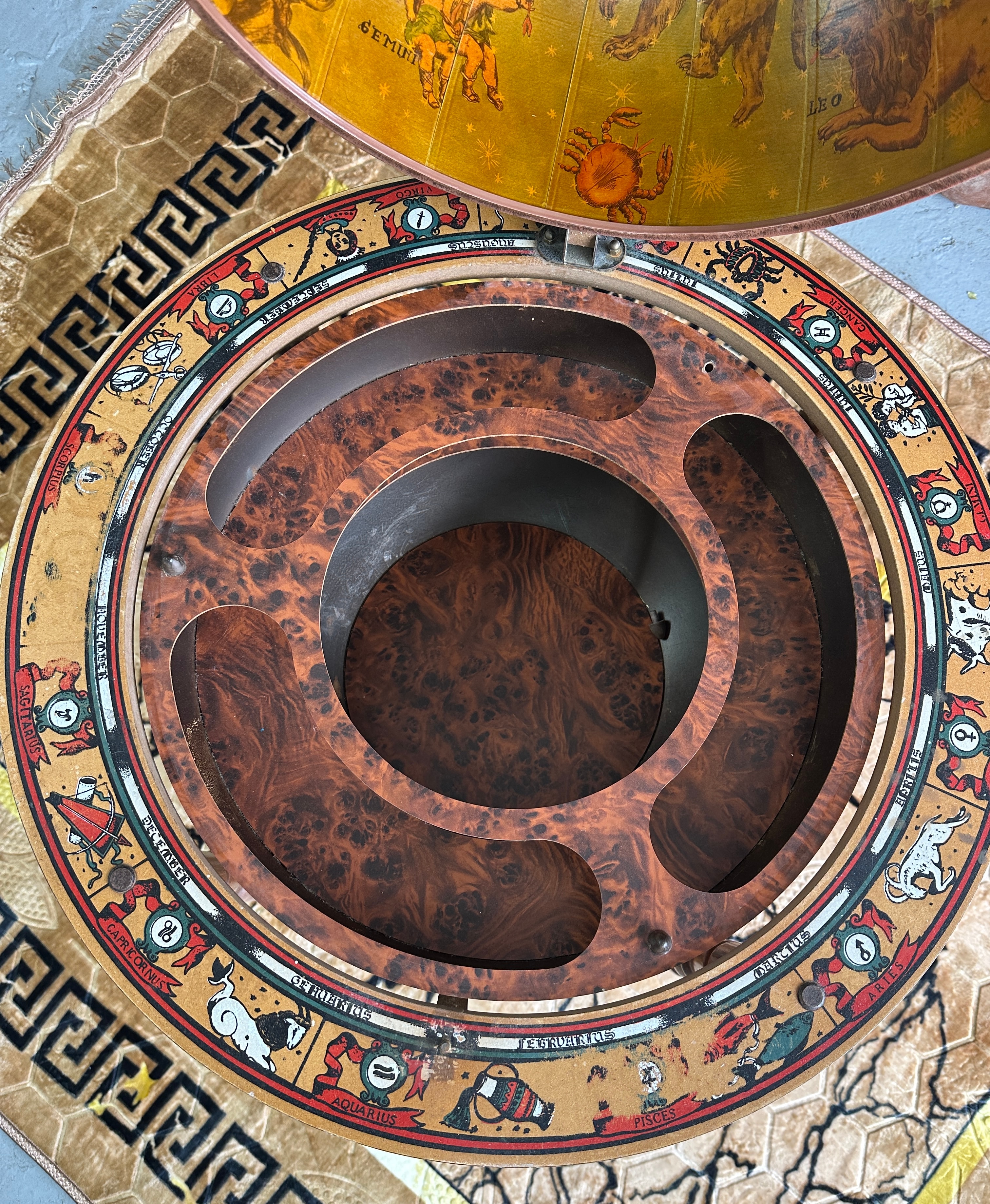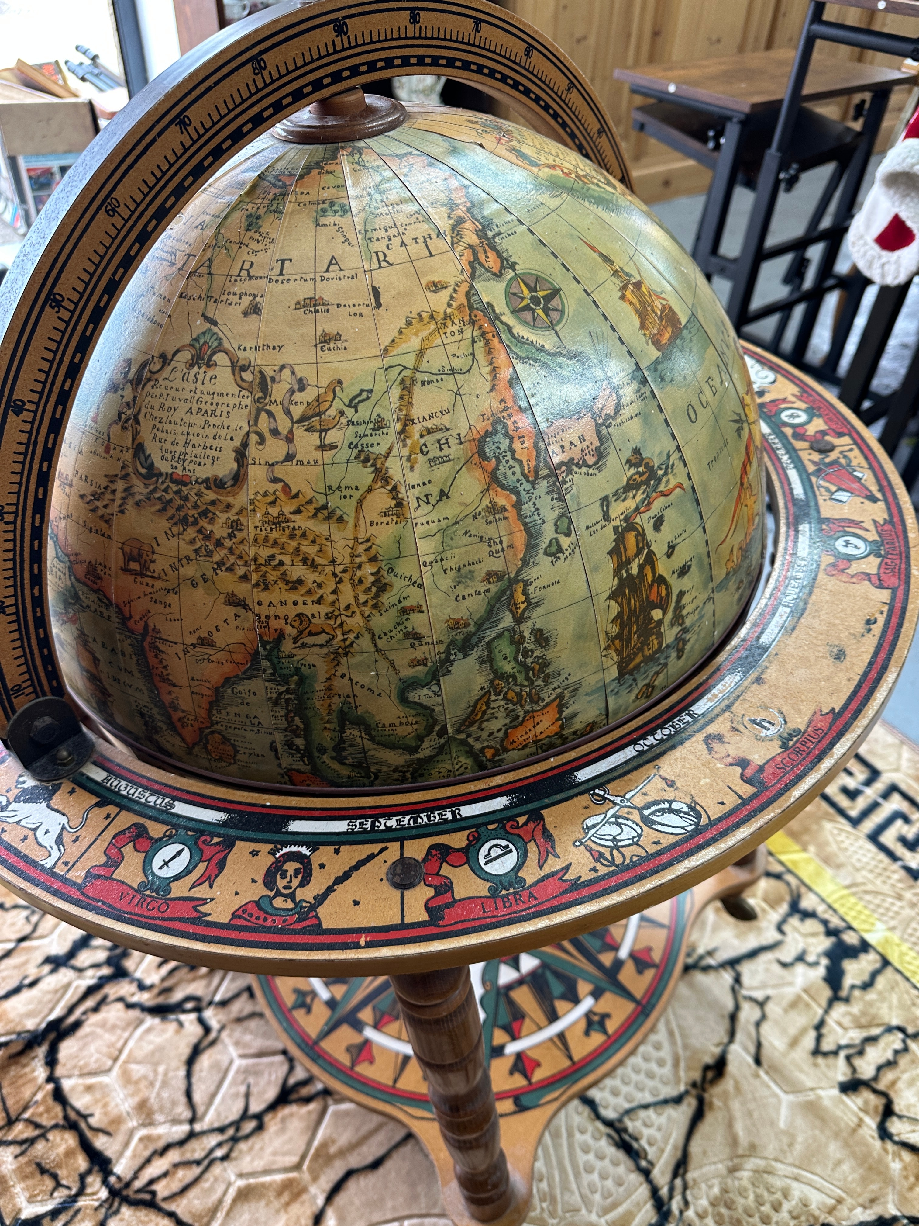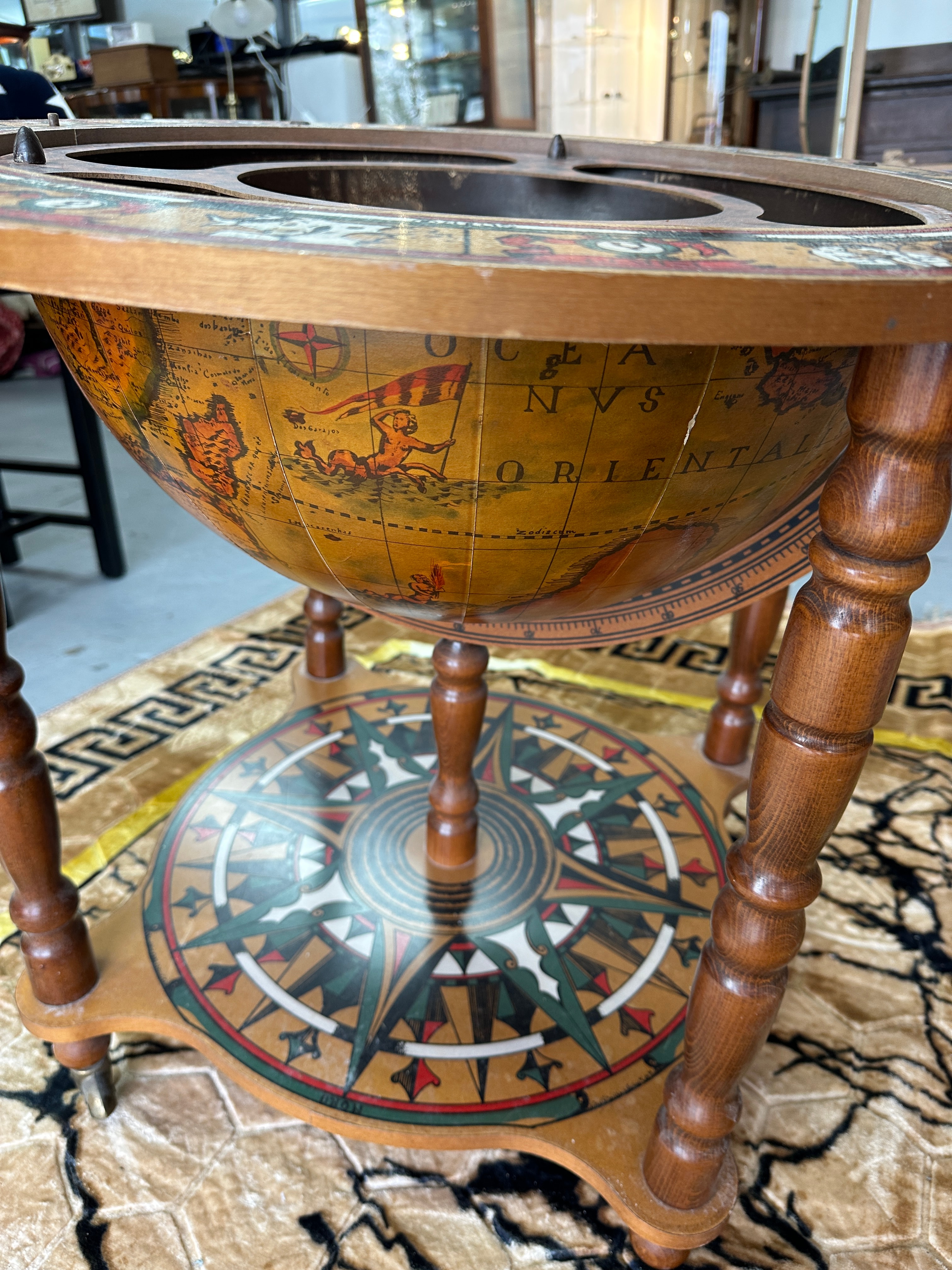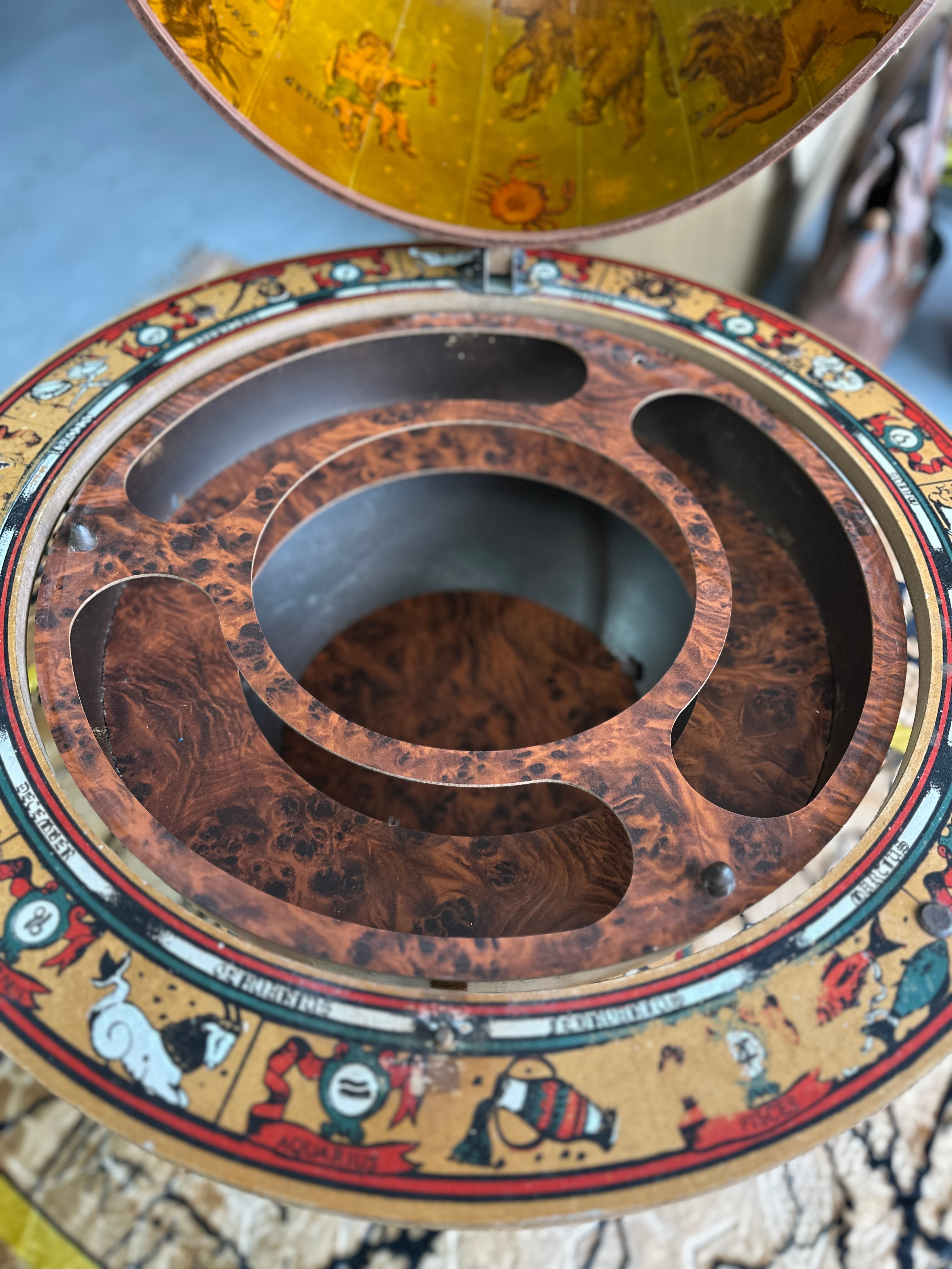 A decorative wooden floor globe, designed in a vintage style, functioning as a bar globe with a hidden compartment. The exterior features a historical world map with old-style cartography, depicting continents, oceans, sailing ships, and mythological sea creatures. Place names are predominantly in English with some Latin phrases, such as “Terra Incognita.” The globe opens at the equator via a hinge to reveal an interior storage compartment, which is lined with a celestial map illustrating constellations and their Latin names, including “Gemini,” “Leo,” “Taurus,” and “Aquarius.” The globe is supported by a turned wooden stand with four legs ending in casters. An equatorial ring is marked with English zodiac signs, such as “Aquarius,” “Pisces,” and “Virgo,” along with corresponding months. A circular lower shelf is adorned with a colorful compass rose design. The piece is constructed primarily of wood with printed or applied surfaces for the maps and decorative elements.
