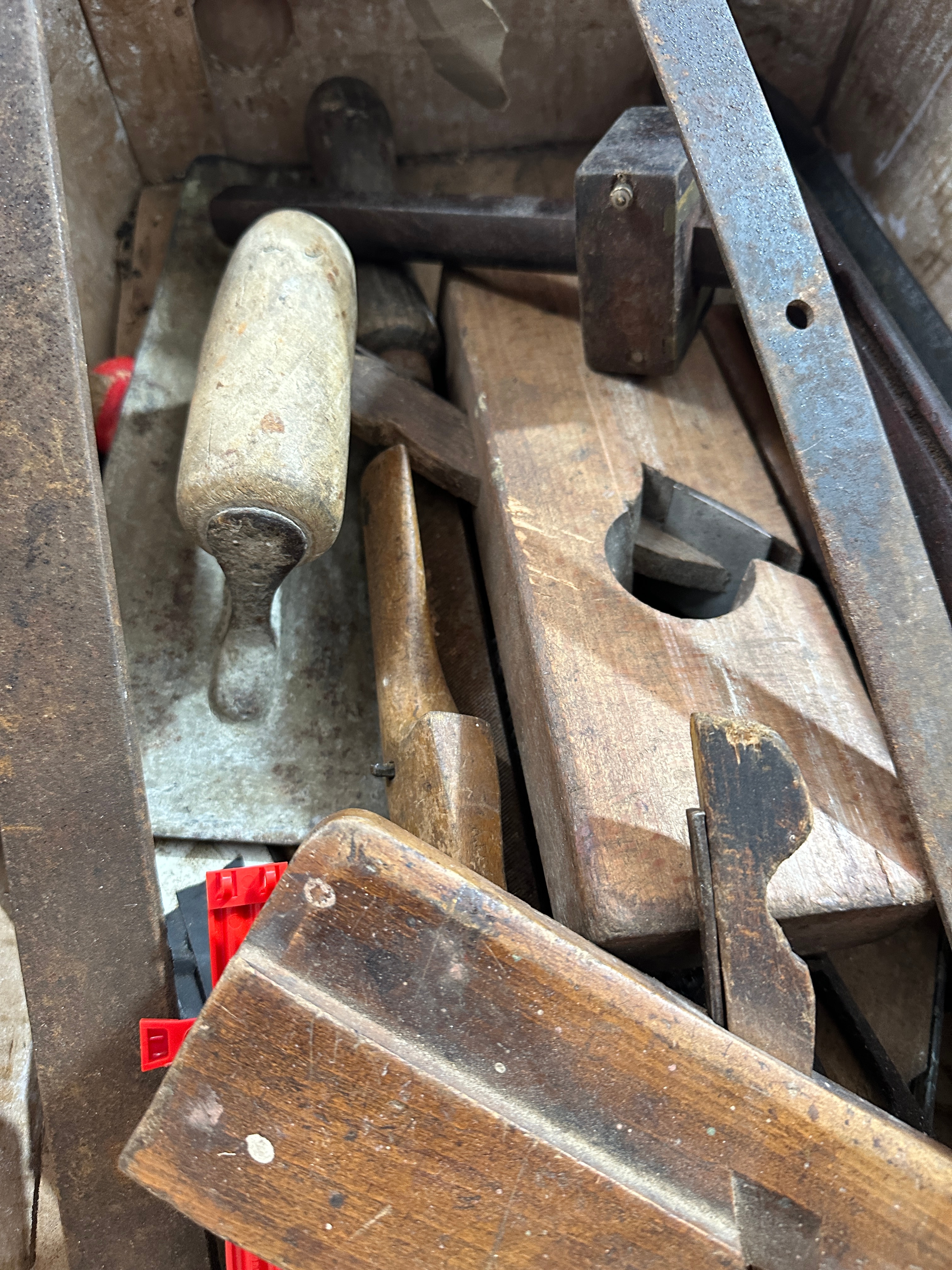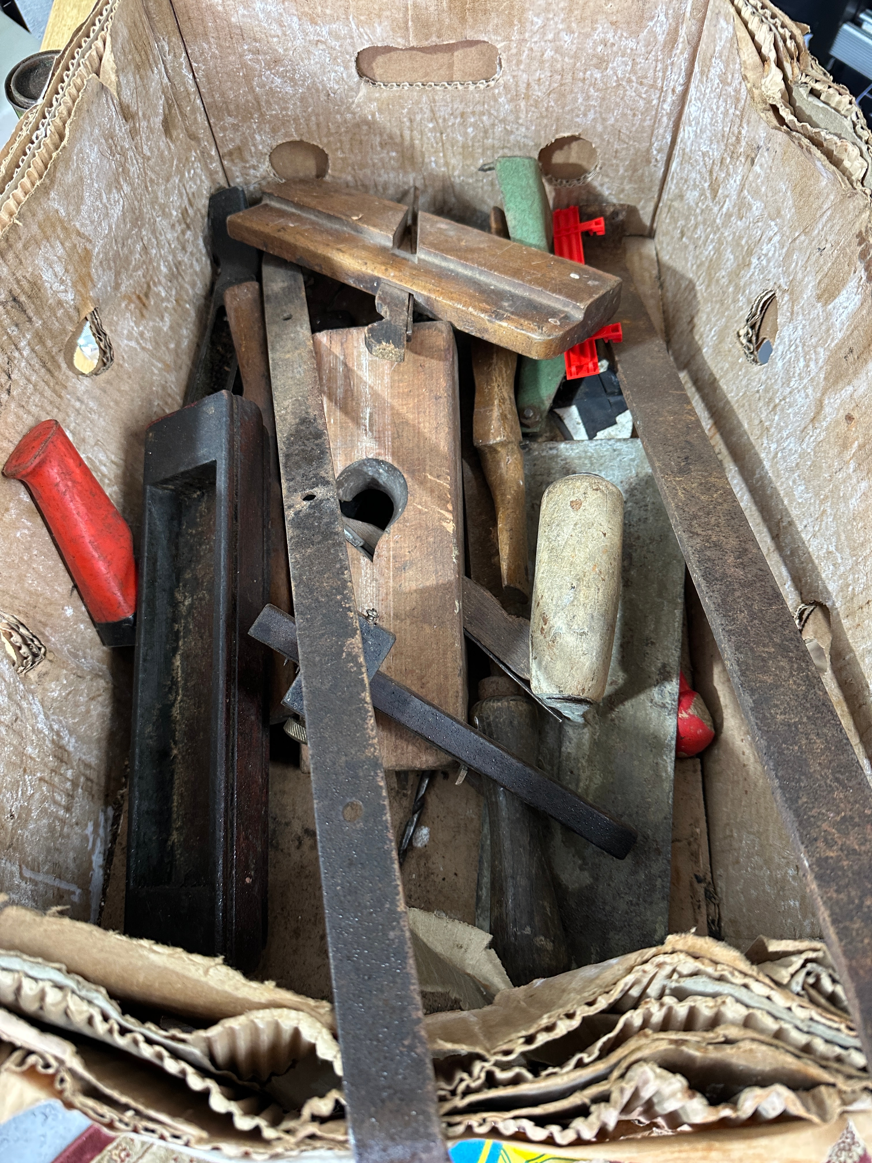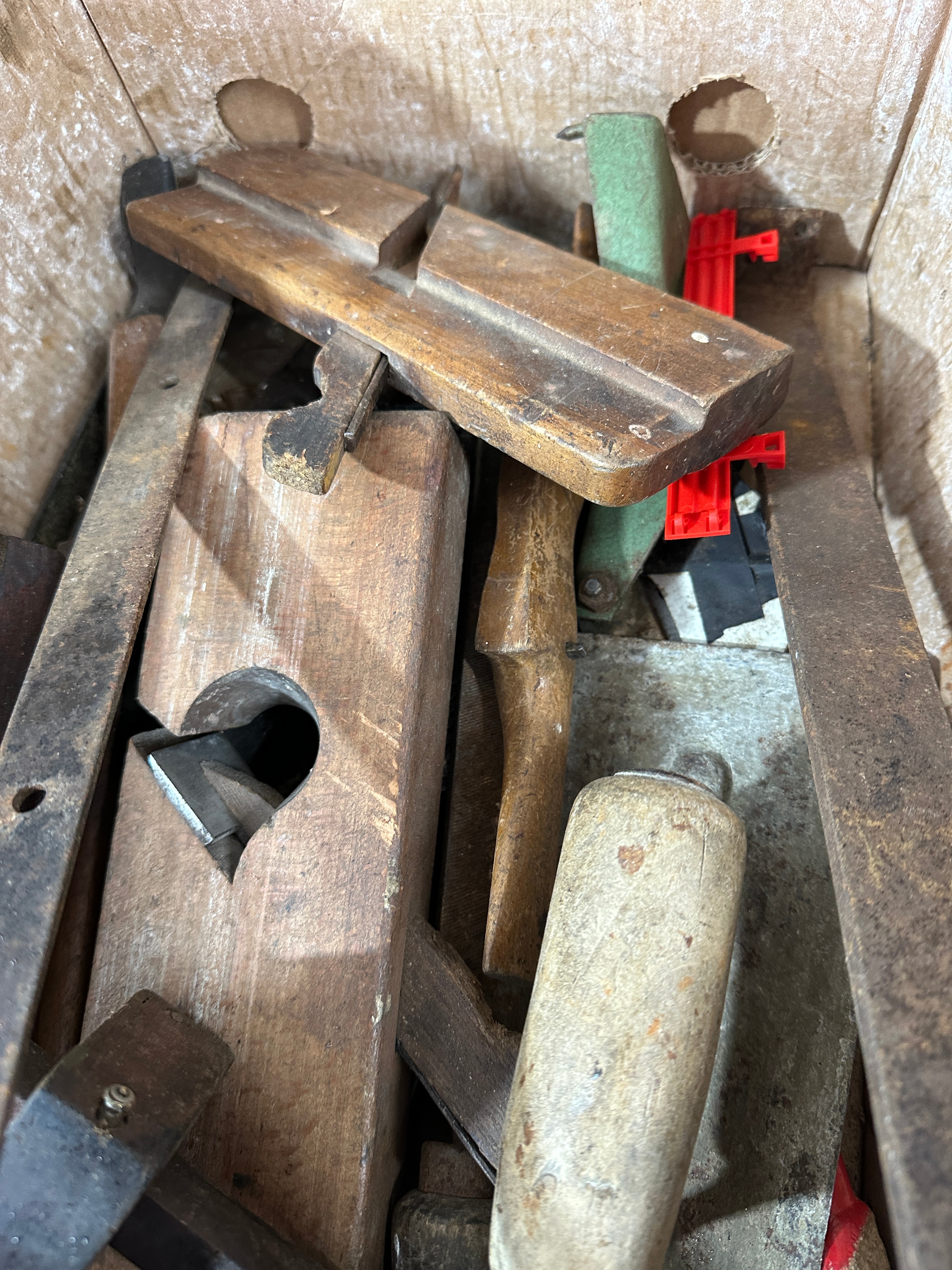 A collection of vintage hand tools, predominantly woodworking implements, contained within a cardboard box. The items are constructed primarily from aged wood and ferrous metal. Key visible tools include several wooden body planes, notably one with a heart-shaped opening for the iron and another featuring a red-painted wedge or adjustment mechanism. Also present are multiple rusted metal bars or strips, various shaped wooden handles, a small mallet, and other miscellaneous wooden and metal tool components. No discernible manufacturer’s marks or text are visible.