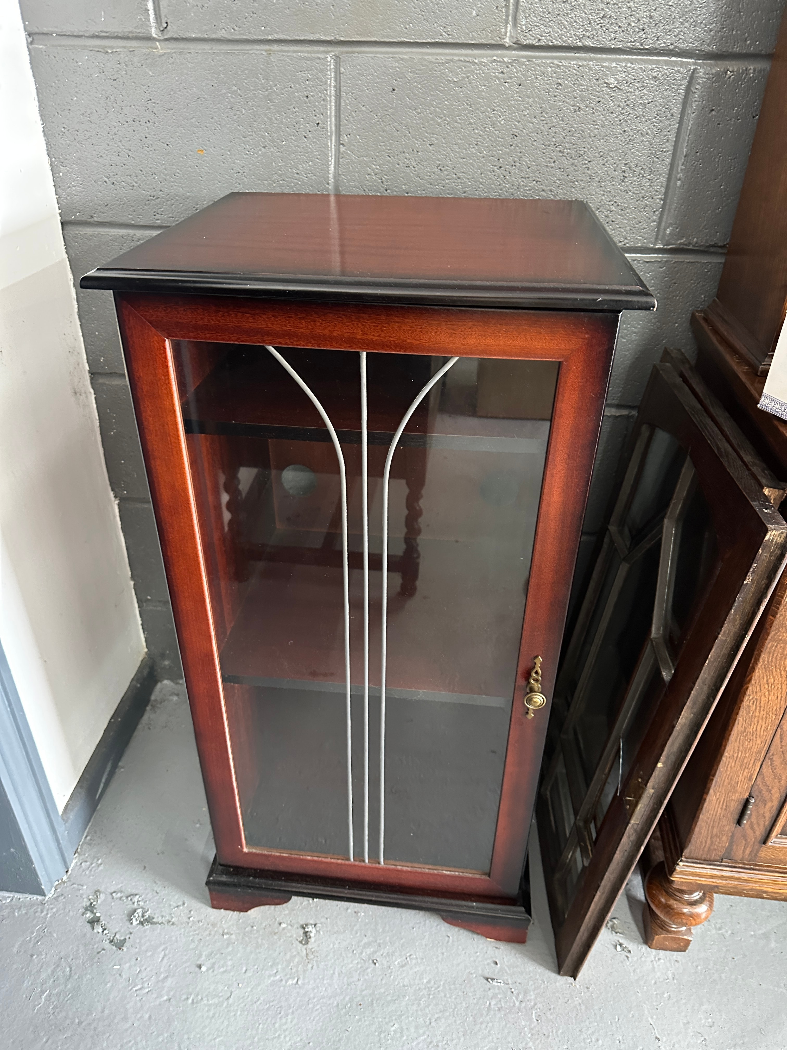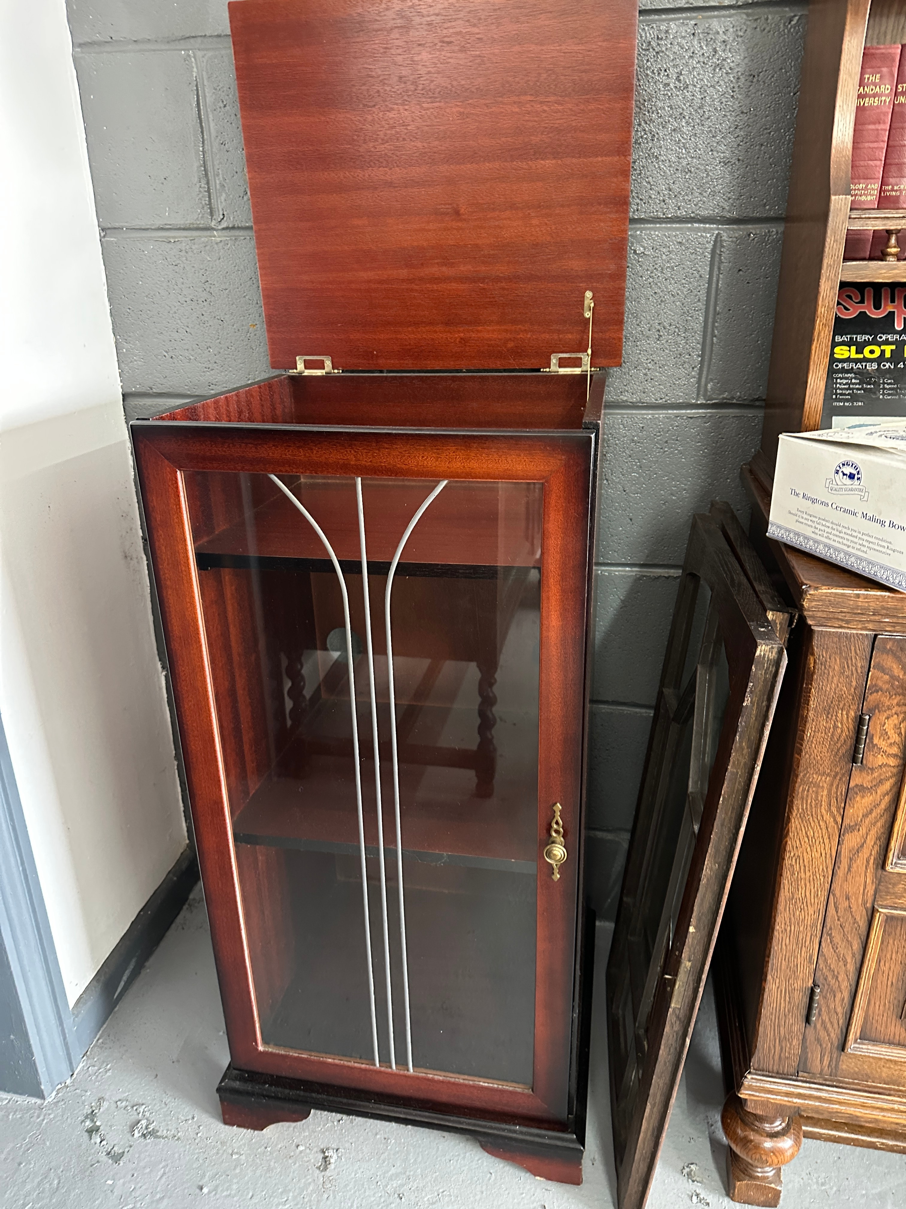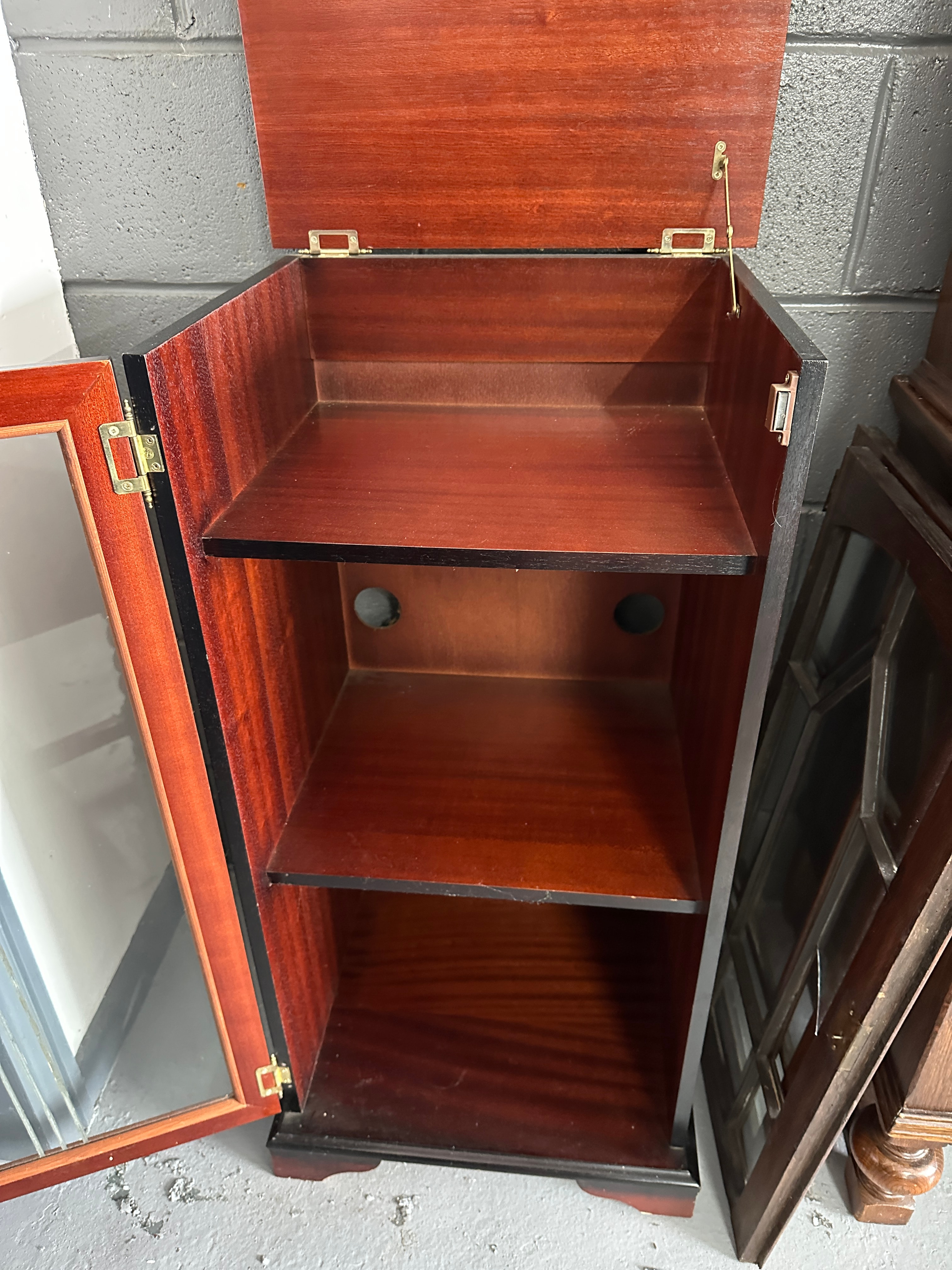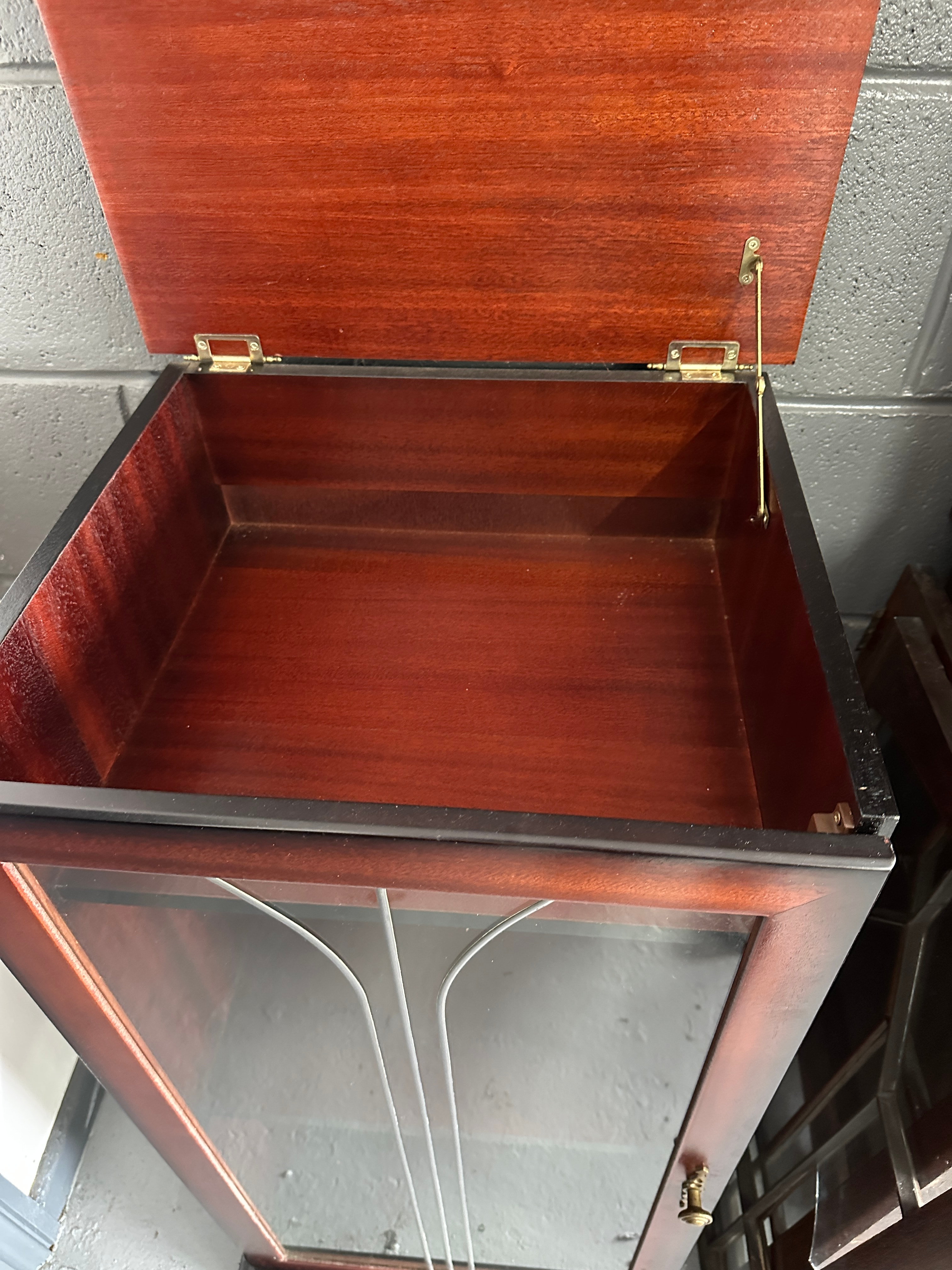 A mahogany glazed lift-top music cabinet, featuring a reddish-brown finish. The lift-top lid is supported by brass-toned hardware, revealing an upper storage compartment. Below, a glass-fronted door, secured with a brass-toned keyhole escutcheon and pull, conceals two internal wooden shelves. The glass is decorated with three arching white-colored strips. The middle shelf incorporates two circular cut-outs at the rear, likely for cable access or ventilation. The cabinet stands on a subtle plinth base.