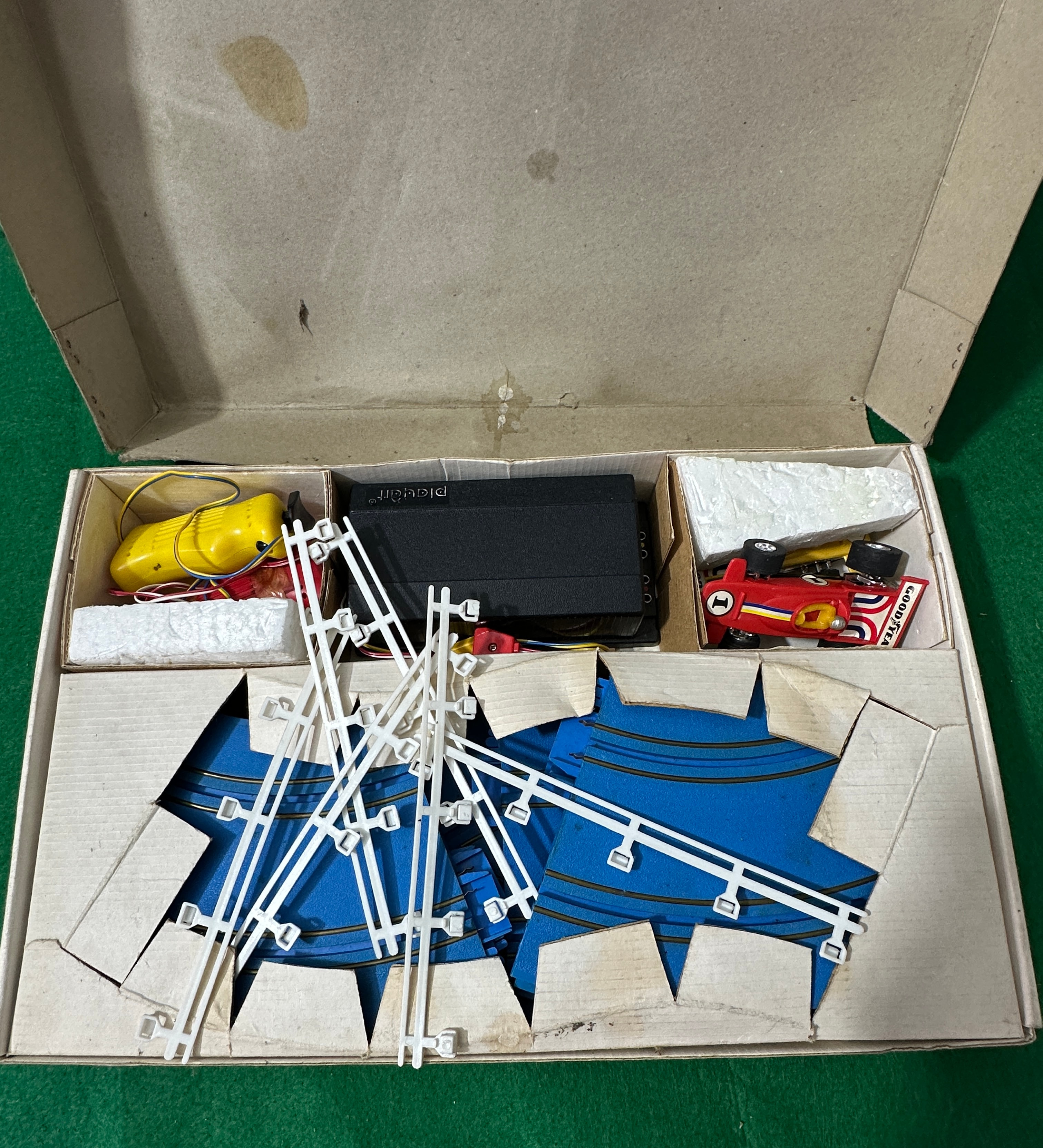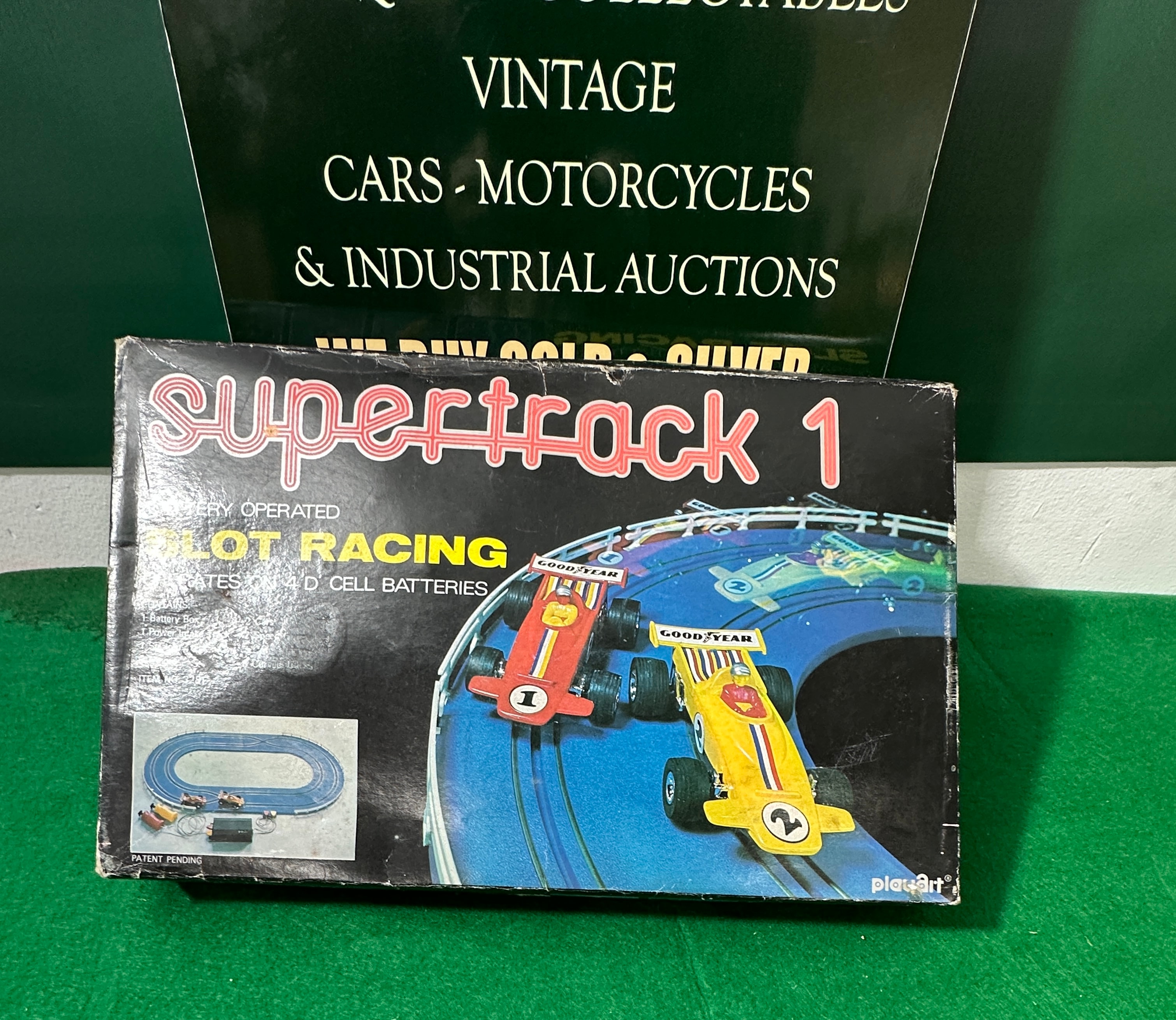 A vintage Playart Supertrack 1 slot car racing set. This battery-operated set, likely dating from the mid-to-late 20th century, includes plastic track sections, two plastic slot cars (numbered 1 and 2, featuring ‘GOOD YEAR’ logos), a yellow battery pack/controller, a black controller, and white plastic barriers/supports. The set operates on ‘D’ cell batteries.