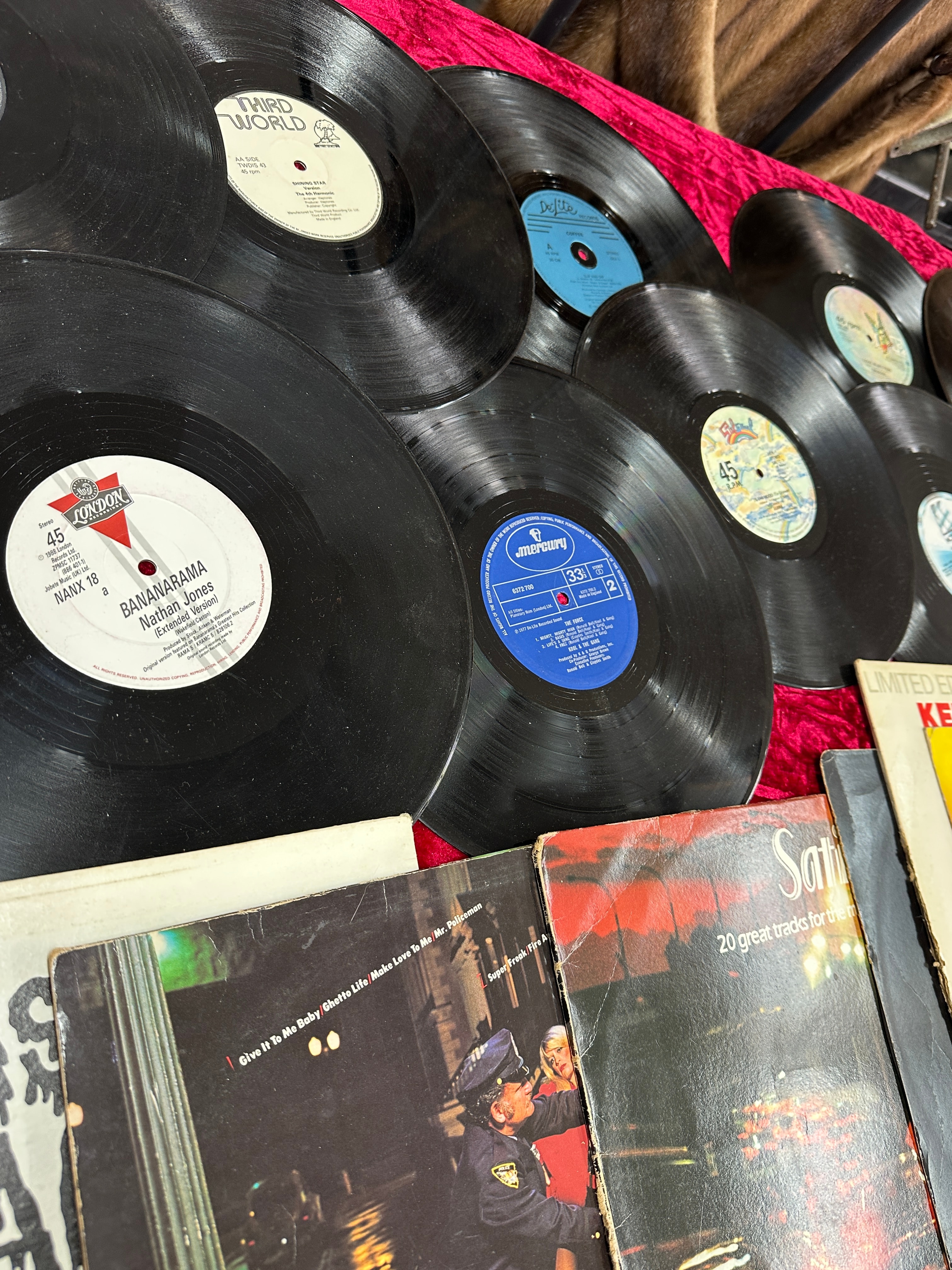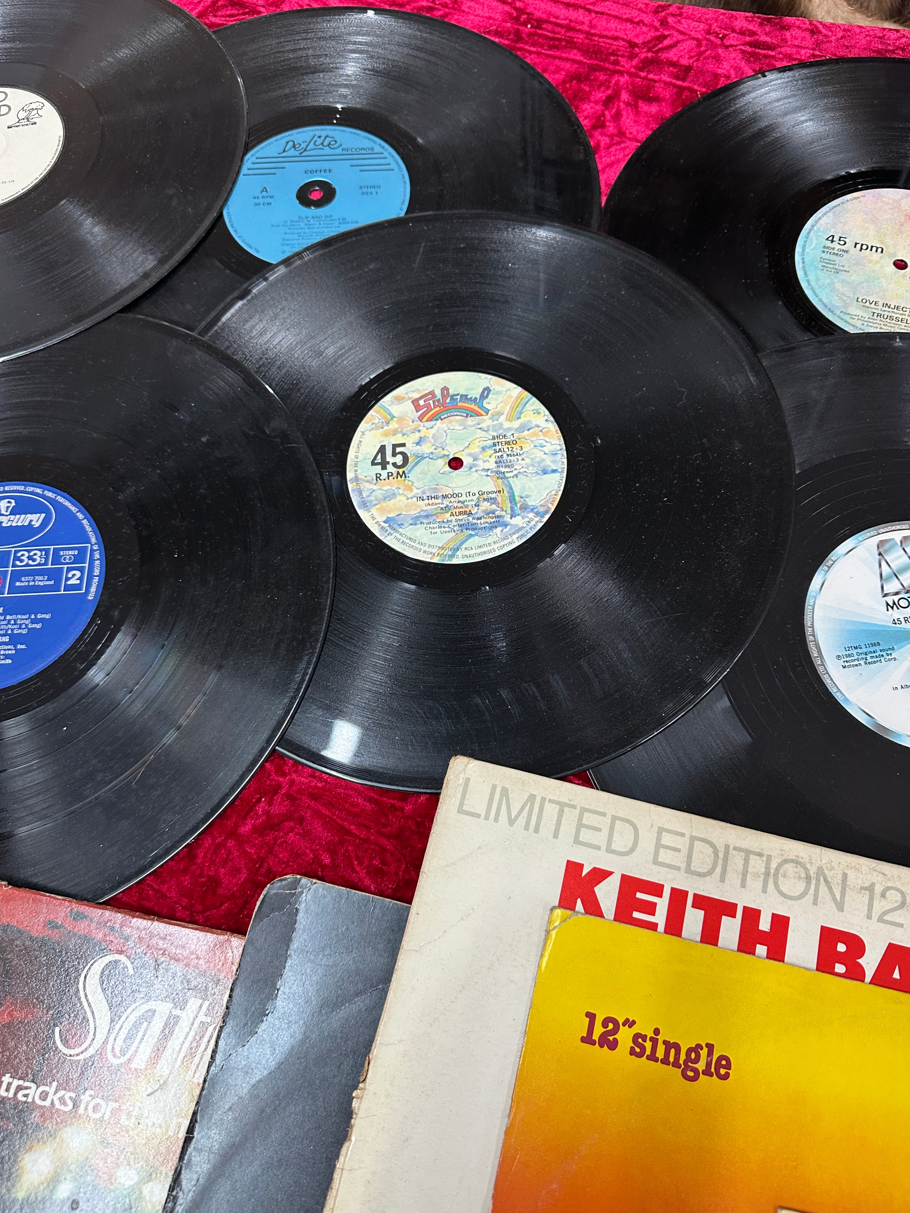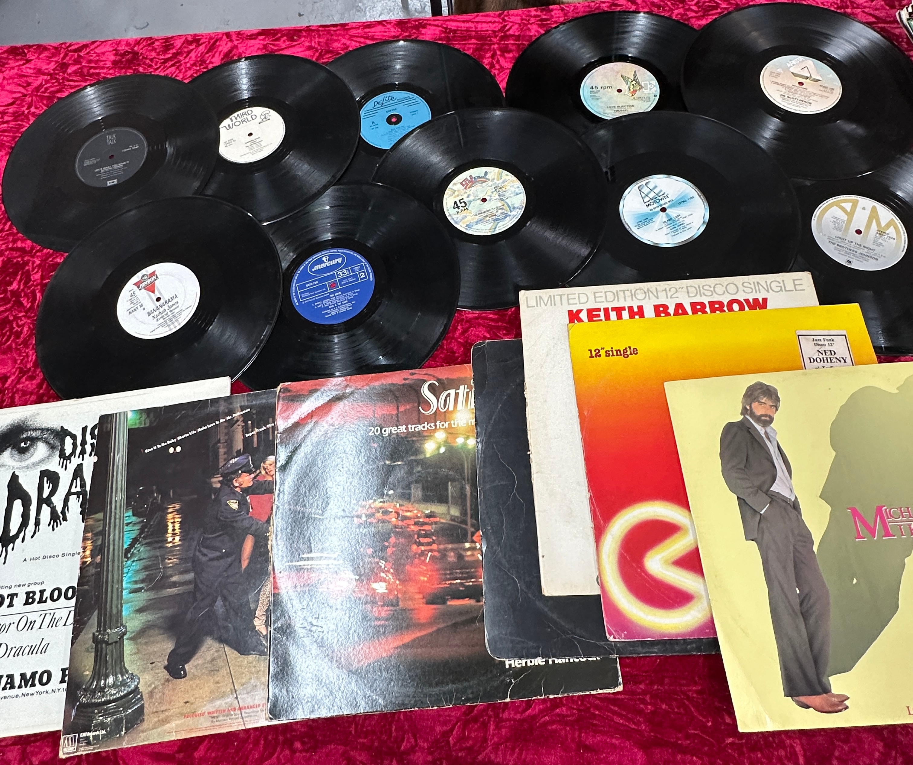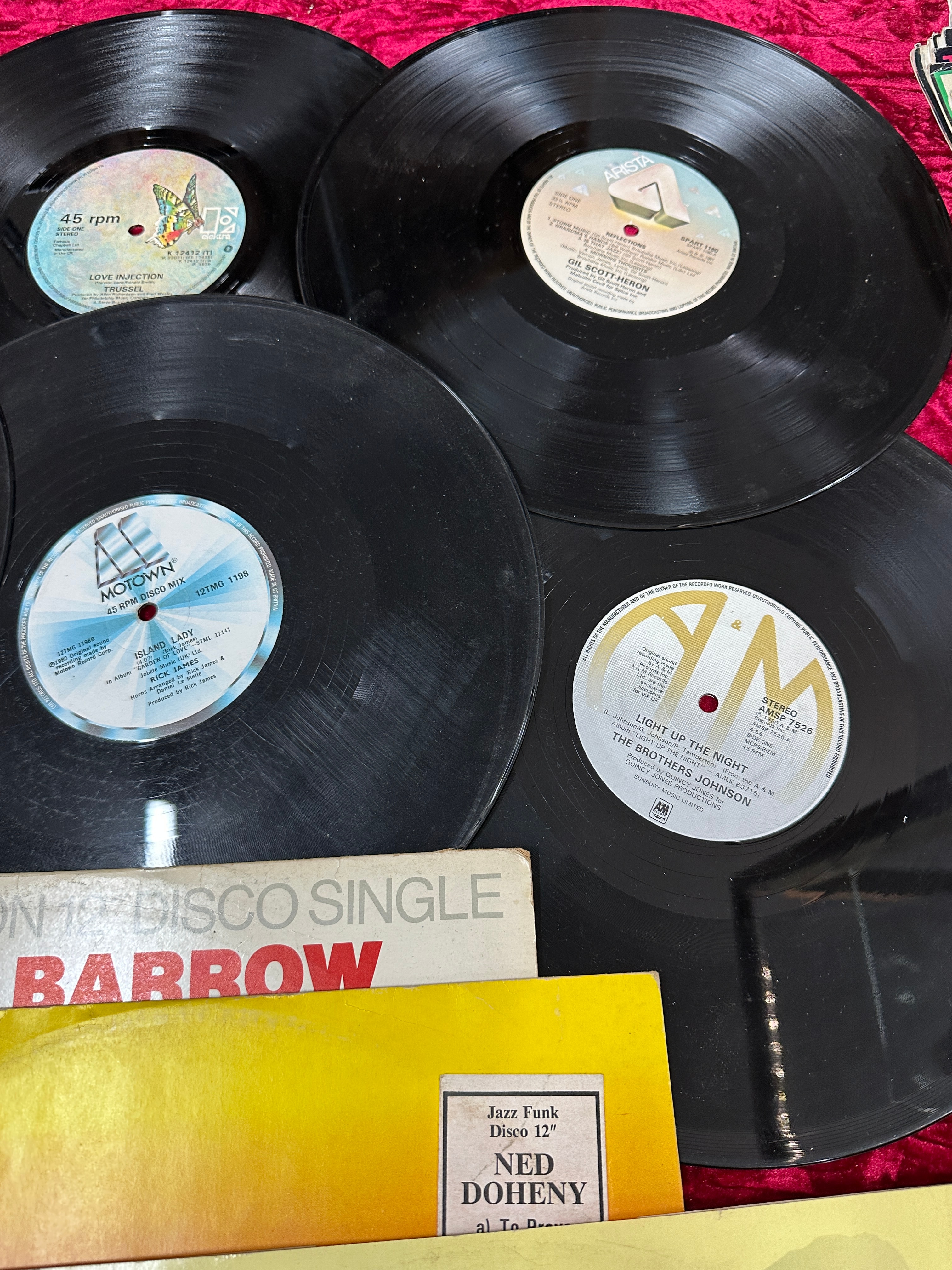 A collection of approximately 25-30 black vinyl records, primarily 12-inch singles, with some LPs and potentially a few 7-inch singles, accompanied by their original paper or cardboard sleeves. The collection largely represents disco, funk, and soul genres, with a prominent inclusion of the *Saturday Night Fever* soundtrack, identified by multiple web intelligence sources (Pickwick SPC3817/SPC 3617). Visible labels include Motown, Arista, London, Mercury, Island, Third World, Salsoul, and A&M. Specific artists identified within the collection include Bananarama, Keith Barrow, Gil Scott-Heron, The Brothers Johnson, and Ned Doheny. Markings on the records indicate both “45 rpm” and “33 1/3 rpm” playback speeds, and several sleeves explicitly state “LIMITED EDITION 12″ DISCO SINGLE” or “12” single.” The collection primarily dates from the 1970s and 1980s.