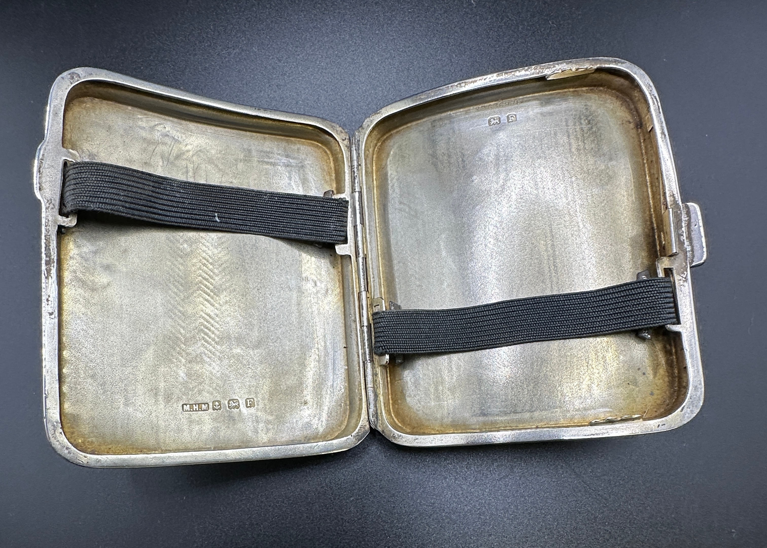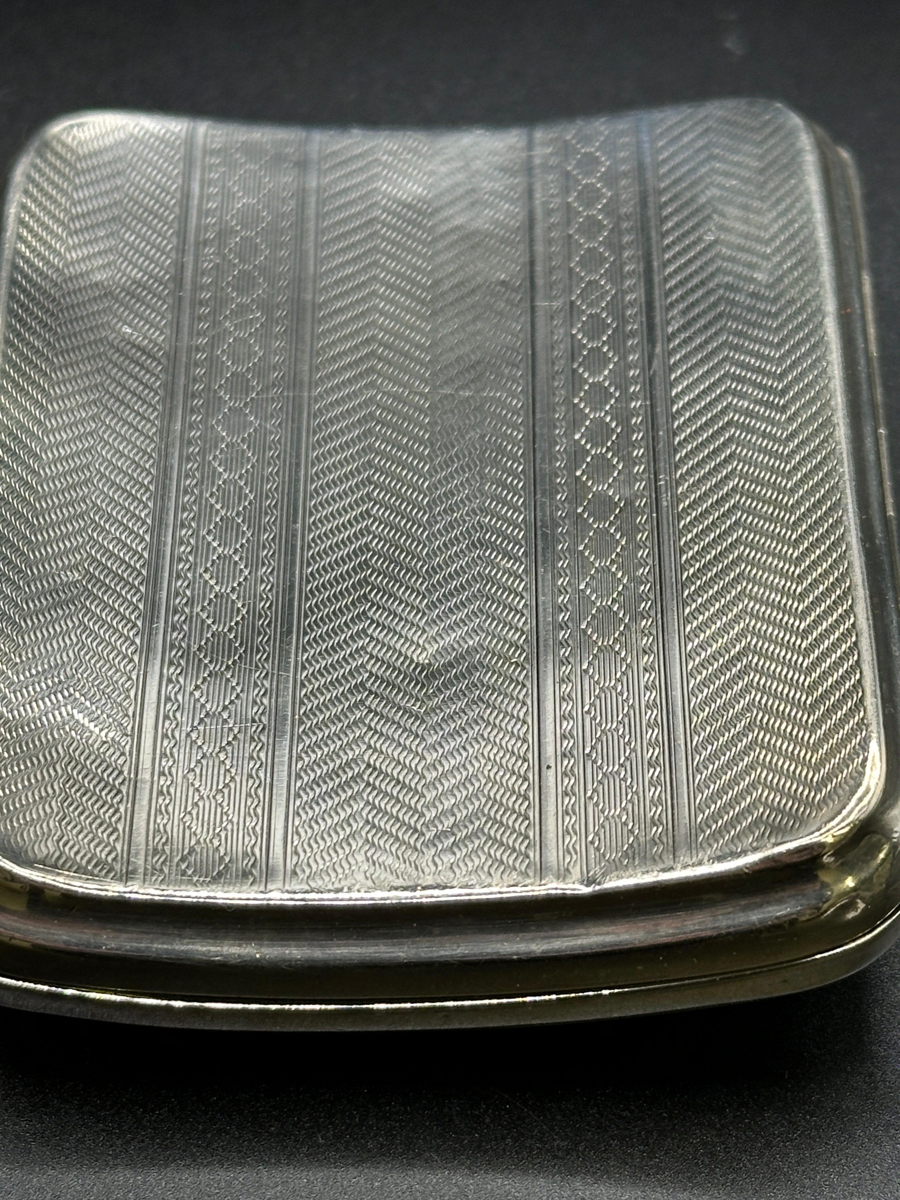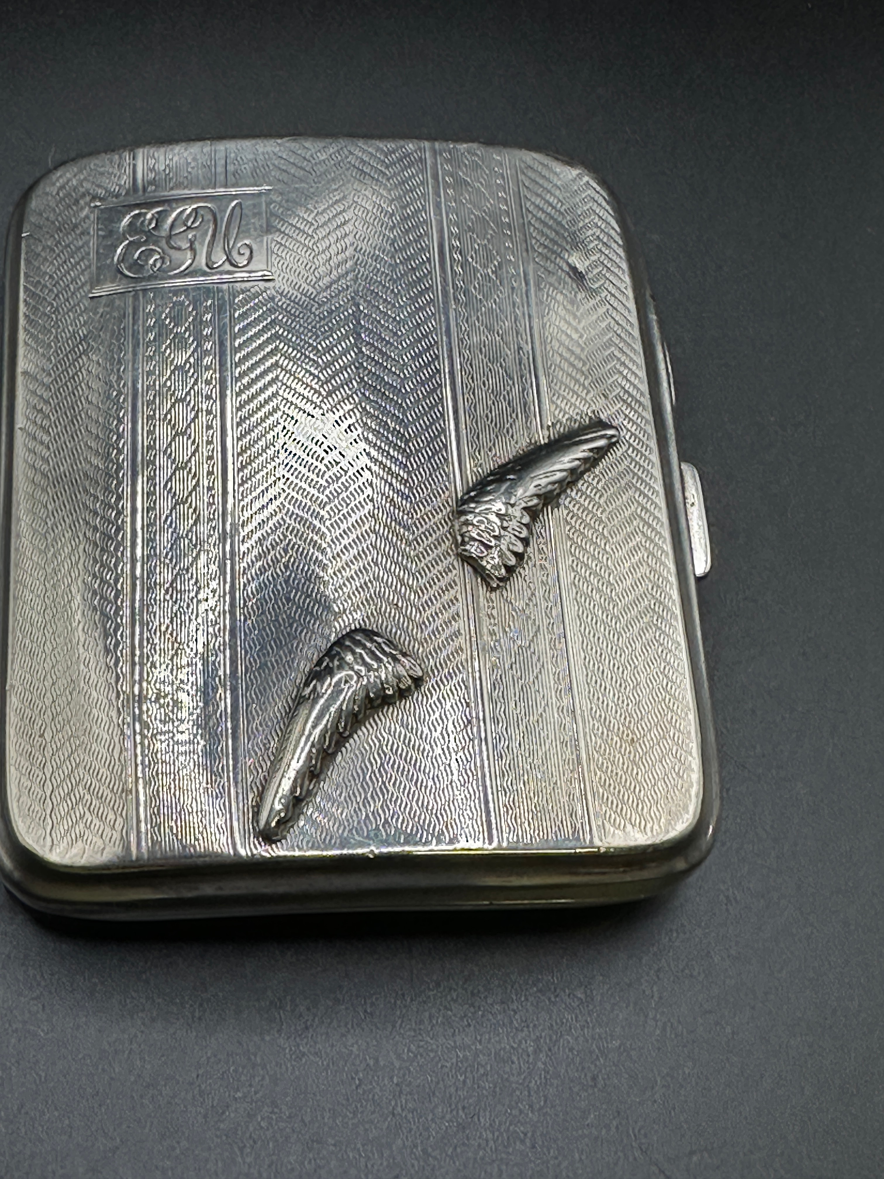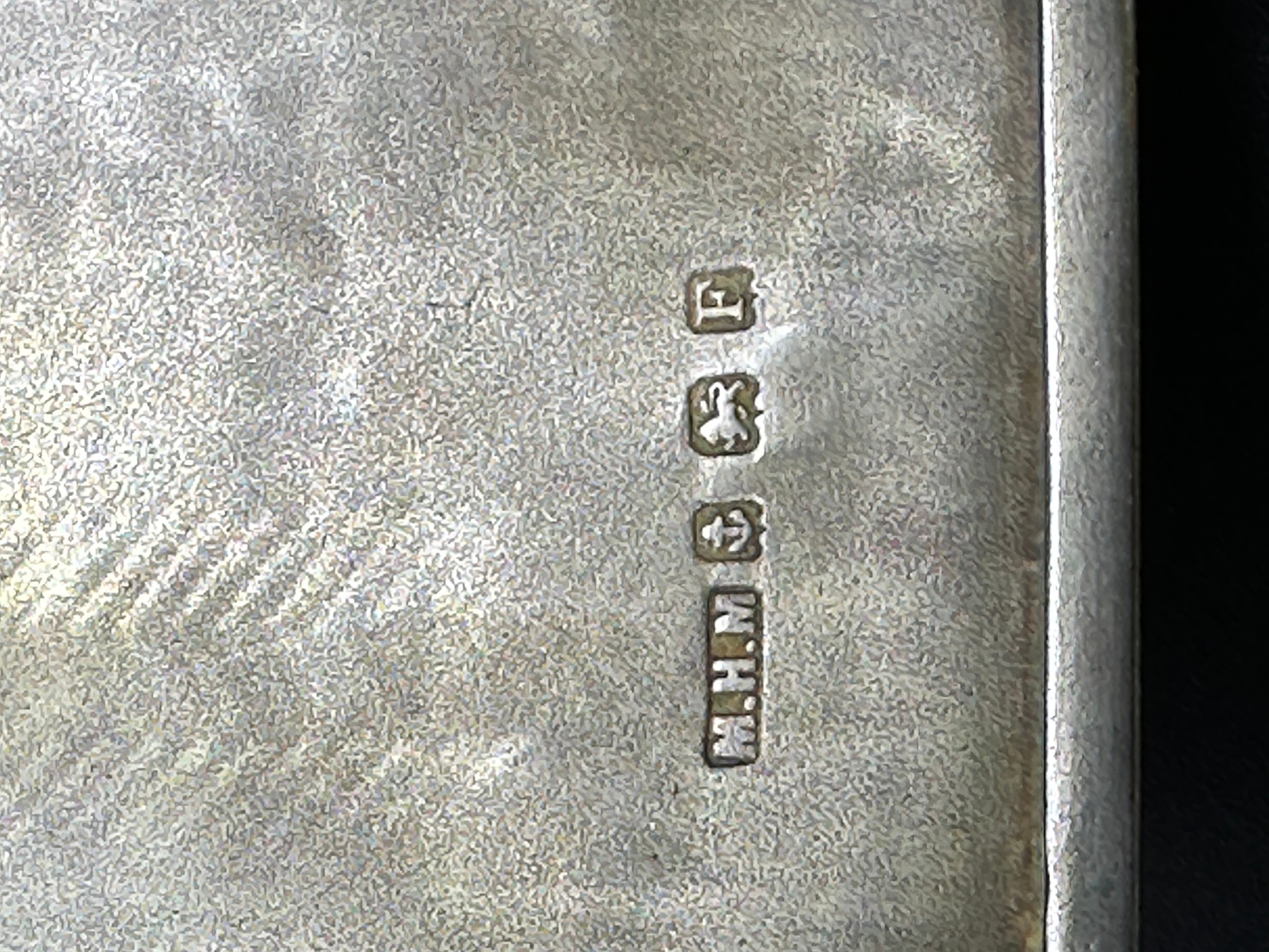A George V sterling silver engine-turned cigarette or card case, crafted by M.H.M in Birmingham in 1930. This silver-toned, rectangular hinged case features rounded corners and a side clasp. Its exterior is decoratively engine-turned with alternating vertical bands of chevron and linear patterns, further embellished with two stylized wing appliqués and an engraved “EM” monogram. Hallmarks on the exterior clearly show the maker’s mark “M.H.M”, a lion passant indicating sterling silver, an anchor for the Birmingham Assay Office, and a capital ‘F’ within a square punch, corresponding to the year 1930. The interior features two black elastic straps and additional partial hallmarks including the lion passant and anchor, though a different date letter ‘B’ or ‘R’ is visible on one side, alongside a faint six-digit number.