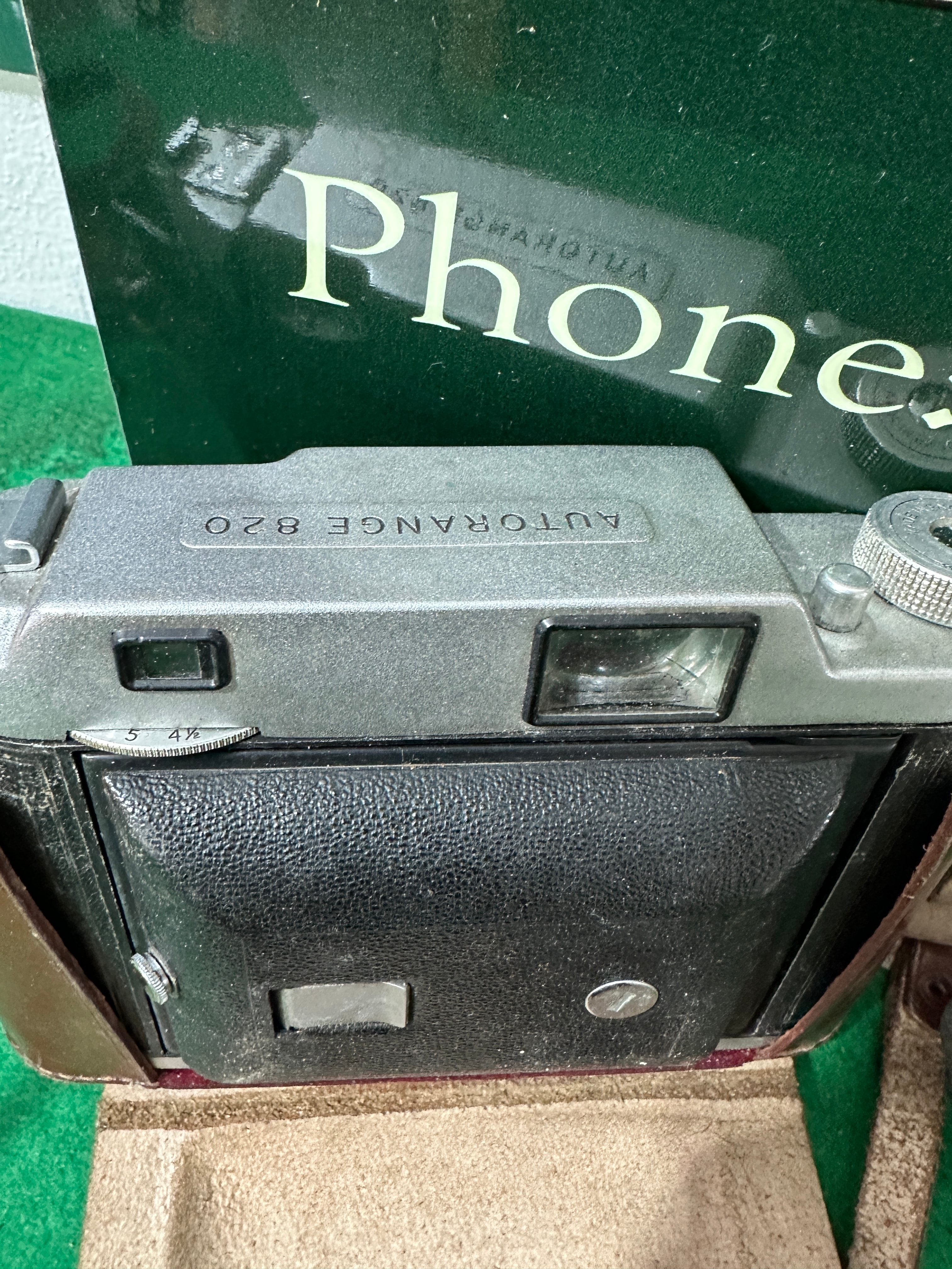 A Kodak Tourist Camera, an Asahi Pentax K1000 SLR, and a Zeiss Ikon Camera Case