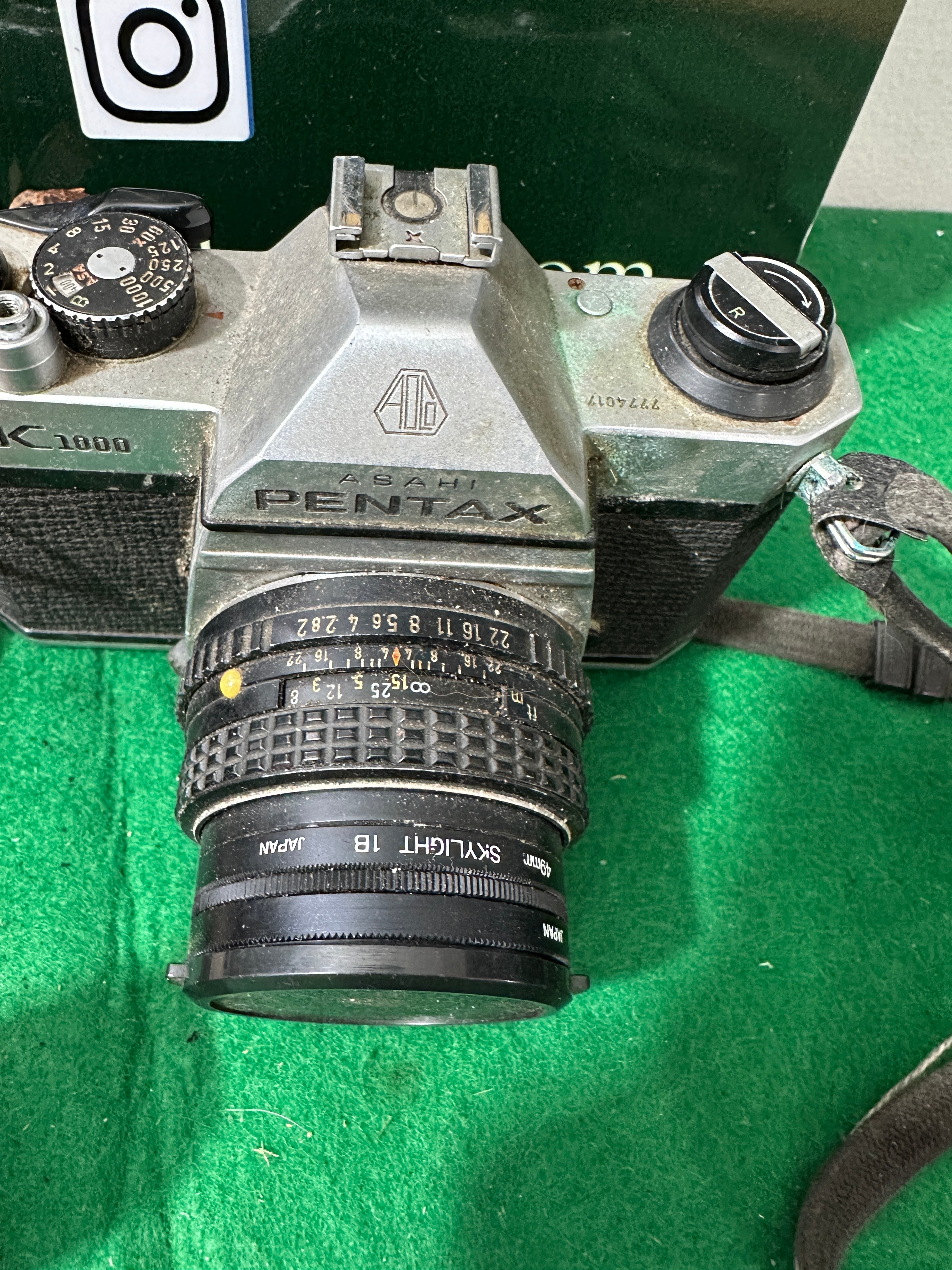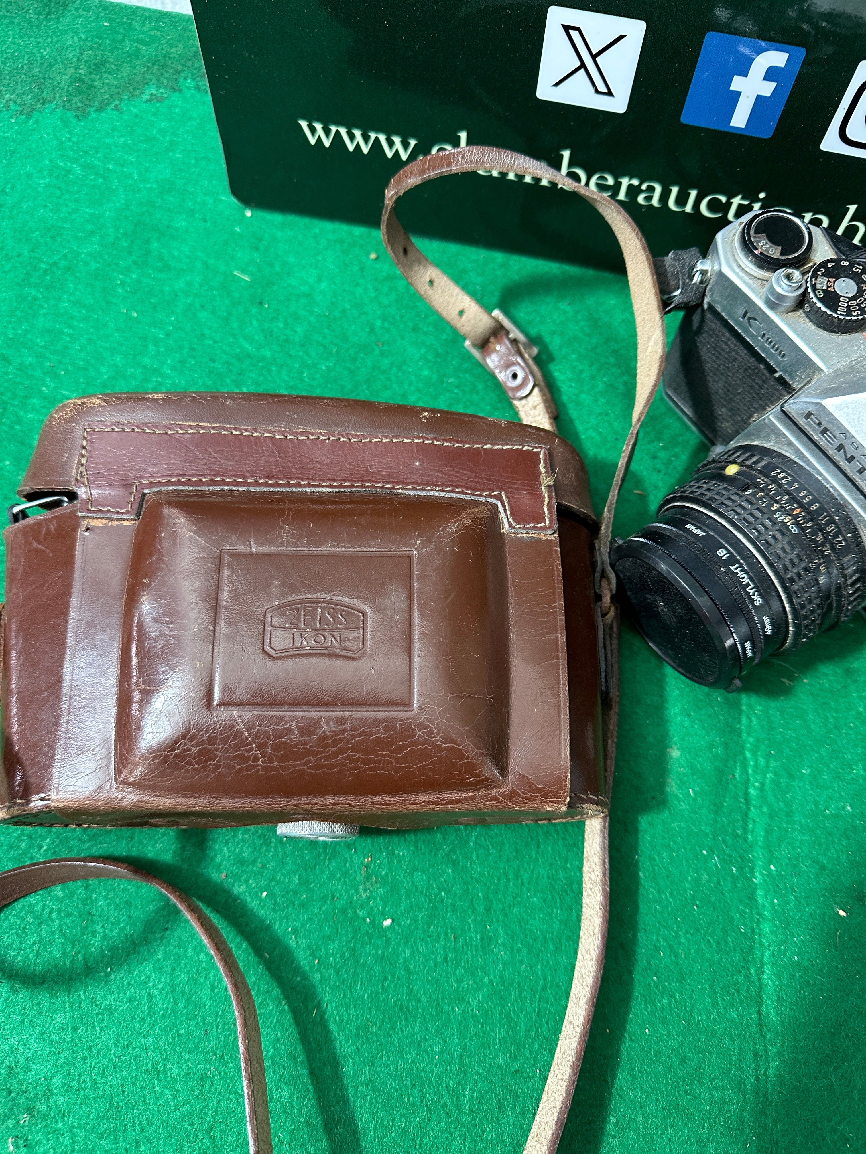Lot 85: A Kodak Tourist Camera, an Asahi Pentax K1000 SLR, and a Zeiss Ikon Camera Case