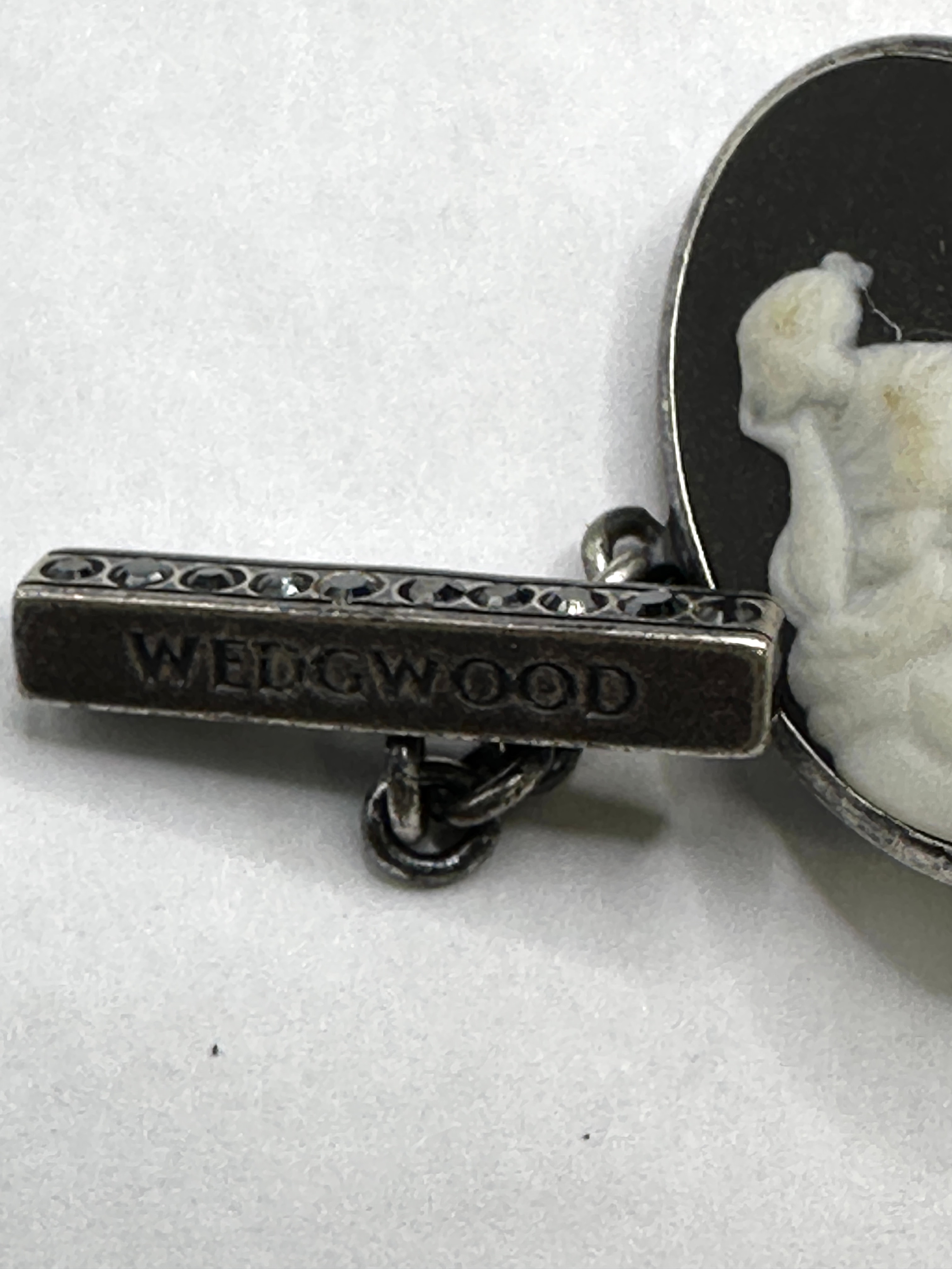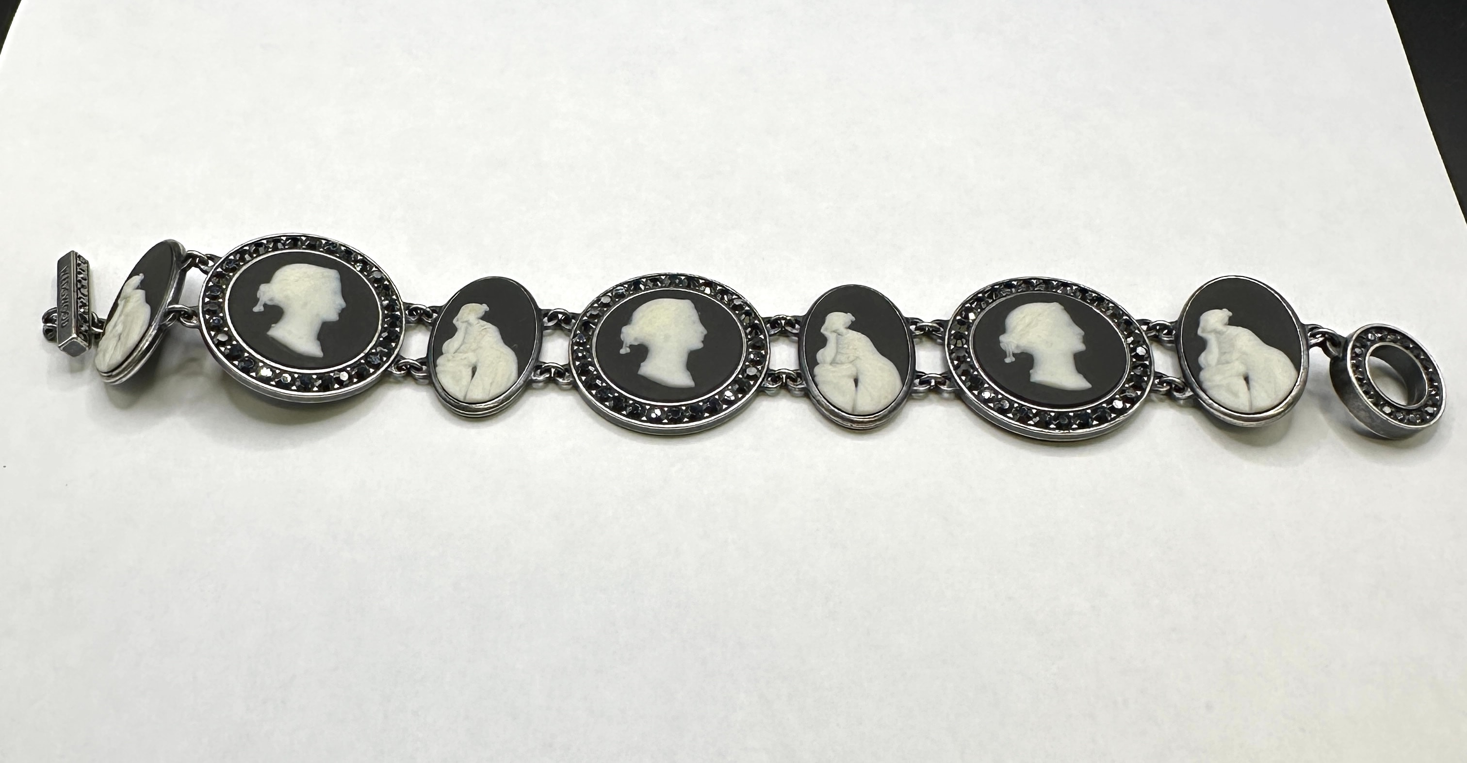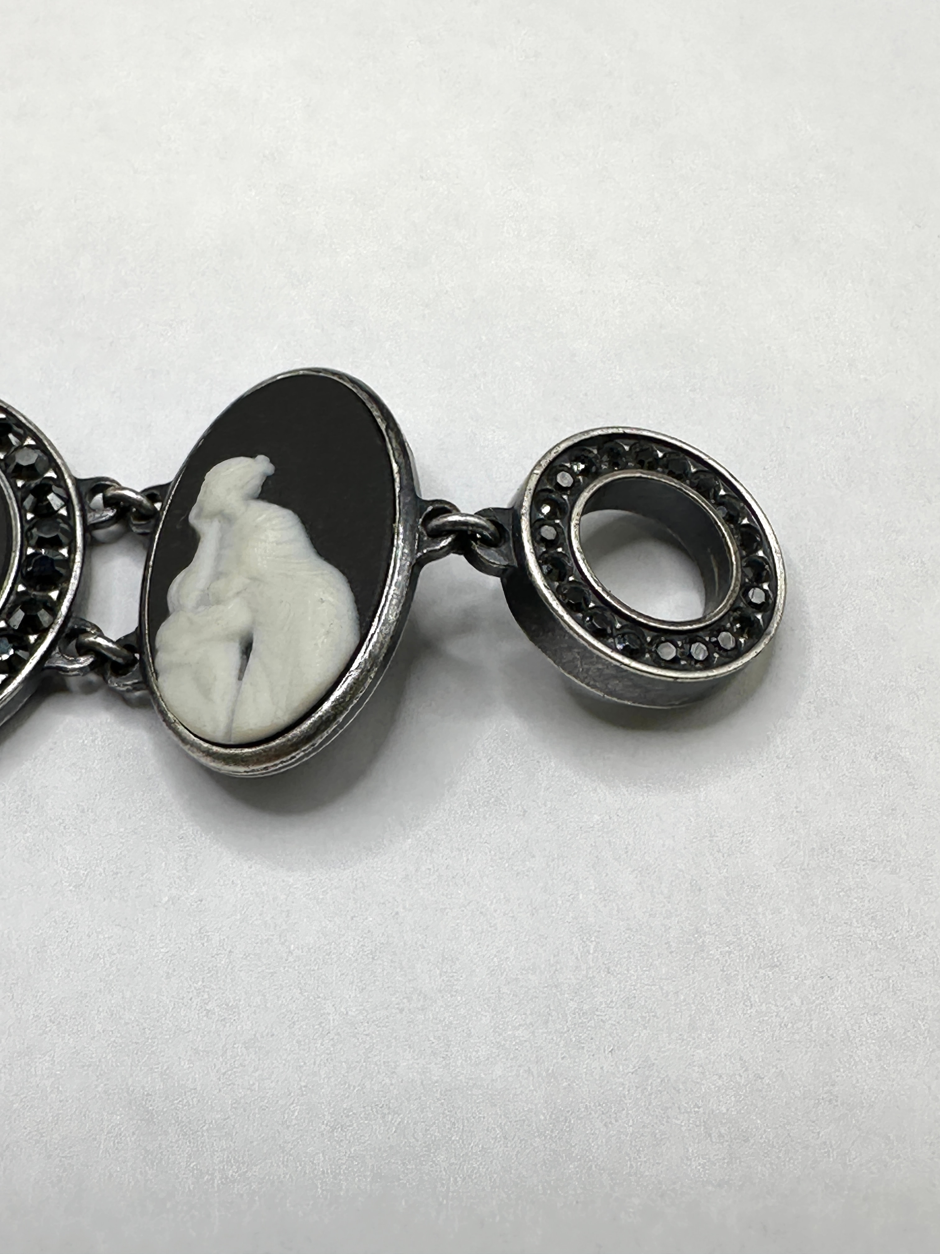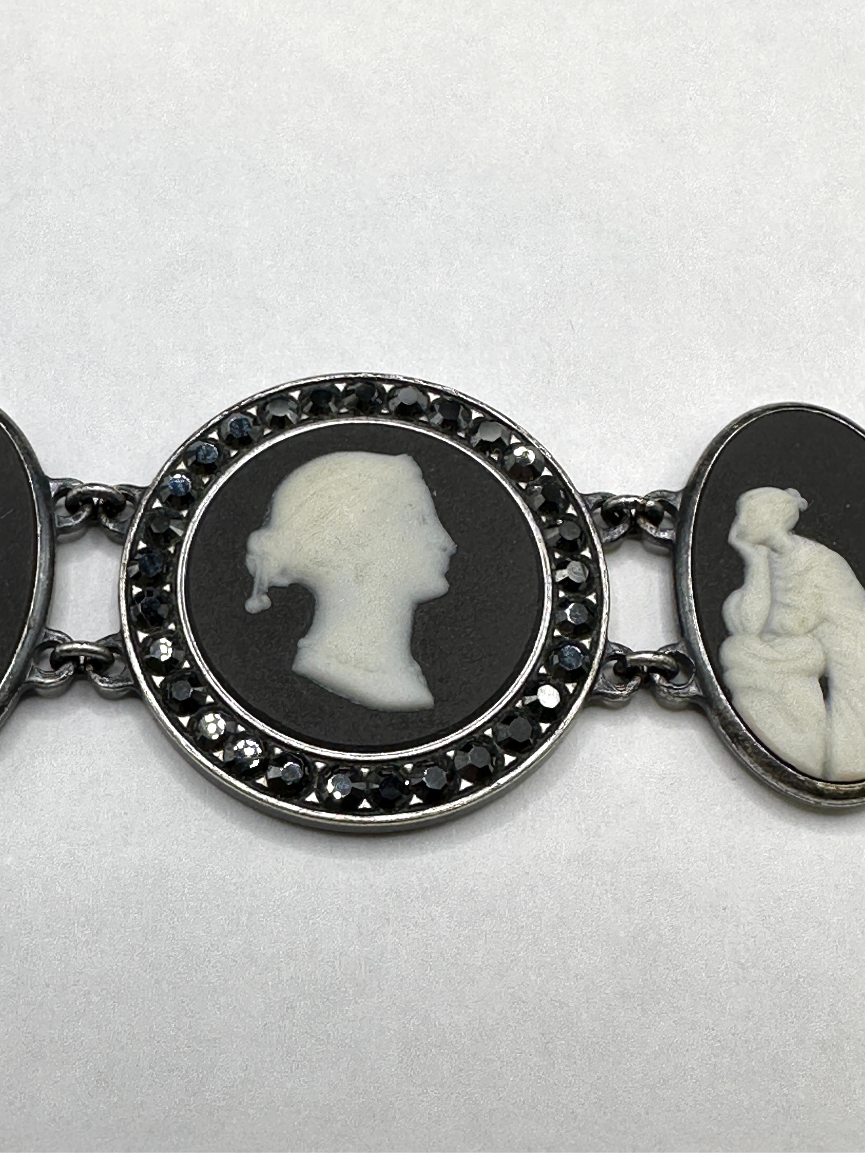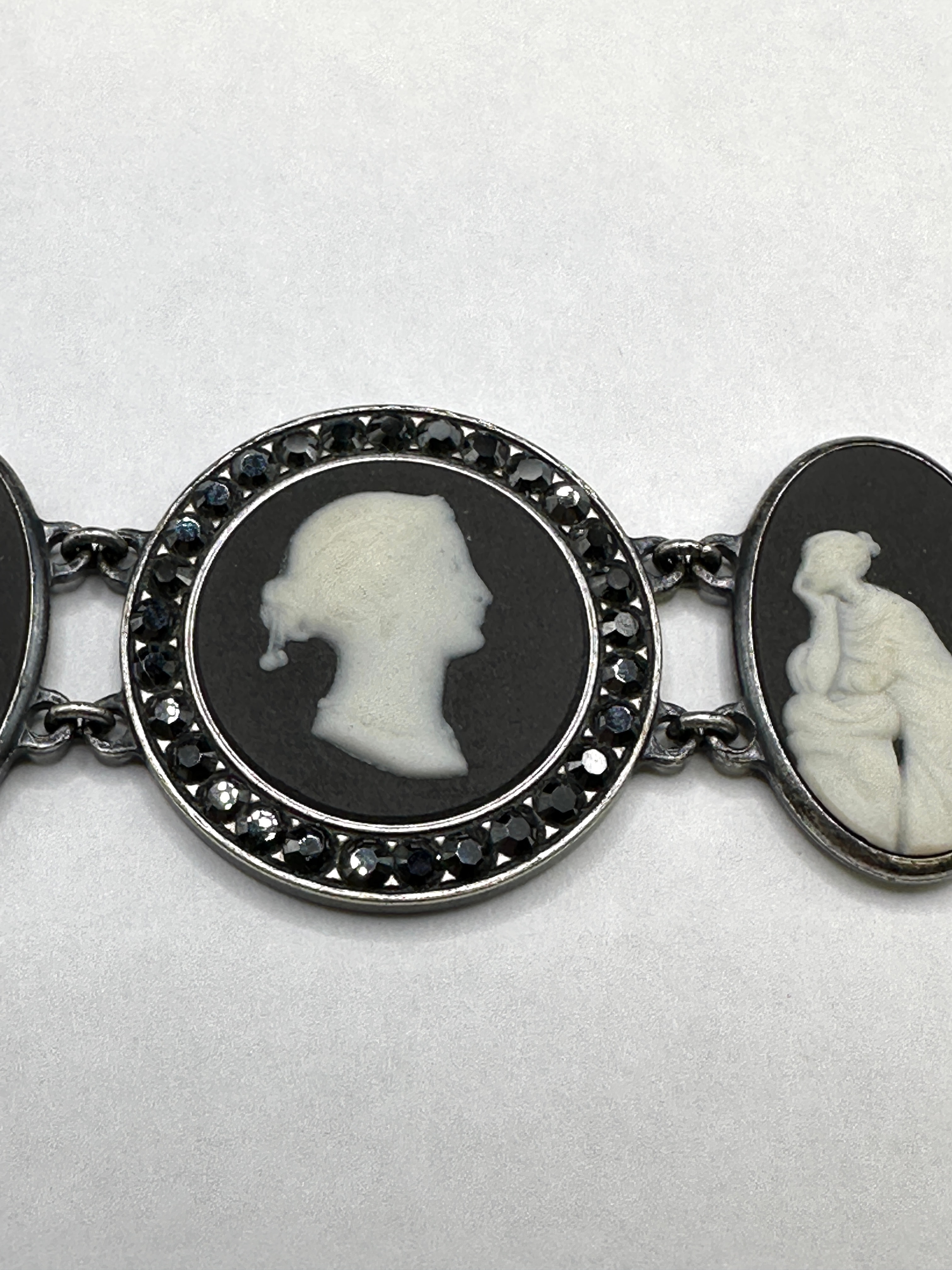 A vintage Wedgwood Muse black and white cameo bracelet, composed of seven linked segments. The central five segments feature white relief classical figures on a black ground, set within a silver-toned bezel; two circular plaques depict female profiles, while three oval plaques show full-figure reclining or seated female forms. The circular plaques and the terminal open ring segment are encircled by small, faceted dark stones. The bracelet fastens with a bar-shaped toggle clasp, which is visibly embossed with “WEDGWOOD” and also set with small dark stones.