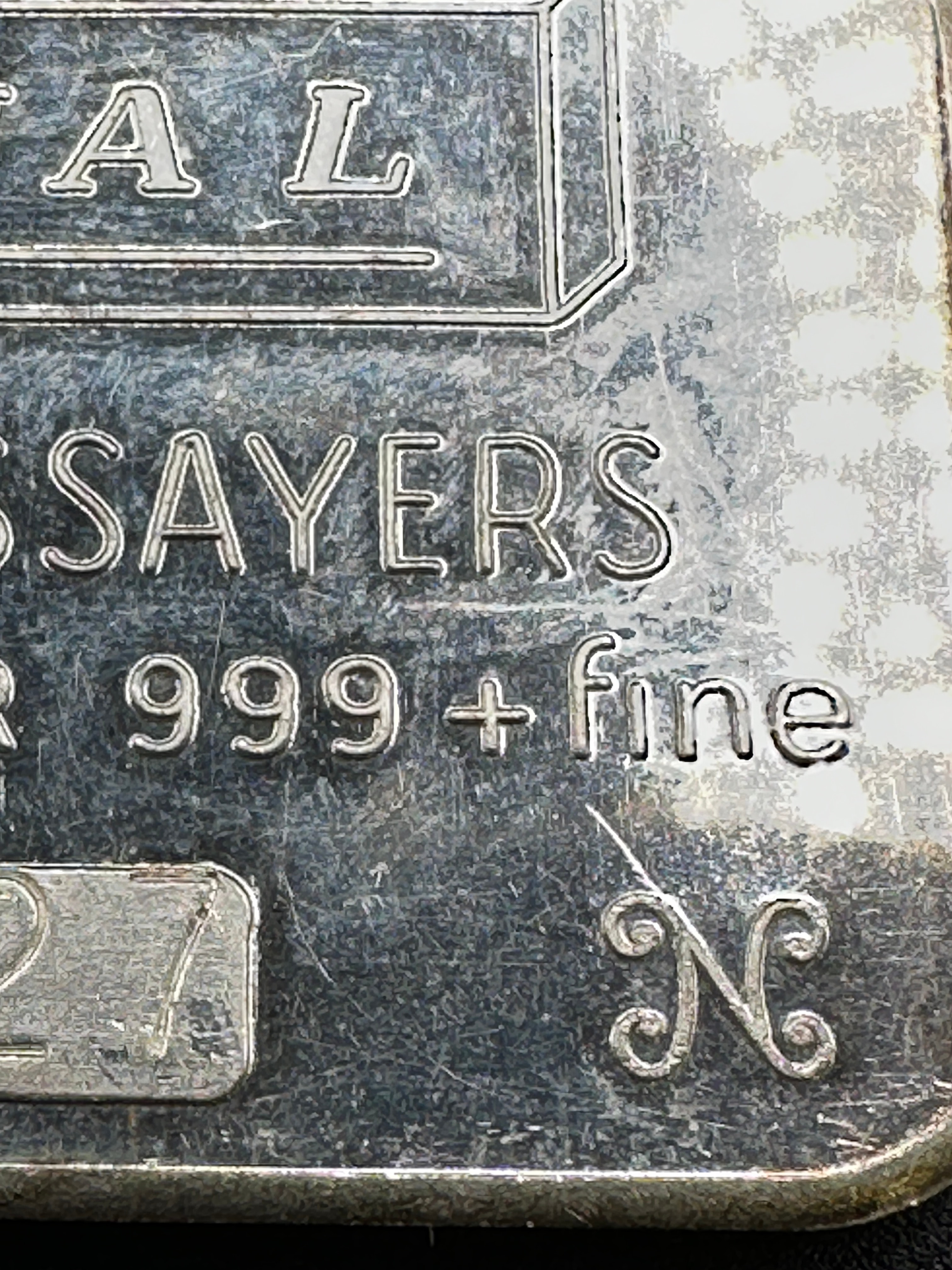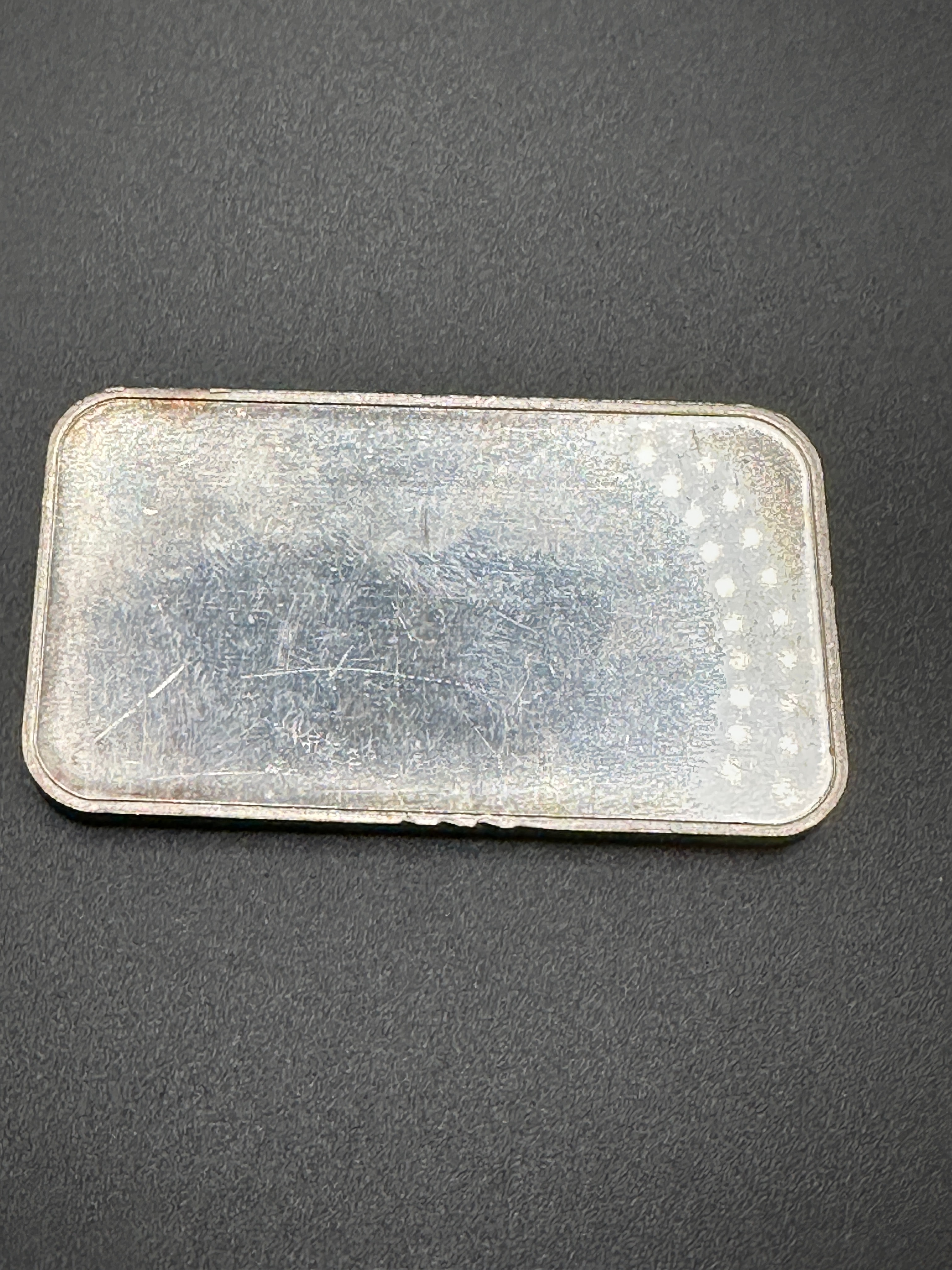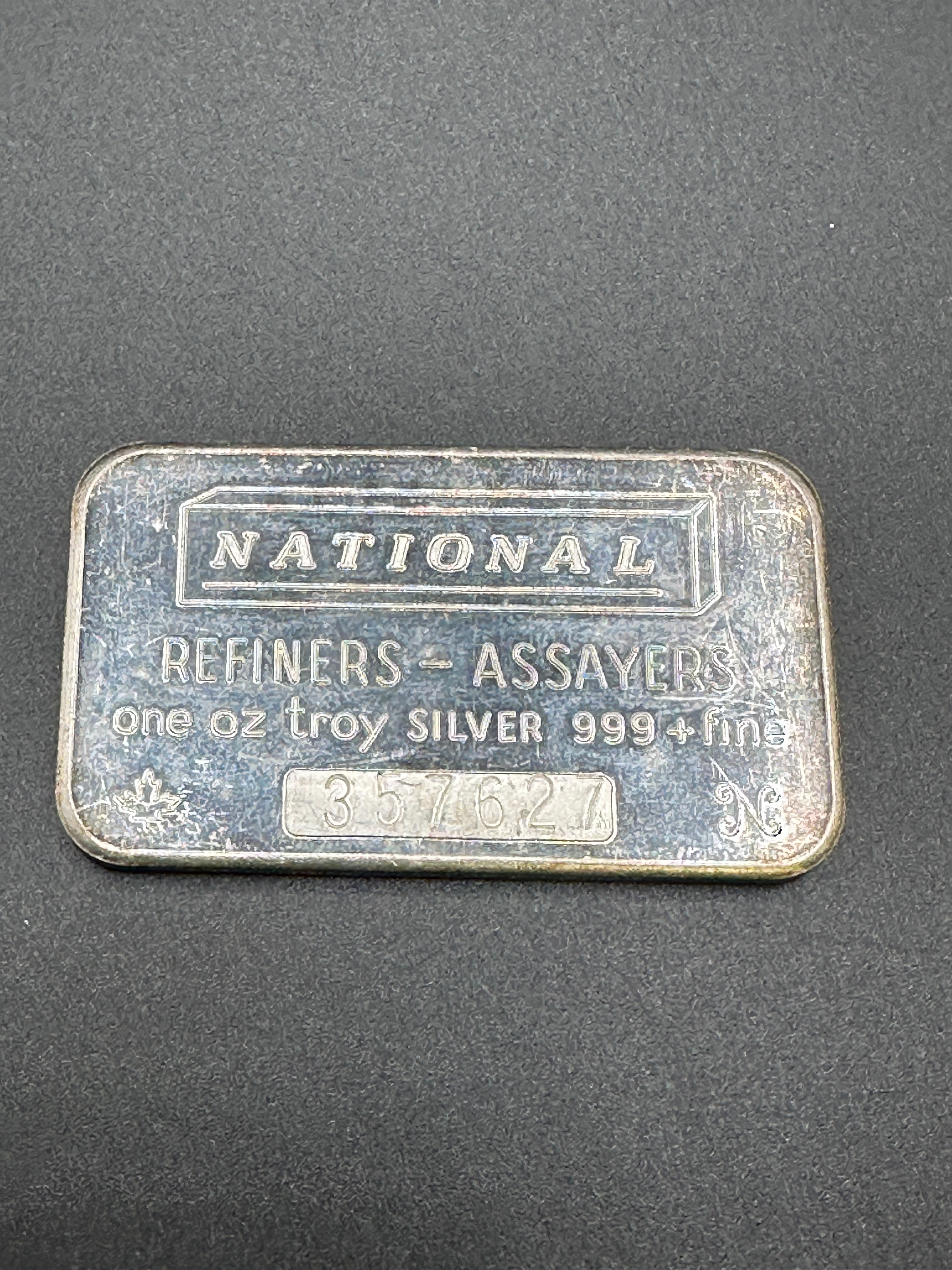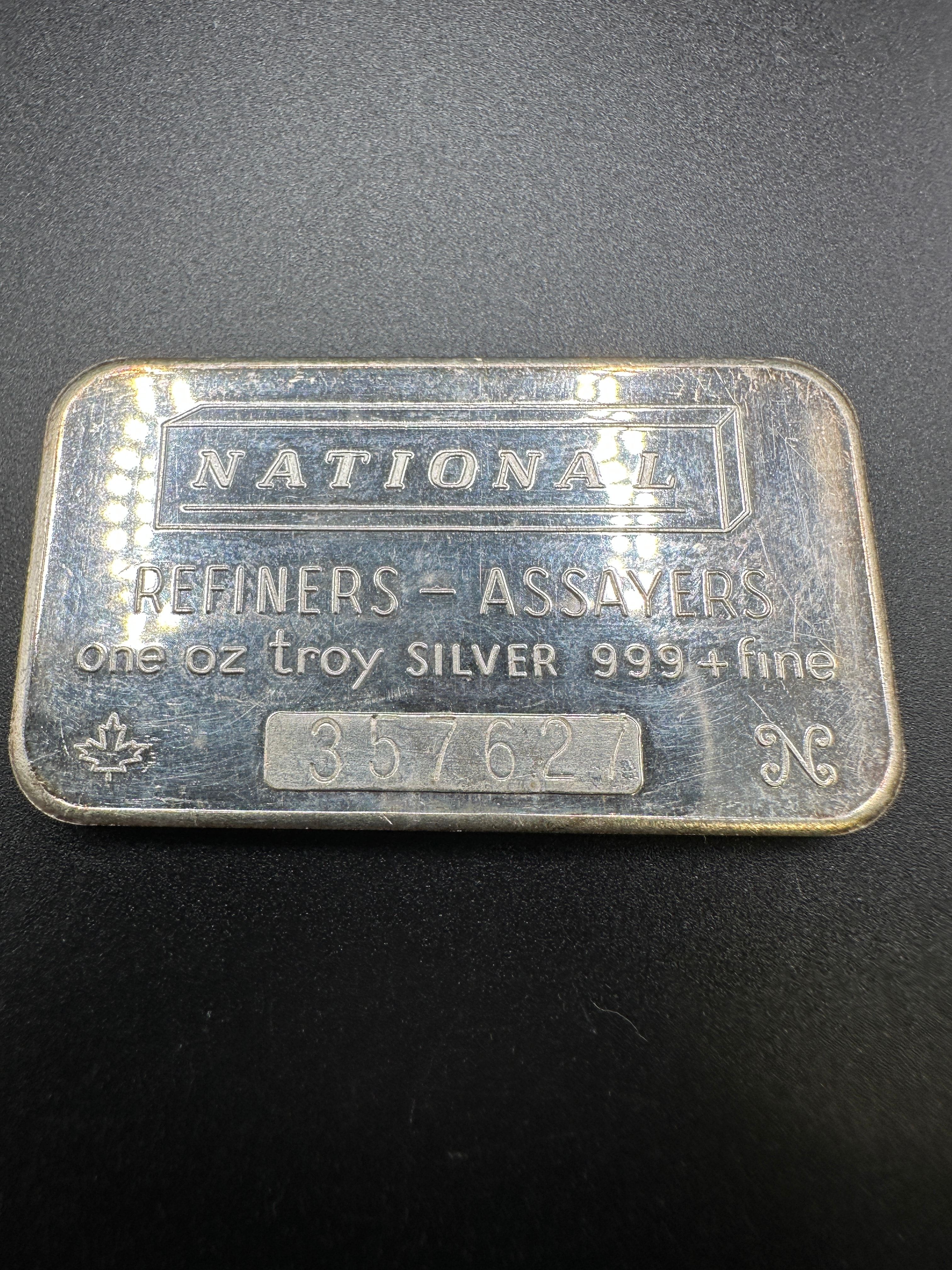 A National Refiners – Assayers 1 oz .999+ Fine Silver Bar. This rectangular, utilitarian silver bullion bar is marked with the inscription “NATIONAL REFINERS – ASSAYERS” and specifies “one oz troy SILVER 999+ fine”. It features the serial number “357627” prominently, flanked by a Canadian maple leaf symbol on the left and a stylized “N” logo on the right.