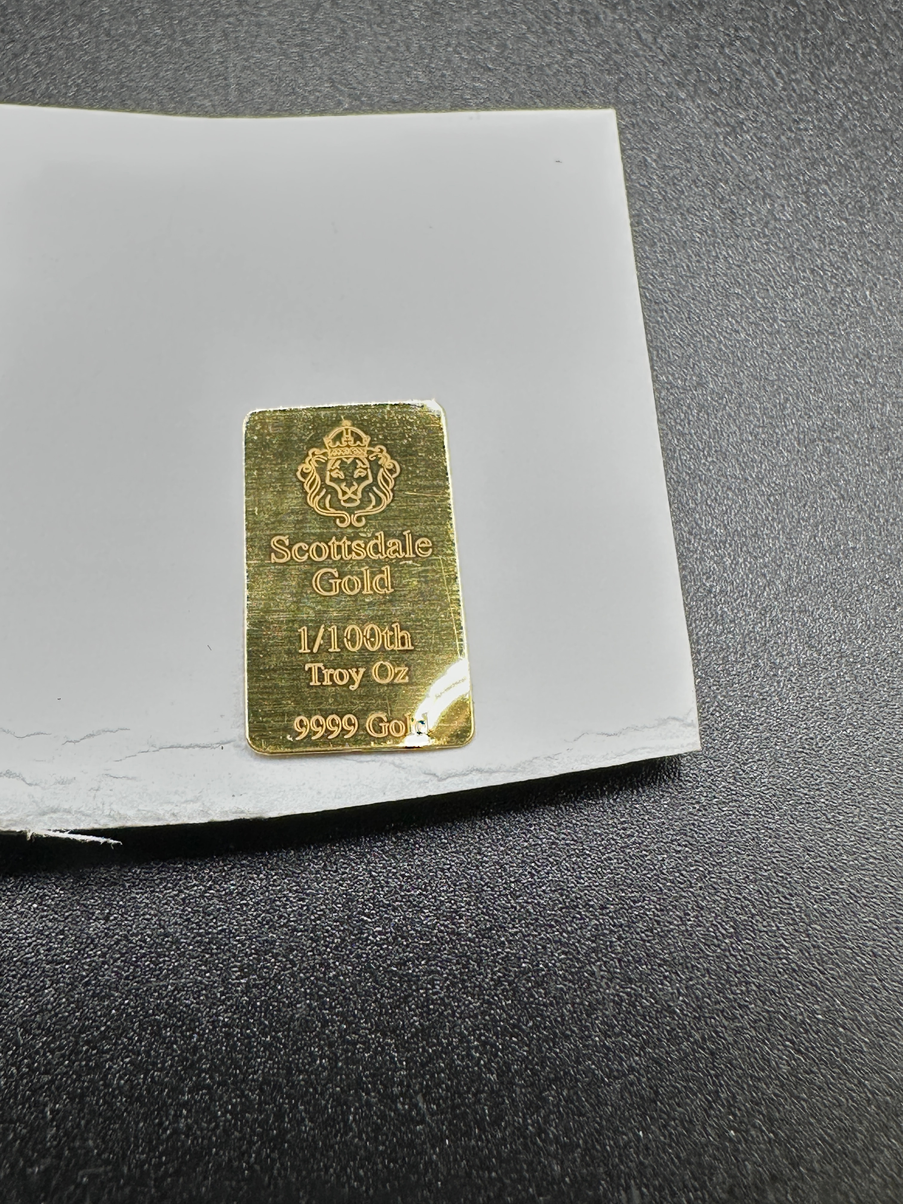 A Scottsdale Mint 1/100 oz .9999 Gold Bar. This small, rectangular gold bar or ingot displays a bright, reflective metallic luster. It features a prominent stamped design including a crowned lion’s head logo at the top, with “Scottsdale Gold” below, followed by “1/100th Troy Oz” indicating its weight, and “.9999 Gold” specifying its purity. The bar is secured within a white plastic or paper card. All visible text is in English.