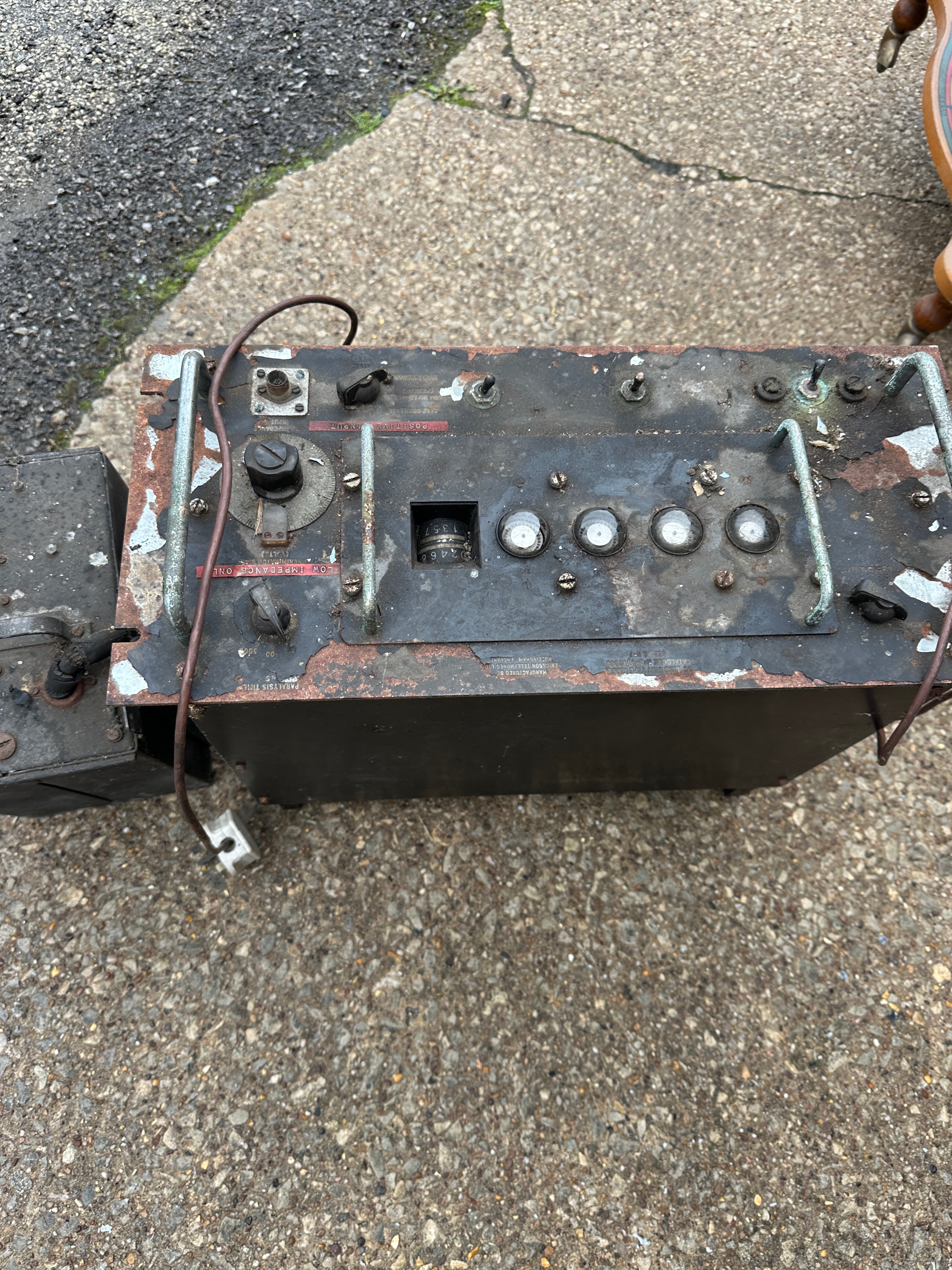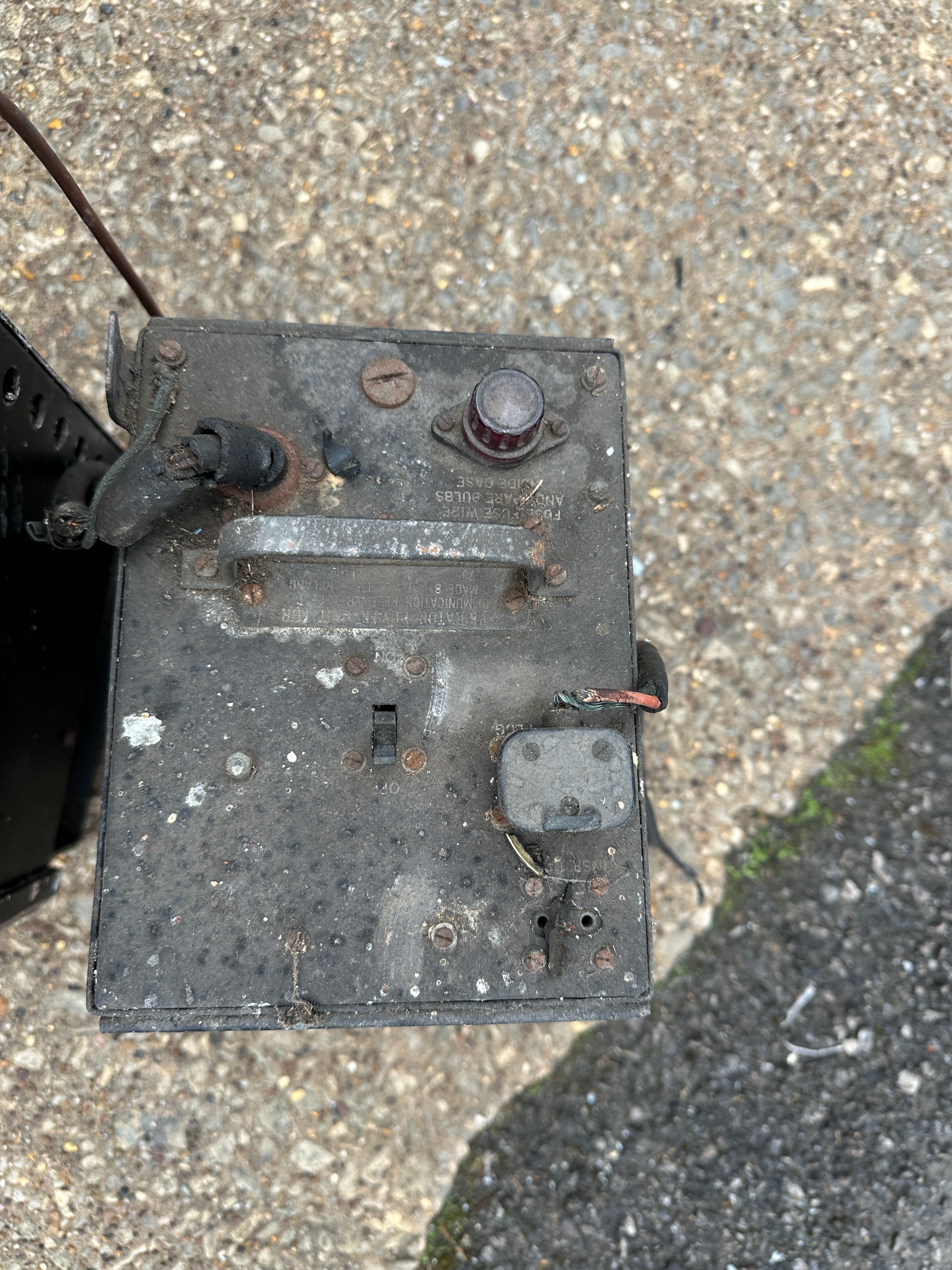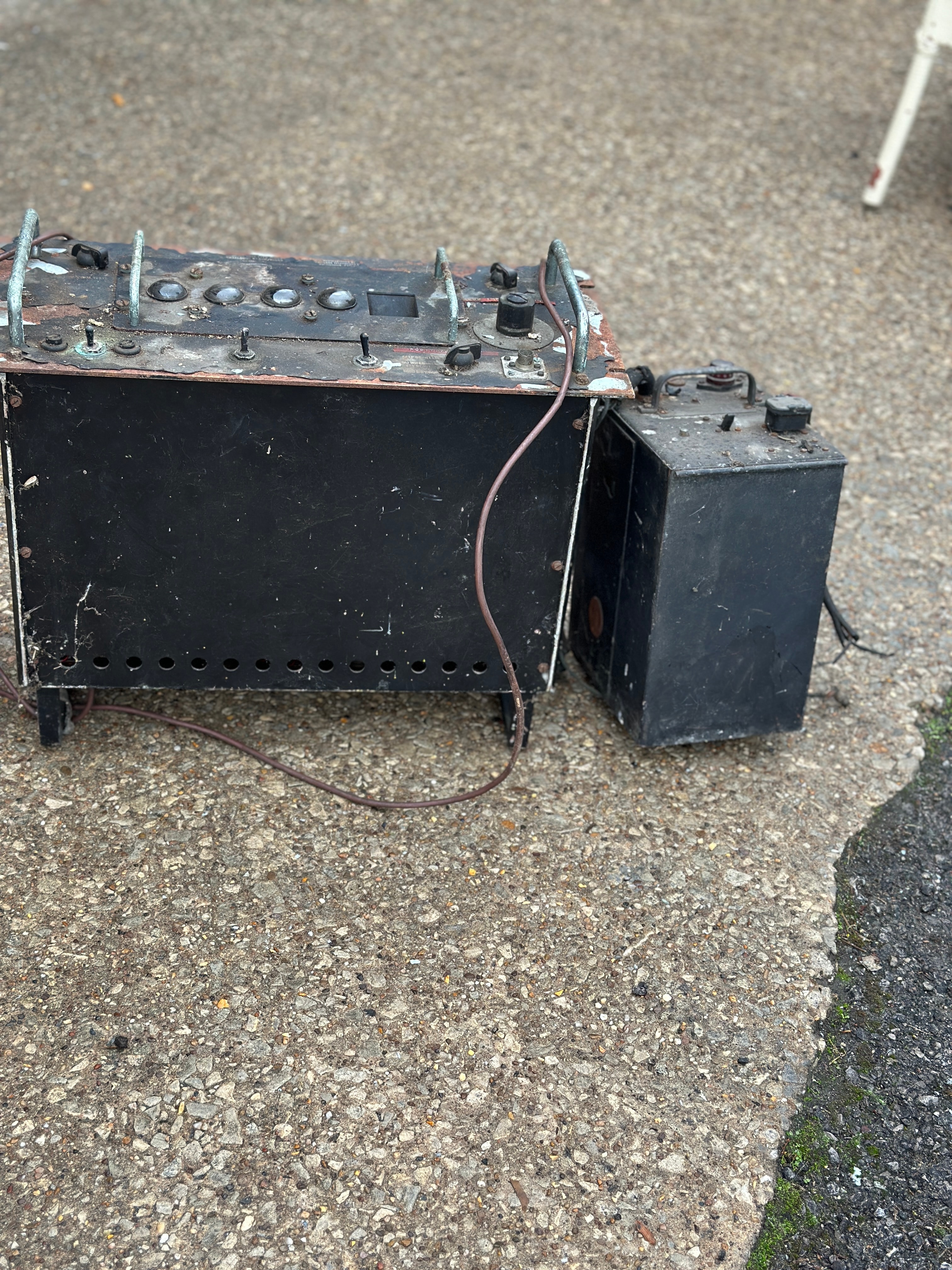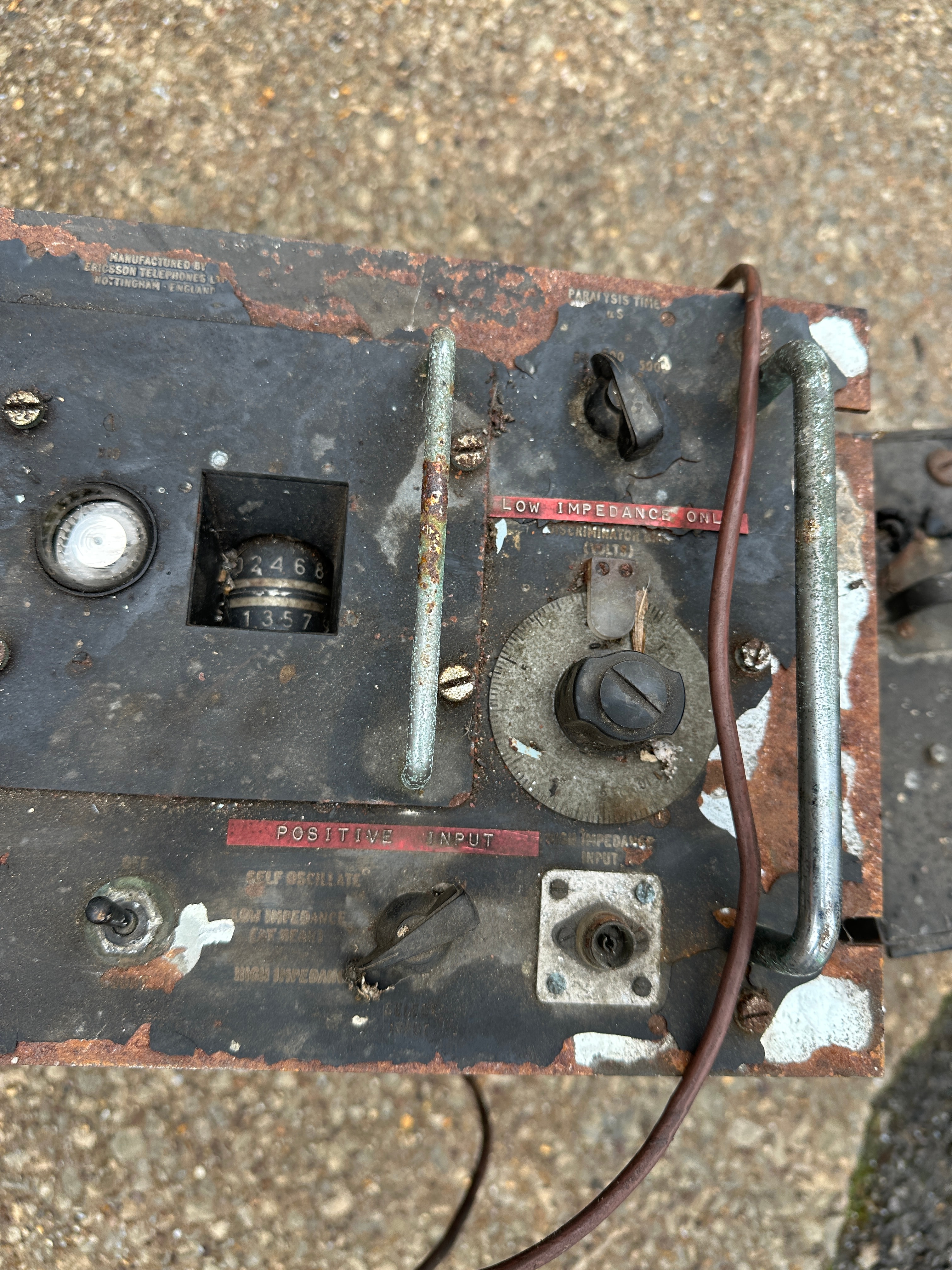 An electrical testing or communications device manufactured by ER. L. Benson Telephones L… Oceanfront England, likely dating to the mid-20th century. The unit comprises a main rectangular body with an attached smaller box, constructed primarily of black-painted metal. It features various bakelite knobs, switches, and connectors. Visible markings include “LOW IMPEDANCE ONE,” “POSITIVE INPUT,” “SELF OSCILLATE,” “OHM IMPEDANCE,” “EXT. REGULATOR,” “HIGH IMPEDANCE,” “FUSE WIRE,” “A/C OR D/C,” “BULBS,” “MAINS,” and a numeric display showing “02468” over “1357.”