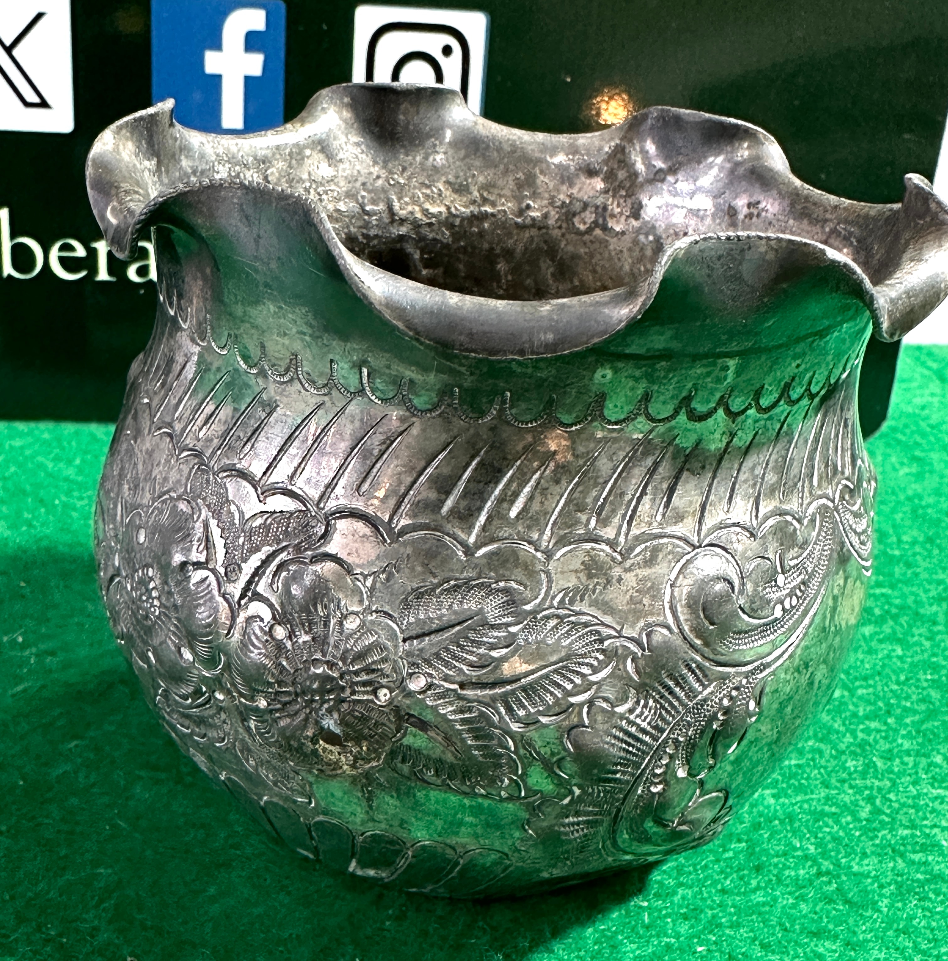 A small, round, footed silver-colored metal pot or bowl, featuring a deeply ruffled and scalloped rim. The body is highly ornate, adorned with deeply chased or embossed floral and foliate motifs covering the lower section, complemented by vertical fluting or reeding on the upper portion. Impressed markings on the base include Thai script “๒๕๖๖” (Buddhist Era 2566, translating to 2023 CE), beneath which are the Western numerals “1 2 2 3”.