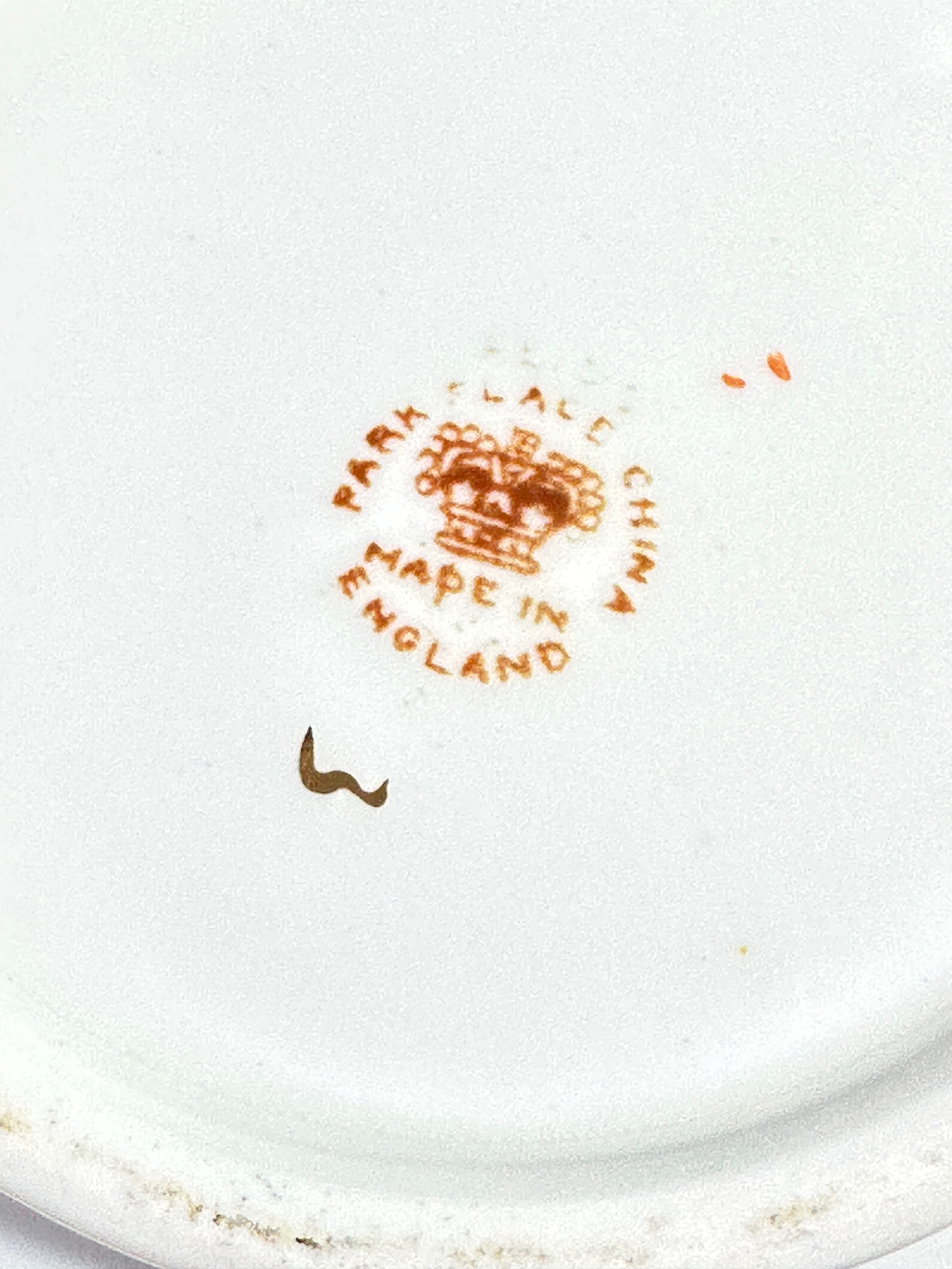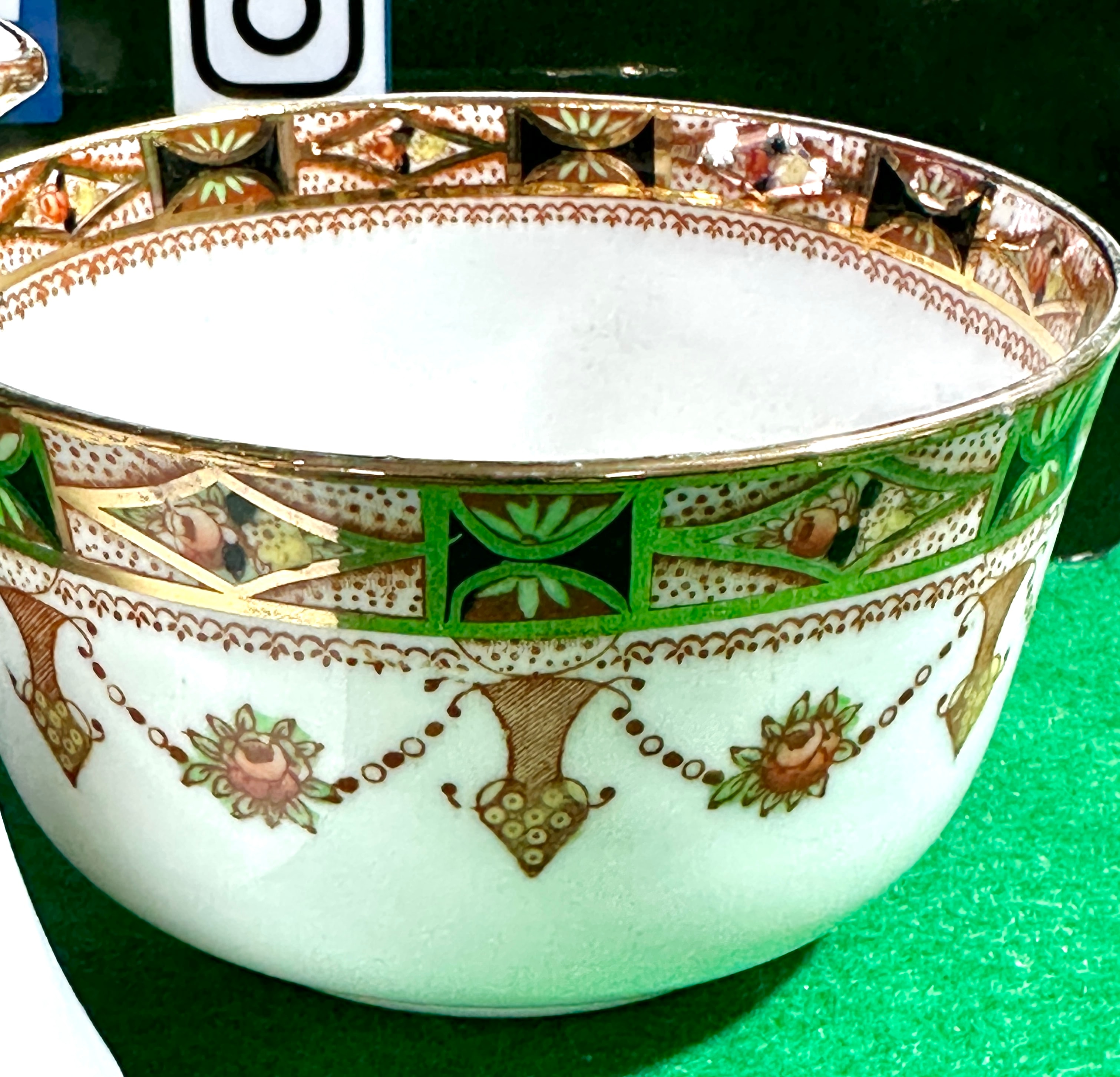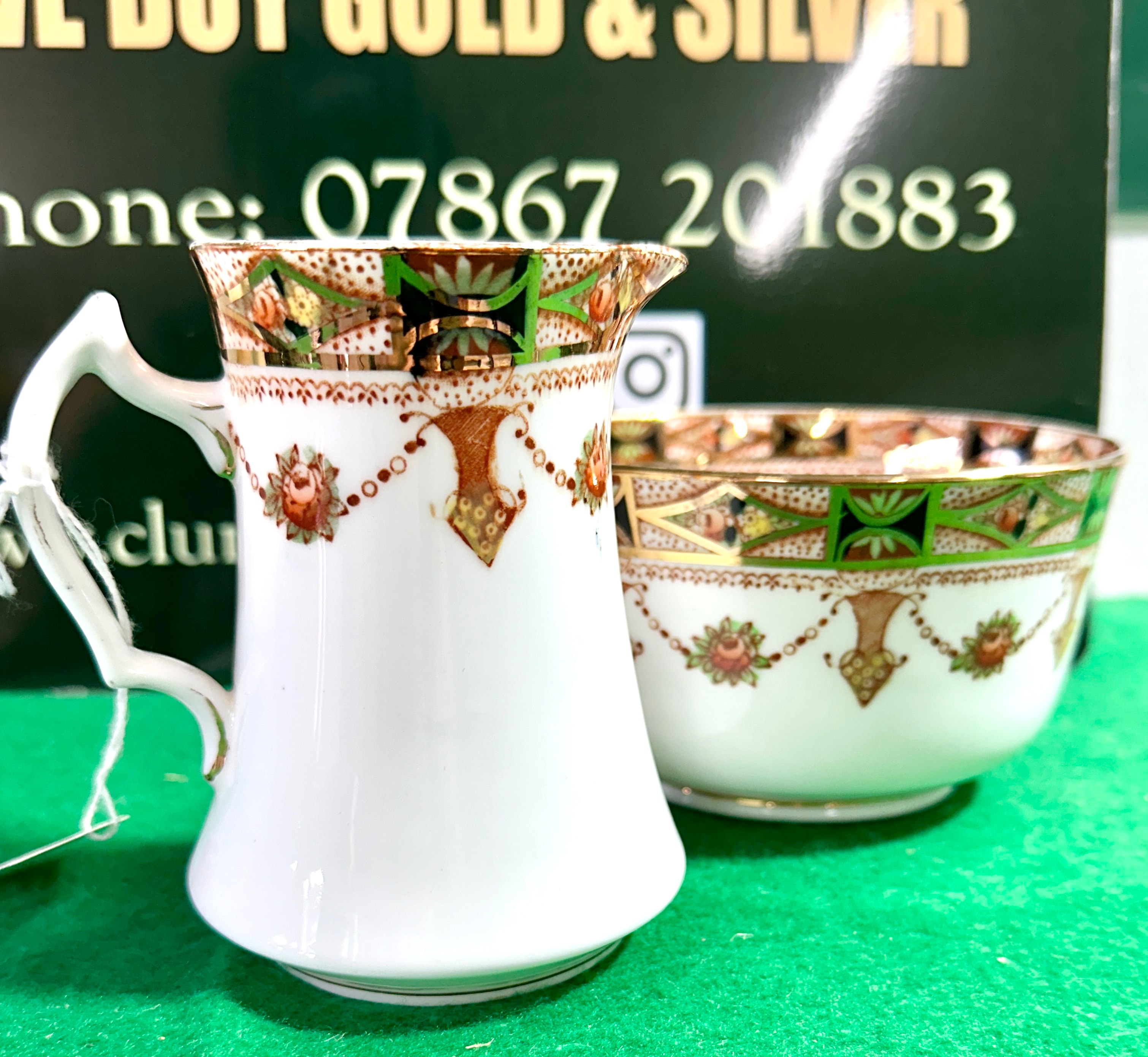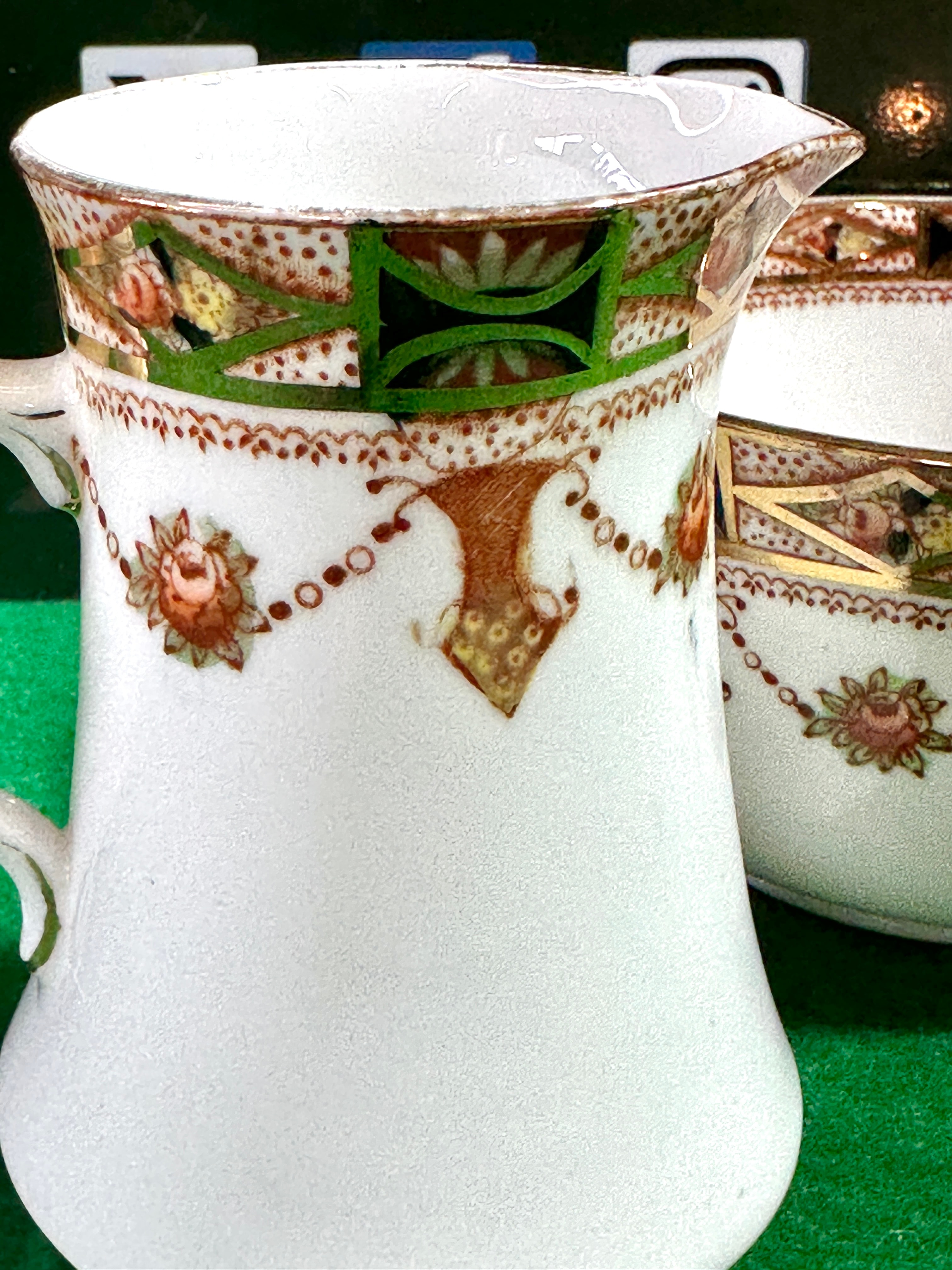 A pair of Park Place China creamer and open sugar bowl. Each piece is white-glazed and ornately decorated primarily in green, russet brown, pink, and gilt. The pattern features a broad decorative band around the rim with geometric panels in green and black, highlighted with gilt. Below this, a continuous frieze of suspended floral garlands with pink rosettes and russet brown foliate pendants adorns the body. The underside of the creamer bears a circular brown printed mark featuring a crown motif, flanked by the text ‘PARK PLACE CHINA’ and ‘MADE IN ENGLAND’.