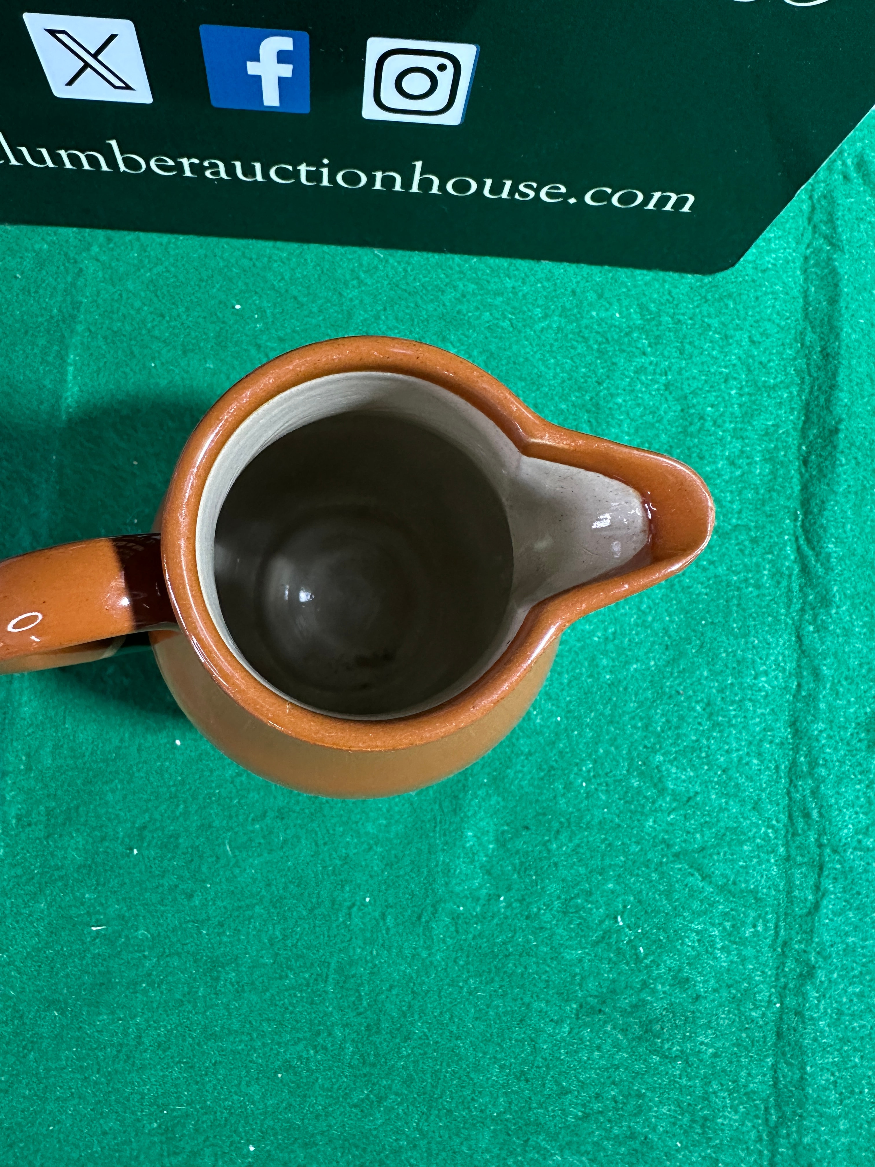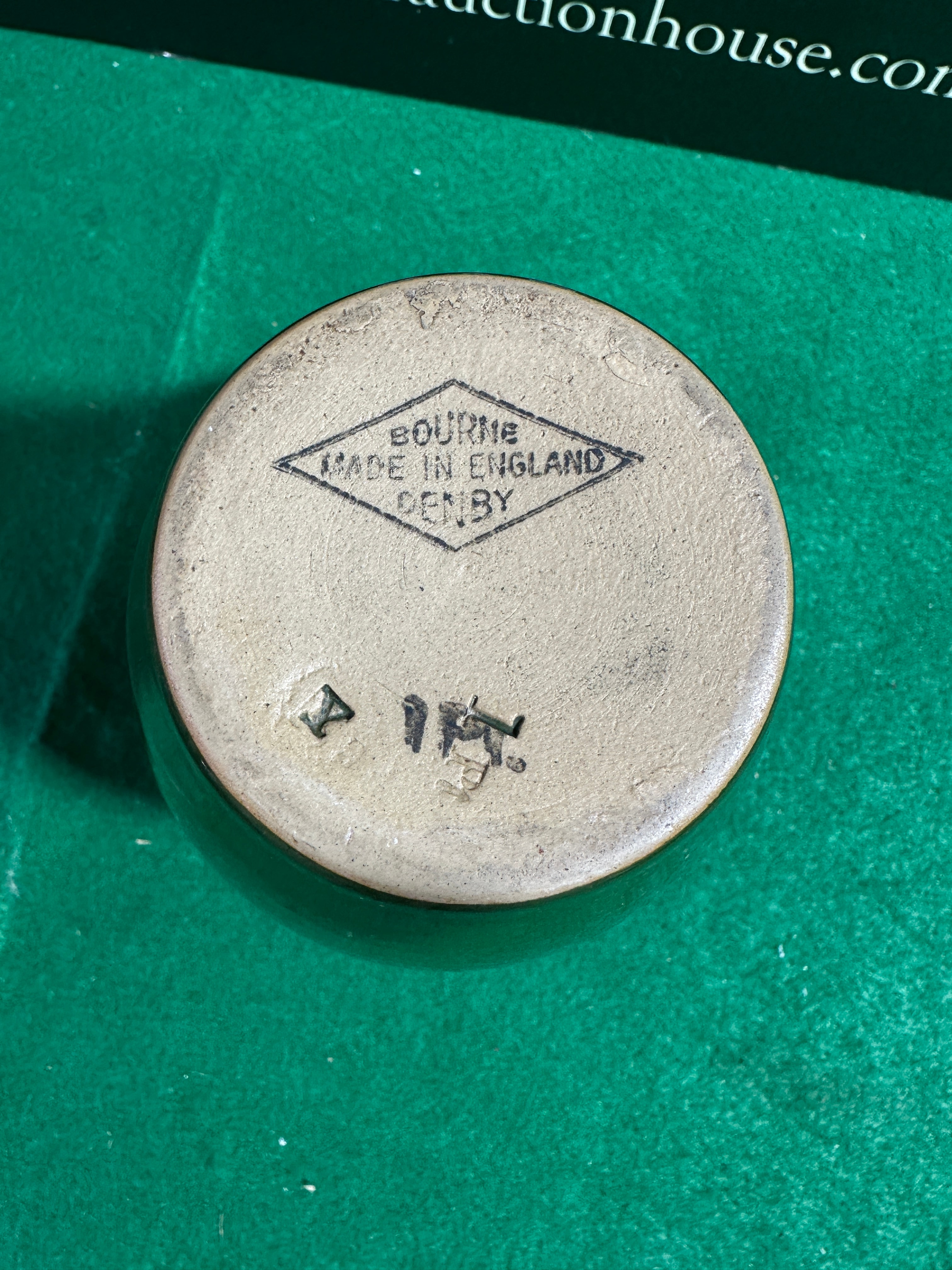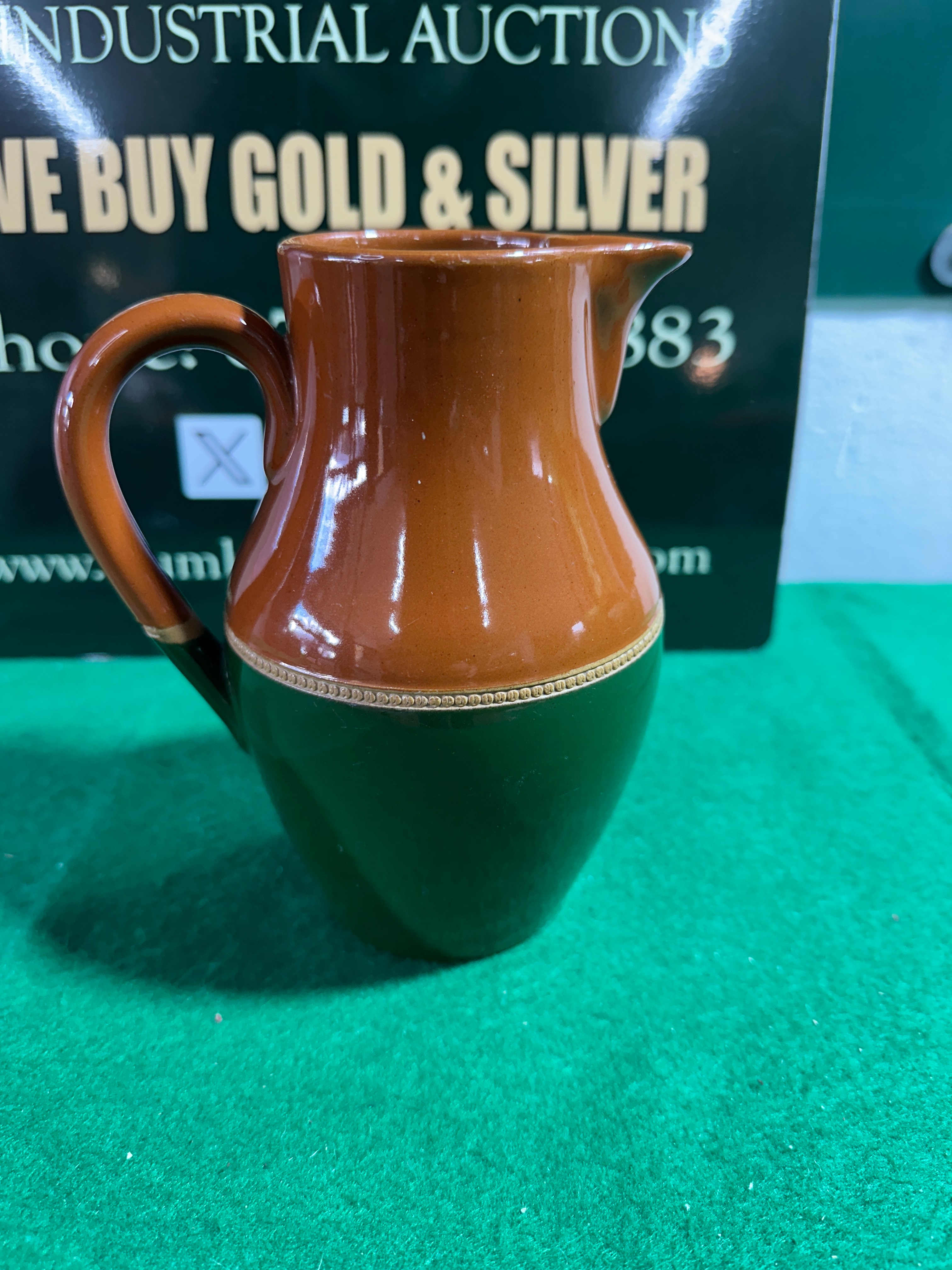 A Vintage 1940’s Green & Brown Bourne Denby Stoneware Jug. This two-tone glazed ceramic jug features a reddish-brown upper body and handle, transitioning to a dark green lower half, separated by a thin light band. The interior is a muted brown, and the unglazed base reveals a light buff clay. The base is stamped with a diamond-shaped mark containing “BOURNE,” “MADE IN ENGLAND,” and “DENBY,” confirming its manufacture by Denby Pottery in England. A handwritten mark “X 115” is also present on the base.