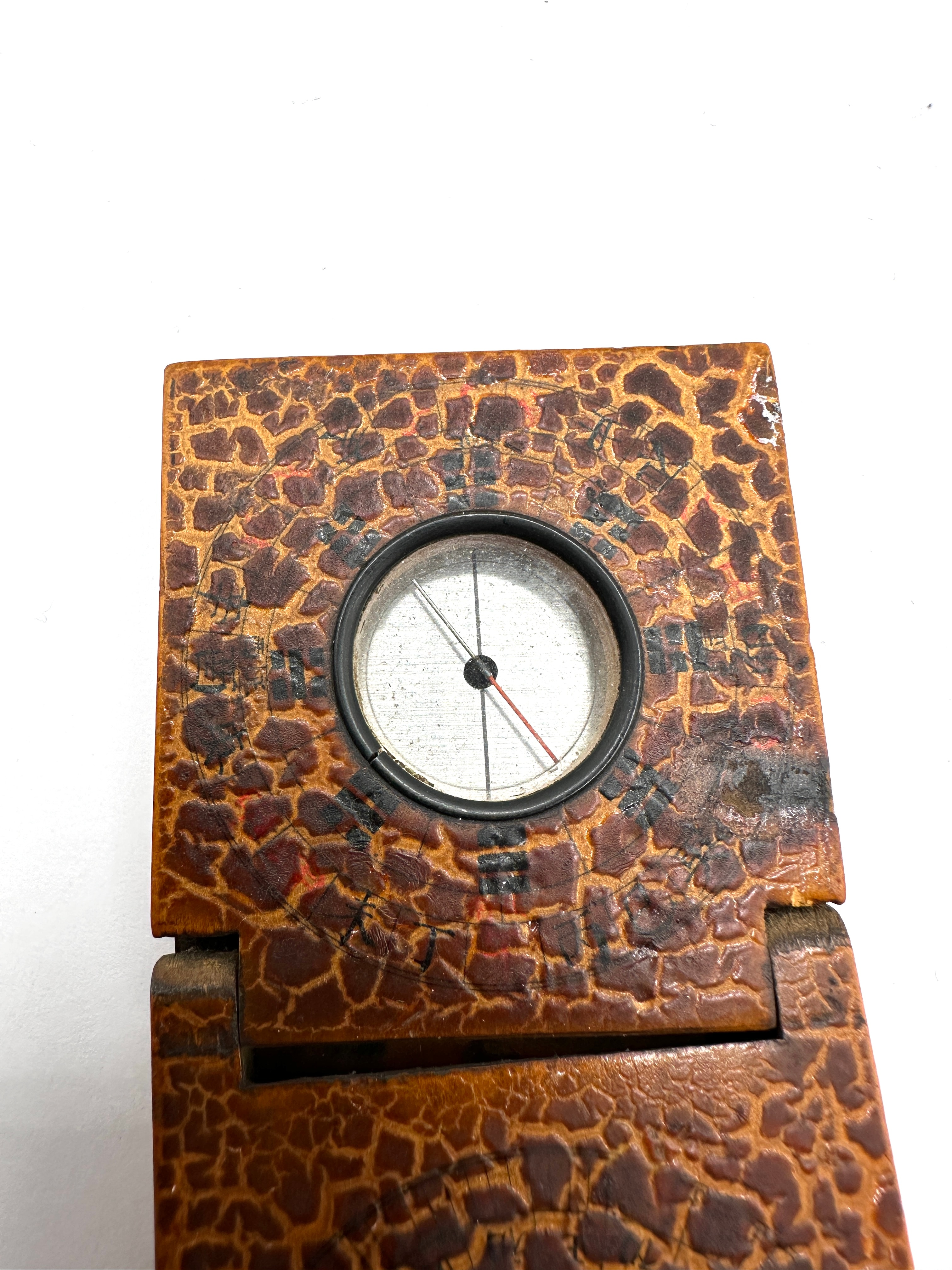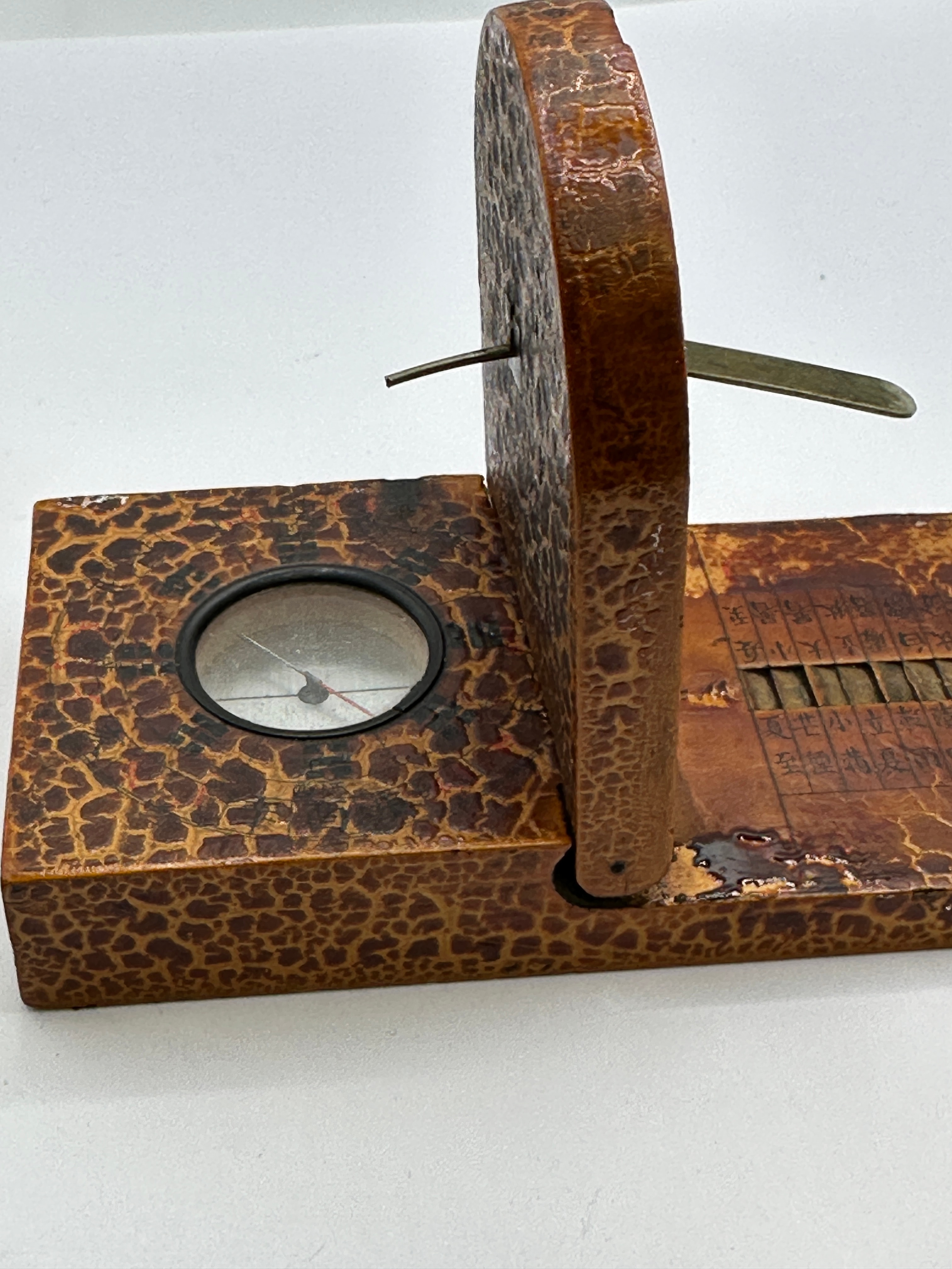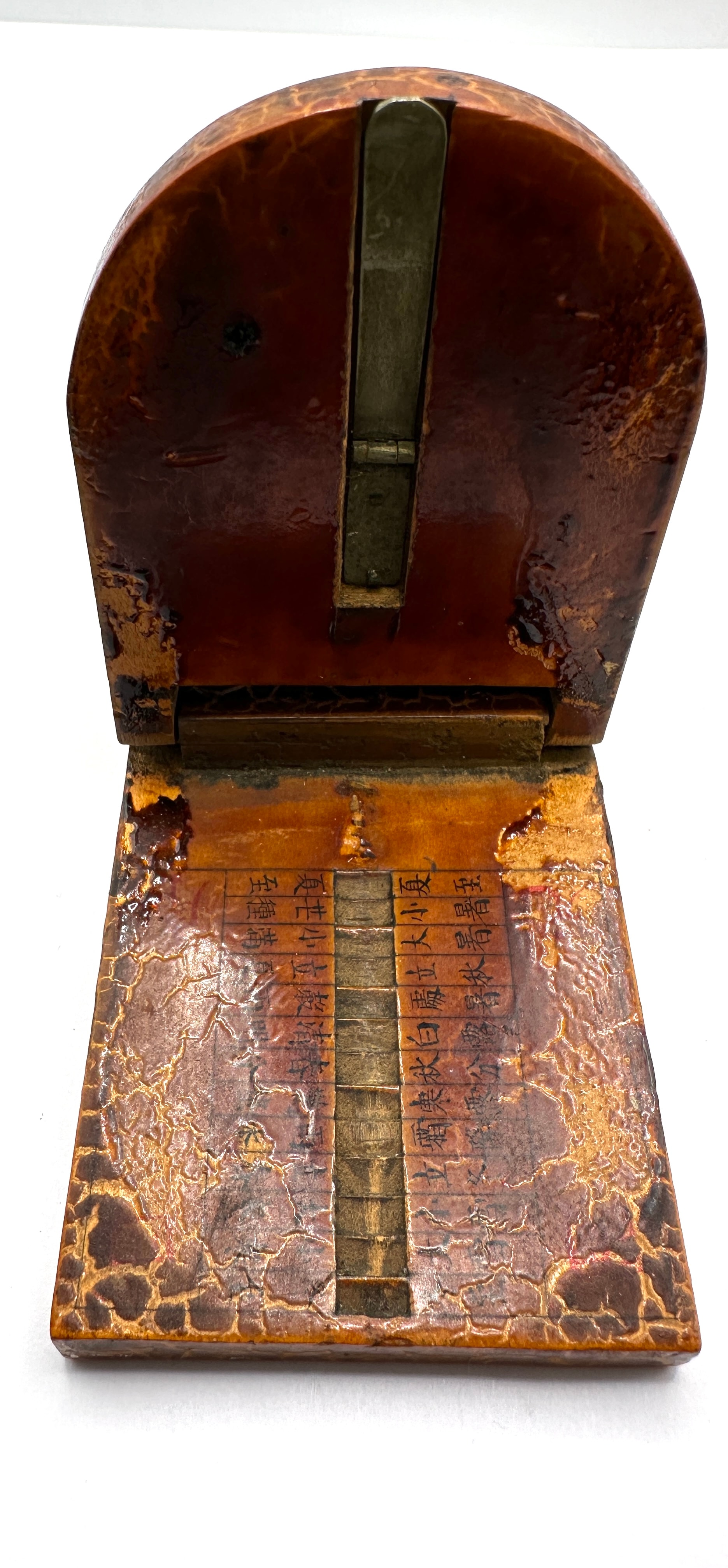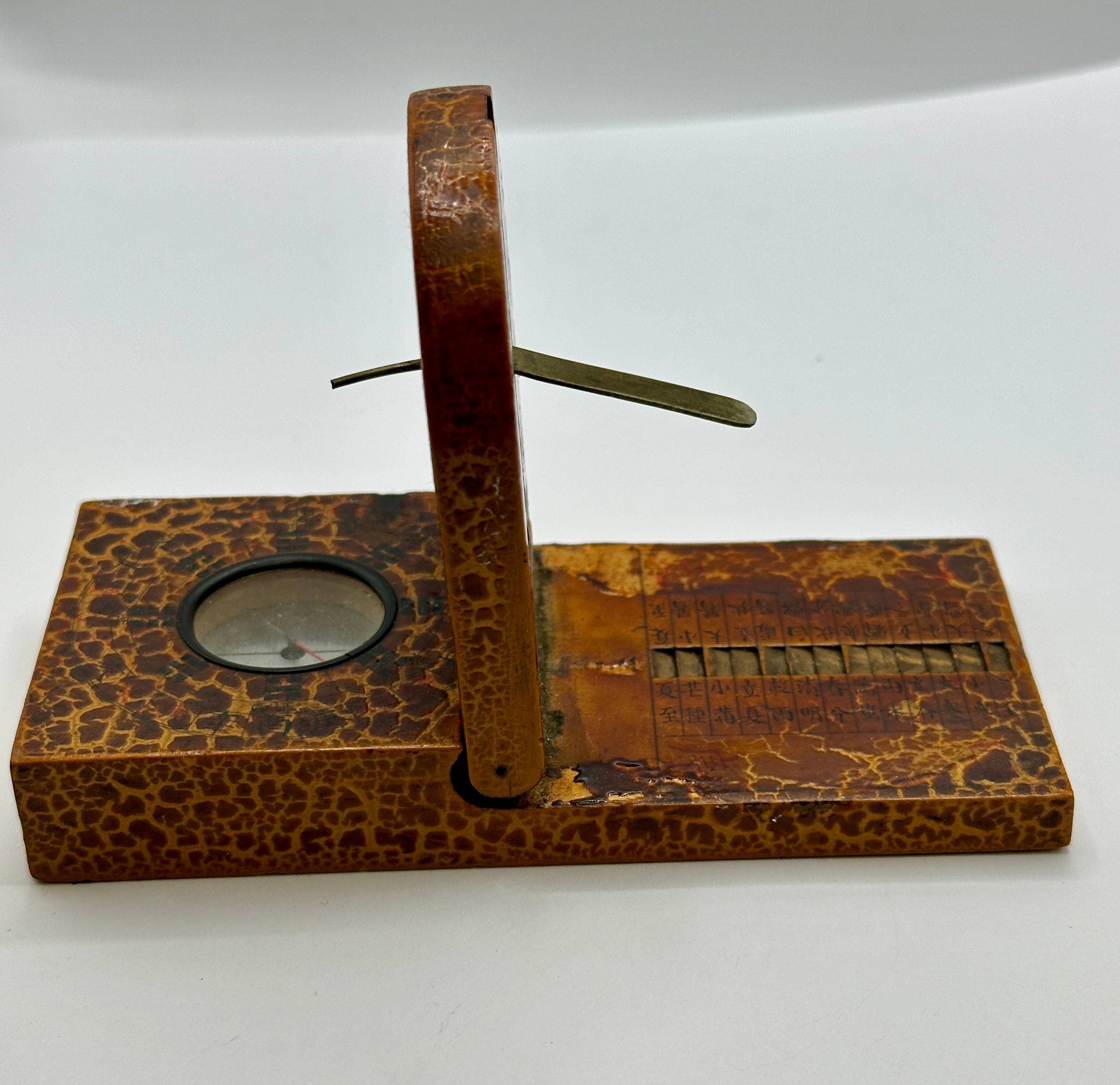 A portable folding Chinese wood compass sundial, crafted primarily from wood with a heavily crackled, patterned lacquer finish and metal components. The rectangular base houses a small, fixed magnetic compass with a black bezel and a prominent red-tipped needle. The upper section, hinged to the base, folds open to reveal a central, hinged metal gnomon arm designed to cast a shadow. Inscribed on the interior surfaces are columns of Chinese characters; those on the movable section list the twelve earthly branches (子, 丑, 寅, 卯, 辰, 巳, 午, 未, 申, 酉, 戌, 亥), representing traditional Chinese double-hour periods, while additional characters on the fixed base include “小” (small), “大” (big), “晝” (daytime), “夜” (nighttime), “至” (to), “冬” (winter), and “夏” (summer), indicating its function for seasonal time adjustment.
