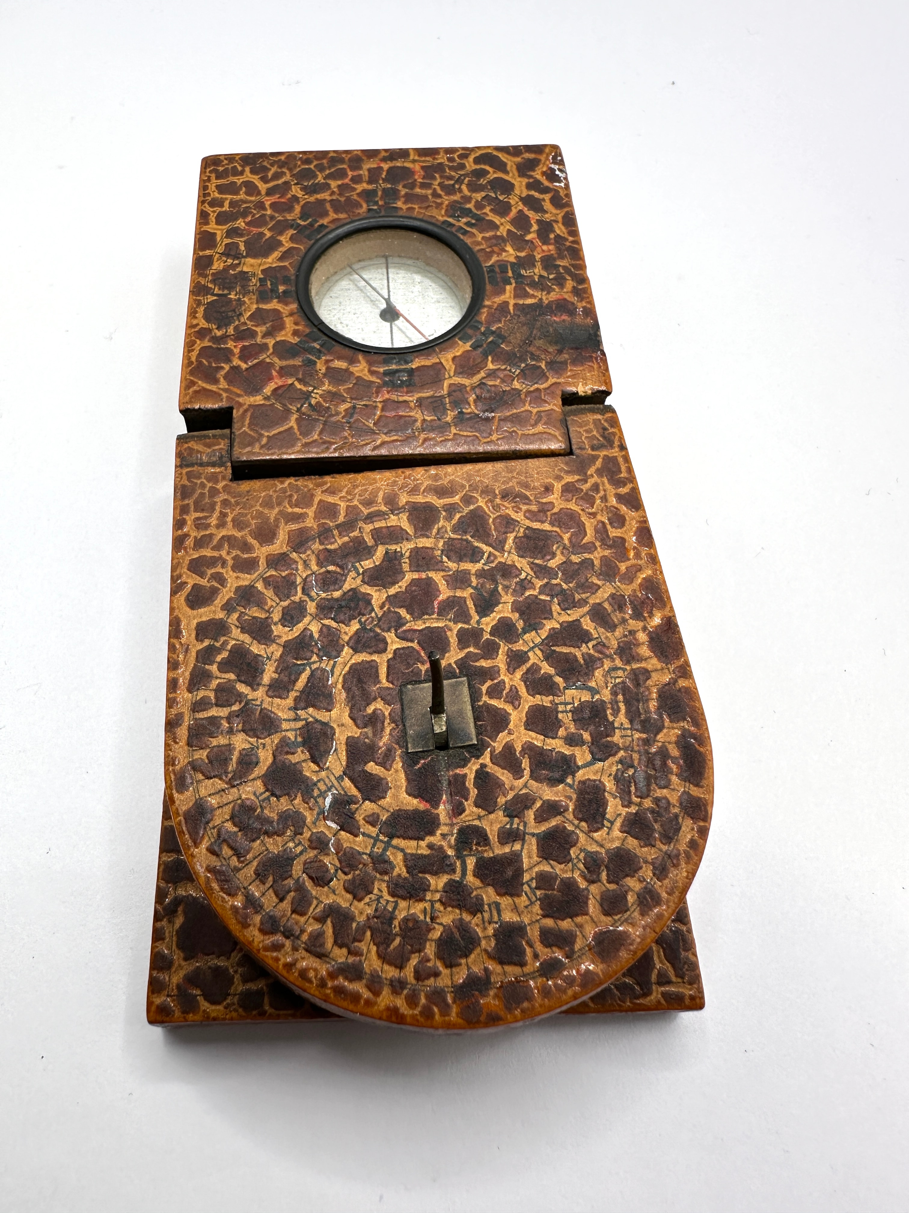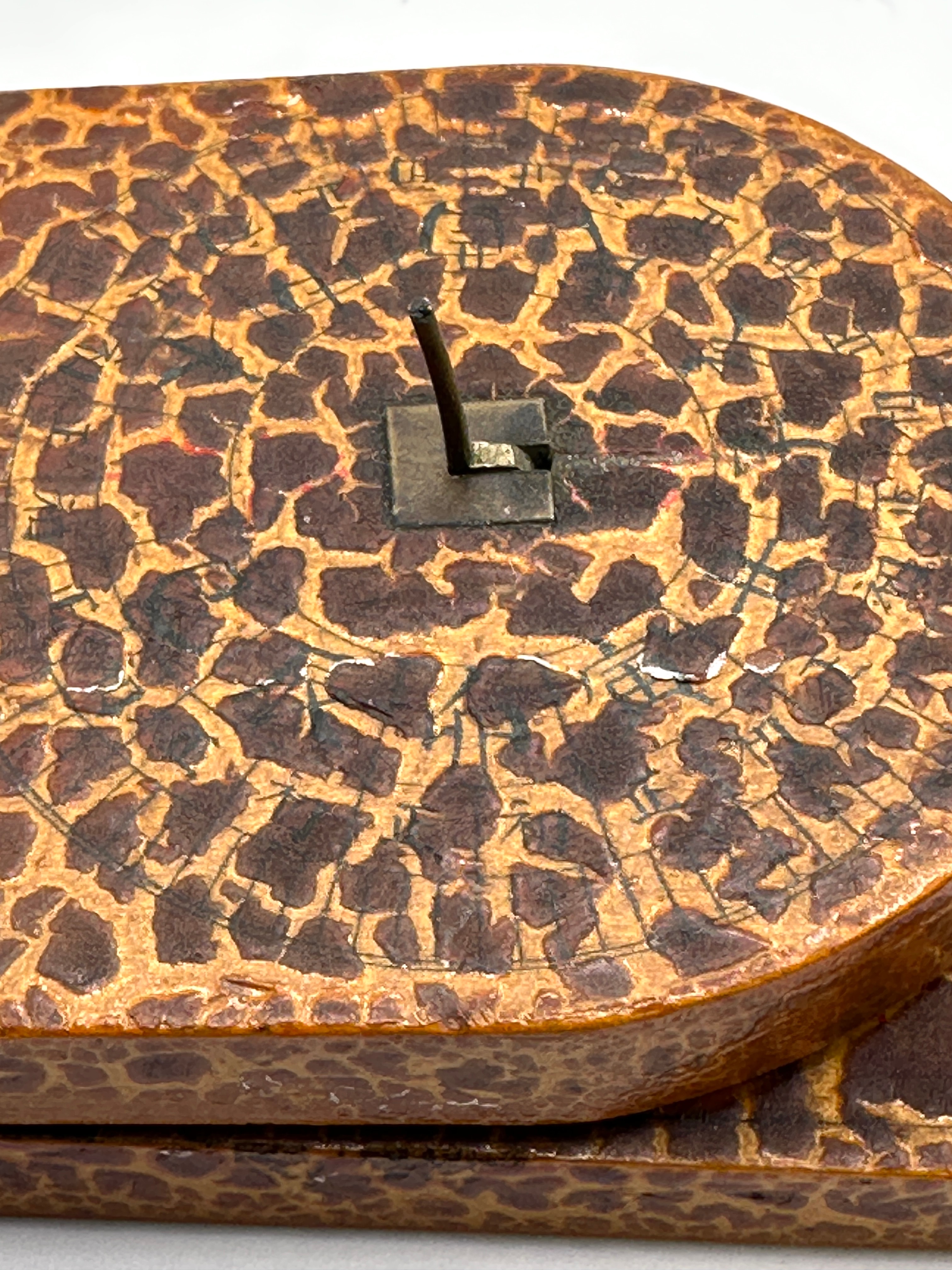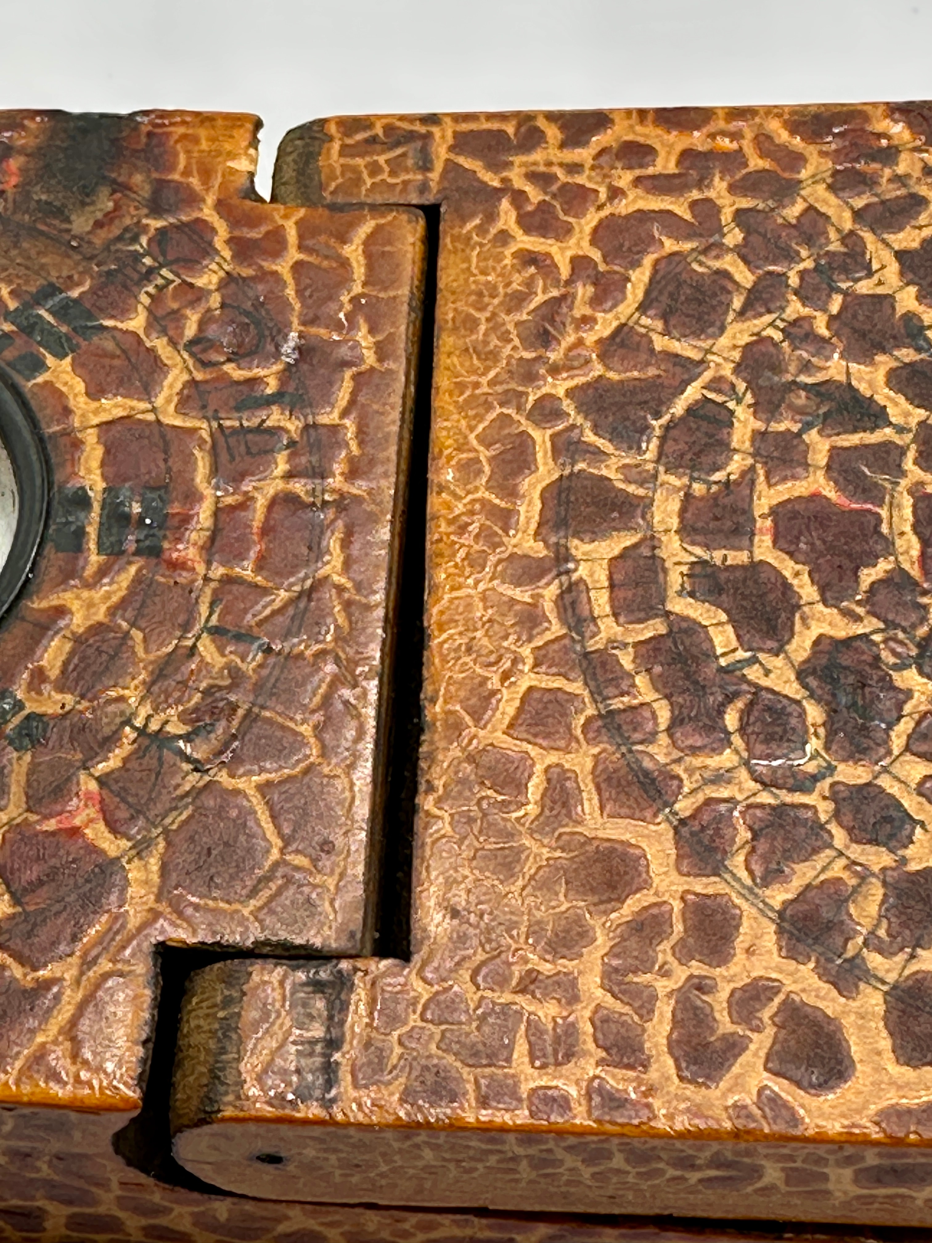 A portable folding Chinese wood compass sundial, crafted primarily from wood with a heavily crackled, patterned lacquer finish and metal components. The rectangular base houses a small, fixed magnetic compass with a black bezel and a prominent red-tipped needle. The upper section, hinged to the base, folds open to reveal a central, hinged metal gnomon arm designed to cast a shadow. Inscribed on the interior surfaces are columns of Chinese characters; those on the movable section list the twelve earthly branches (子, 丑, 寅, 卯, 辰, 巳, 午, 未, 申, 酉, 戌, 亥), representing traditional Chinese double-hour periods, while additional characters on the fixed base include “小” (small), “大” (big), “晝” (daytime), “夜” (nighttime), “至” (to), “冬” (winter), and “夏” (summer), indicating its function for seasonal time adjustment.