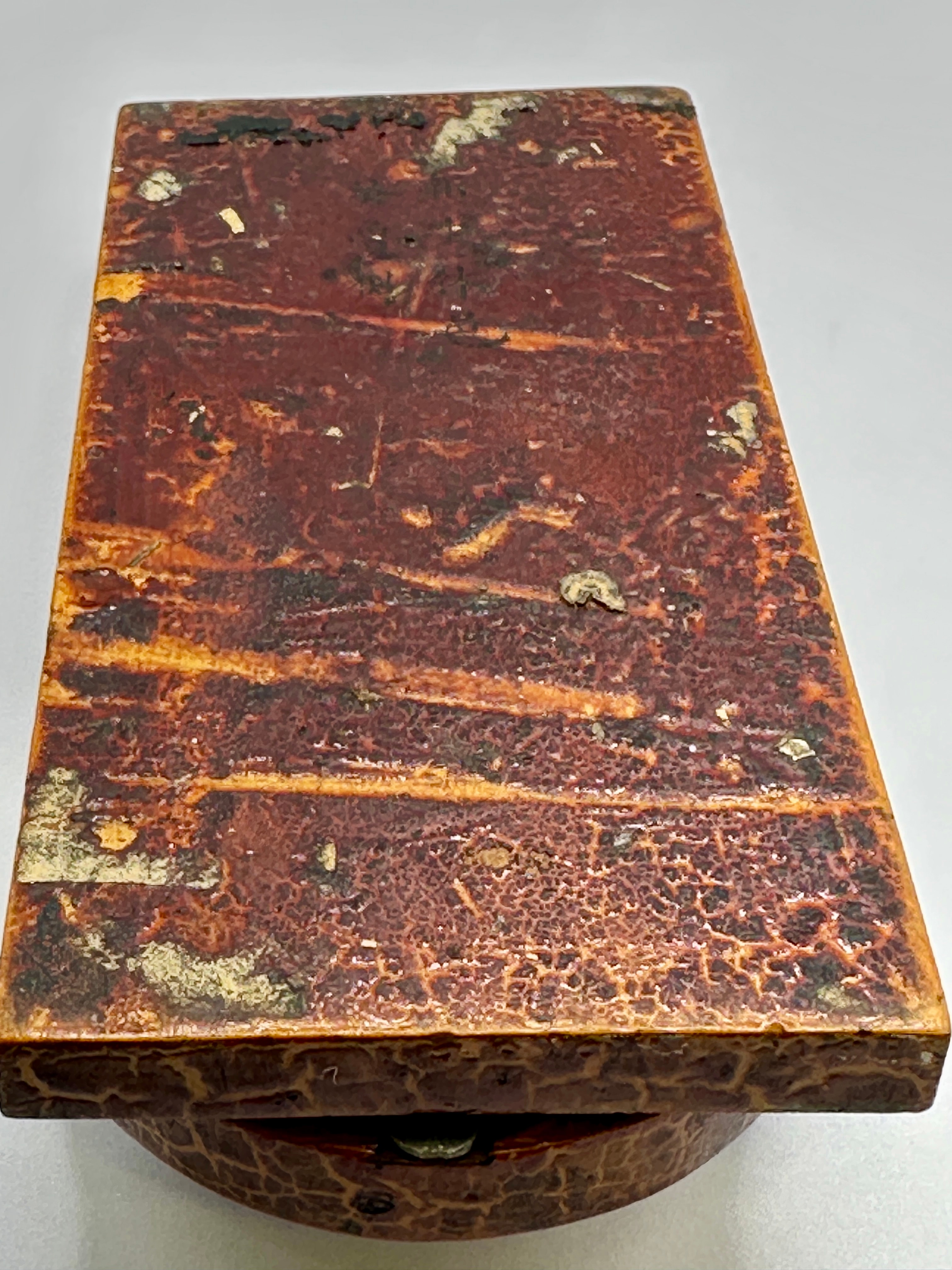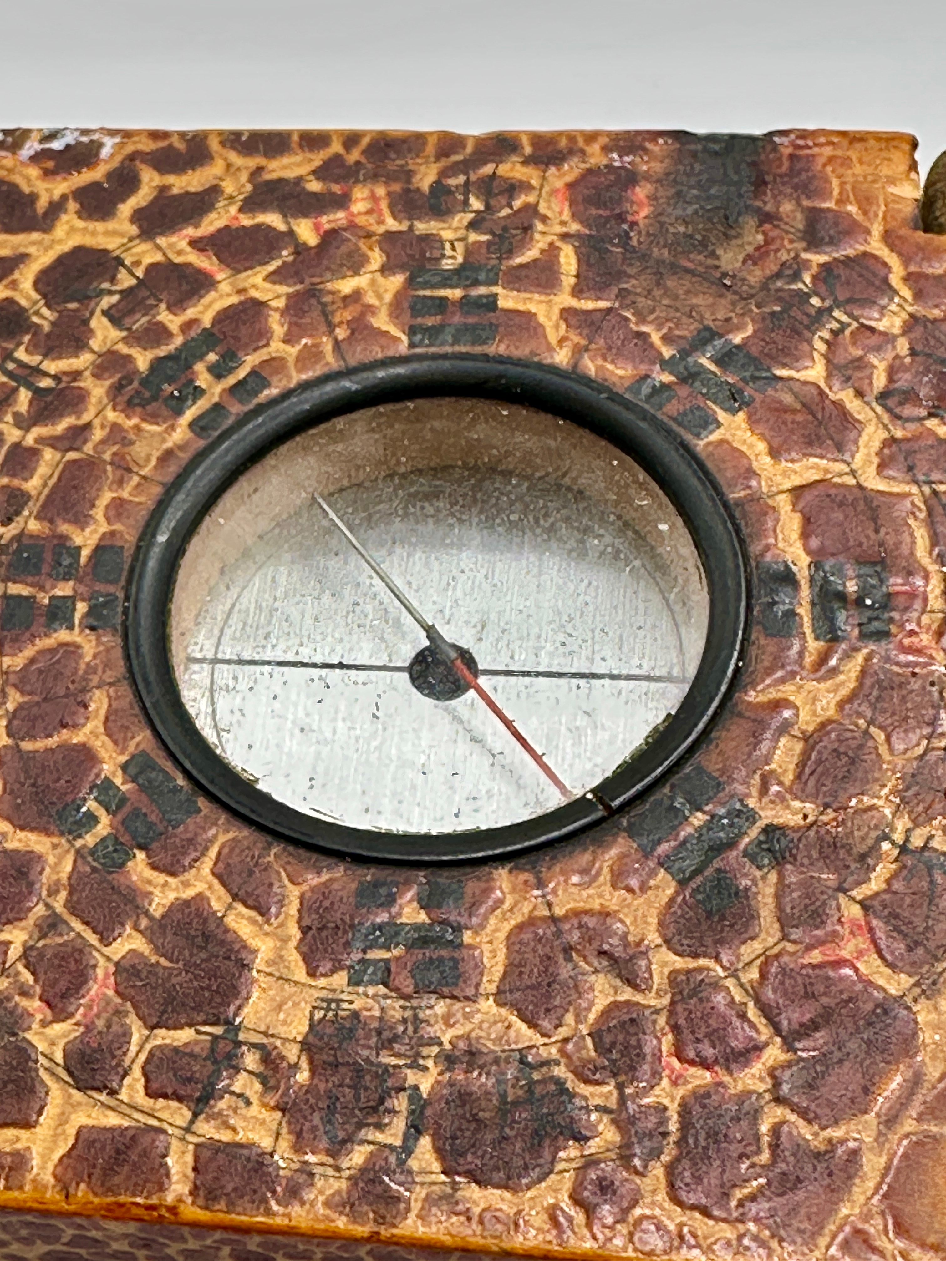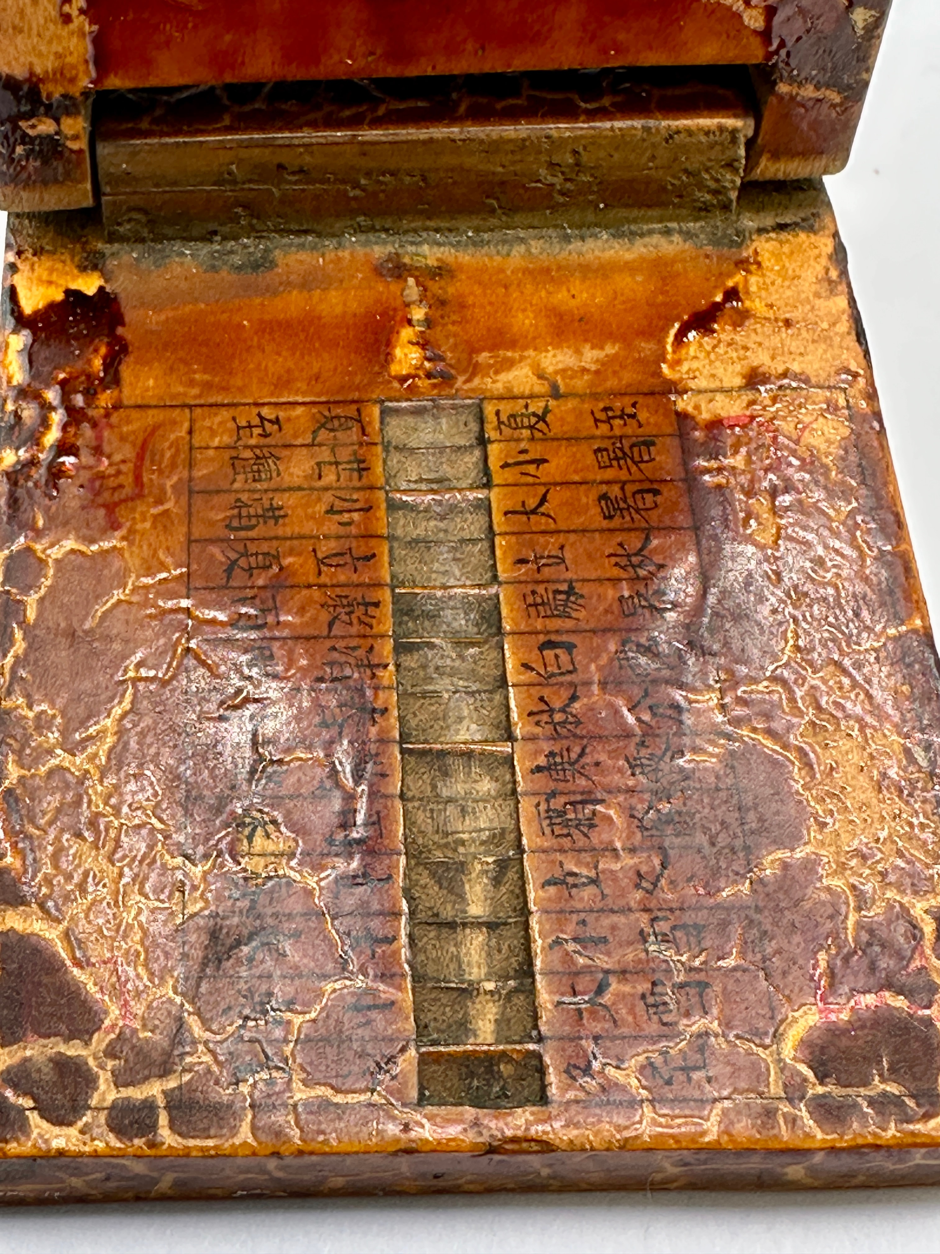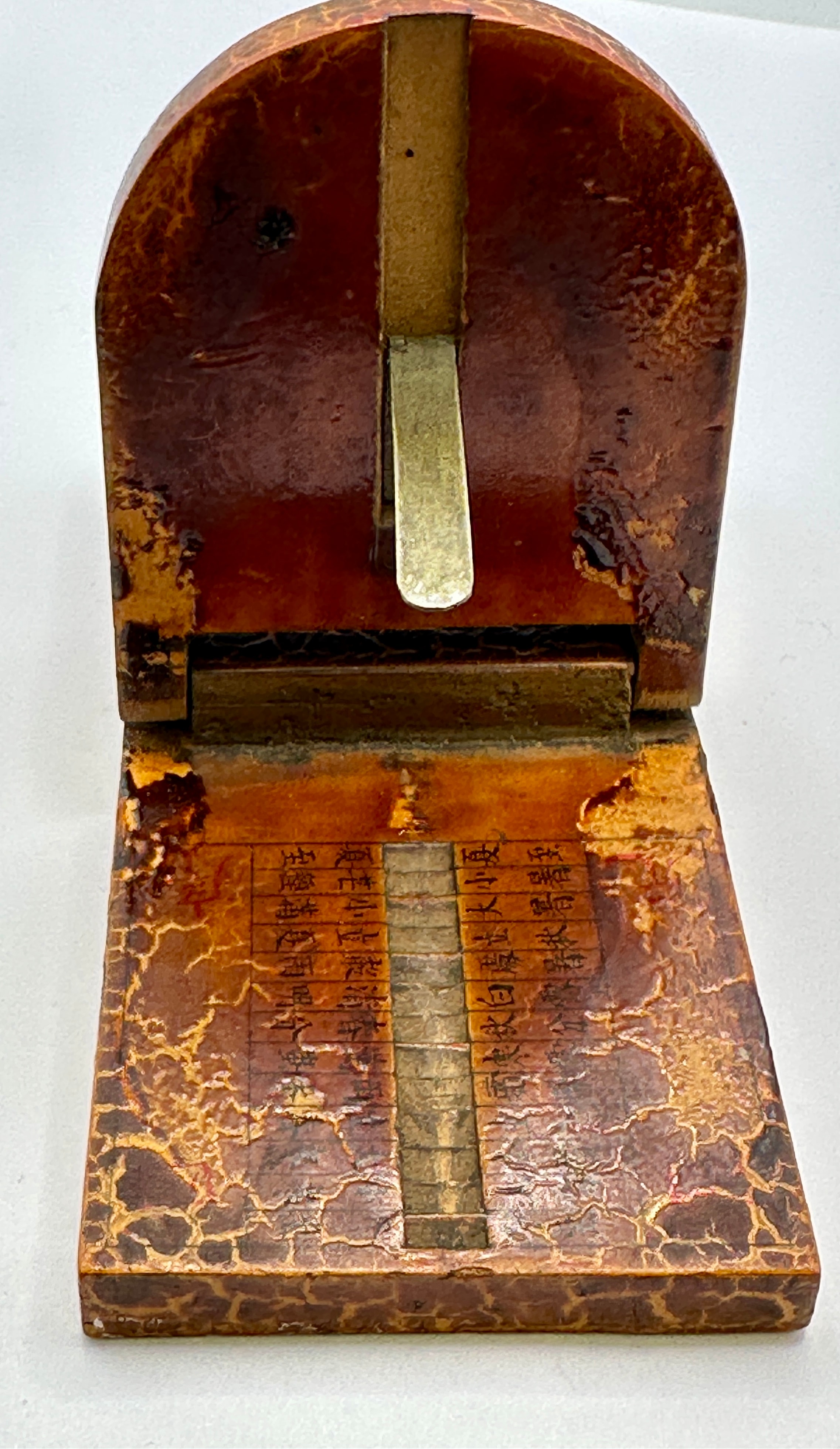 A portable folding Chinese wood compass sundial, crafted primarily from wood with a heavily crackled, patterned lacquer finish and metal components. The rectangular base houses a small, fixed magnetic compass with a black bezel and a prominent red-tipped needle. The upper section, hinged to the base, folds open to reveal a central, hinged metal gnomon arm designed to cast a shadow. Inscribed on the interior surfaces are columns of Chinese characters; those on the movable section list the twelve earthly branches (子, 丑, 寅, 卯, 辰, 巳, 午, 未, 申, 酉, 戌, 亥), representing traditional Chinese double-hour periods, while additional characters on the fixed base include “小” (small), “大” (big), “晝” (daytime), “夜” (nighttime), “至” (to), “冬” (winter), and “夏” (summer), indicating its function for seasonal time adjustment.