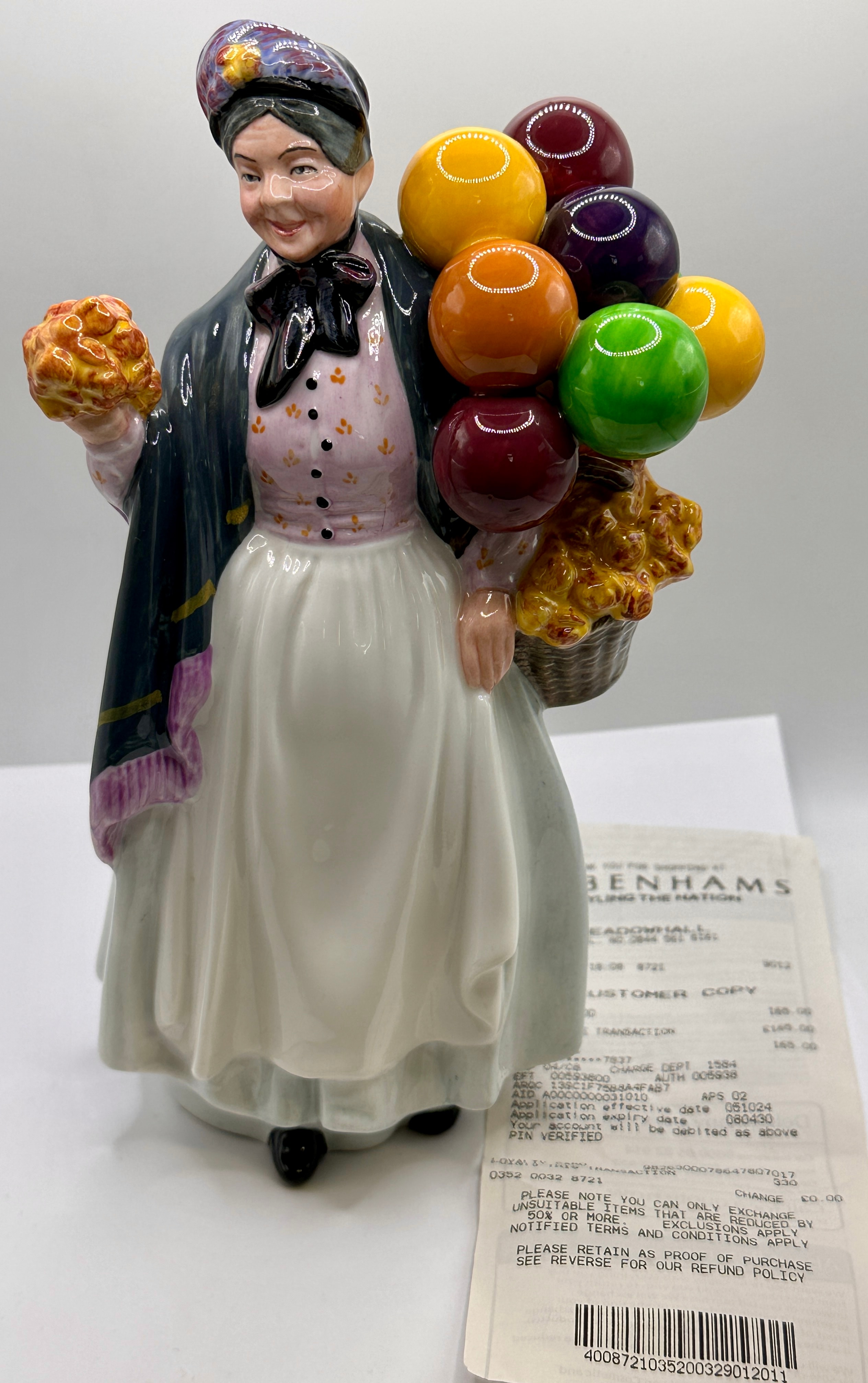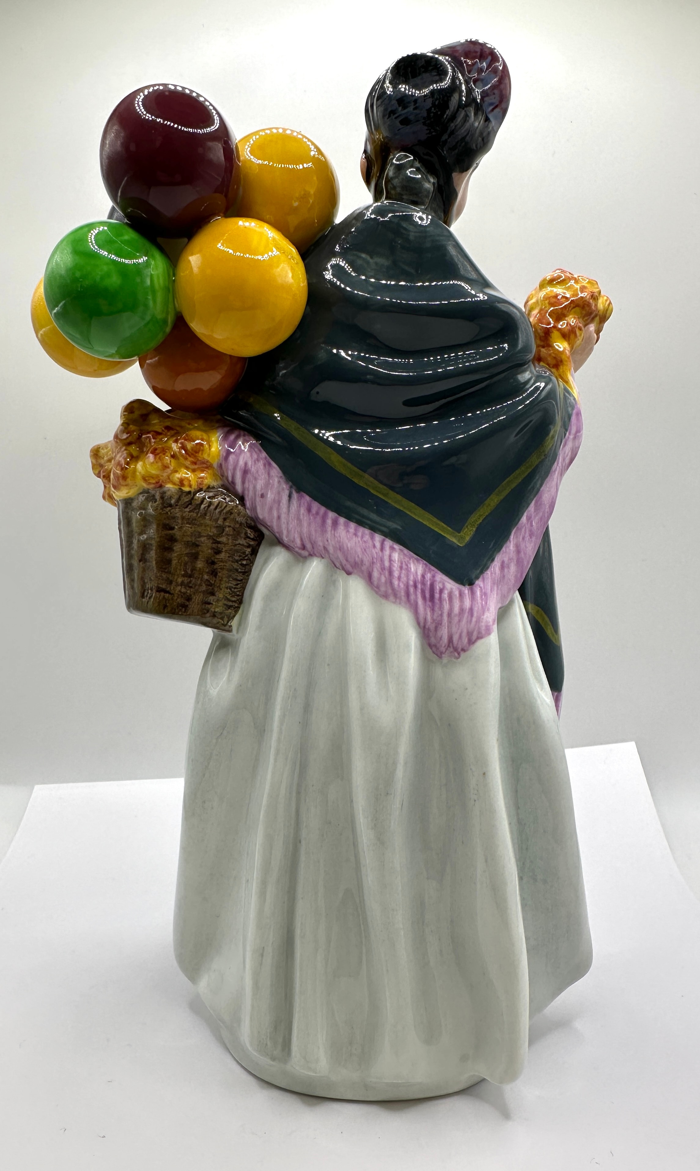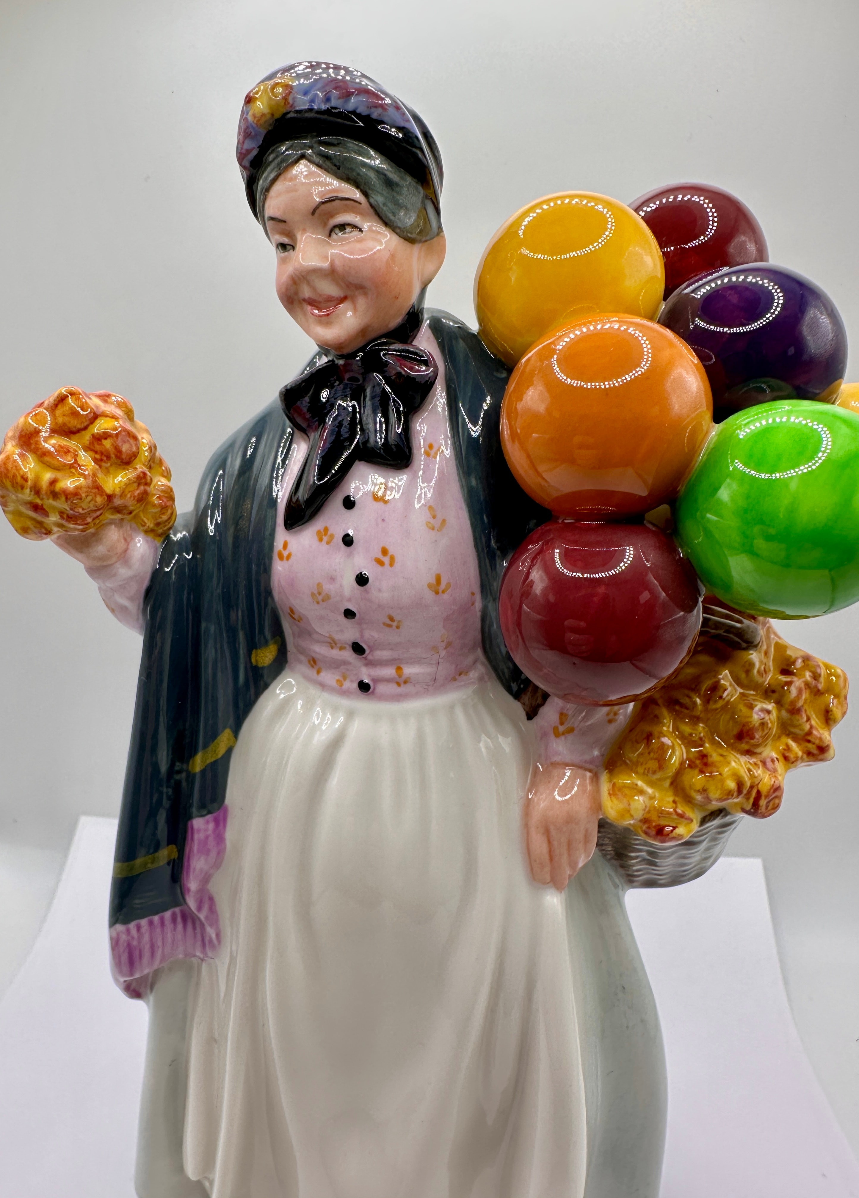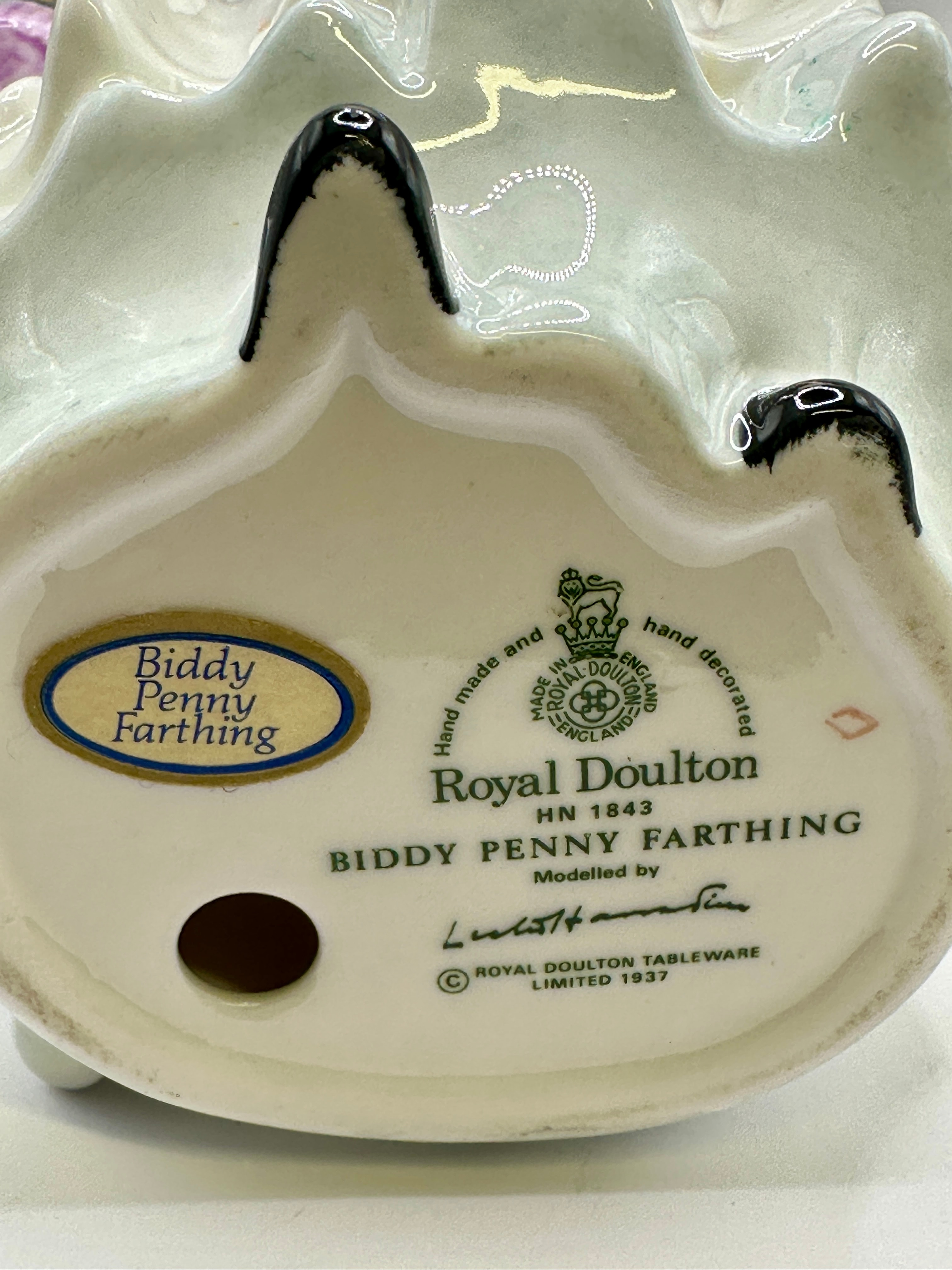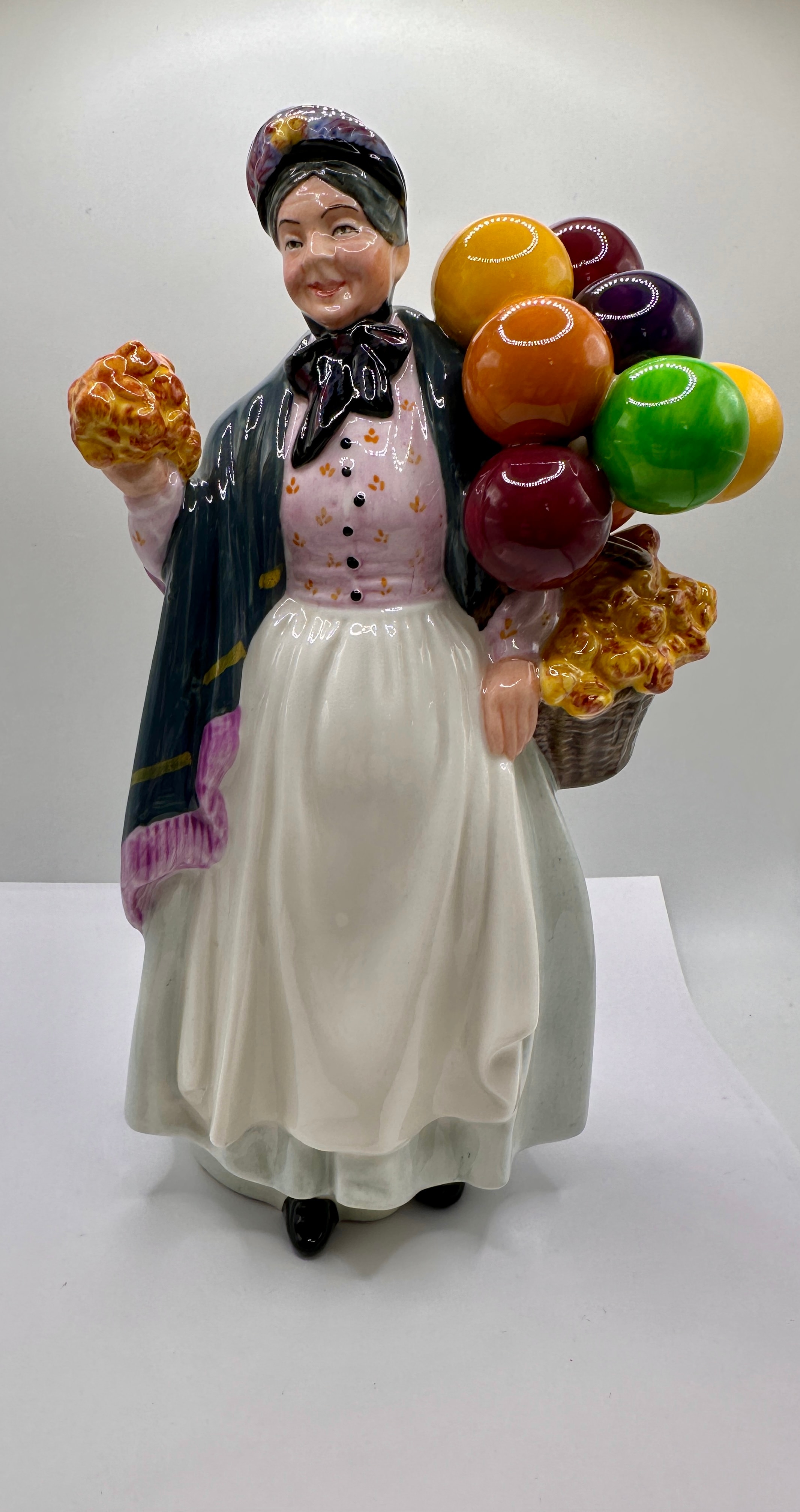 A Royal Doulton glazed porcelain figurine, ‘Biddy Penny Farthing’, HN 1843, modelled by Leslie Harradine, copyrighted 1937. The figure depicts an elderly woman dressed in a dark shawl with purple fringe, a pink floral blouse, a long white skirt, and a dark cap. She holds a cluster of yellow textured items in her right hand and carries a basket in her left arm. The basket is filled with similar yellow textured items and topped with a group of glossy, spherical objects in red, orange, yellow, green, and purple. The base is marked ‘Royal Doulton’, ‘Made in England, hand made and hand decorated’, and ‘ROYAL DOULTON TABLEWARE LIMITED 1937’.