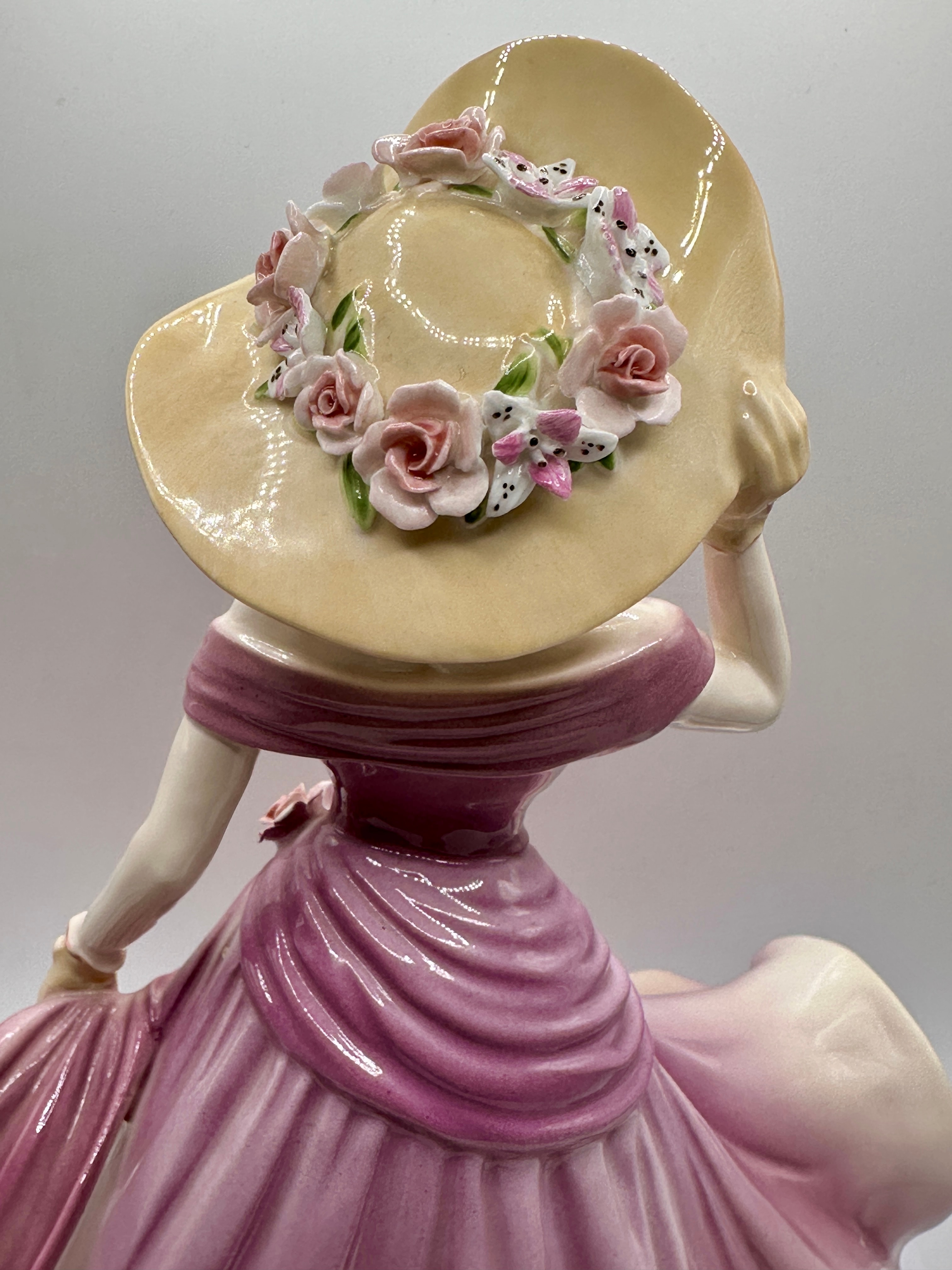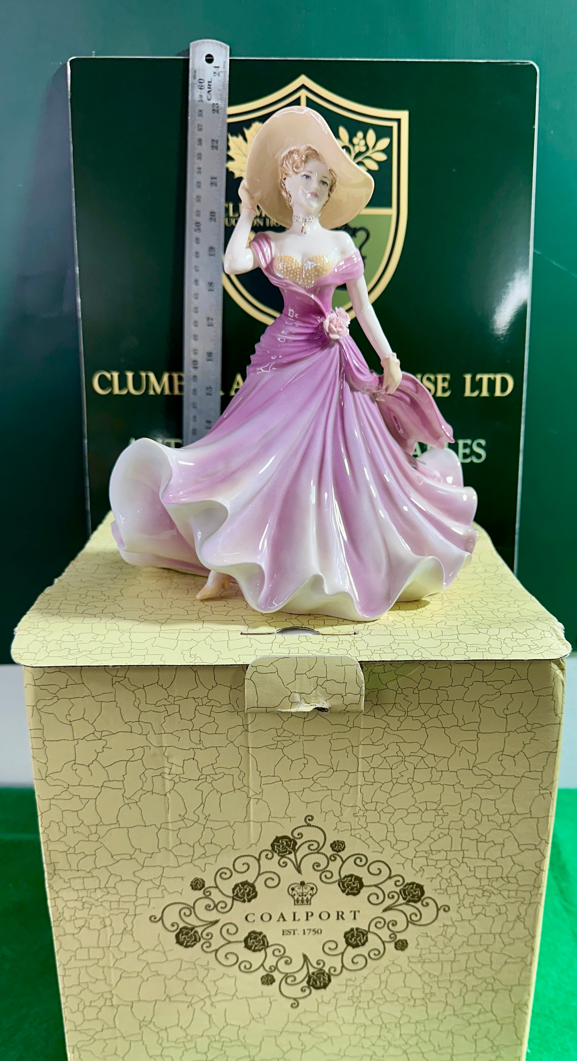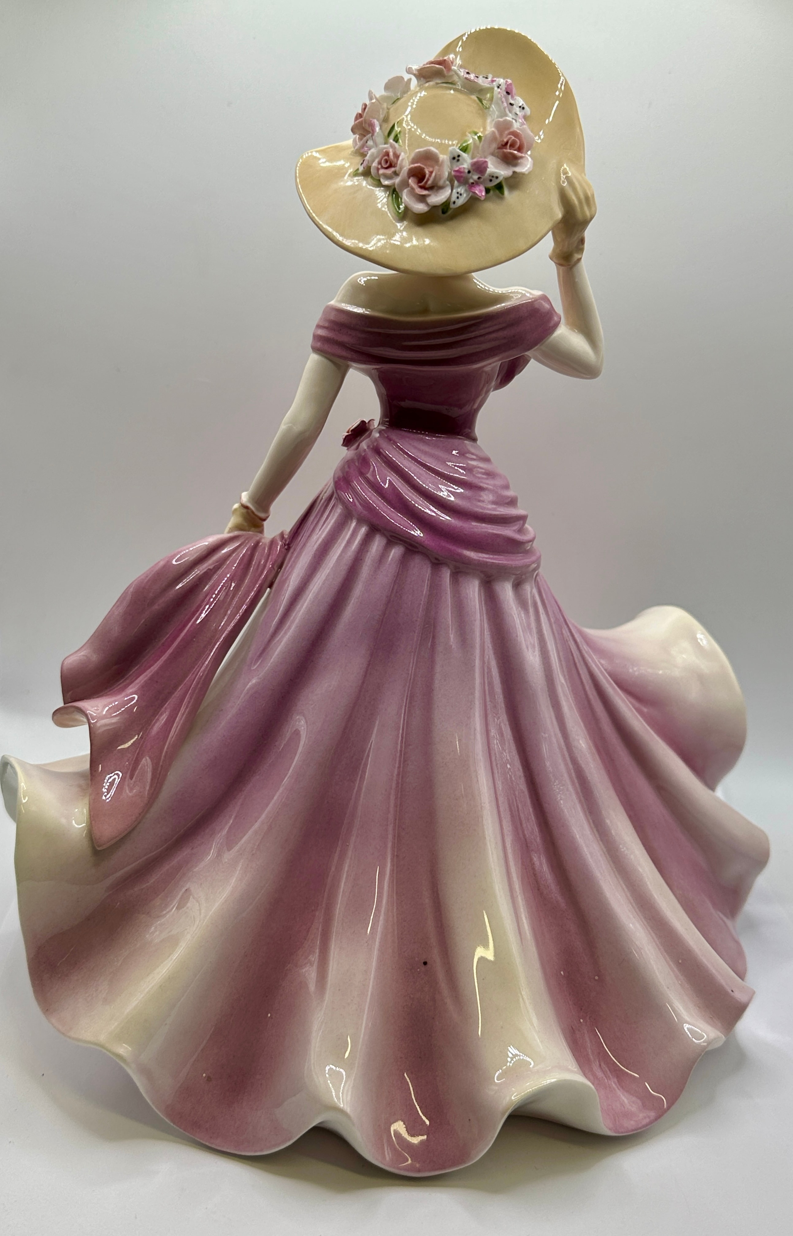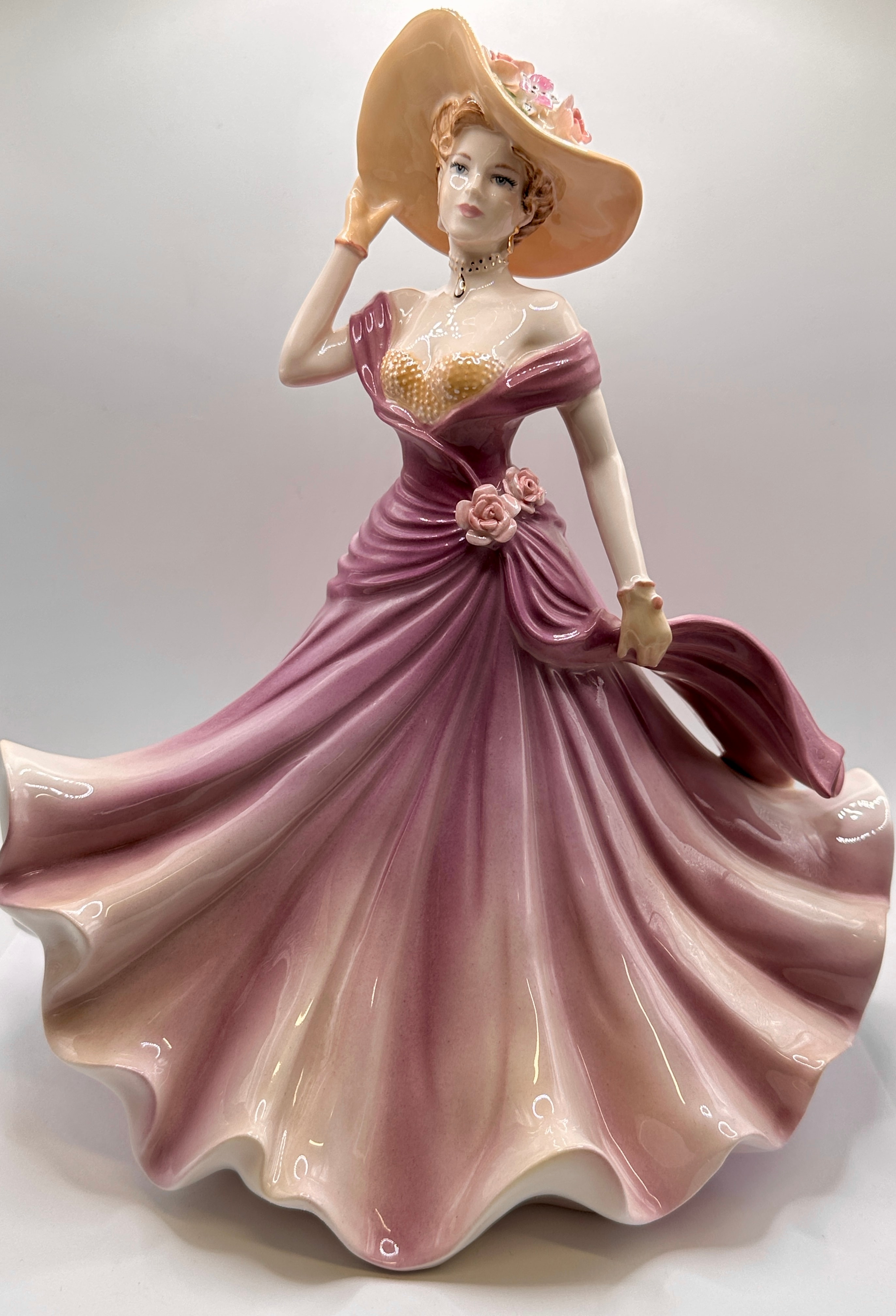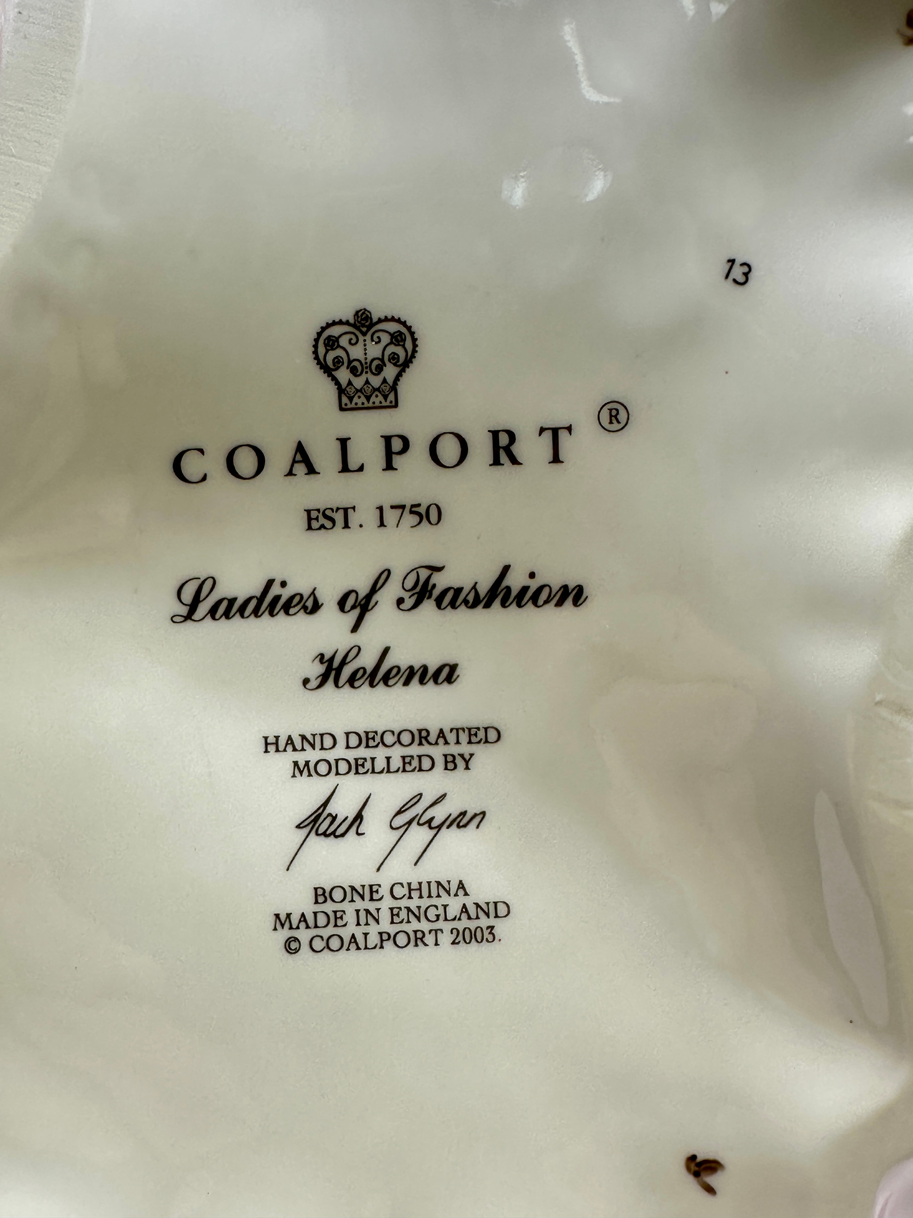 A Coalport ‘Ladies of Fashion’ series bone china figurine, named ‘Helena’, dated 2003. The figure is modelled by Jack Glyn and depicts a female figure wearing an elegant, flowing, off-the-shoulder gown that transitions from deep magenta to pale pink, accented with a gold bodice detail. She wears a wide-brimmed cream hat adorned with pink roses and white floral accents. The underside is marked with the Coalport crown logo, “EST. 1750”, “Ladies of Fashion”, “Helena”, “HAND DECORATED MODELLED BY Jack Glyn”, “BONE CHINA”, “MADE IN ENGLAND”, and “© COALPORT 2003”, alongside the number “73”.