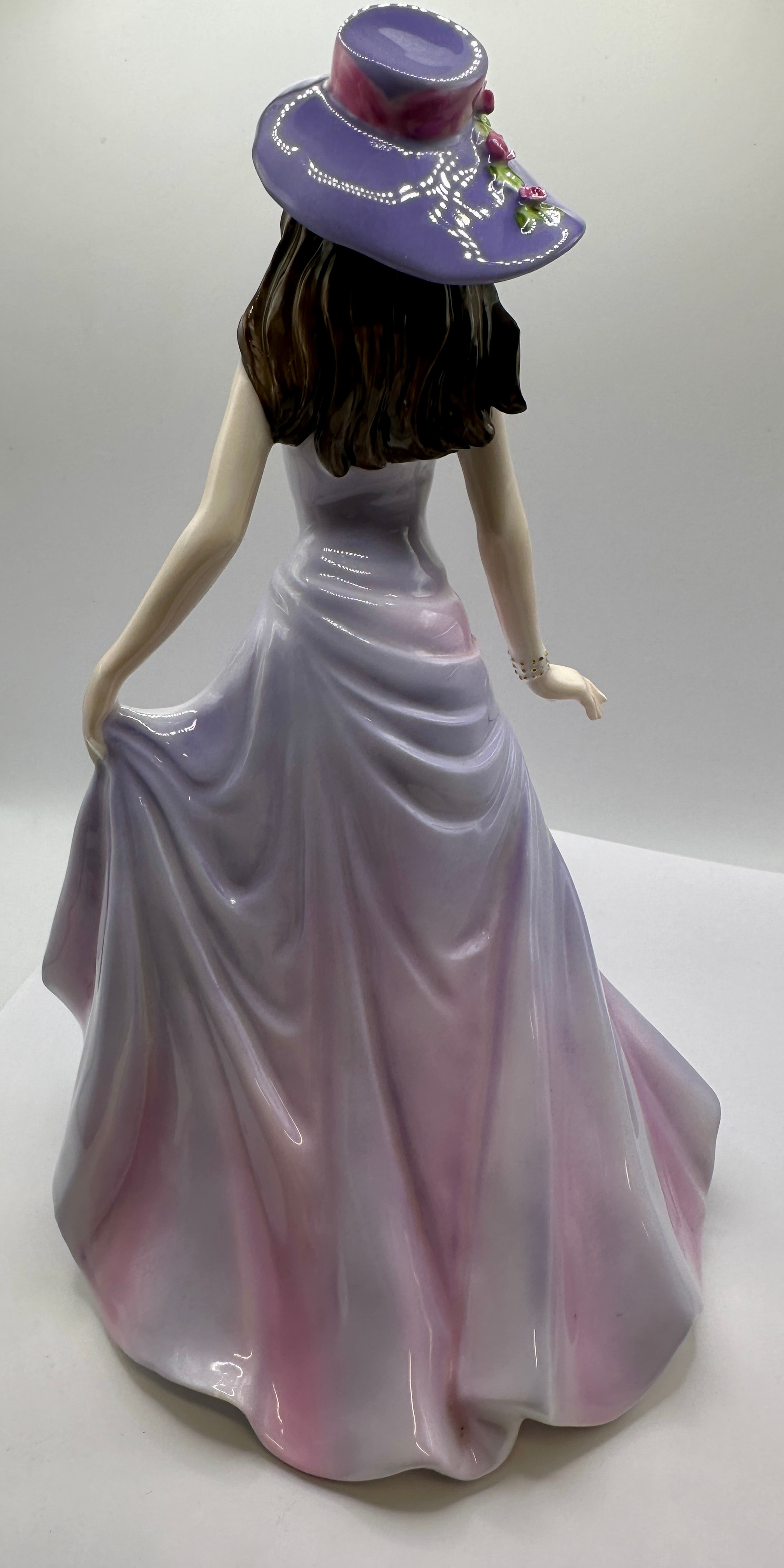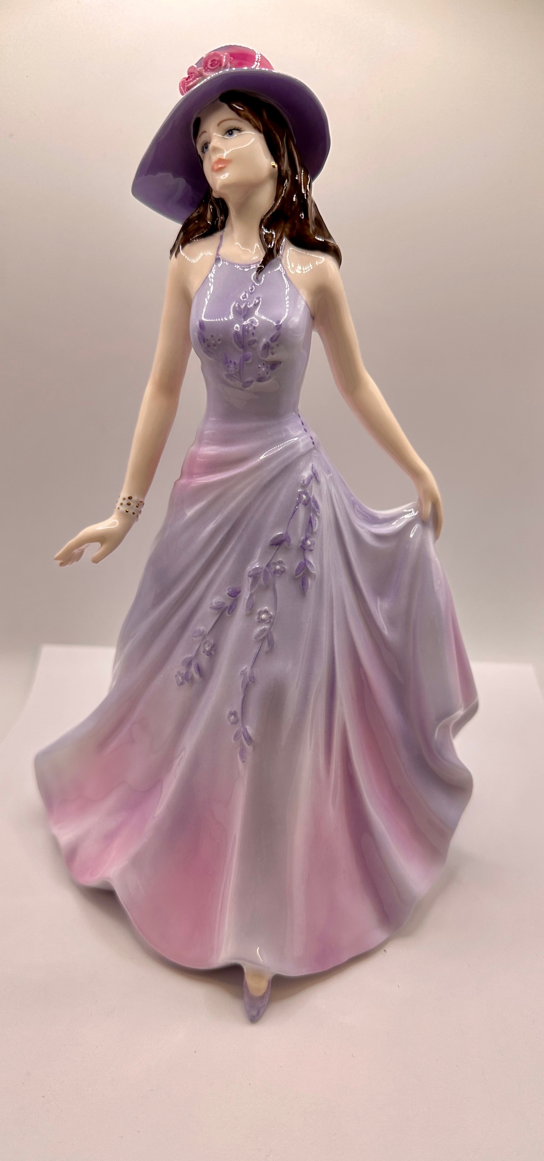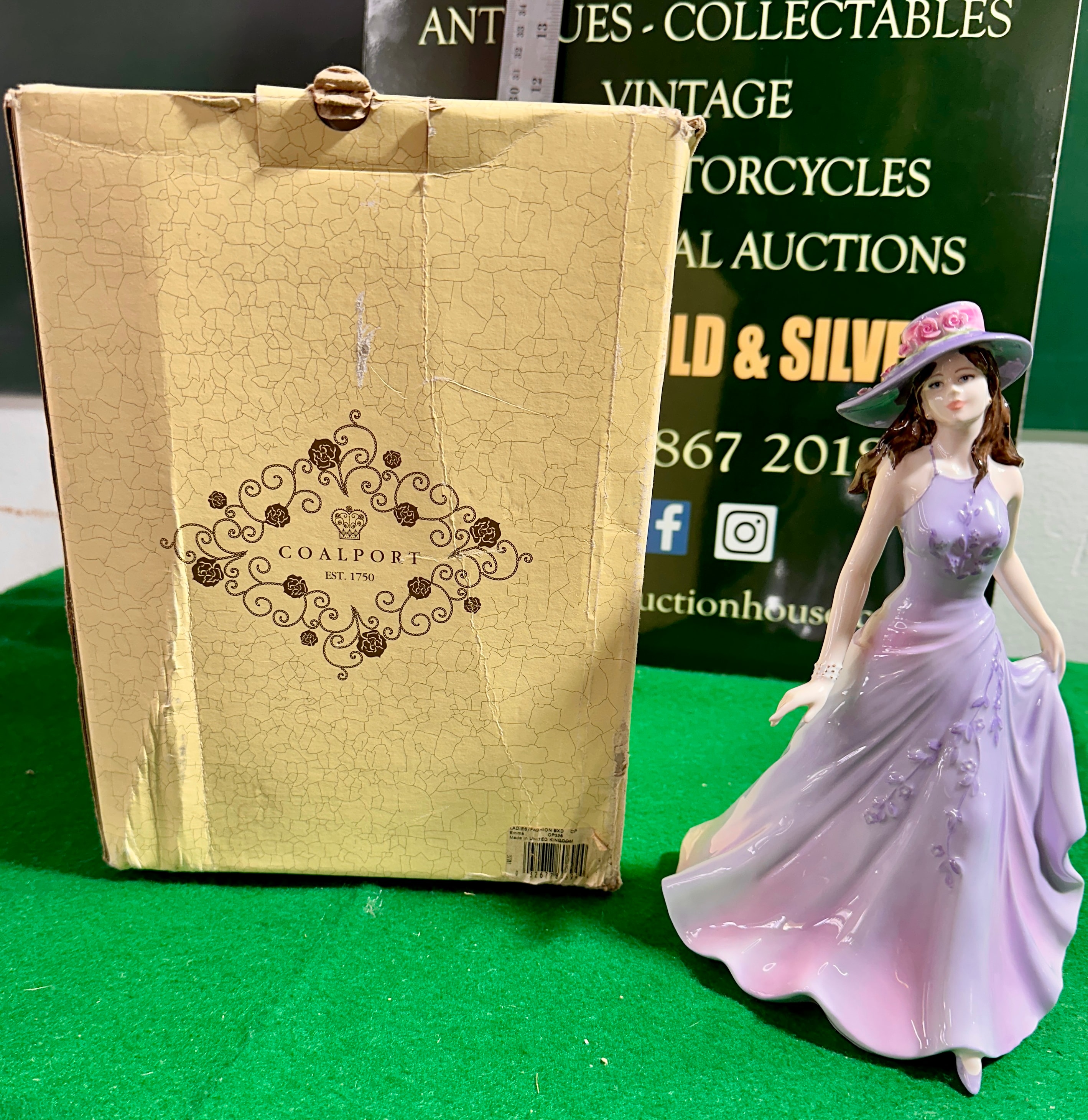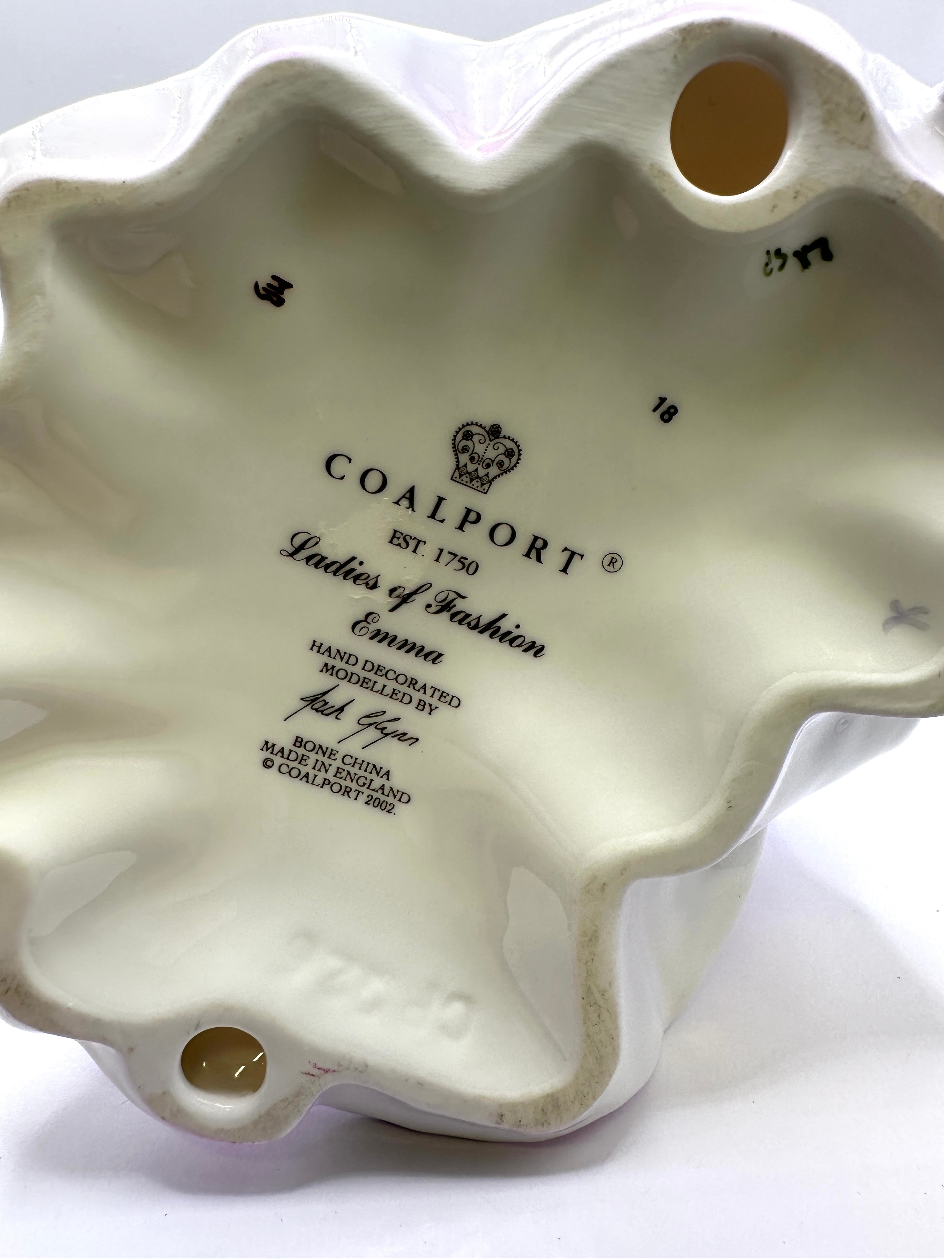 A Coalport bone china figurine, identified as ‘Emma’ from the ‘Ladies of Fashion’ series, modelled by Jack Glyn, and dated 2005. The figure depicts a standing woman elegantly posed in a long, flowing halter-neck gown, graduating from lavender to pink with raised purple floral embellishments. She wears a wide-brimmed hat with pink floral accents. The base is marked “COALPORT,” “EST. 1750,” “BONE CHINA,” and “MADE IN ENGLAND,” along with production codes ‘3’, ’18’, ’29/19′, and ‘CR 4426’. The figurine is presented with its original branded cardboard box.
