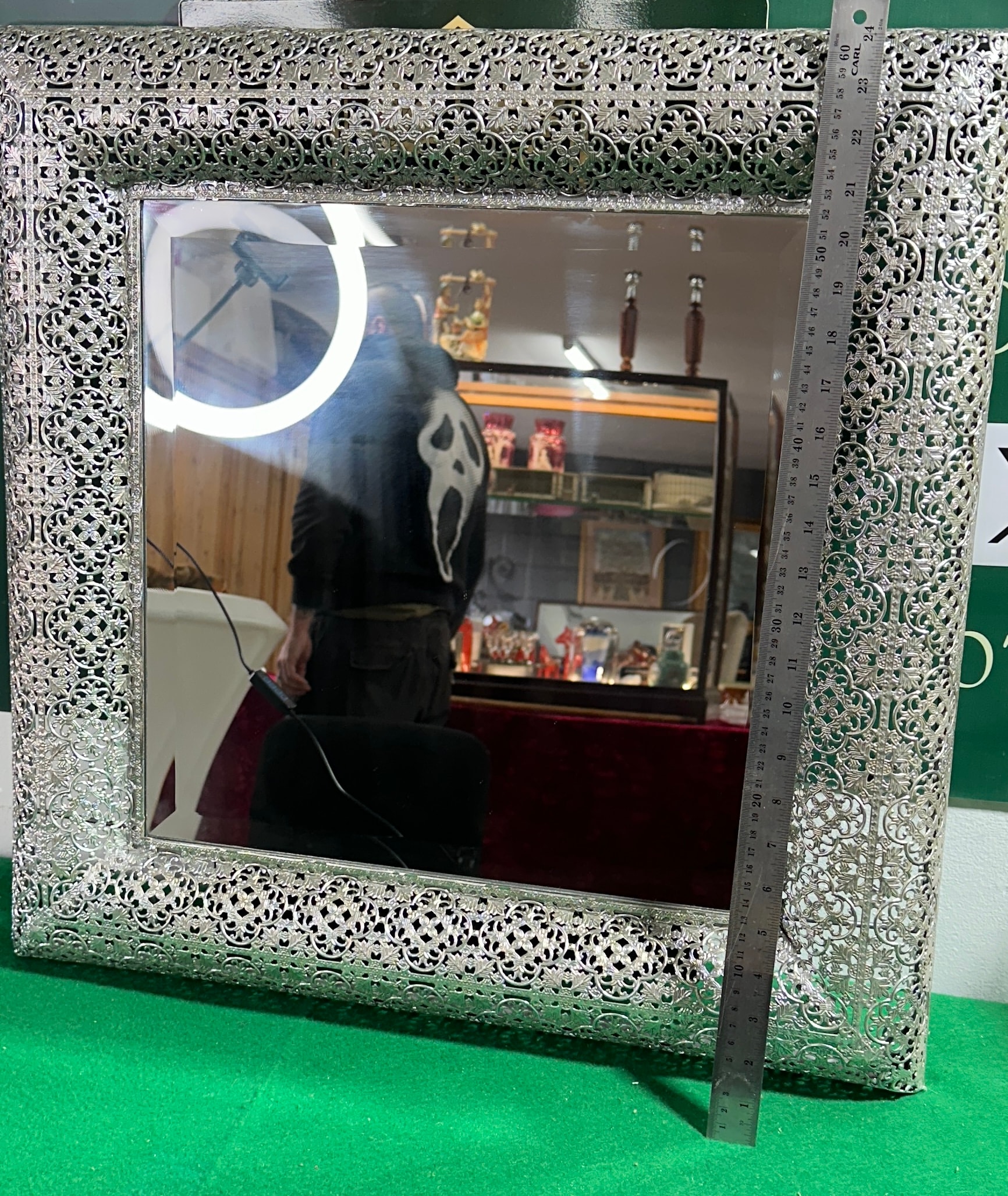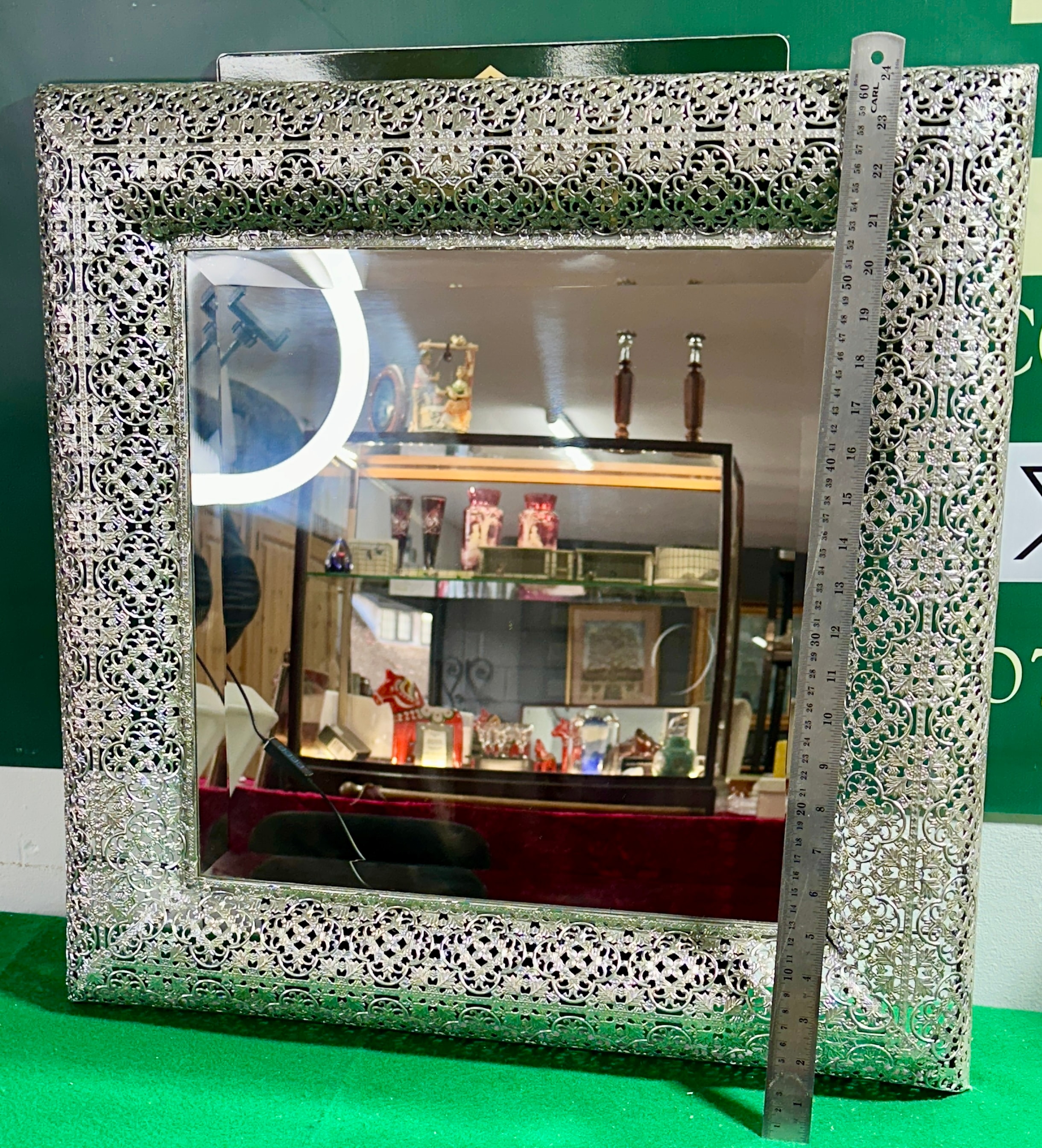 A rectangular wall mirror encased in an ornate, pierced silvery-toned metal frame, executed in the Middle Eastern taste. The frame features intricate openwork patterns, possibly cast or cut, displaying geometric and stylized foliate motifs. No visible maker’s marks or textual inscriptions are present. The precise metal composition and manufacturing period are not visually determinable.