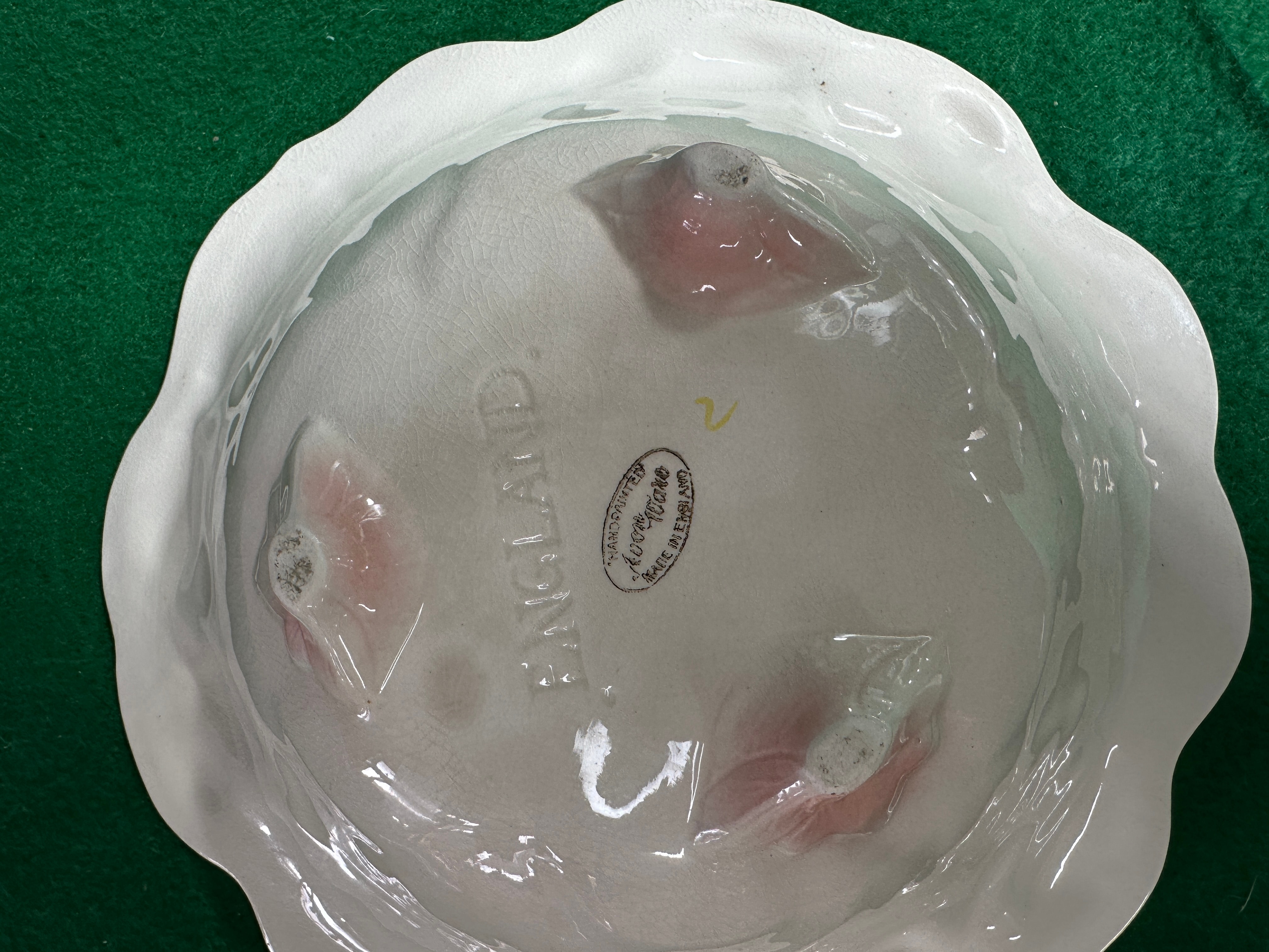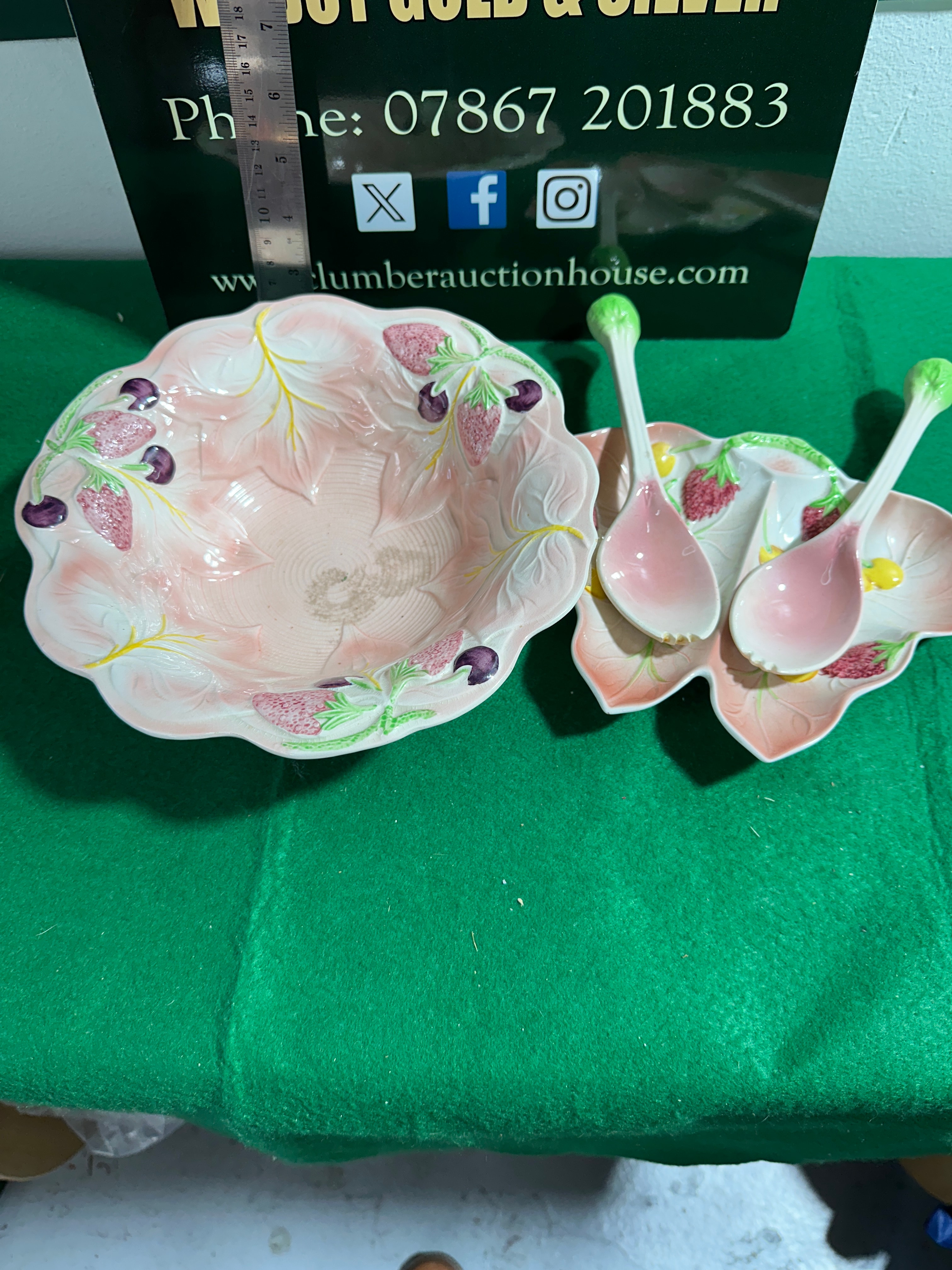 This lot comprises a ceramic serving set featuring a large scalloped bowl, a smaller divided dish, and two matching spoons. All pieces are adorned with a nature-inspired, relief-moulded design depicting strawberry plants, fruits (strawberries and yellow berries), and foliage, rendered in a palette of soft pinks, greens, white, red, and yellow. The material is glazed earthenware. Both the large bowl and the divided dish are marked on their undersides with an embossed “ENGLAND” and a circular stamp reading “HAND PAINTED / Made in ENGLAND,” accompanied by initials that appear to be “A.G. & C.” The smaller dish also bears an additional faded circular stamp and two green lines.
