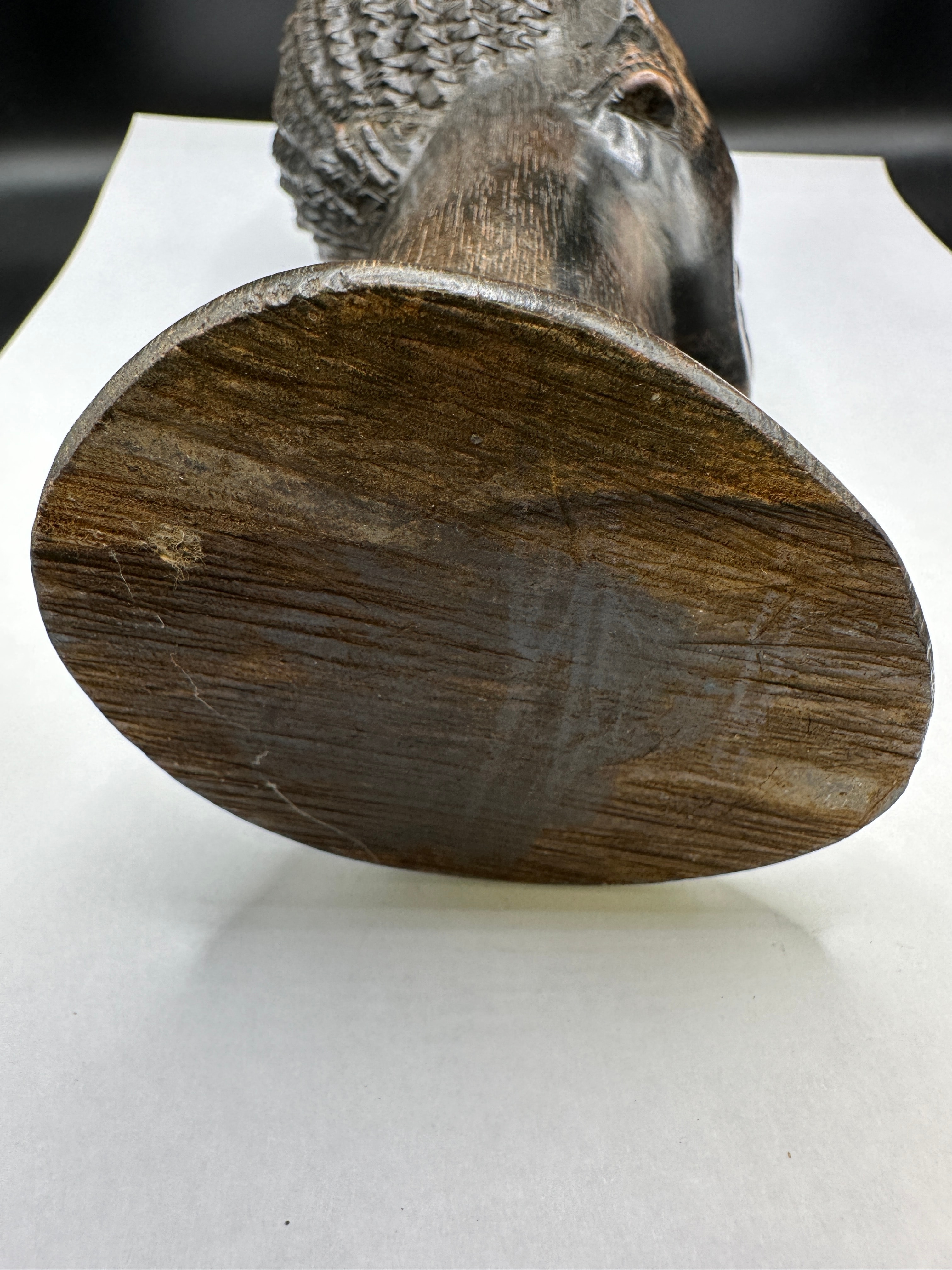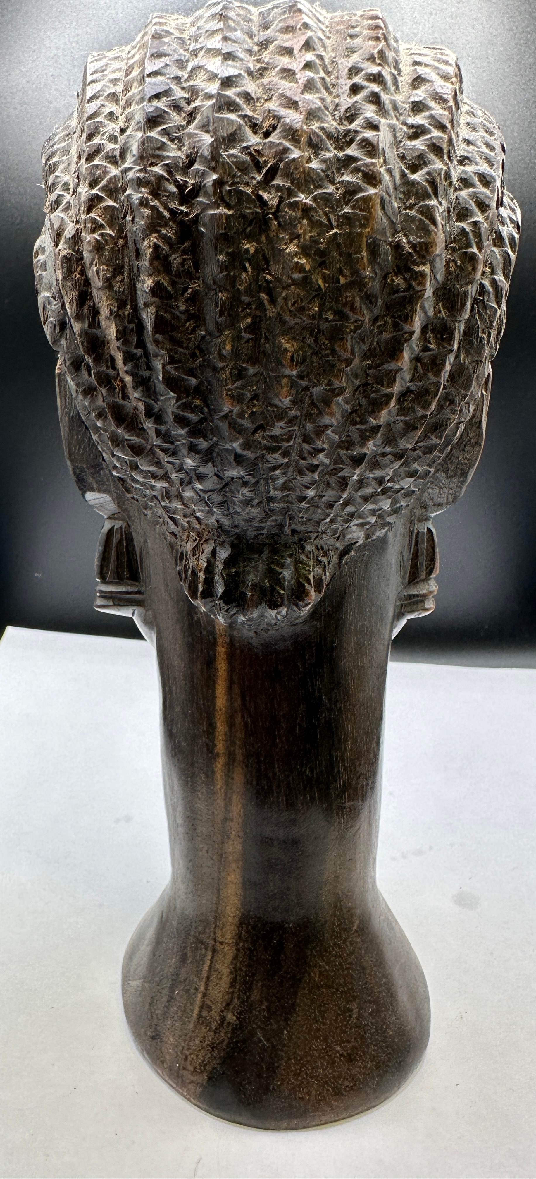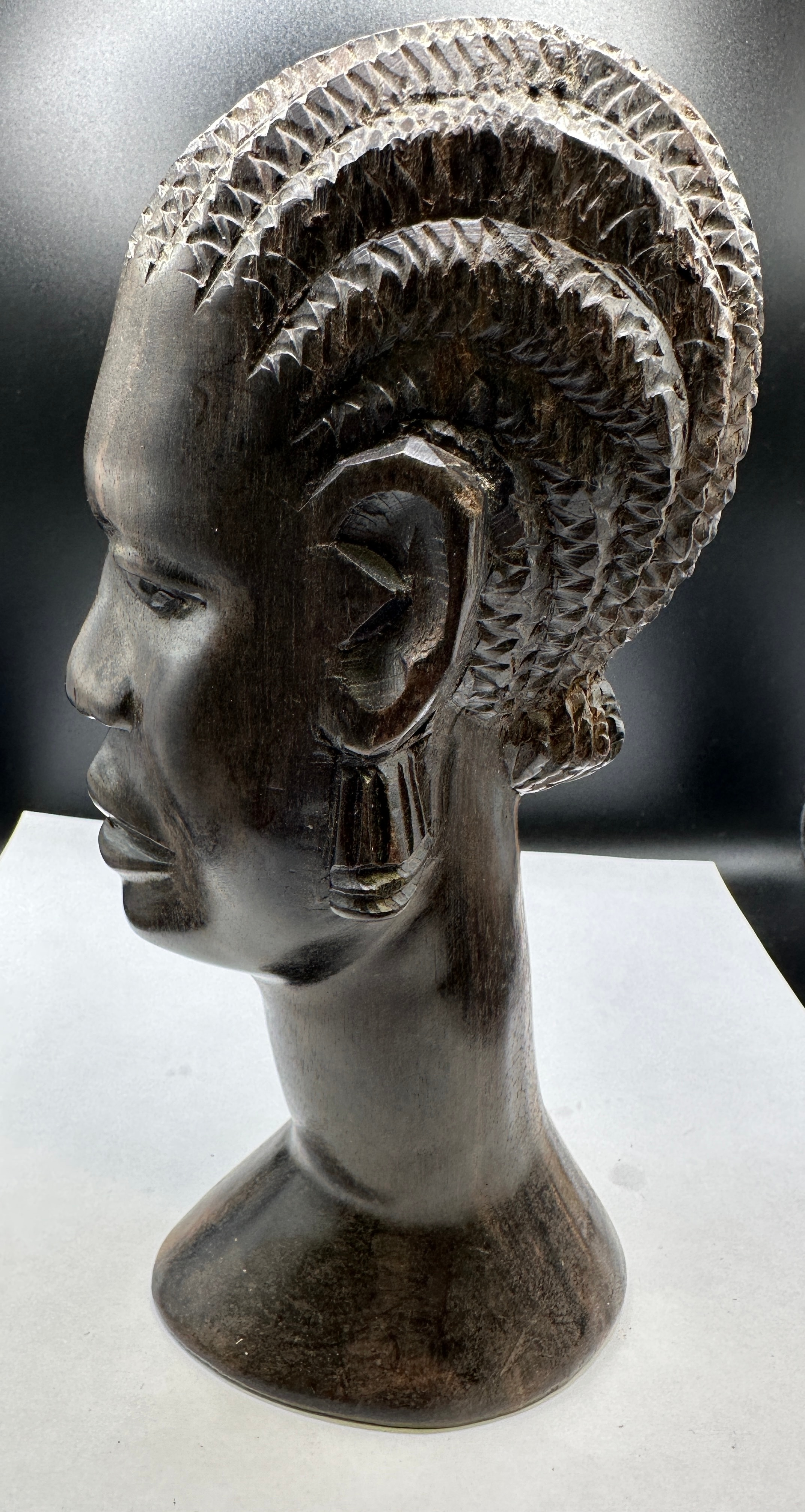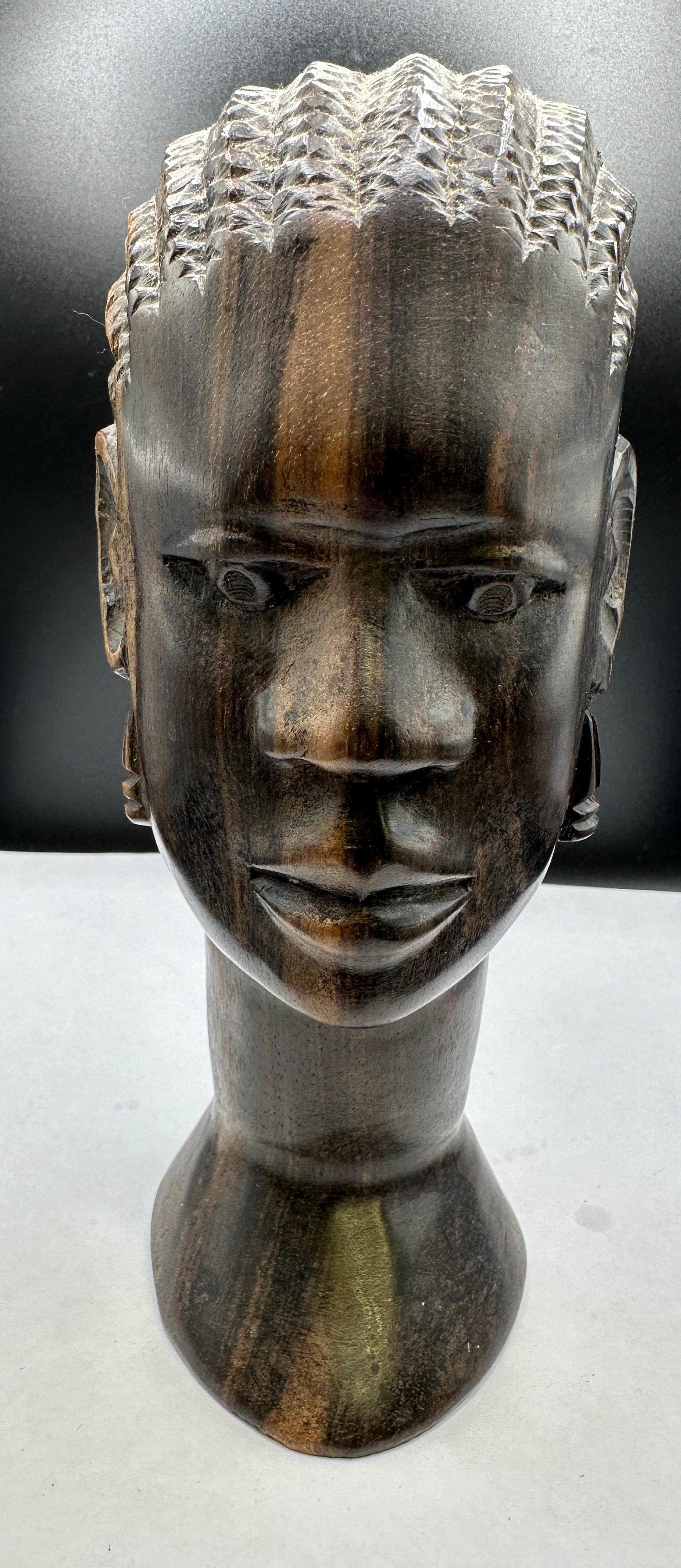 A vintage African ironwood hand carved tribal head bust. This dark reddish-brown carved wooden bust depicts a human head with a naturalistic facial structure, almond-shaped eyes, and highly textured, stylized hair intricately carved to resemble braids or cornrows. Carved ear ornaments, possibly representing earrings, are visible on both ears. The piece is formed from a single piece of wood, displaying a prominent grain, and rests on an integrated, flared circular base. No discernible text or markings are visible.