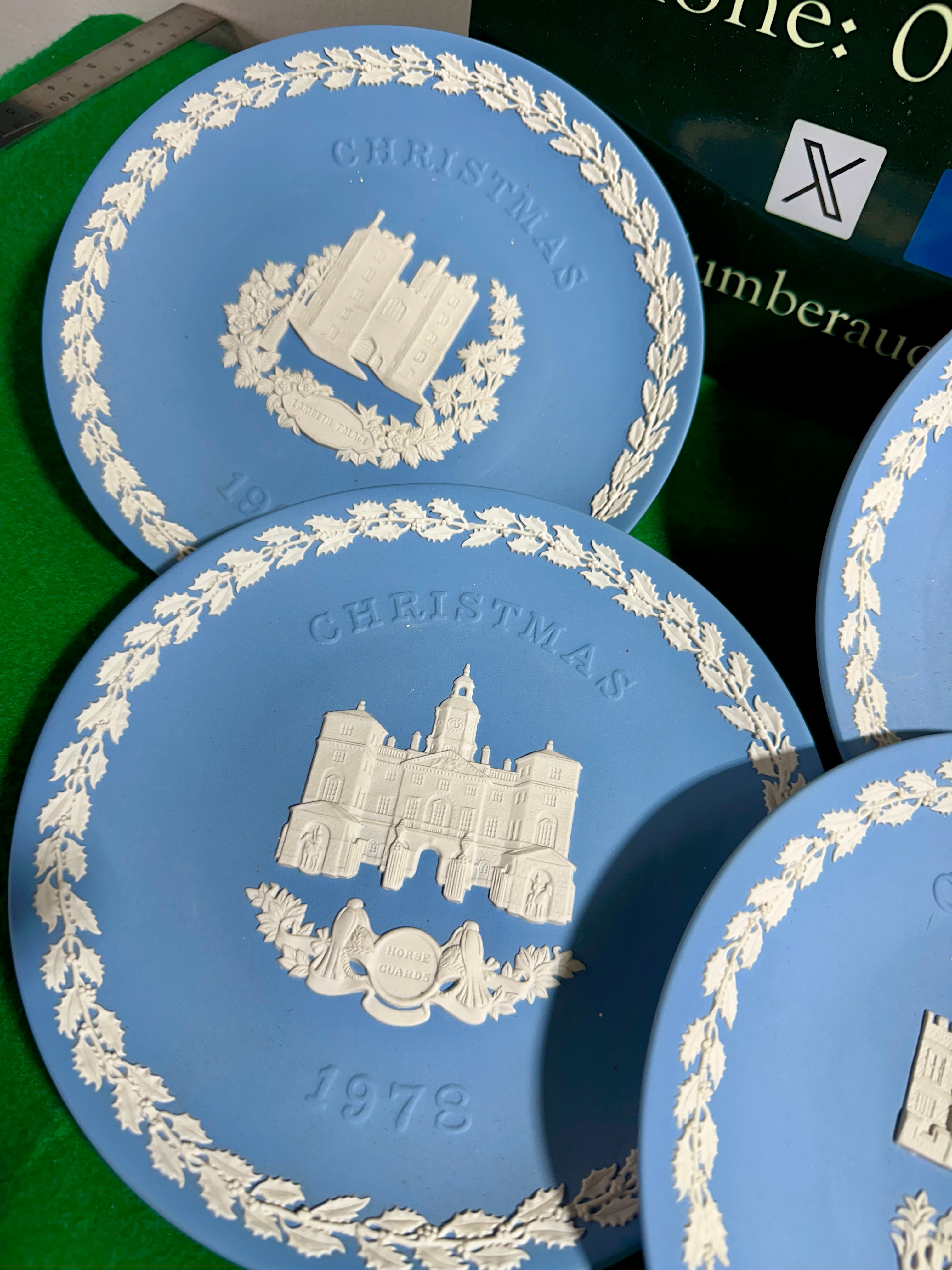 A set of four Wedgwood Jasperware Christmas plates, crafted in the Neoclassical style from light blue ceramic with white bas-relief ornamentation. Each plate is an annual “Christmas” edition from the late 20th century, with visible dates including 1976, 1977, 1978, and 1979. The central designs depict various British architectural landmarks such as Westminster Abbey, Hampton Court, and Windsor Castle, encircled by a sprigged border of holly leaves. The reverse of each plate bears the manufacturer’s mark “WEDGWOOD” and “MADE IN ENGLAND”.